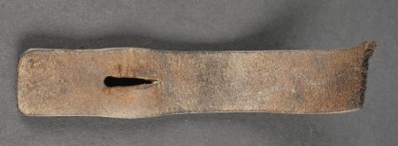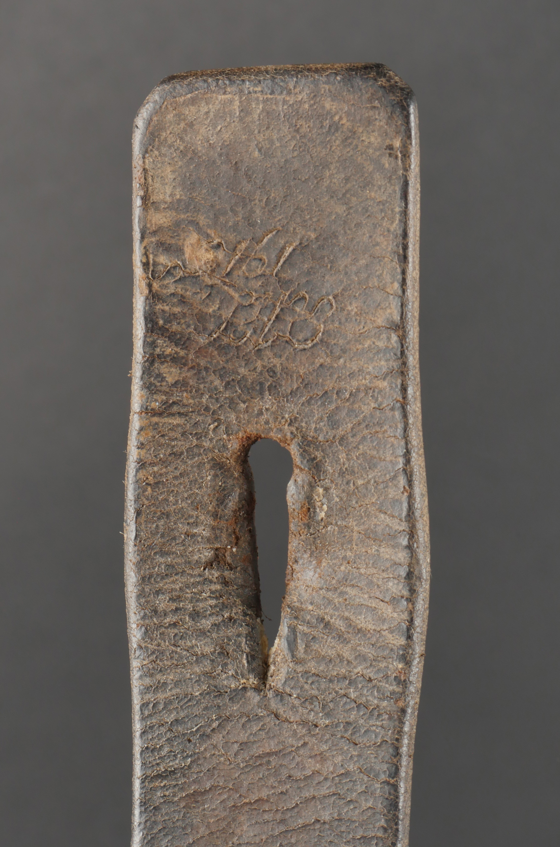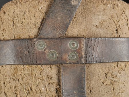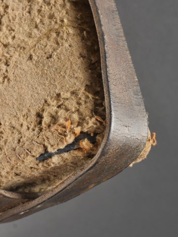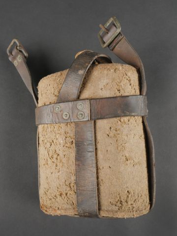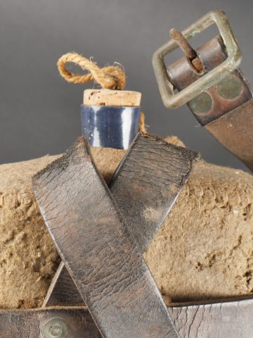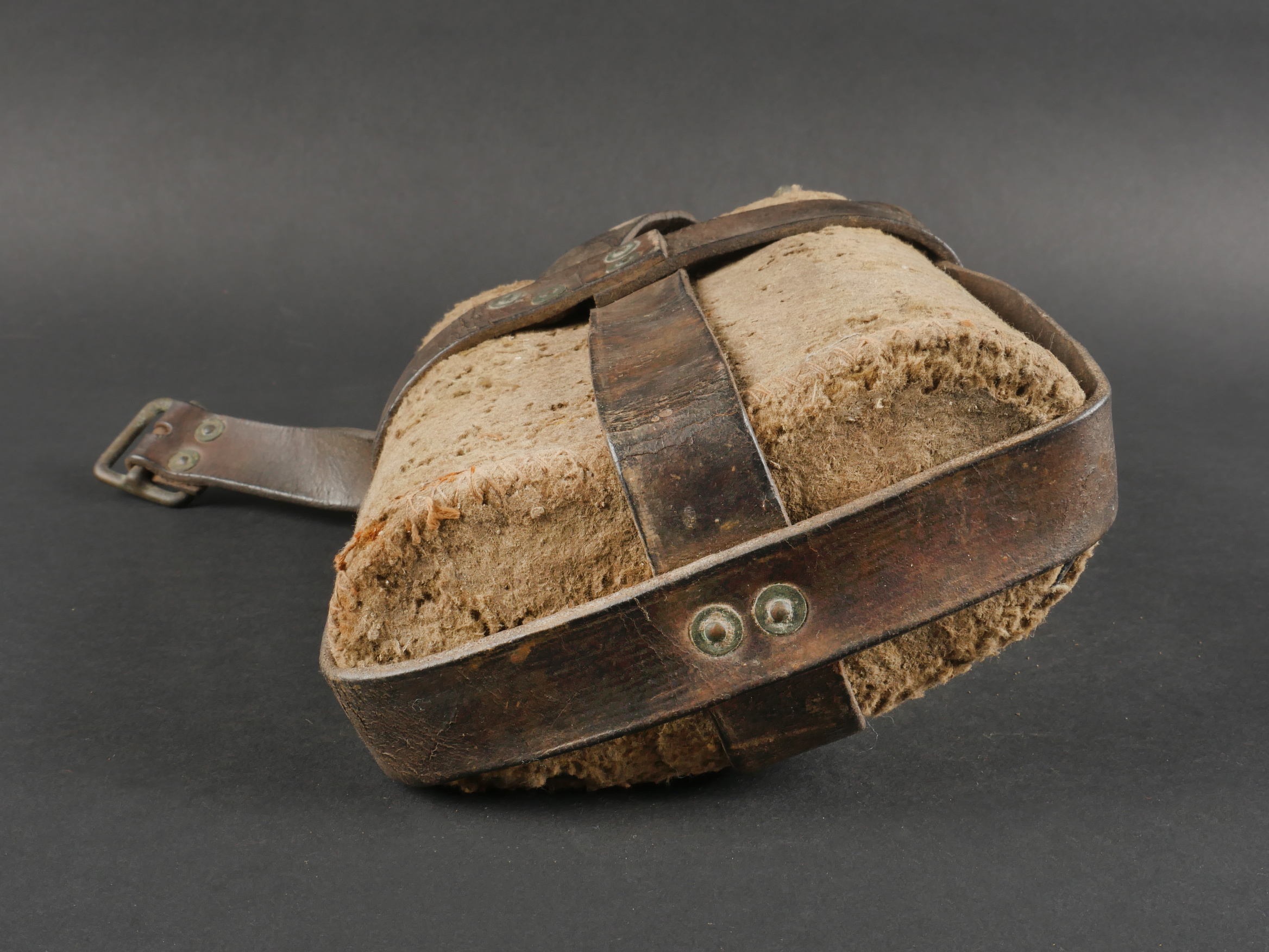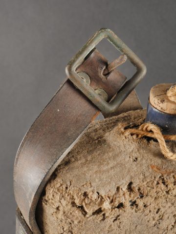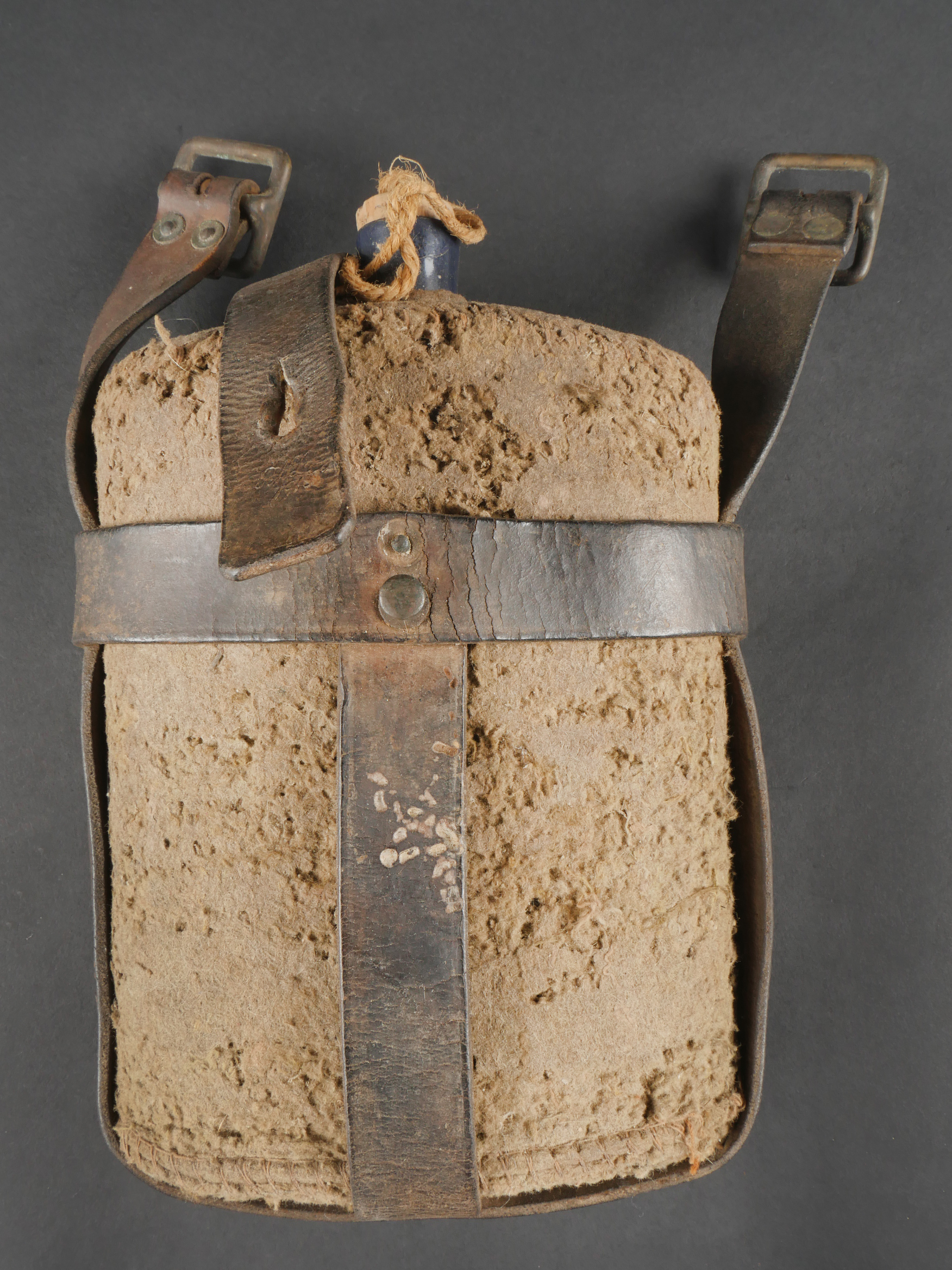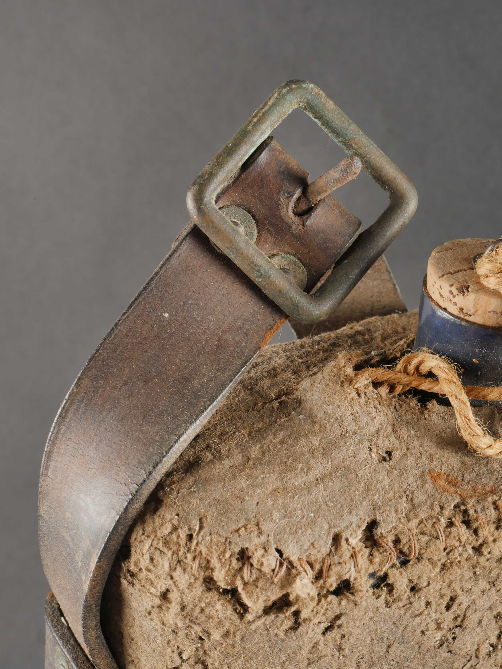 Bidon anglais avec harnais cuir patten 1914. Canteen émaillée bleu avec son bouchon et sa cordelette. Housse en feutrine khaki, usure, trous de mites. Harnais en cuir marron riveté modèle 1914 avec boucles à ardillon en laiton. La sangle de maintien est cassée mais présente, et possède un marquage fabricant et date 1915 ou 1916. British Water Bottle with Leather Harness, Pattern 1914Blue enamelled canteen with cork stopper and cord. Khaki felt cover showing wear and a few moth holes. Brown riveted leather harness, pattern 1914, with brass roller buckles. Retaining strap broken but present, stamped with maker’s mark and date 1915 or 1916.