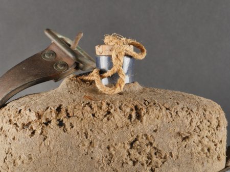 Bidon anglais avec harnais cuir patten 1914. Canteen émaillée bleu avec son bouchon et sa cordelette. Housse en feutrine khaki, usure, trous de mites. Harnais en cuir marron riveté modèle 1914... en savoir plus