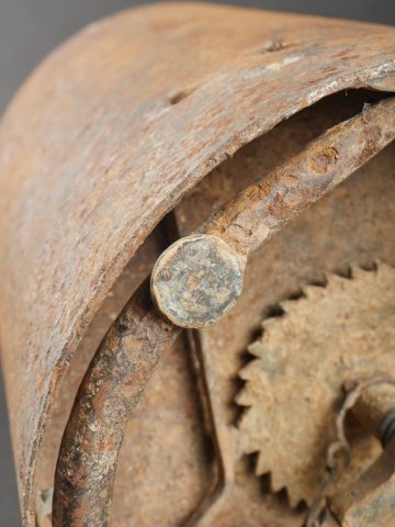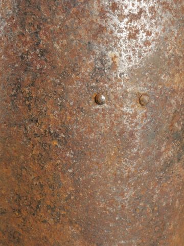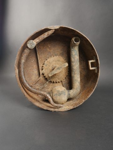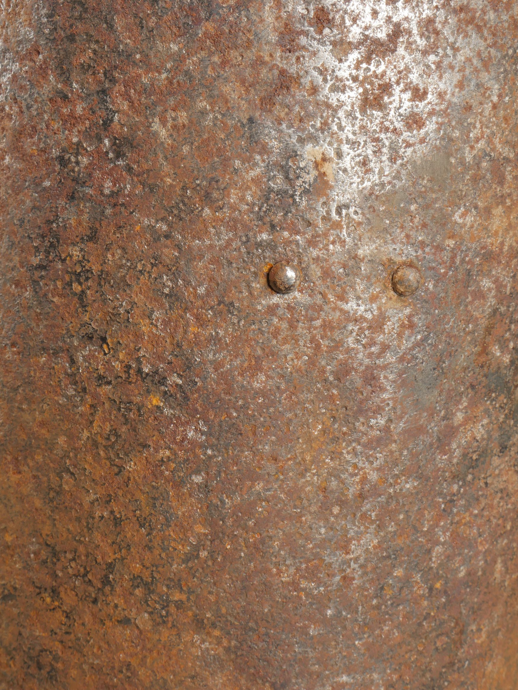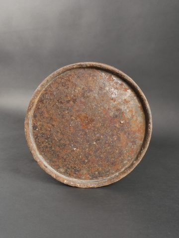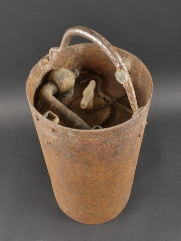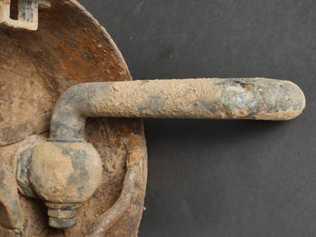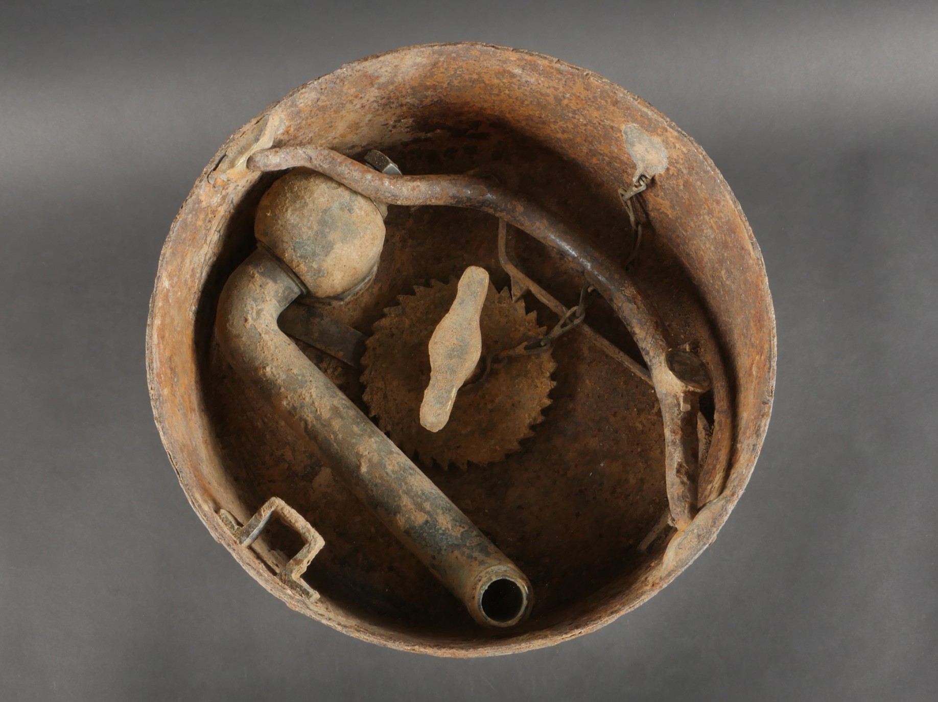 Bidon refroidisseur rond Wasserkessel 11 pour mitrailleuse allemande MG08. Rare bidon refroidisseur, de forme cylindrique, traces d’oxydation, nettoyé, non percé. Tous les éléments externes sont mobile , anse, bec et poignée à crémaillère. La lame ressort de blocage de l’anse est cassée mais présente. Pièce du terrain mais encore en relativement bon état. Un accessoire recherché et peu courant. Round Cooling Water Can “Wasserkessel 11” for MG08 Machine Gun Rare cylindrical water-cooling canister, traces of oxidation, cleaned, not perforated. All external fittings operational, handle, spout, and ratchet lever. Handle locking spring broken but present. Ground-dug piece, still in relatively good condition. A scarce and sought-after accessory.