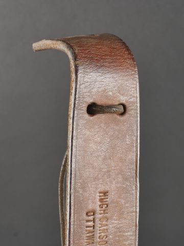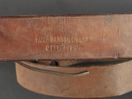 Bretelle de fusil canadienne en cuir 1915. Belle bretelle en cuir marron pour le fusil Ross ou le SMLE, bien marquée Hugh Carson Co Ltd Ottawa 1915, avec son passant et son lacet cuir. Bon état. Canadian Leather Rifle Sling 1915Fine brown leather sling for the Ross or SMLE rifle, clearly marked “Hugh Carson Co. Ltd, Ottawa 1915,” complete with keeper and leather thong. Good condition.
