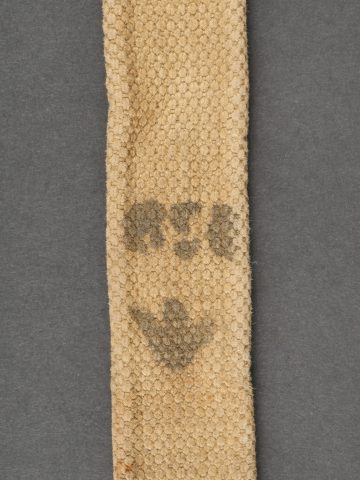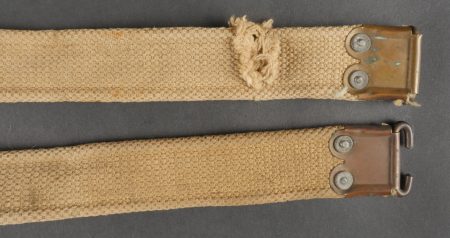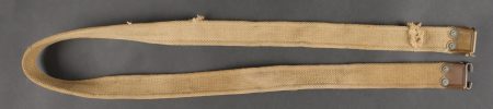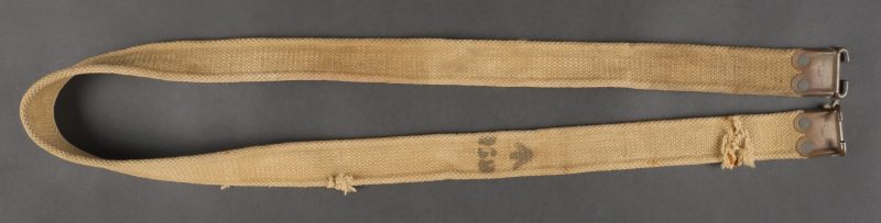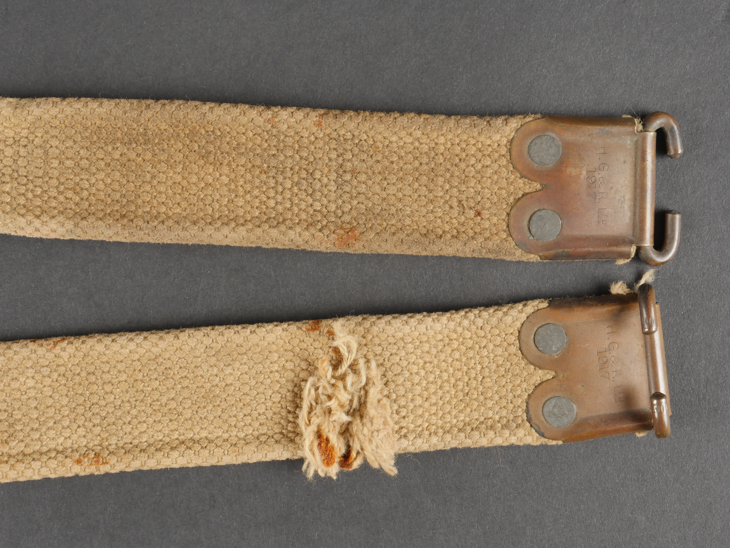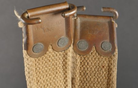 Bretelle de Lee Enfield en web datée 1917. Bretelle de SMLE en forte toile de coton filé WEB pattern 1908. Renfort cuivre avec crochet aux extrémités, bien marqués H.G.&R. Ltd et datés 1917. Les bretelles datées ne sont pas courantes. Un éclat ou une coupure sur un peu plus de la moitié de la largeur de la sangle. Lee Enfield Web Sling Dated 1917Strong cotton web sling, Pattern 1908, with brass end hooks, clearly marked “H.G.&R. Ltd 1917.” Dated examples are scarce. Small split across half the strap’s width.