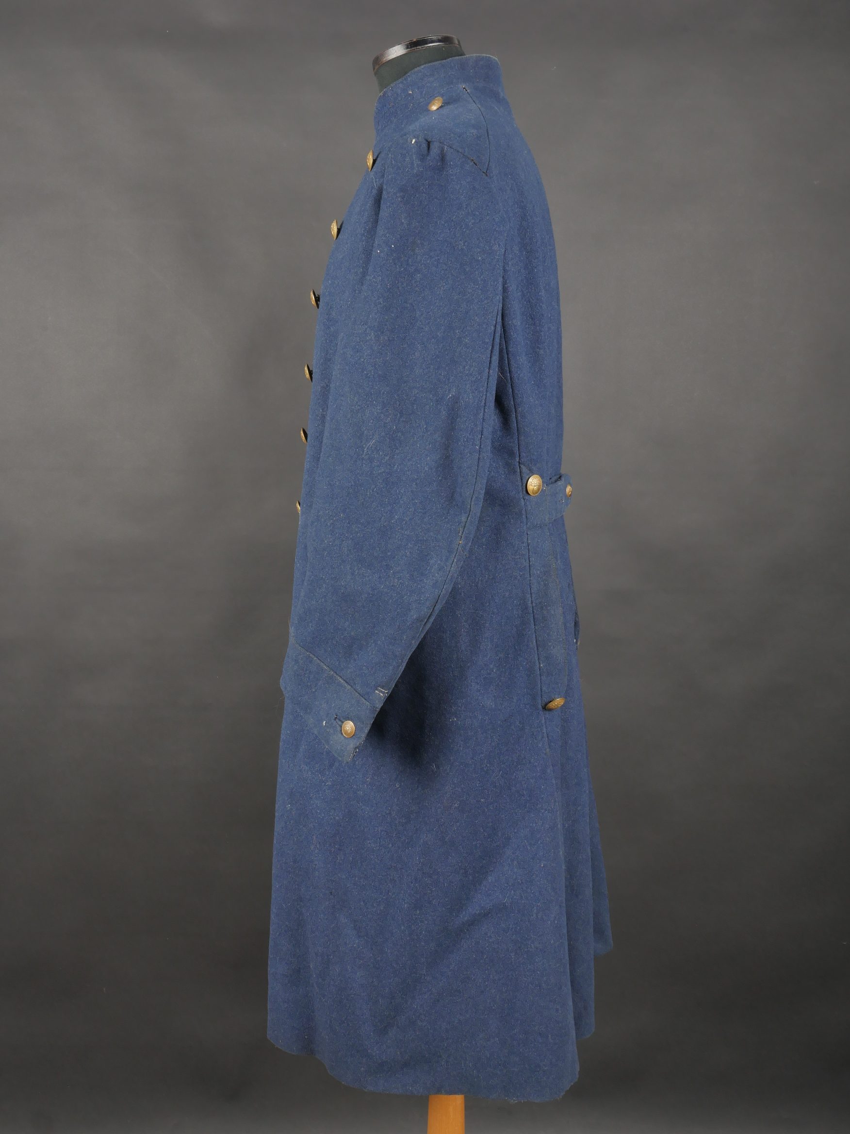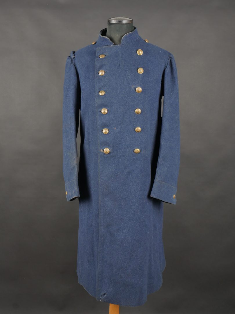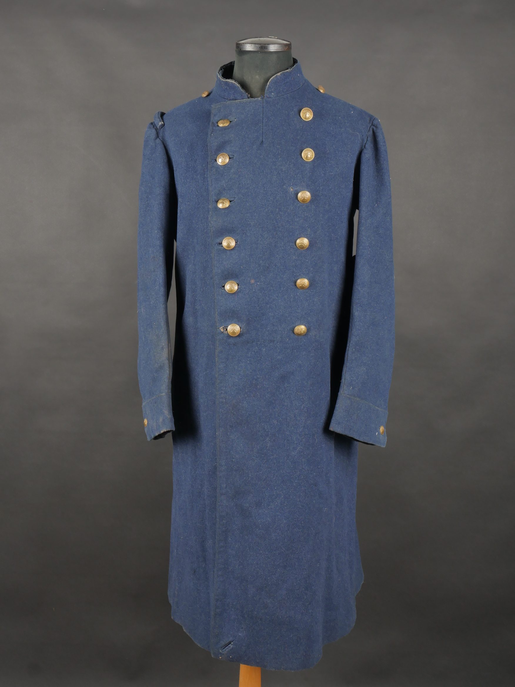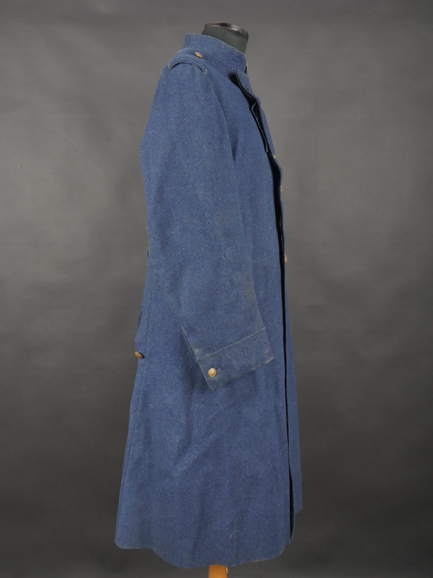 Détails de la vente >Capote française modèle 1877 Gris de Fer bleuté du 106e RI . Capote modèle 1877 en drap épais gris de fer bleuté. Dans sa longueur avec ses boutonnières en bas, passants d’épaule,... en savoir plus