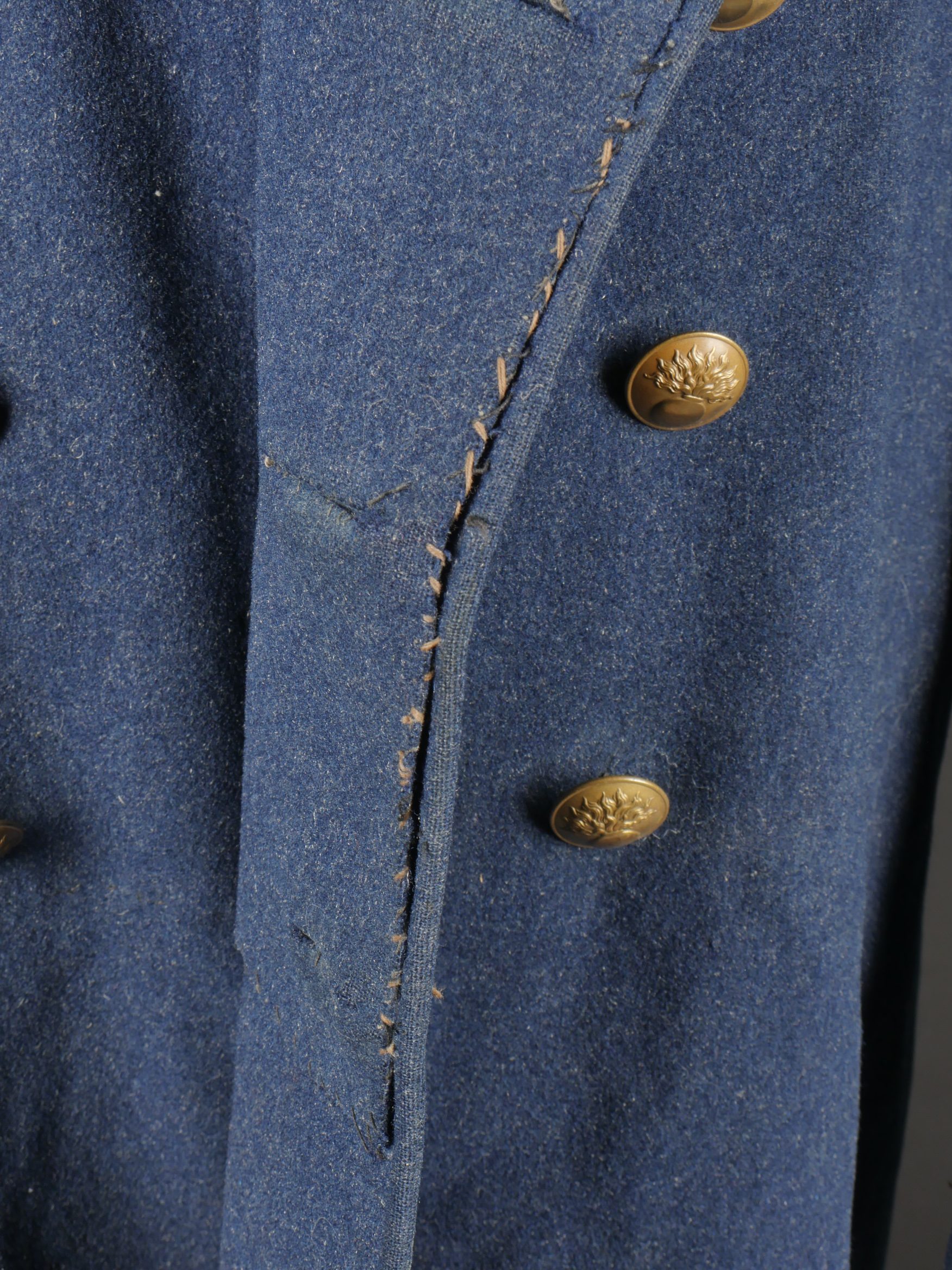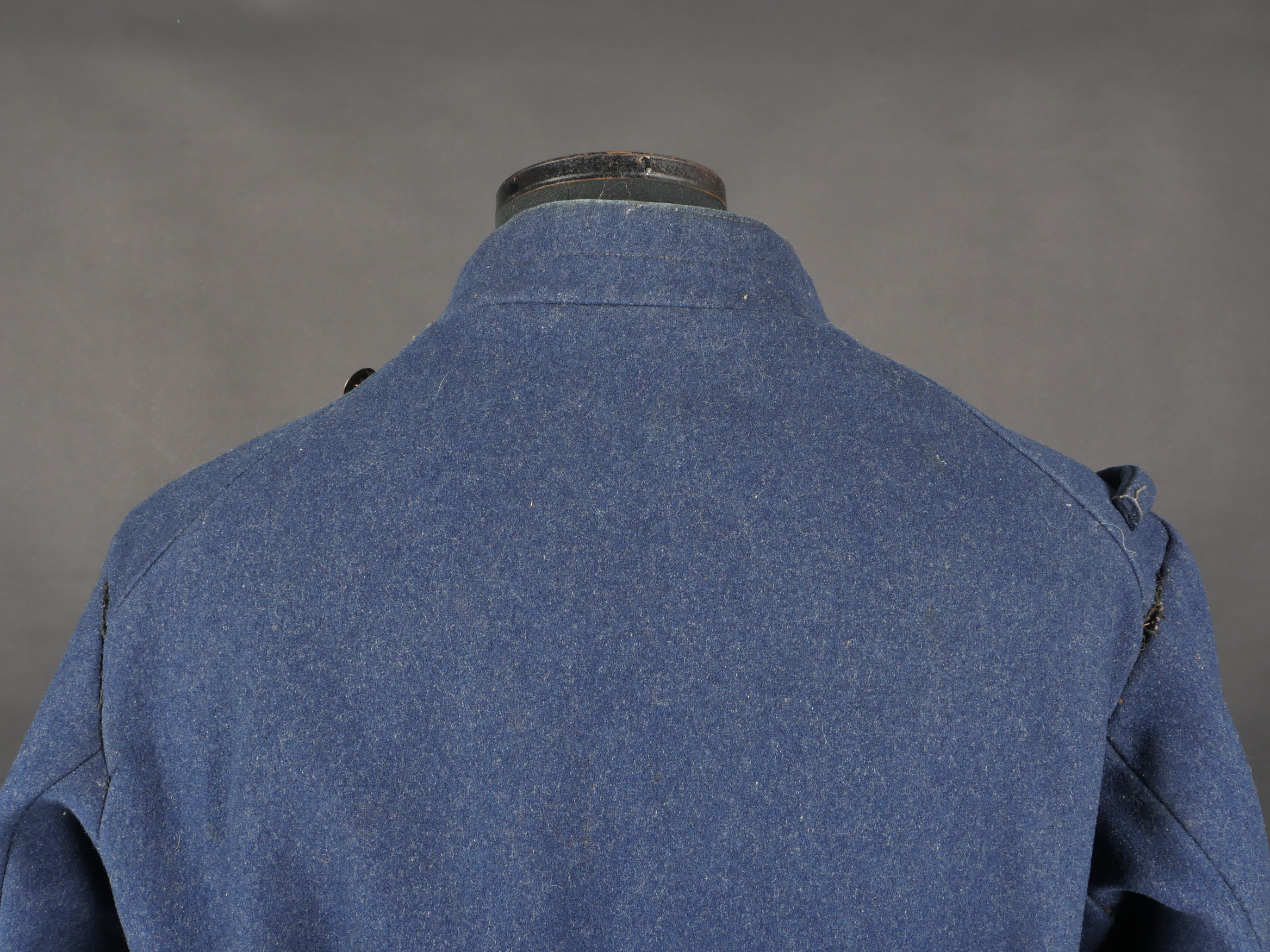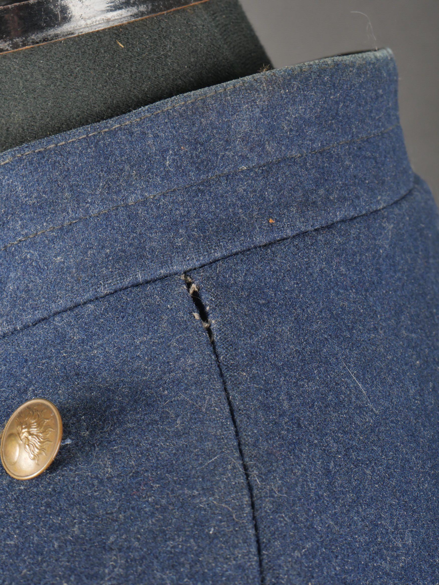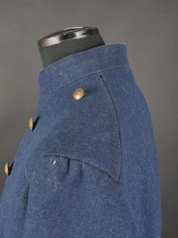 Capote française modèle 1877 Gris de Fer bleuté du 106e RI . Capote modèle 1877 en drap épais gris de fer bleuté. Dans sa longueur avec ses boutonnières en bas, passants d’épaule, martingale et passant de ceinturon. 2 rangées de 6 boutons laiton à la grenade. Boutons d’épaule, de manche et de retroussis présents. Doublure écrue avec tampon du tailleur Défossés daté 1908, tampon de réception au 106e de Ligne, tampons de tailles et tampons de costumier. Patte de collet et passant d’épaule côté gauche absents. Tous les boutons sont présent. Quelques reprises minimes, une réparation sous la manche gauche, capote dans un bel état de fraîcheur. Model 1877 French Greatcoat, Iron Blue-Grey, 106th Infantry Regiment Model 1877 greatcoat in thick iron-blue-grey cloth, full length with lower buttonholes, shoulder straps, back belt, and belt loop. Double-breasted front with two rows of six brass grenade buttons. Shoulder, cuff, and turnback buttons present. Unbleached lining stamped “Tailleur Défossés 1908,” with 106th Line Regiment acceptance mark, size markings, and costumer stamps. Left collar tab and shoulder strap missing. All buttons present. Minor repairs including one under the left sleeve. Excellent, well-preserved condition.