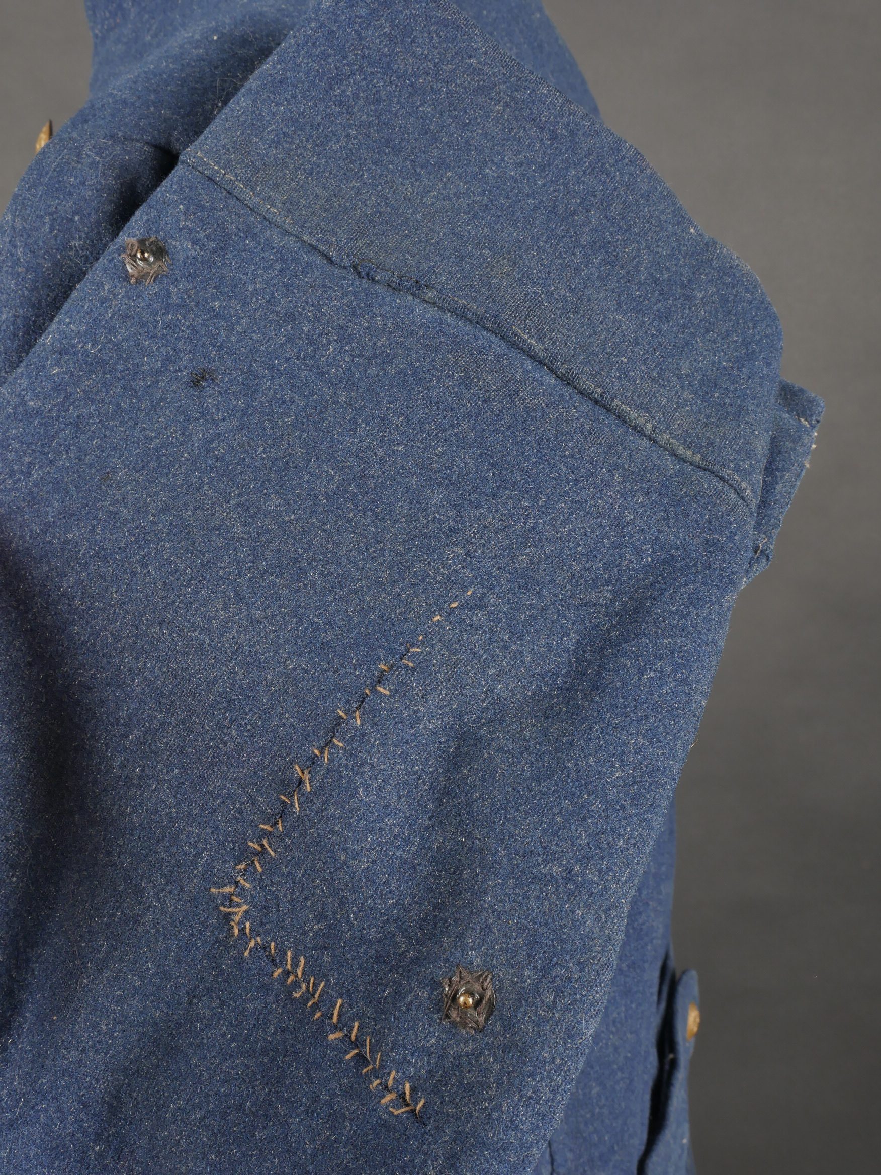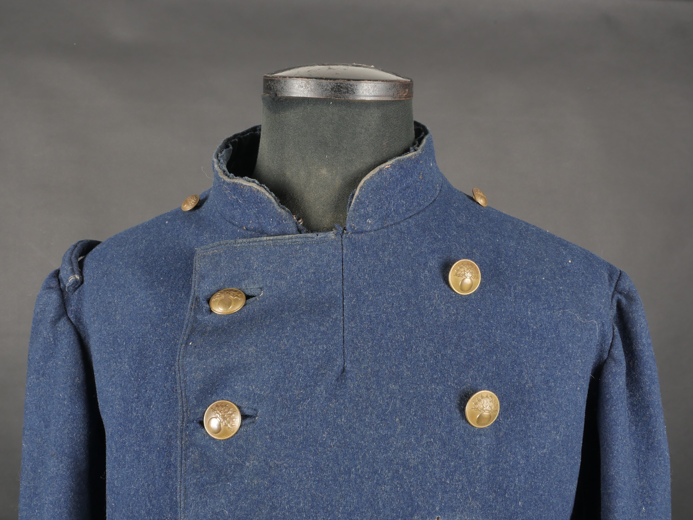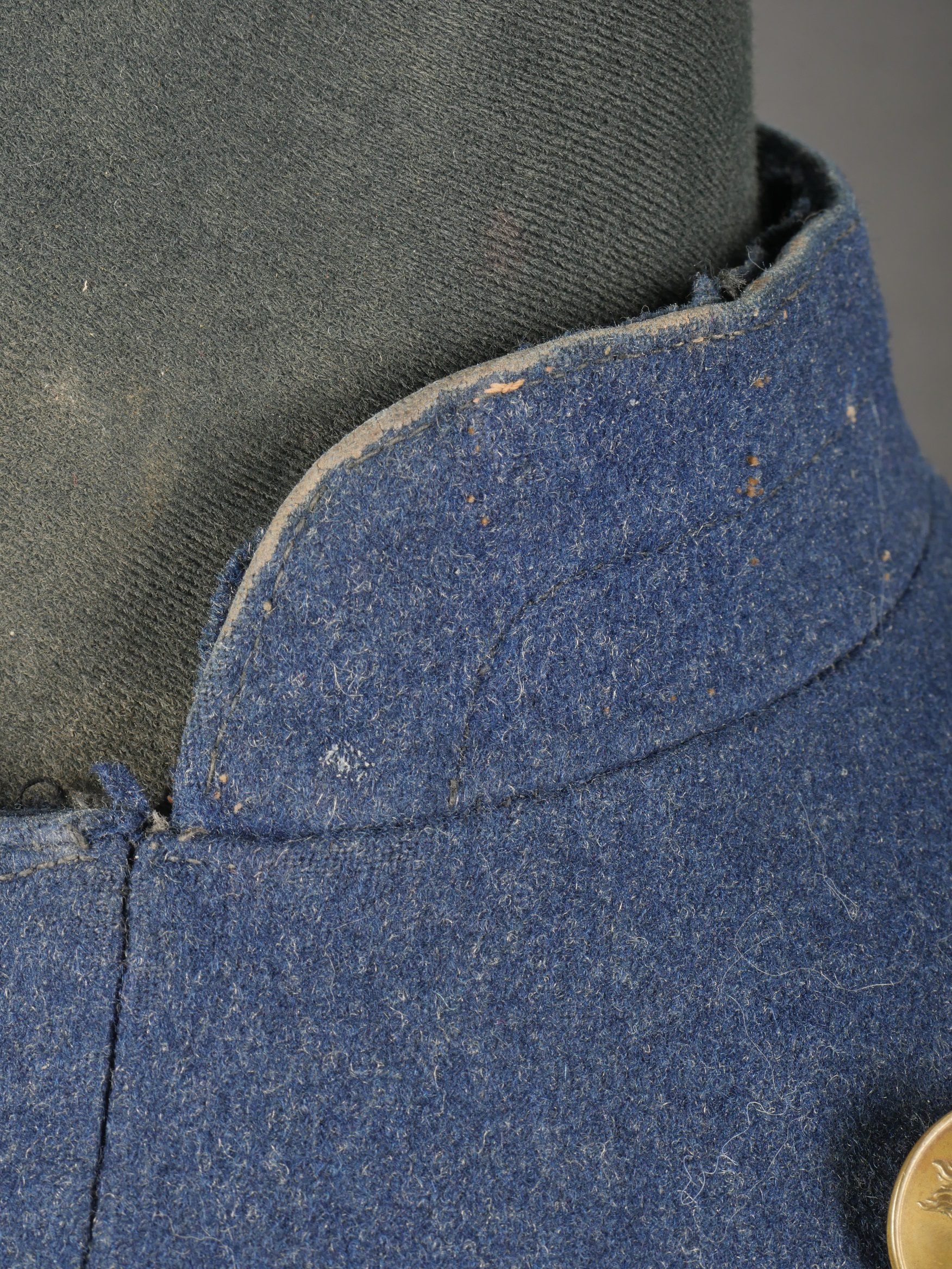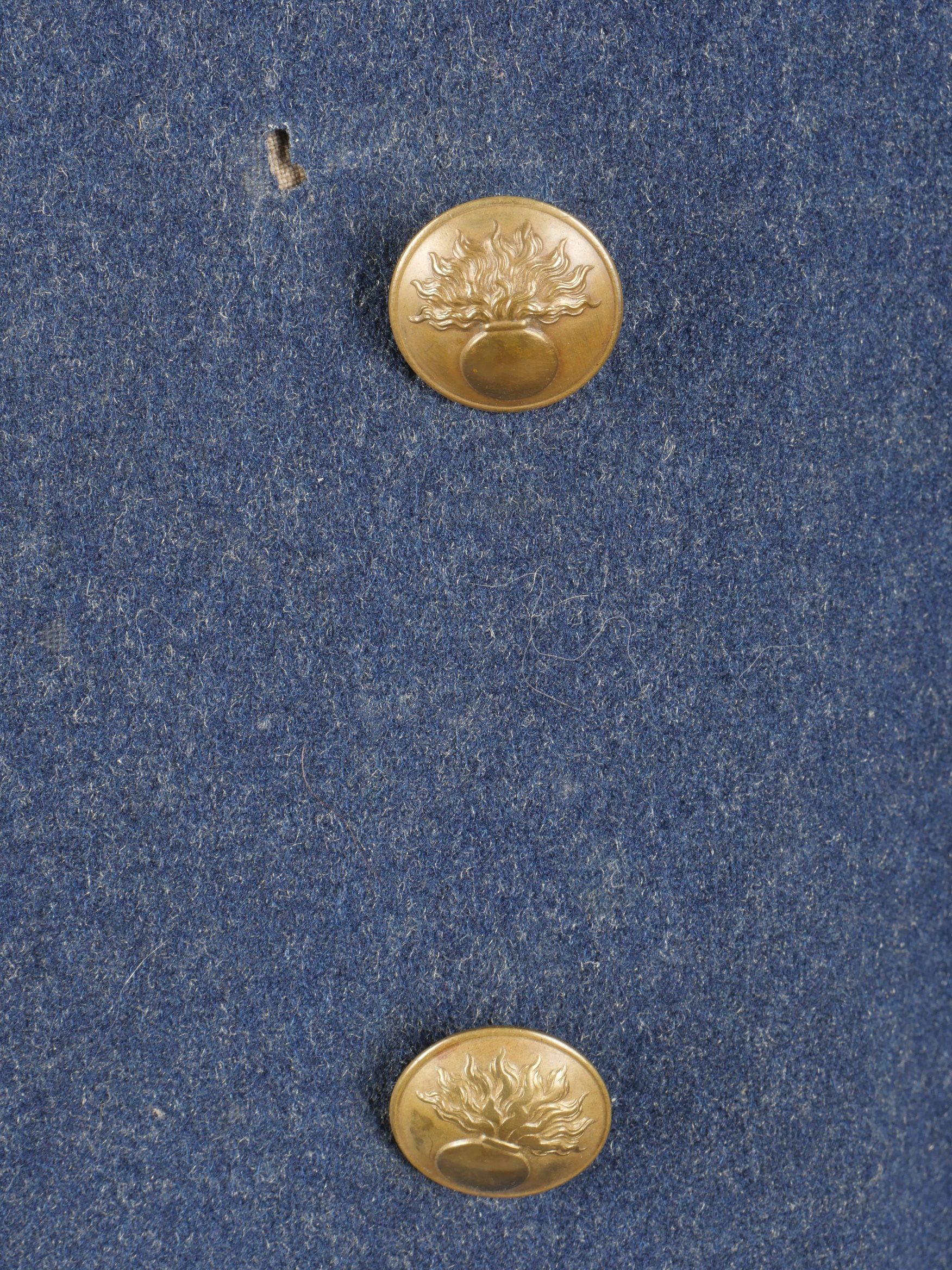 Capote française modèle 1877 Gris de Fer bleuté du 106e RI . Capote modèle 1877 en drap épais gris de fer bleuté. Dans sa longueur avec ses boutonnières en bas, passants d’épaule, martingale et passant de ceinturon. 2 rangées de 6 boutons laiton à la grenade. Boutons d’épaule, de manche et de retroussis présents. Doublure écrue avec tampon du tailleur Défossés daté 1908, tampon de réception au 106e de Ligne, tampons de tailles et tampons de costumier. Patte de collet et passant d’épaule côté gauche absents. Tous les boutons sont présent. Quelques reprises minimes, une réparation sous la manche gauche, capote dans un bel état de fraîcheur. Model 1877 French Greatcoat, Iron Blue-Grey, 106th Infantry Regiment Model 1877 greatcoat in thick iron-blue-grey cloth, full length with lower buttonholes, shoulder straps, back belt, and belt loop. Double-breasted front with two rows of six brass grenade buttons. Shoulder, cuff, and turnback buttons present. Unbleached lining stamped “Tailleur Défossés 1908,” with 106th Line Regiment acceptance mark, size markings, and costumer stamps. Left collar tab and shoulder strap missing. All buttons present. Minor repairs including one under the left sleeve. Excellent, well-preserved condition.