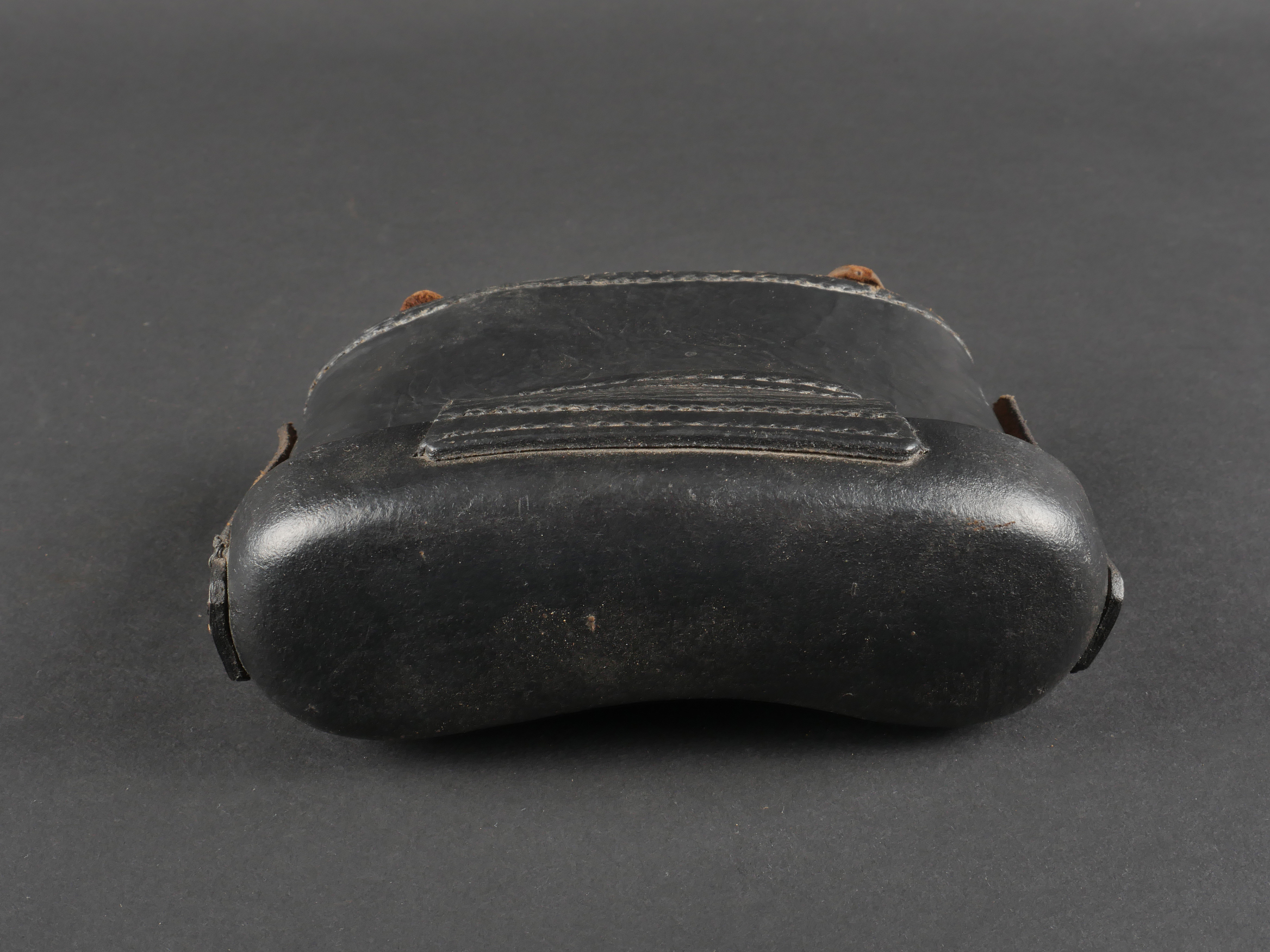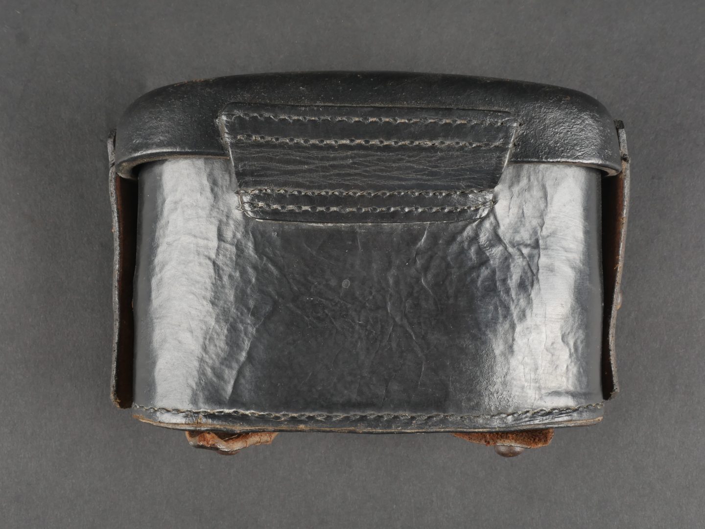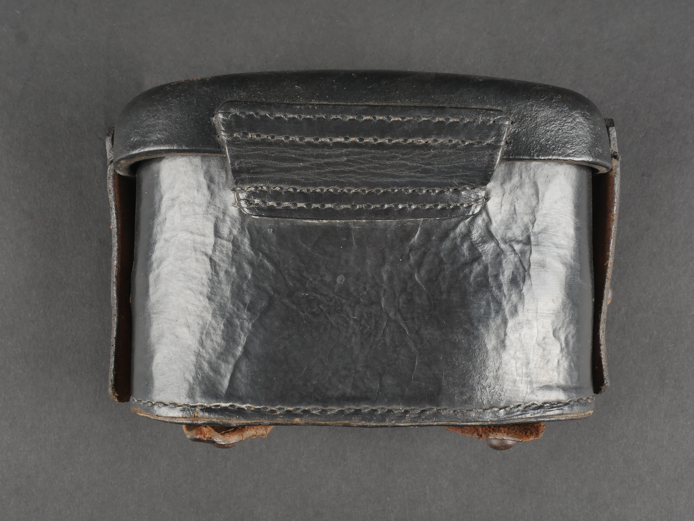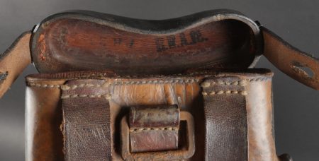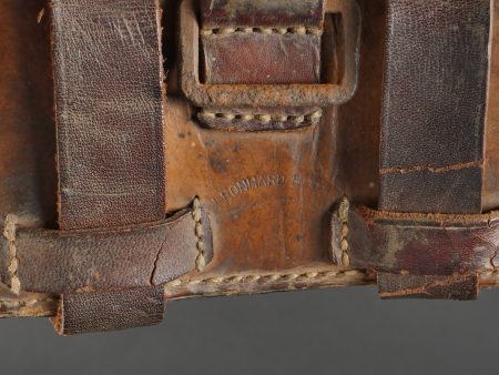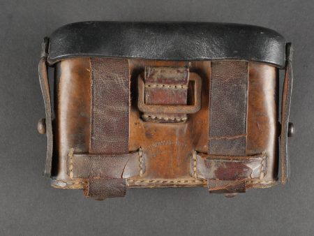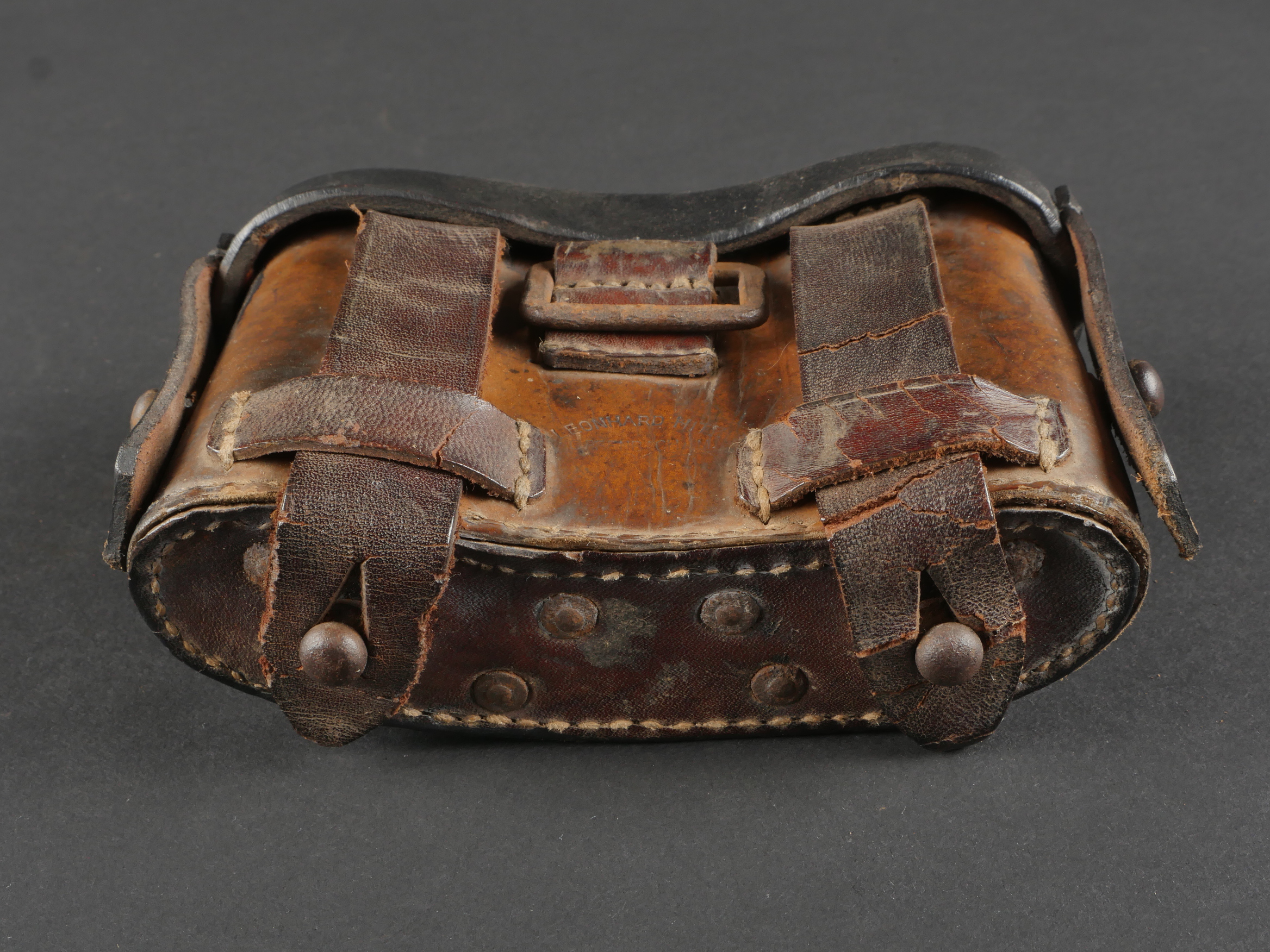 Cartouchière allemande 1887-88 du Pionier Bataillon Nr 25 de Nassau. Cartouchière allemande modèle 87/88 pour troupes techniques, artillerie et Pionier, en cuir marron teinté noir pendant la guerre. Marquage fabricant et date 1915. Compartiments internes présents. Rabat avec ses sangles de fermeture en bon état. Une des sangles de ceinturon est fragile. Sous le rabat, réception au RBAXVIII et au PB25, le 25e bataillon de Pionier de Nassau, faisant partie du XVIIIe ArmeeKorps. Bon état. German 1887-88 Ammunition Pouch from Pioneer Battalion No. 25 of NassauModel 87/88 ammunition pouch for technical troops, artillery, and pioneers, made of brown leather blackened during wartime. Manufacturer’s marking and date 1915. Internal compartments intact. Flap closure straps in good condition, though one belt loop is fragile. Under the flap, stamped “RBAXVIII” and “PB25,” indicating use by the 25th Pioneer Battalion of Nassau, part of the XVIII Army Corps. Good condition.