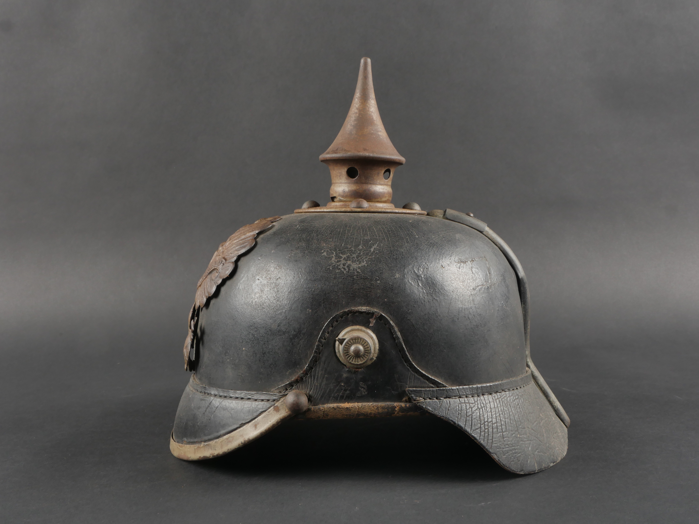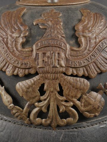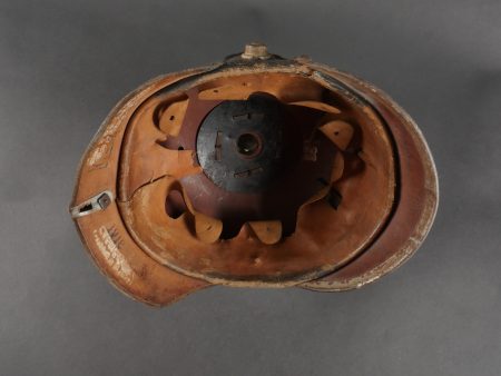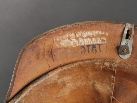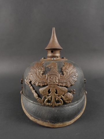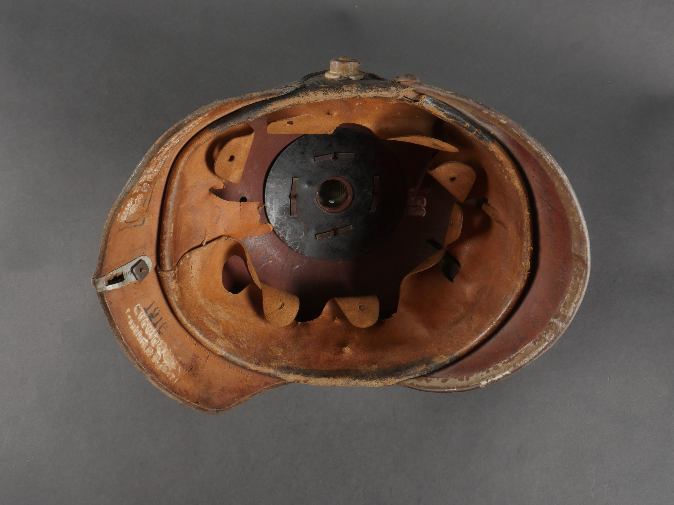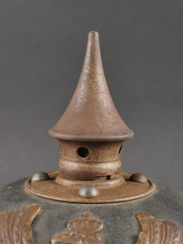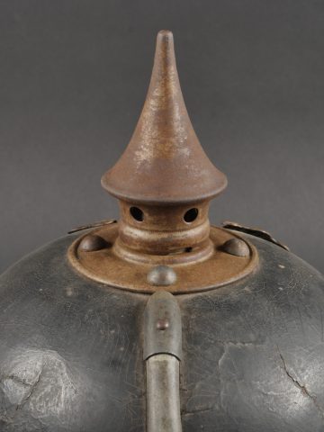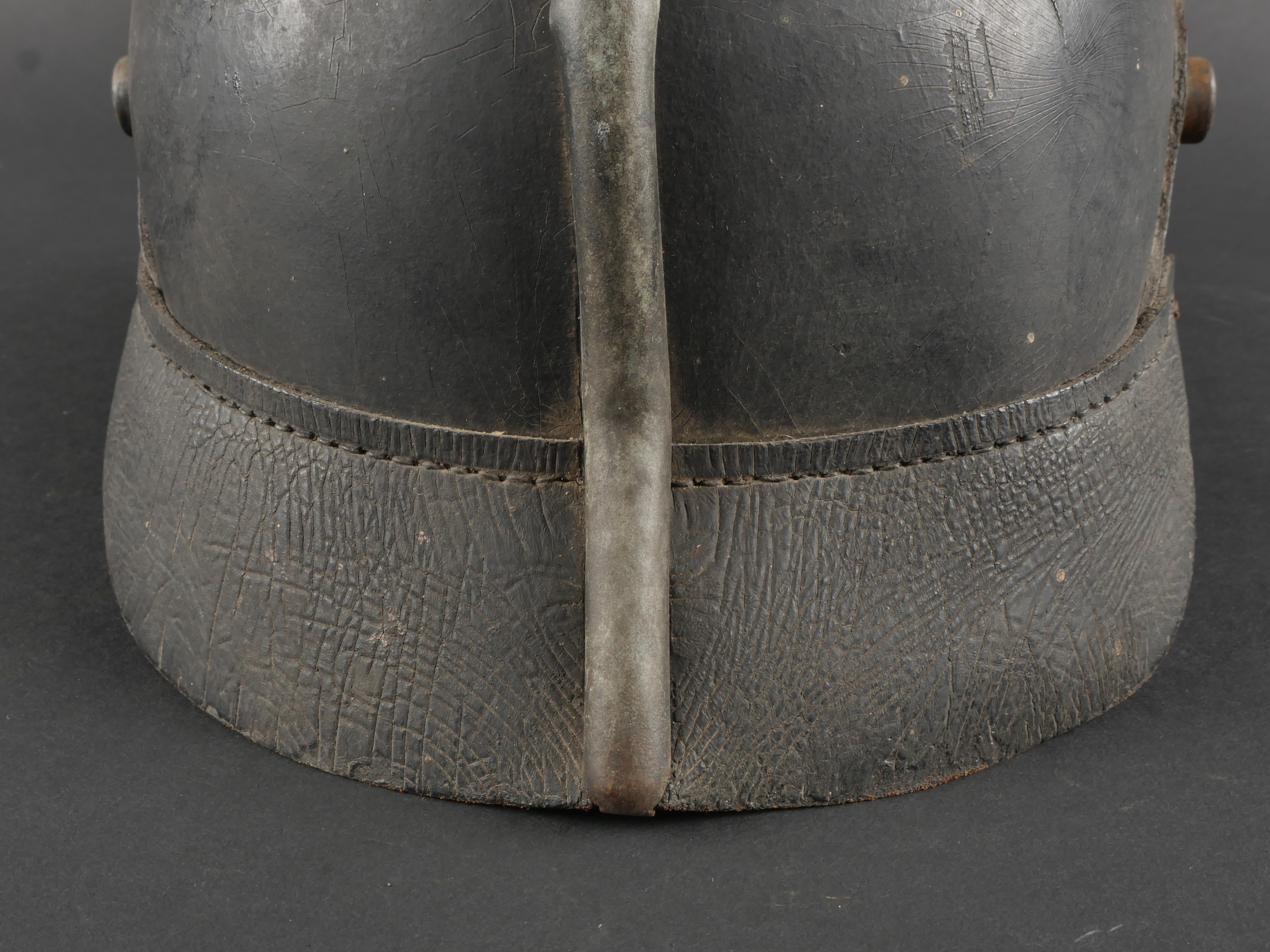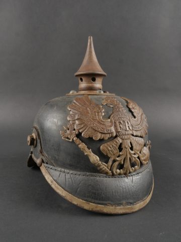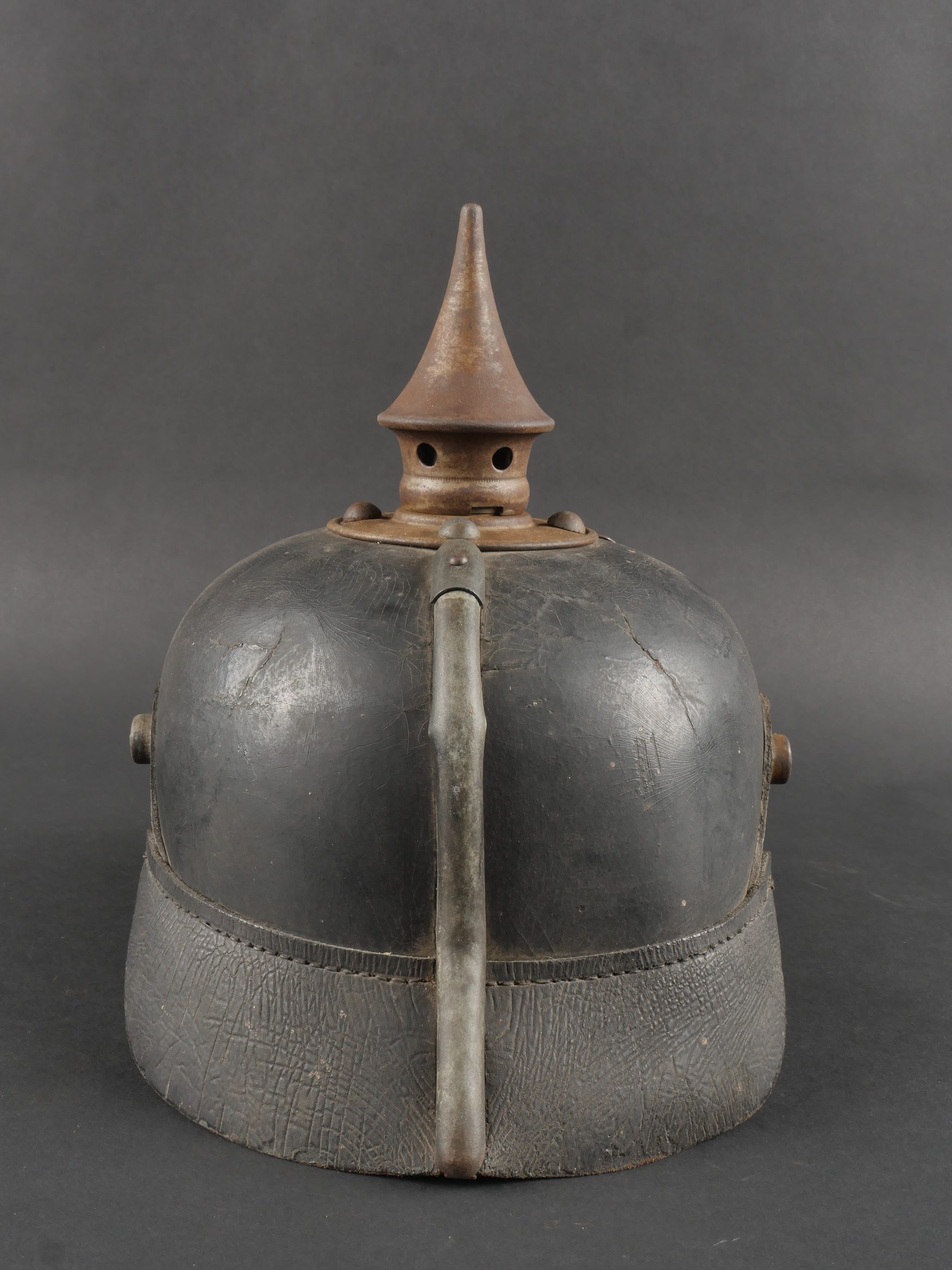 Casque à pointe prussien troupe modèle 1915. Bombe en cuir bouilli vernis noir. Toutes garnitures en fer peint feldgrau, oxydation. Plaque à l’aigle prussien avec ses pontets. Pointe amovible par système à baïonnette. Jonc de renfort arrière avec aérateur. Rivets d’embase de pointe jamais démontés. Coiffe à dents de loups en cuir fauve, une extrémité abimée. Sous la nuquière, date 1916, tampon de réception sauf erreur de lecture 3BFAR50 soit la 3e Batterie du Feld Artilerie Regiment Nr 50. Tampons recouverts de tampons à la peinture blanche indiquant le passage à l’époque du casque dans un atelier de réparation, ce qui explique la configuration troupe à pied cohabitant avec le marquage FAR. Cocardes et jugulaire absentes. Un casque nature avec son vécu de guerre. Usure d’usage, patine. Prussian Other Ranks Pickelhaube Model 1915 Helmet shell in blackened boiled leather, all fittings in field-grey painted steel, showing oxidation. Prussian eagle plate with mounting loops, removable spike by bayonet system, rear spine with vent. Spike base rivets never removed. Brown leather liner with “wolf tooth” tongues, one damaged. Rear visor marked 1916, with reception stamp (likely) “3.B.F.A.R.50” for 3rd Battery, Field Artillery Regiment Nr. 50. Overstamped white paint markings suggesting workshop repair during wartime, explaining mixed infantry/artillery configuration. Missing cockades and chinstrap. Untouched helmet with genuine wartime wear. Signs of use, patina.