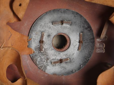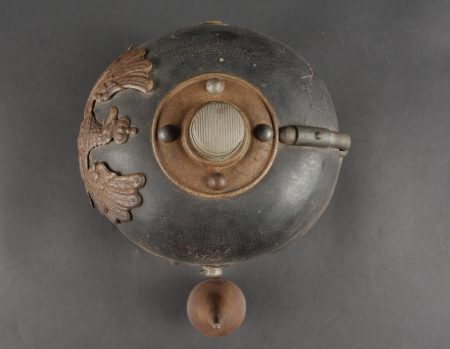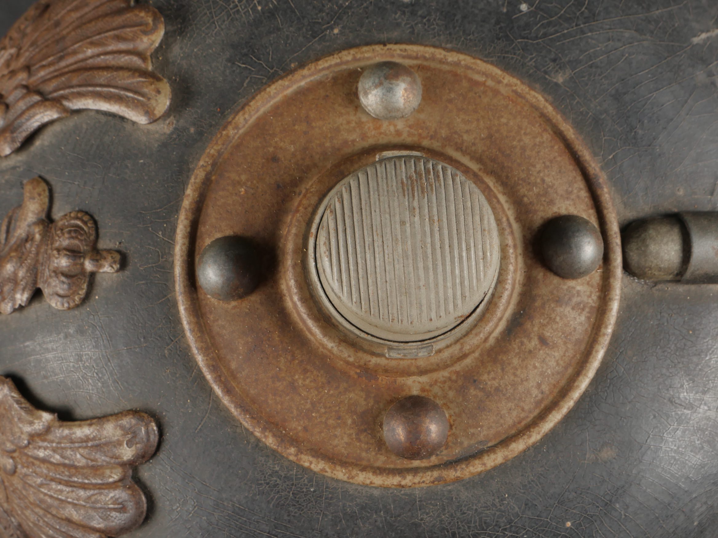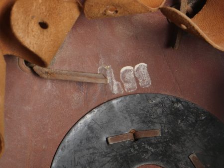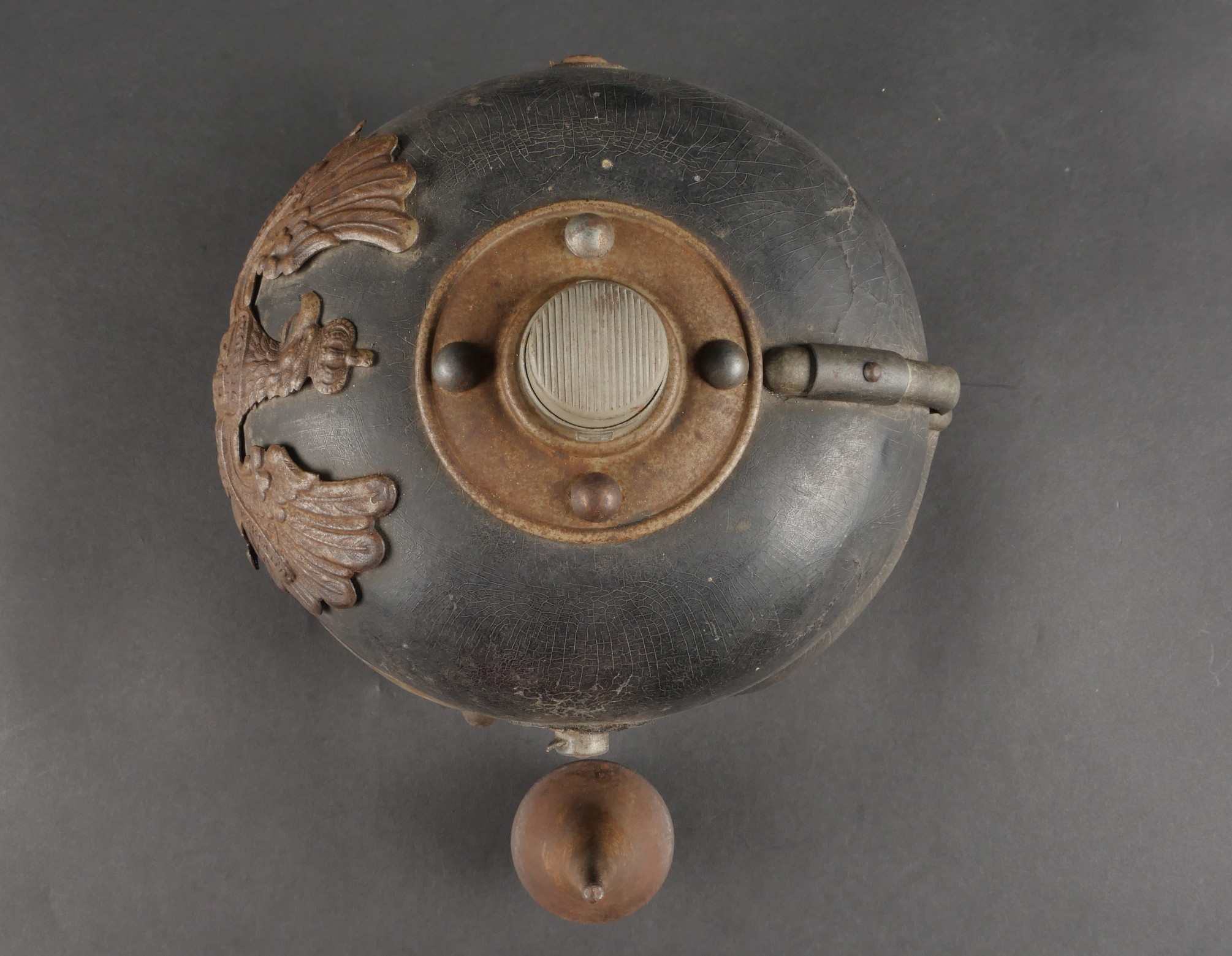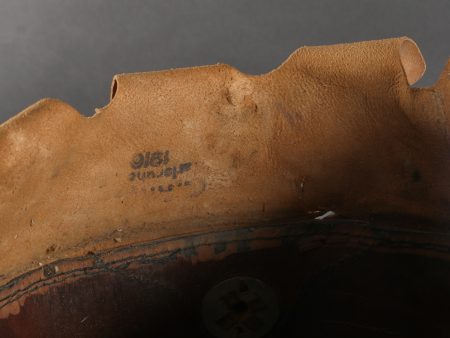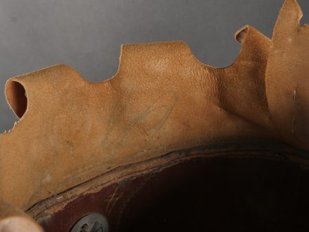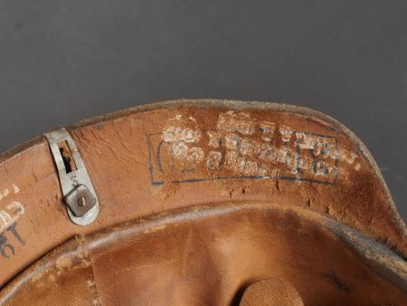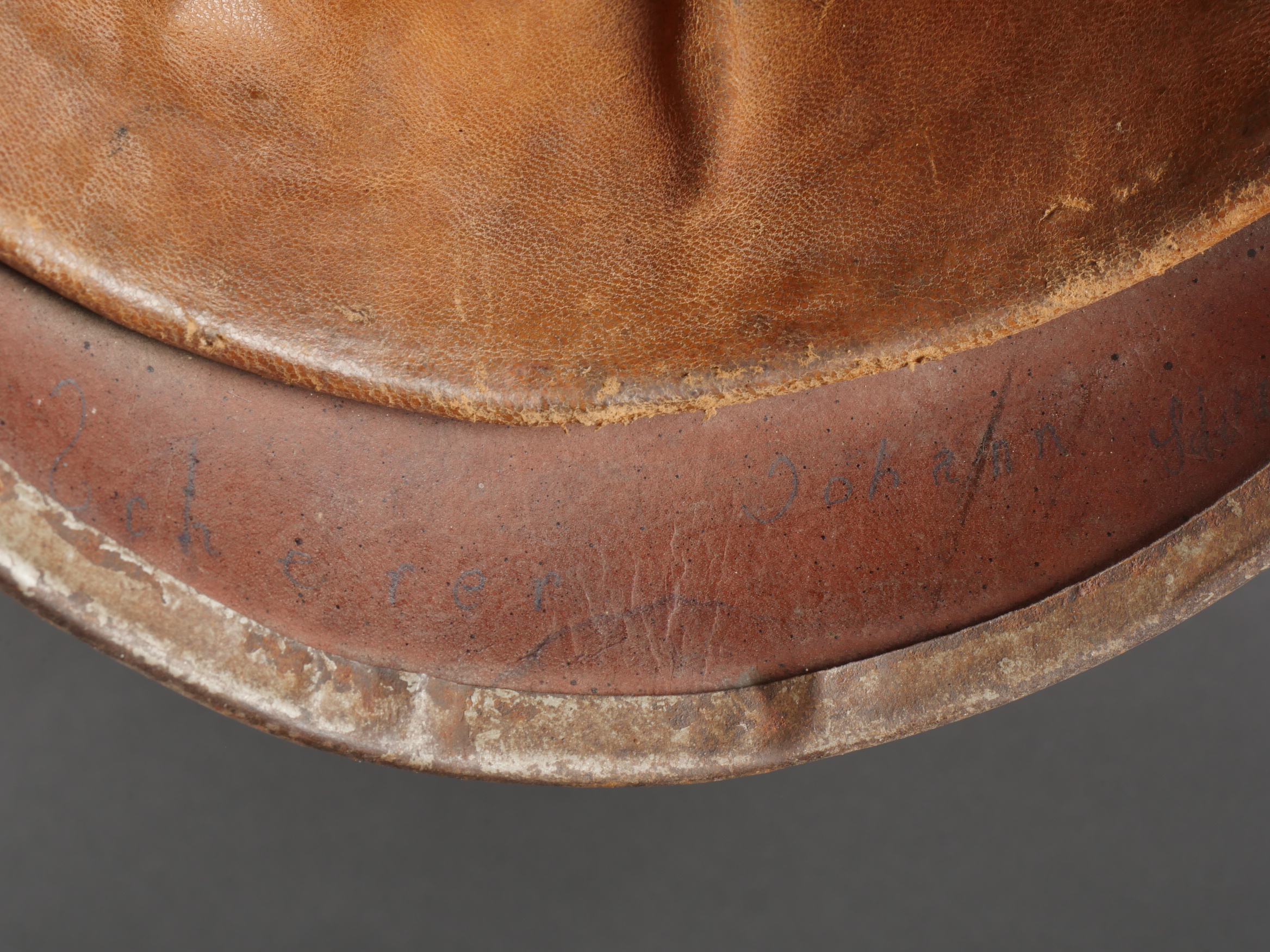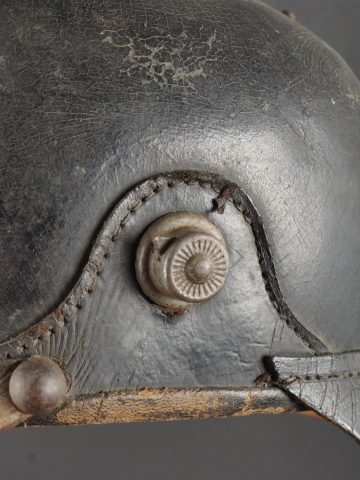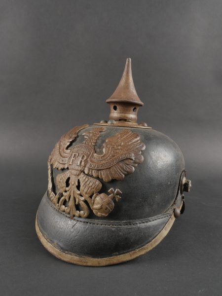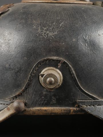 Casque à pointe prussien troupe modèle 1915. Bombe en cuir bouilli vernis noir. Toutes garnitures en fer peint feldgrau, oxydation. Plaque à l’aigle prussien avec ses pontets. Pointe amovible par système à baïonnette. Jonc de renfort arrière avec aérateur. Rivets d’embase de pointe jamais démontés. Coiffe à dents de loups en cuir fauve, une extrémité abimée. Sous la nuquière, date 1916, tampon de réception sauf erreur de lecture 3BFAR50 soit la 3e Batterie du Feld Artilerie Regiment Nr 50. Tampons recouverts de tampons à la peinture blanche indiquant le passage à l’époque du casque dans un atelier de réparation, ce qui explique la configuration troupe à pied cohabitant avec le marquage FAR. Cocardes et jugulaire absentes. Un casque nature avec son vécu de guerre. Usure d’usage, patine. Prussian Other Ranks Pickelhaube Model 1915 Helmet shell in blackened boiled leather, all fittings in field-grey painted steel, showing oxidation. Prussian eagle plate with mounting loops, removable spike by bayonet system, rear spine with vent. Spike base rivets never removed. Brown leather liner with “wolf tooth” tongues, one damaged. Rear visor marked 1916, with reception stamp (likely) “3.B.F.A.R.50” for 3rd Battery, Field Artillery Regiment Nr. 50. Overstamped white paint markings suggesting workshop repair during wartime, explaining mixed infantry/artillery configuration. Missing cockades and chinstrap. Untouched helmet with genuine wartime wear. Signs of use, patina.