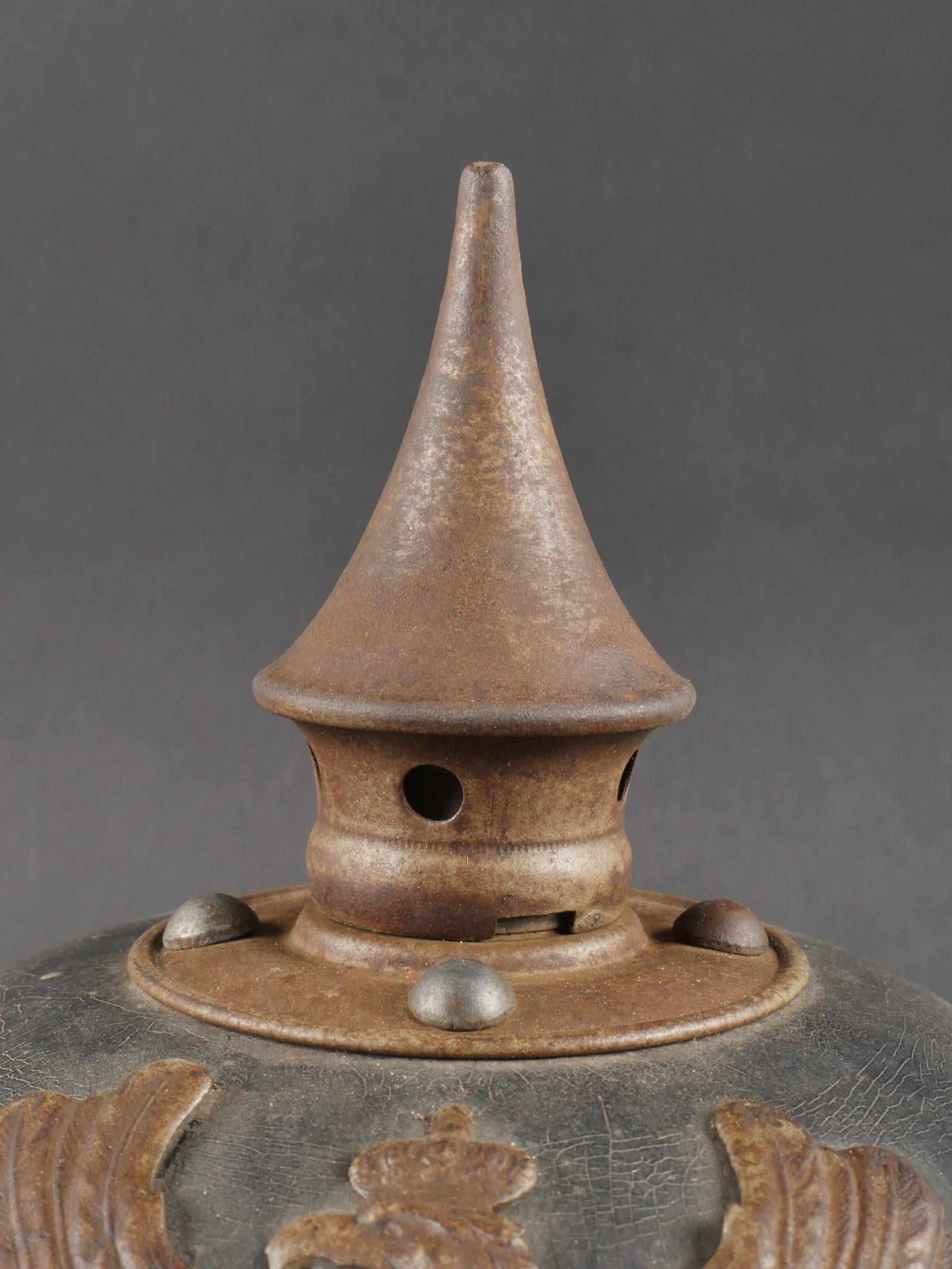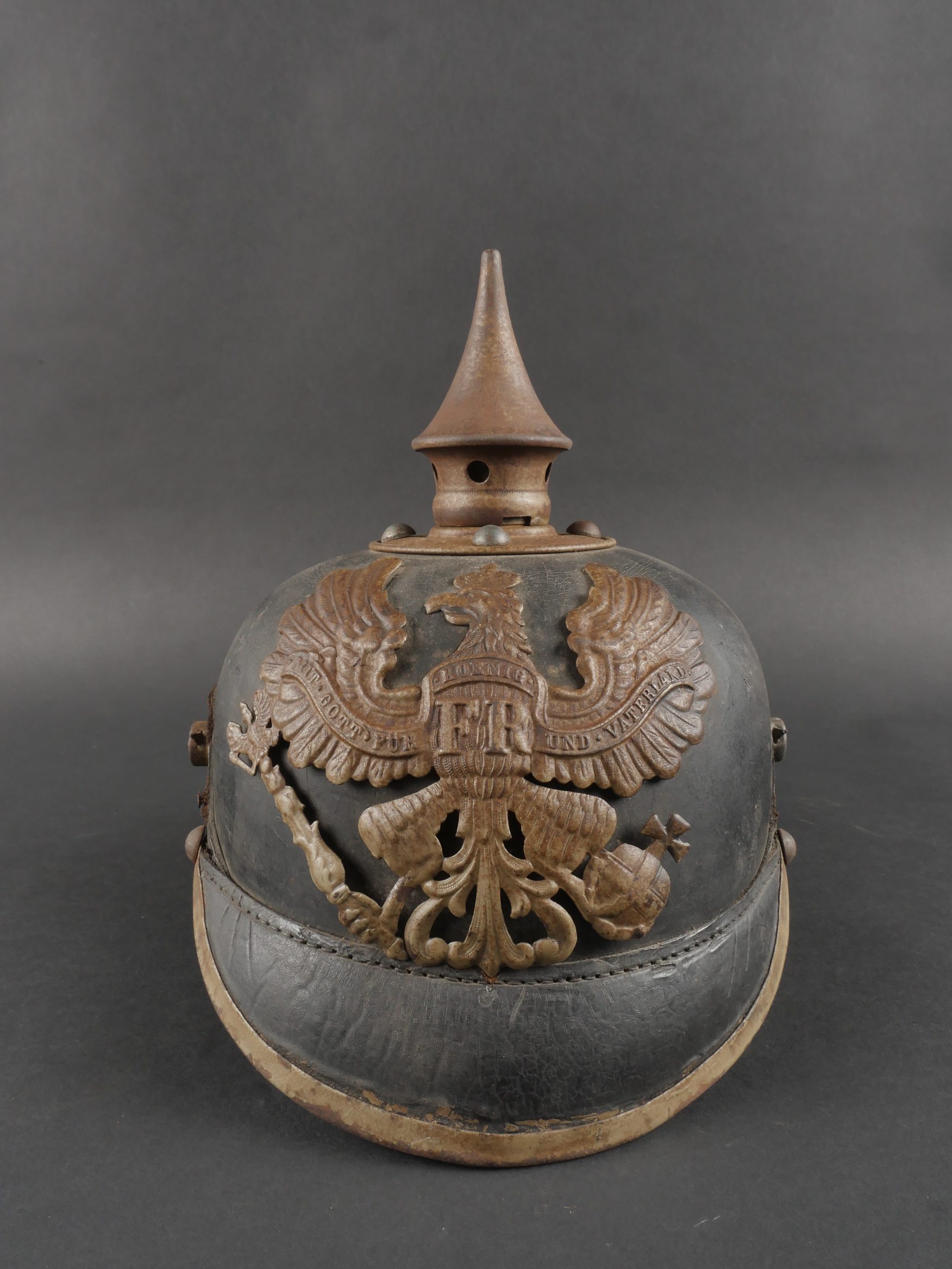 Détails de la vente >Casque à pointe prussien troupe modèle 1915. Bombe en cuir bouilli vernis noir. Toutes garnitures en fer peint feldgrau, oxydation. Plaque à l’aigle prussien avec ses pontets. Pointe... en savoir plus