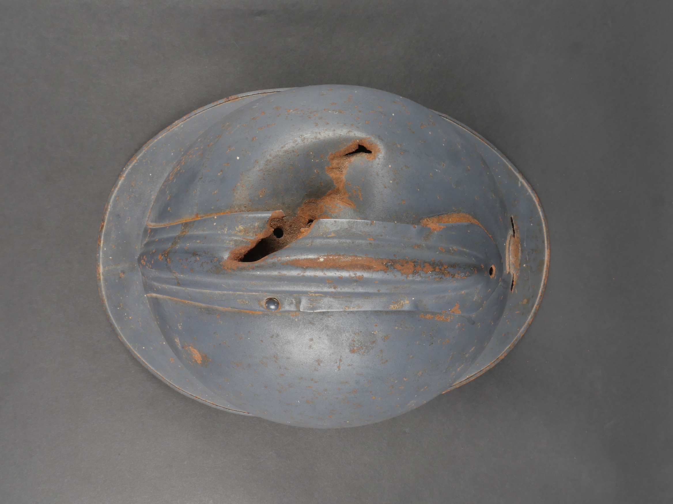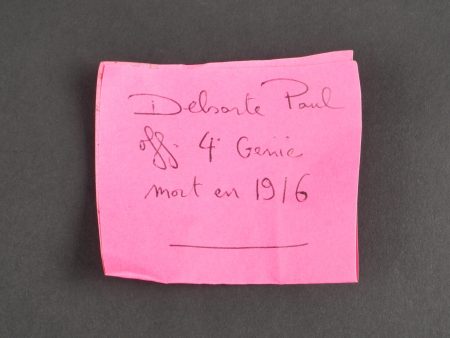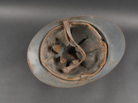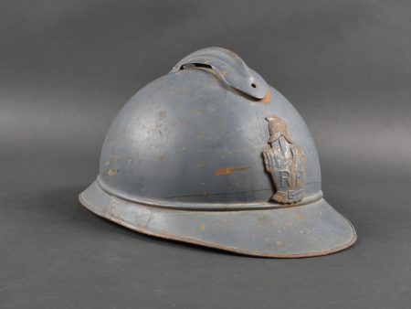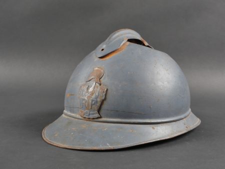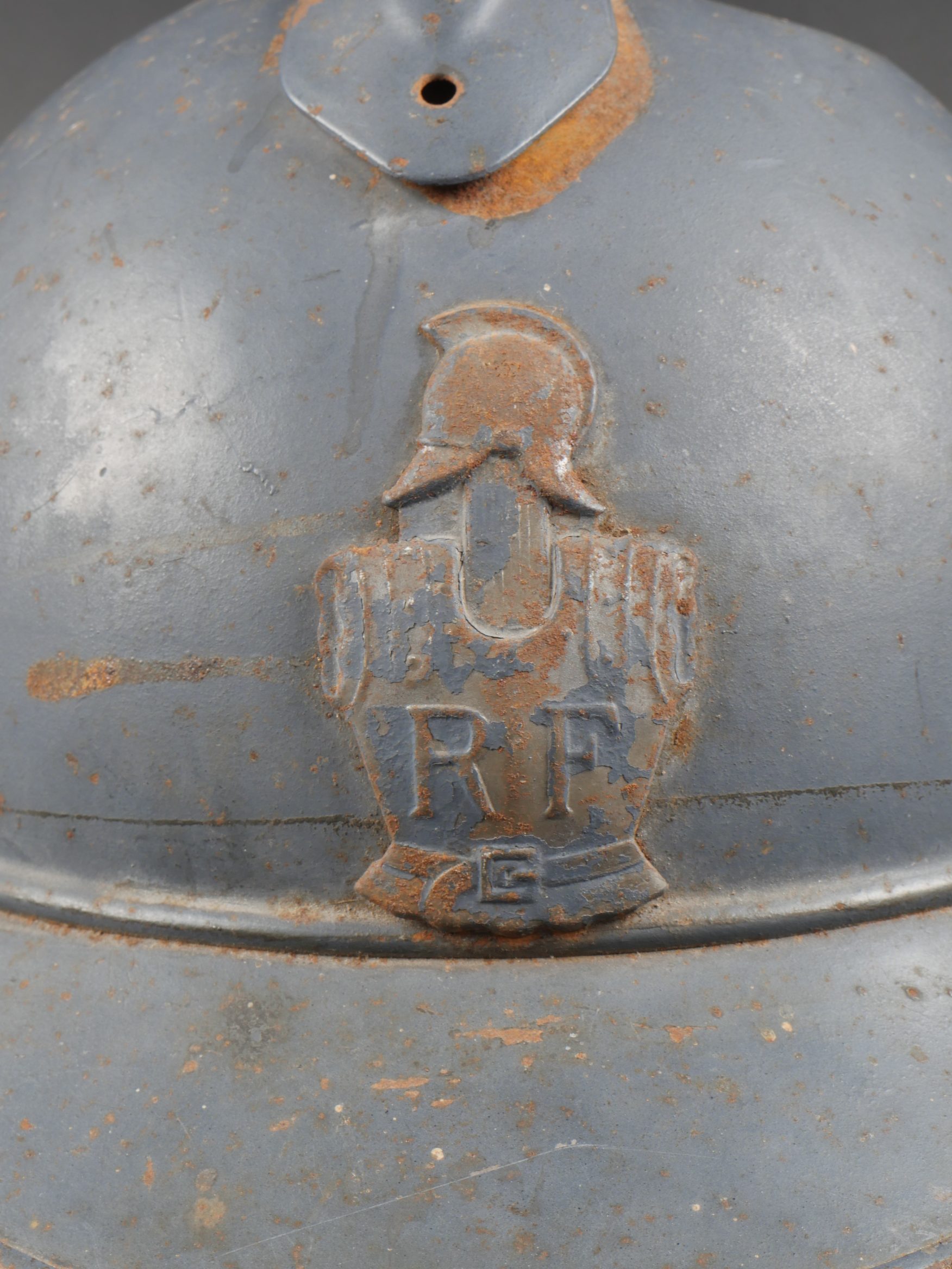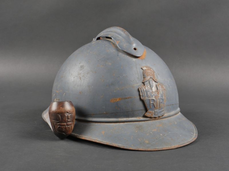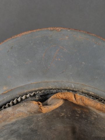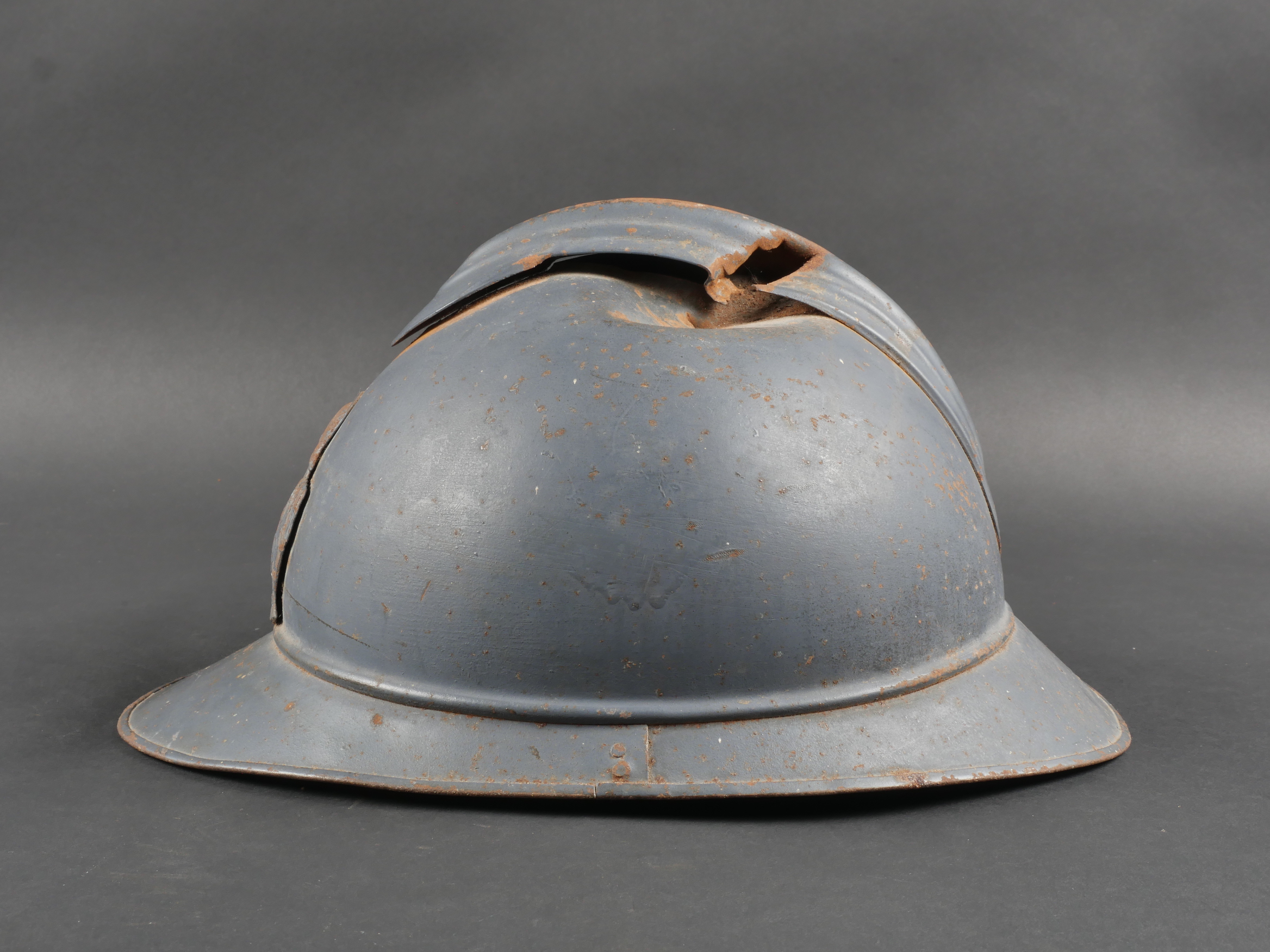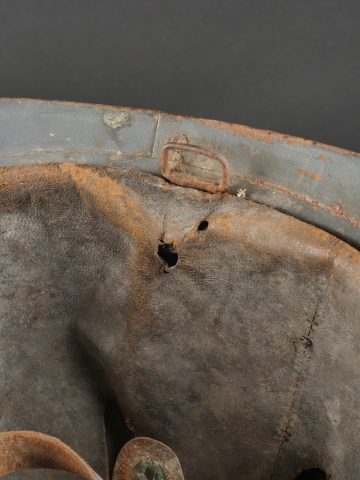 Casque Adrian avec impacts et pipe du Sous Lieutenant Paul Delsarte du 4e Génie tombé à Verdun. Emouvant casque Adrian du Génie ayant appartenu au sous-lieutenant Paul Jean Baptiste Delsarte, officier au 4e Génie, tombé à Verdun le 7 juin 1916. Son casque a reçu un gros impact non traversant sur le haut du côté gauche, endommageant le cimier. Un autre éclat, mortel celui-ci frappera l’officier au côté. Belle peinture bleu horizon. Sous la visière, la lettre D majuscule calligraphiée à la main. Coiffe 1er type avec bandeau en drap bleu foncé presque noir. Jugulaire présente, arrachée par le choc. Avec son fourneau de pipe en bois, gravé au 4e Génie, sans tube. Usure d’usage, patine. Adrian Helmet with Impact and Pipe of Second Lieutenant Paul Delsarte, 4th Engineers, Fallen at Verdun Moving Adrian helmet of the Engineers belonging to Second Lieutenant Paul Jean-Baptiste Delsarte, 4th Engineers, killed at Verdun on June 7, 1916. The helmet bears a large non-penetrating impact on the top left side, damaging the crest, while a second, fatal fragment struck the officer at the side. Beautiful horizon-blue paint. Under the visor, a hand-painted calligraphic “D.” First-type liner with dark blue cloth band, almost black. Original chinstrap torn by the shock. Accompanied by his wooden pipe bowl, carved “4e Génie,” without stem. Signs of use, patina.
