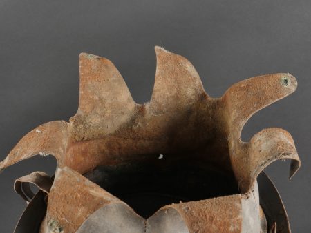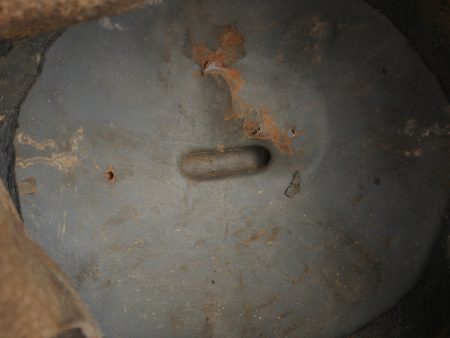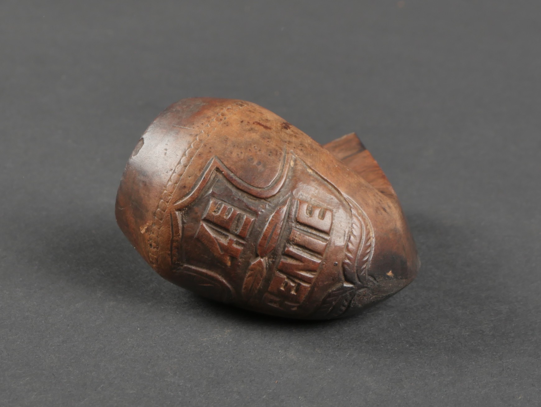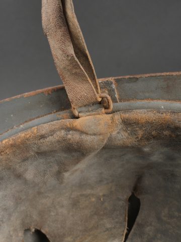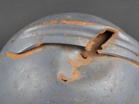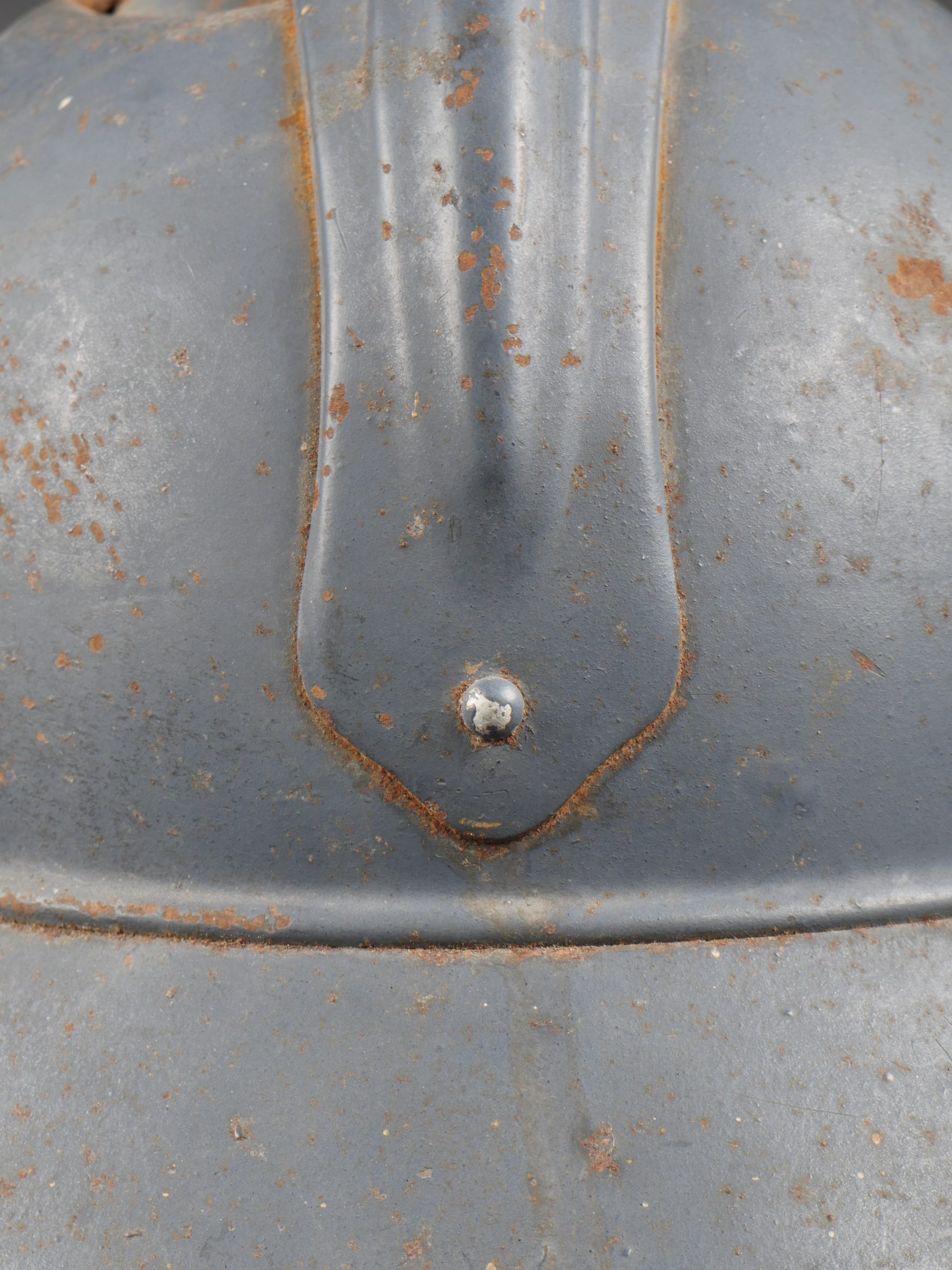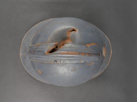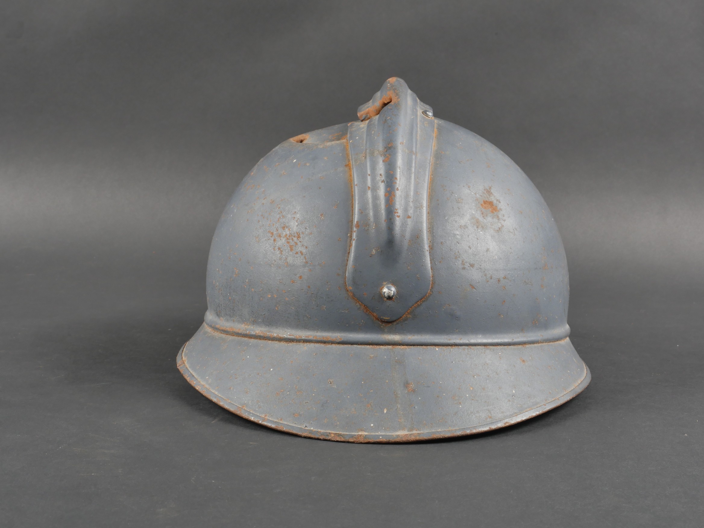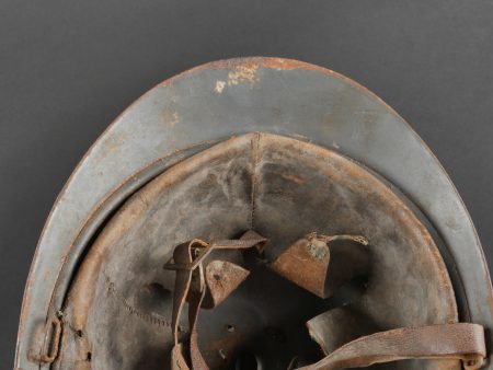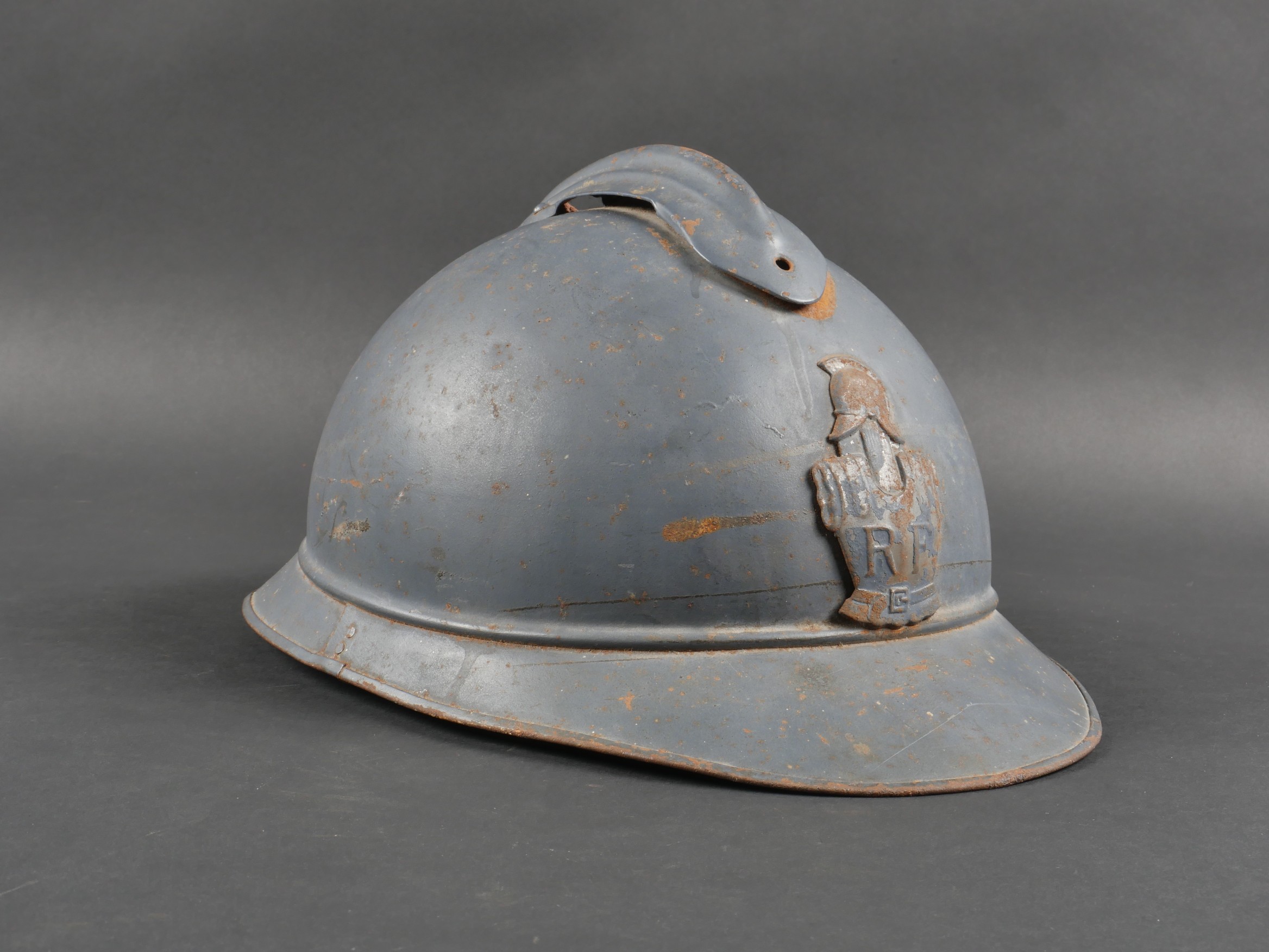 Casque Adrian avec impacts et pipe du Sous Lieutenant Paul Delsarte du 4e Génie tombé à Verdun. Emouvant casque Adrian du Génie ayant appartenu au sous-lieutenant Paul Jean Baptiste Delsarte, officier au 4e Génie, tombé à Verdun le 7 juin 1916. Son casque a reçu un gros impact non traversant sur le haut du côté gauche, endommageant le cimier. Un autre éclat, mortel celui-ci frappera l’officier au côté. Belle peinture bleu horizon. Sous la visière, la lettre D majuscule calligraphiée à la main. Coiffe 1er type avec bandeau en drap bleu foncé presque noir. Jugulaire présente, arrachée par le choc. Avec son fourneau de pipe en bois, gravé au 4e Génie, sans tube. Usure d’usage, patine. Adrian Helmet with Impact and Pipe of Second Lieutenant Paul Delsarte, 4th Engineers, Fallen at Verdun Moving Adrian helmet of the Engineers belonging to Second Lieutenant Paul Jean-Baptiste Delsarte, 4th Engineers, killed at Verdun on June 7, 1916. The helmet bears a large non-penetrating impact on the top left side, damaging the crest, while a second, fatal fragment struck the officer at the side. Beautiful horizon-blue paint. Under the visor, a hand-painted calligraphic “D.” First-type liner with dark blue cloth band, almost black. Original chinstrap torn by the shock. Accompanied by his wooden pipe bowl, carved “4e Génie,” without stem. Signs of use, patina.