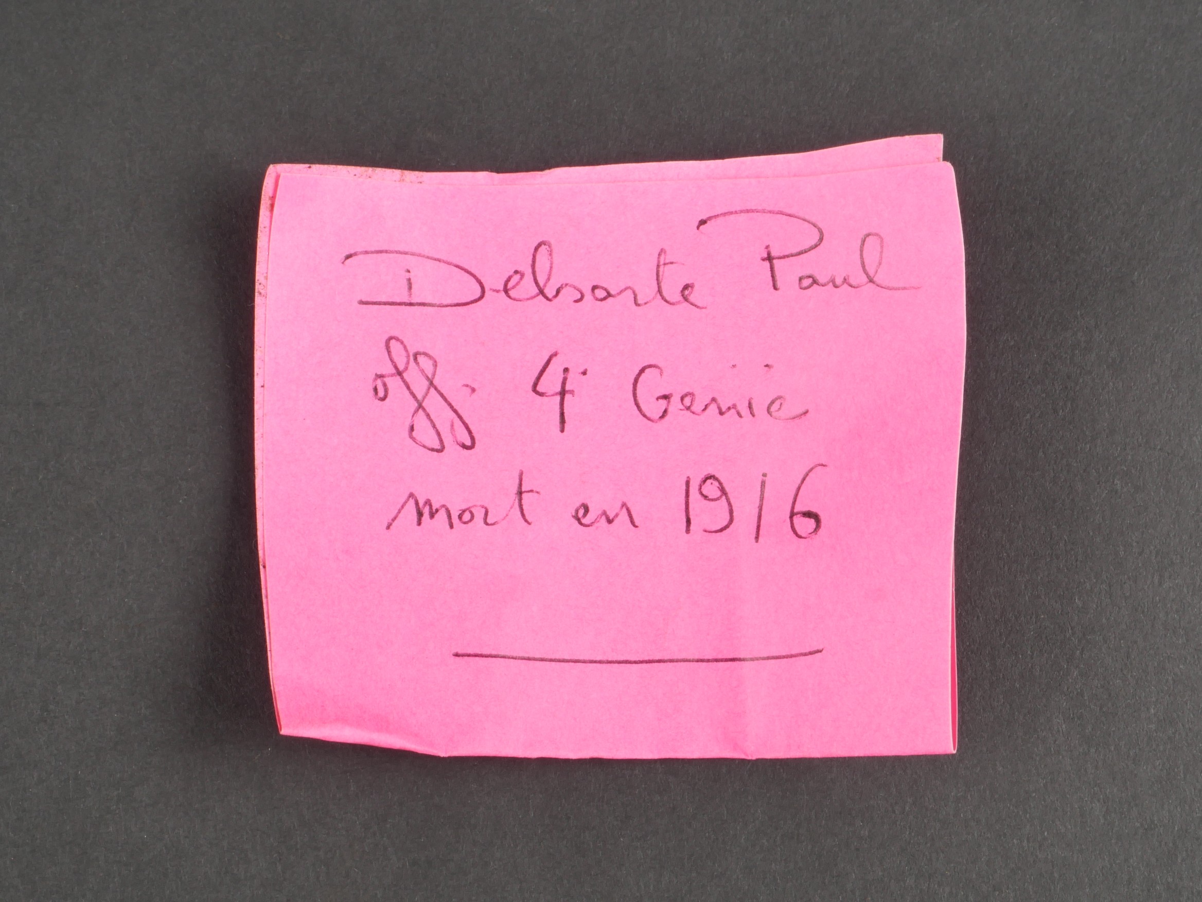 Détails de la vente >Casque Adrian avec impacts et pipe du Sous Lieutenant Paul Delsarte du 4e Génie tombé à Verdun. Emouvant casque Adrian du Génie ayant appartenu au sous-lieutenant Paul Jean Baptiste Delsarte,... en savoir plus