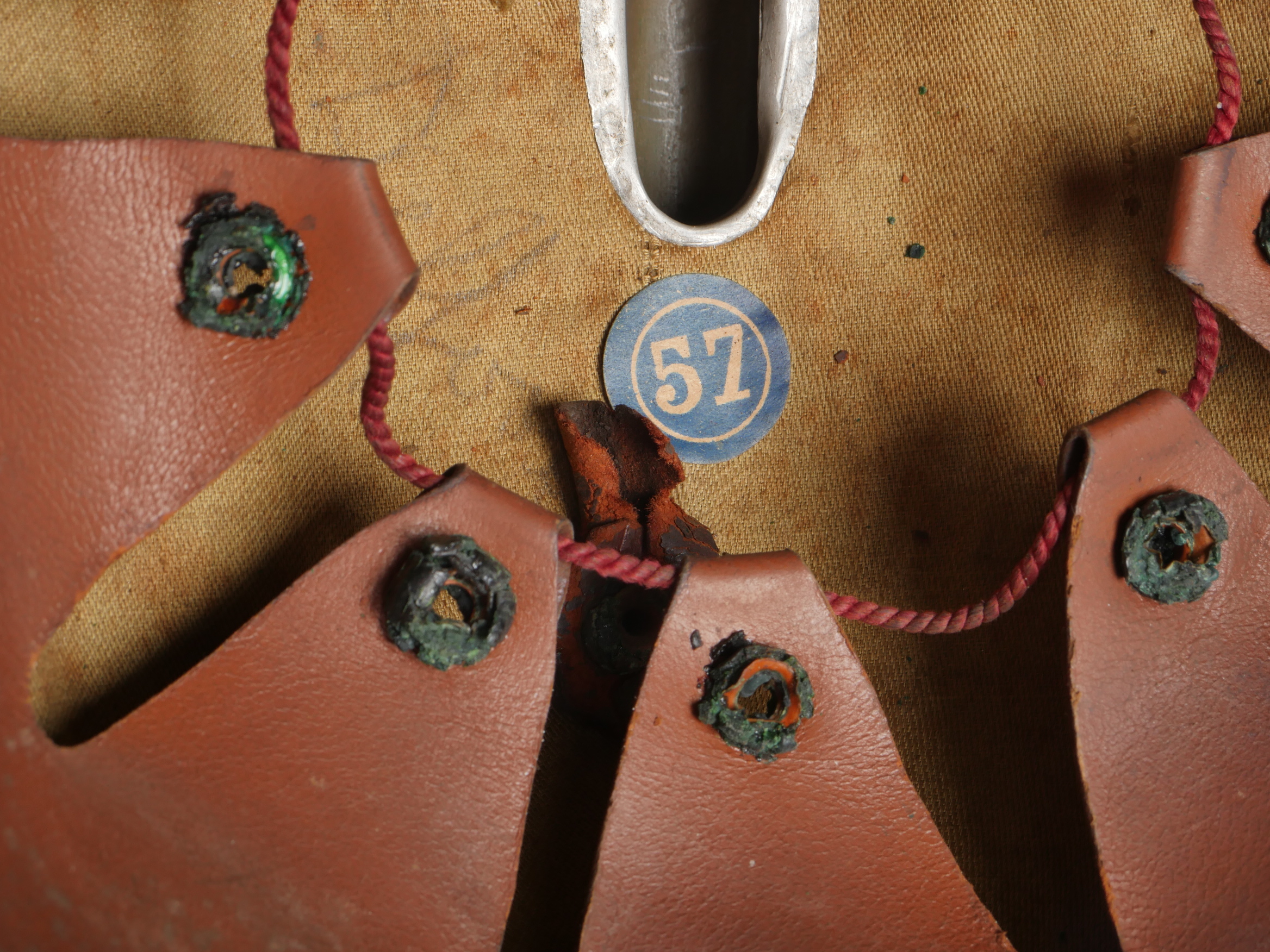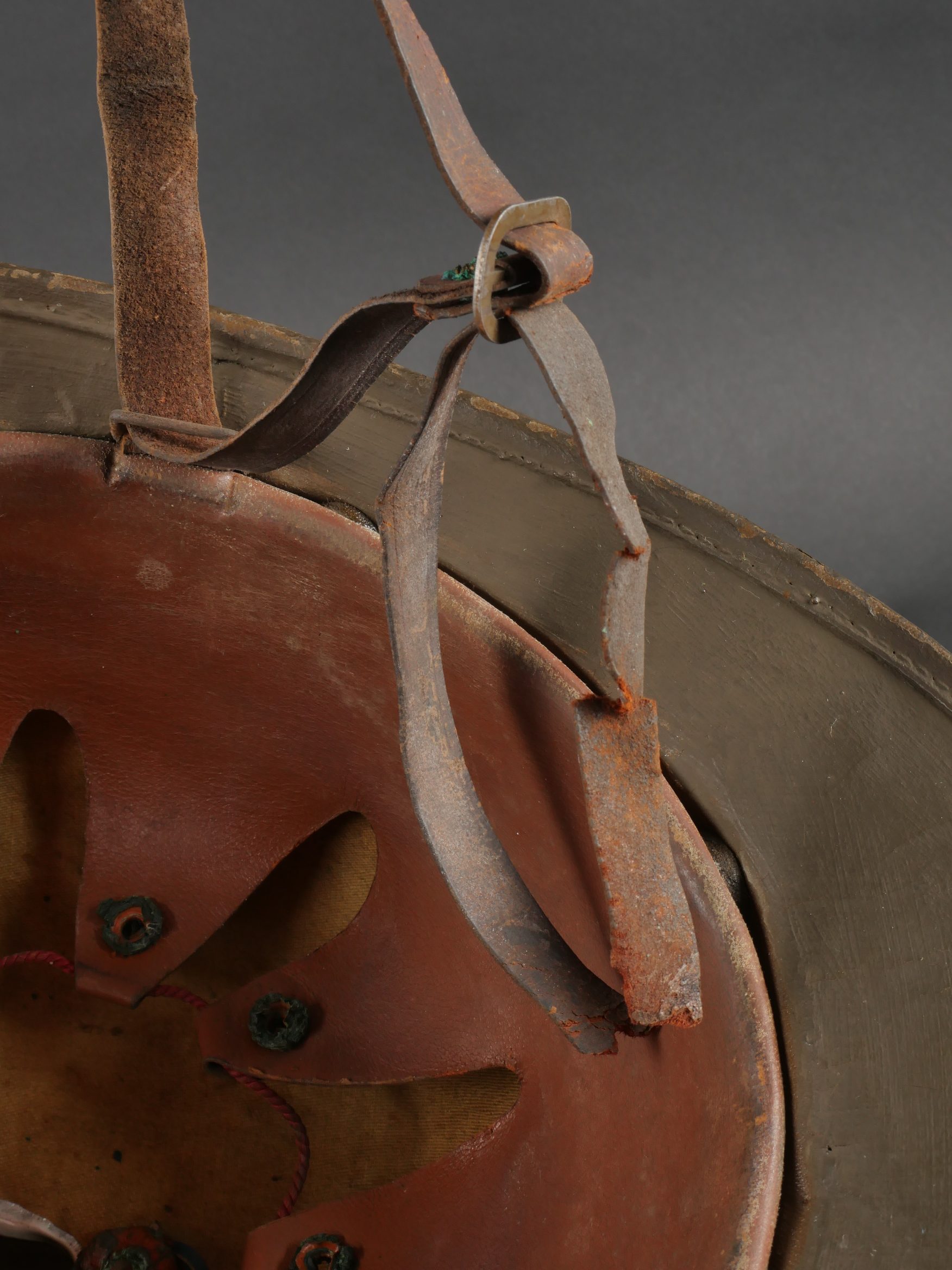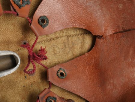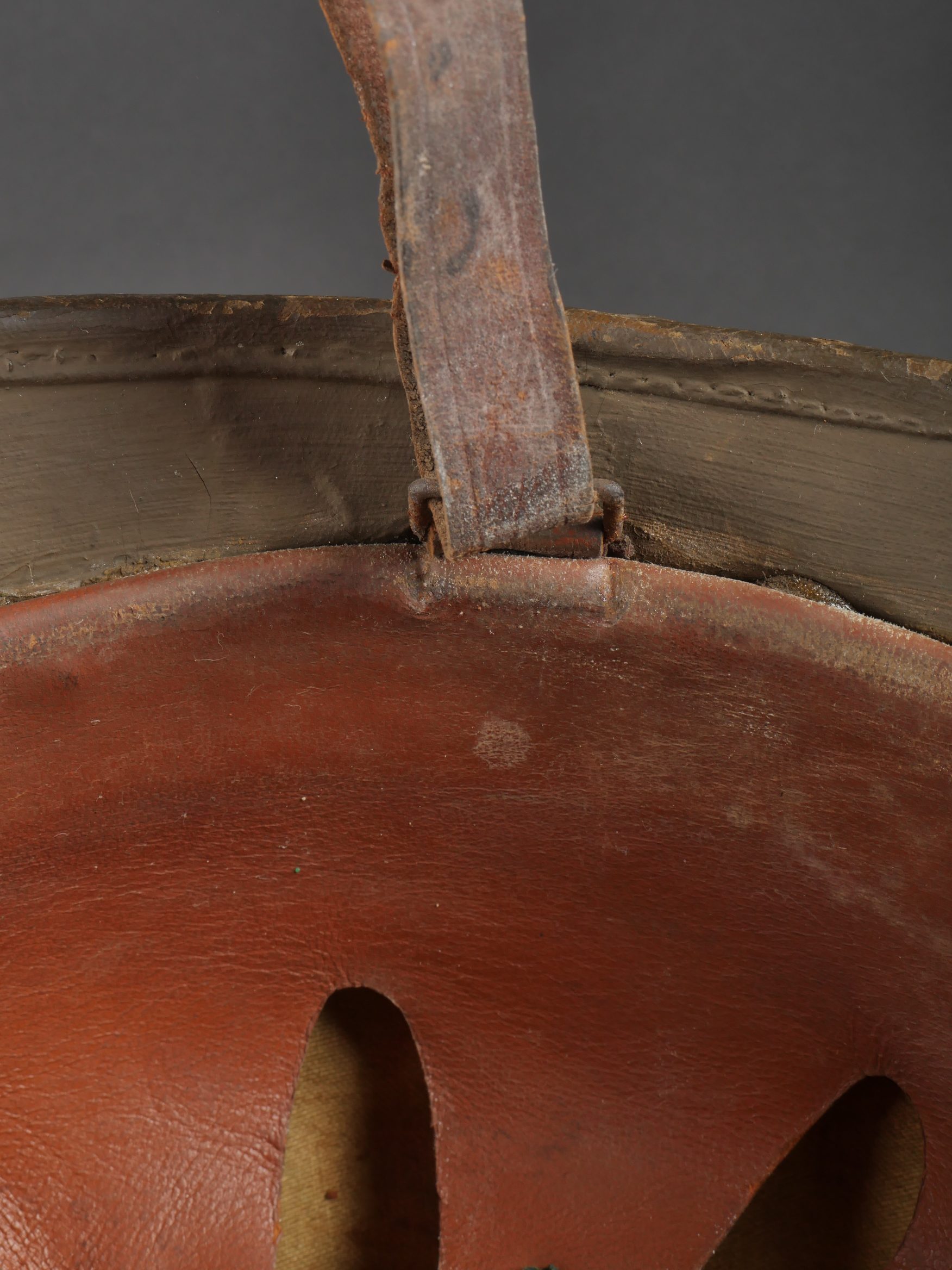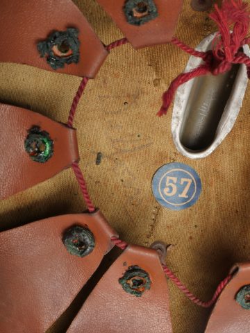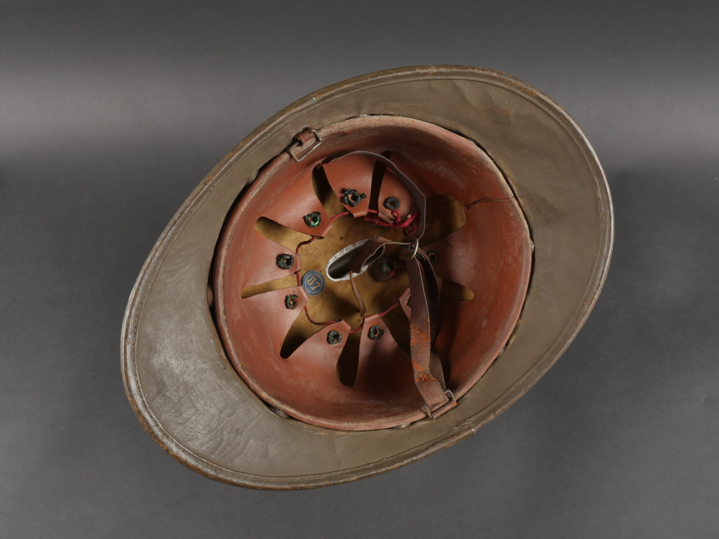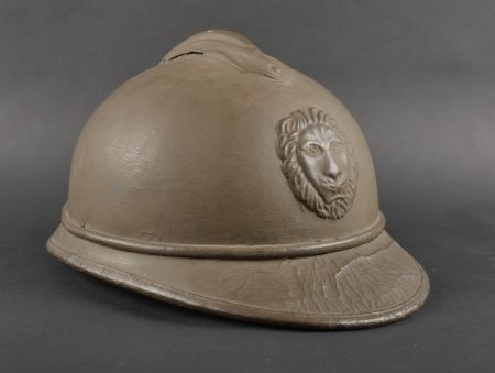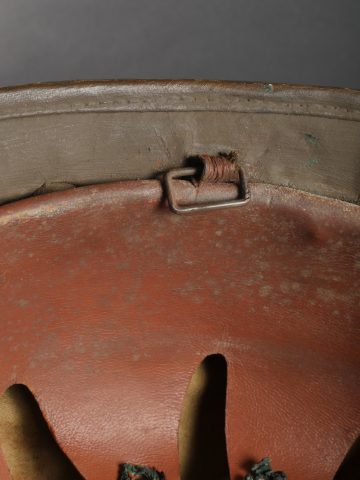 Casque Adrian Belge d’officier en liège. Casque de forme Adrian, réalisé en liège recouvert de toile. L’extérieur et les dessous de visières sont enduit imperméabilisés en peinture verte. Cimier en aluminium peint. Attribut au lion, modèle plat sans oreille. Coiffe à dents de loups avec œillets. Etiquette de taille 57. Le nom Delfosse est deux fois manuscrit à l’intérieur du casque. Jugulaire présente mais cassée. Modèle pour officier entre deux guerres. Bel état, bel aspect. Belgian Officer’s Adrian Helmet in CorkAdrian-pattern helmet made of cork covered with fabric, both outside and under the visors coated in waterproof green paint. Aluminum comb painted to match. Flat lion badge (no ears). Wolf-tooth liner with ventilation eyelets. Size label “57.” The name “Delfosse” handwritten twice inside. Chinstrap present but broken. Officer’s model from the interwar period. Very good appearance and condition.