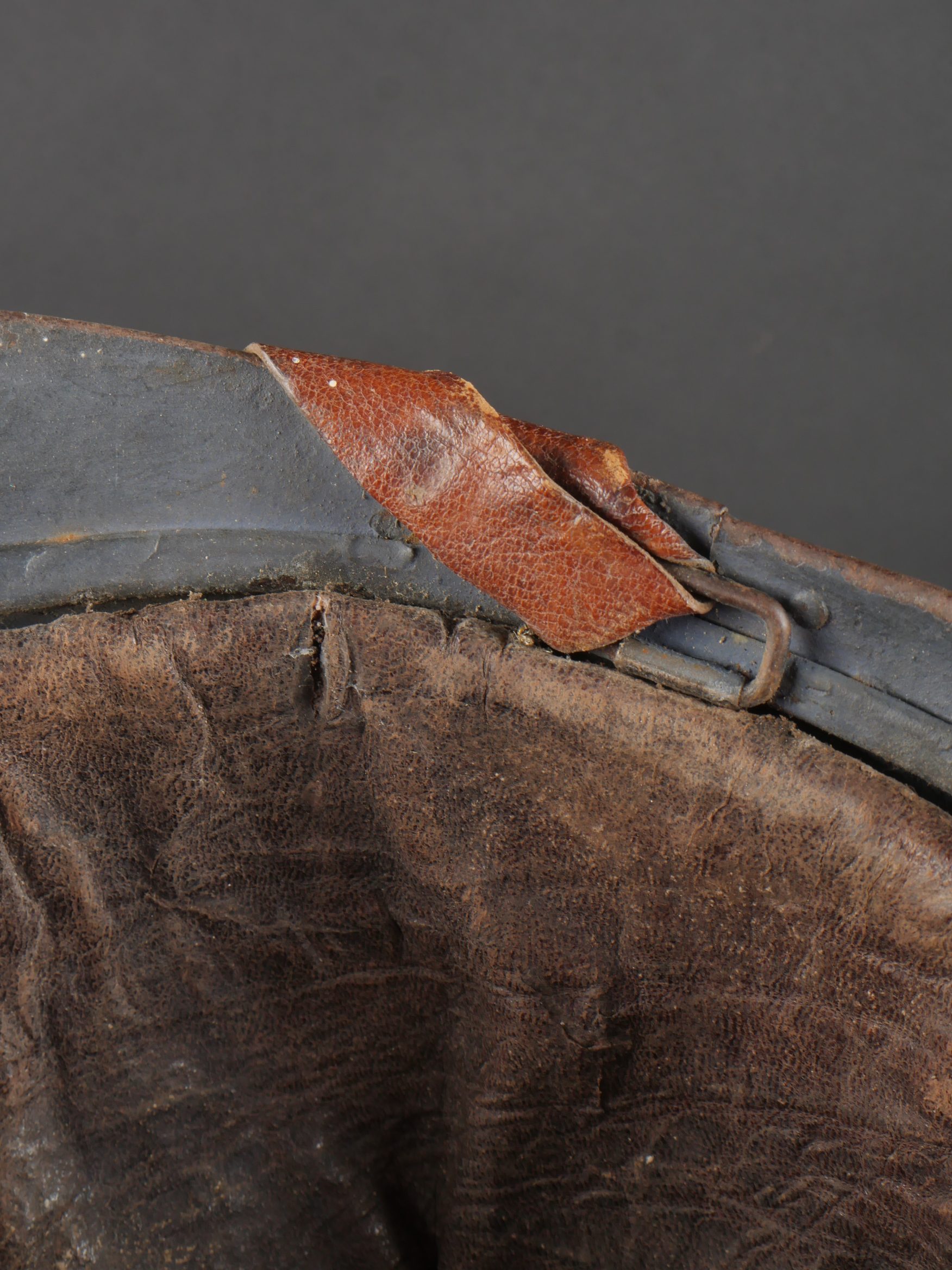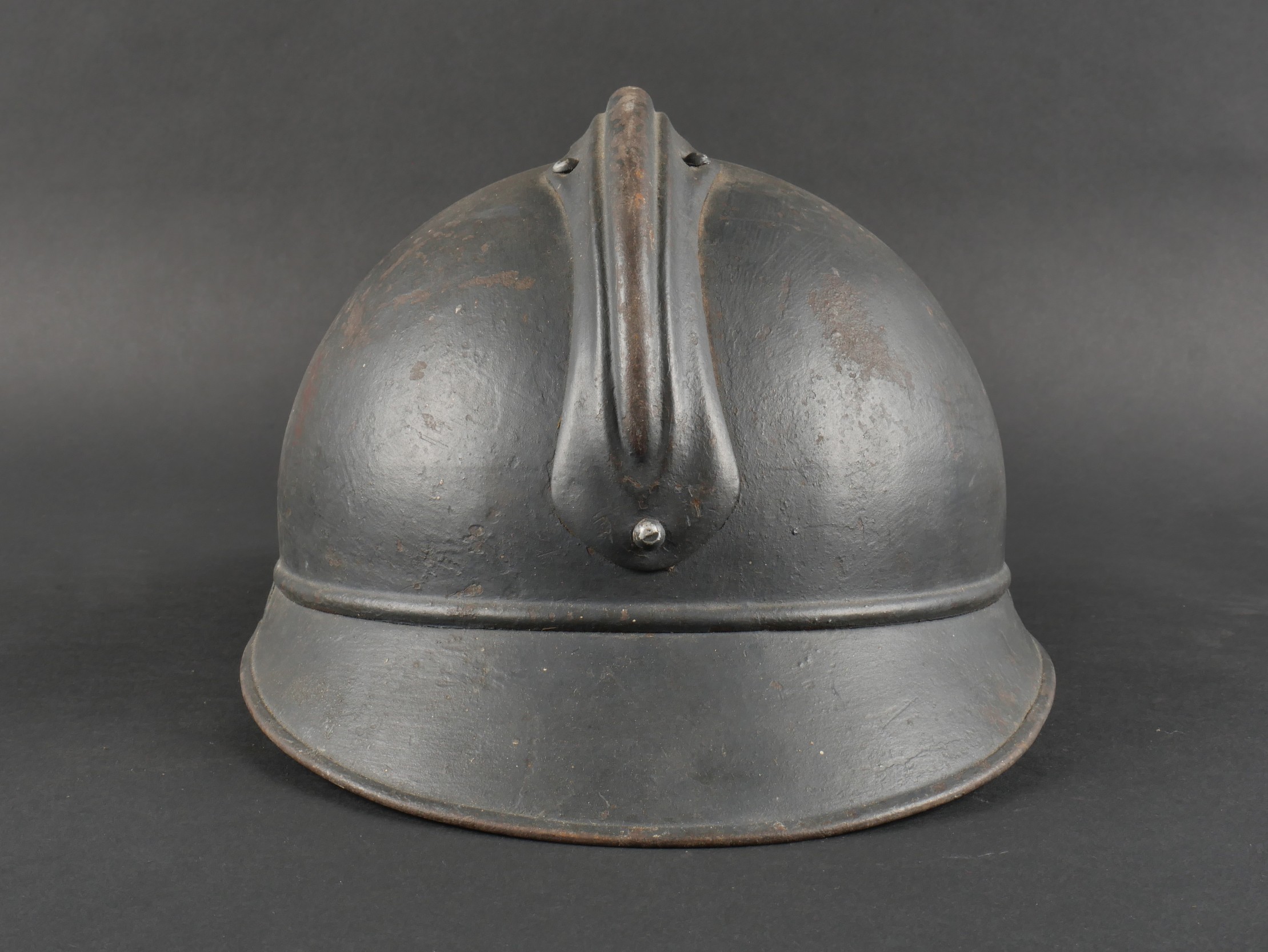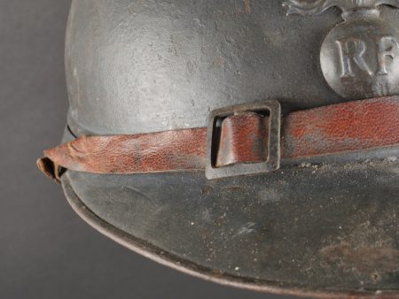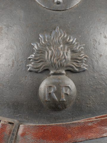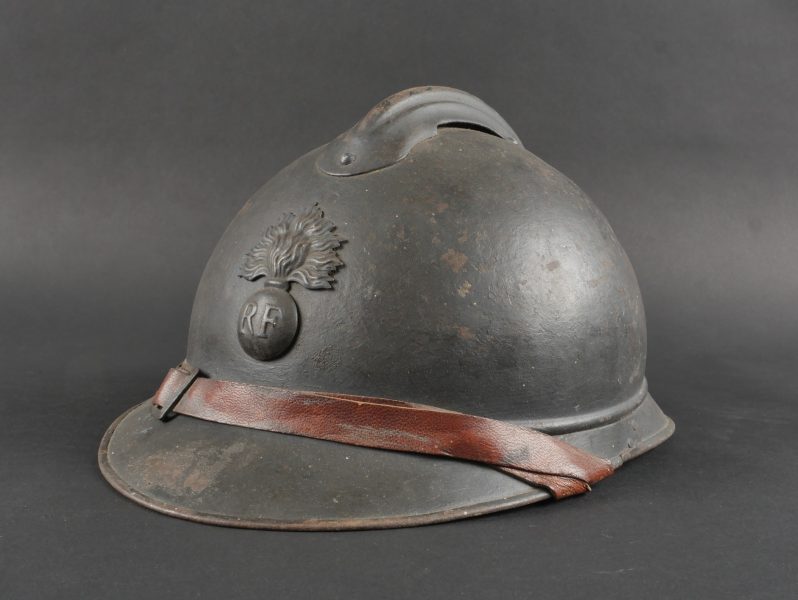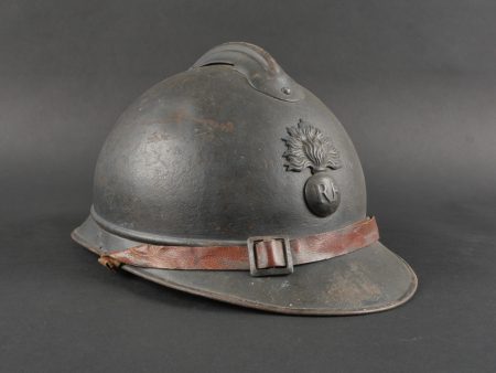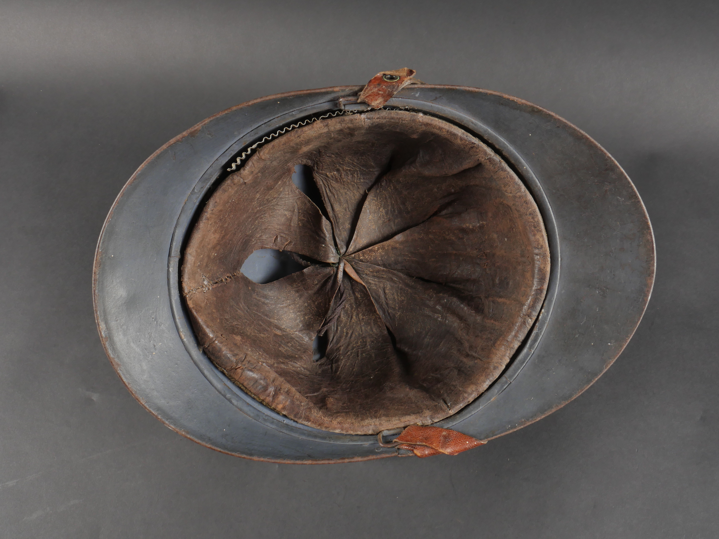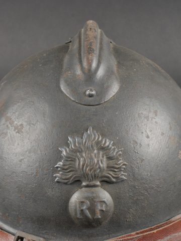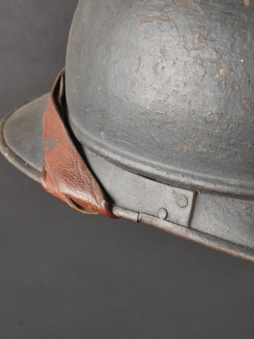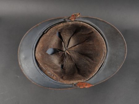 Casque Adrian infanterie. Casque français modèle 1915, avec attribut de l’infanterie. Peinture bleu plutôt sombre . Coiffe du 1er type avec bandeau en drap moutarde. 4 gaufrettes aluminium de réglage. Jugulaire d’origine. Une jolie patine. Adrian Infantry Helmet French Model 1915 helmet with infantry insignia. Darker blue paint. First-type liner with mustard cloth band, four aluminum adjustment washers. Original chinstrap present. Attractive patina.