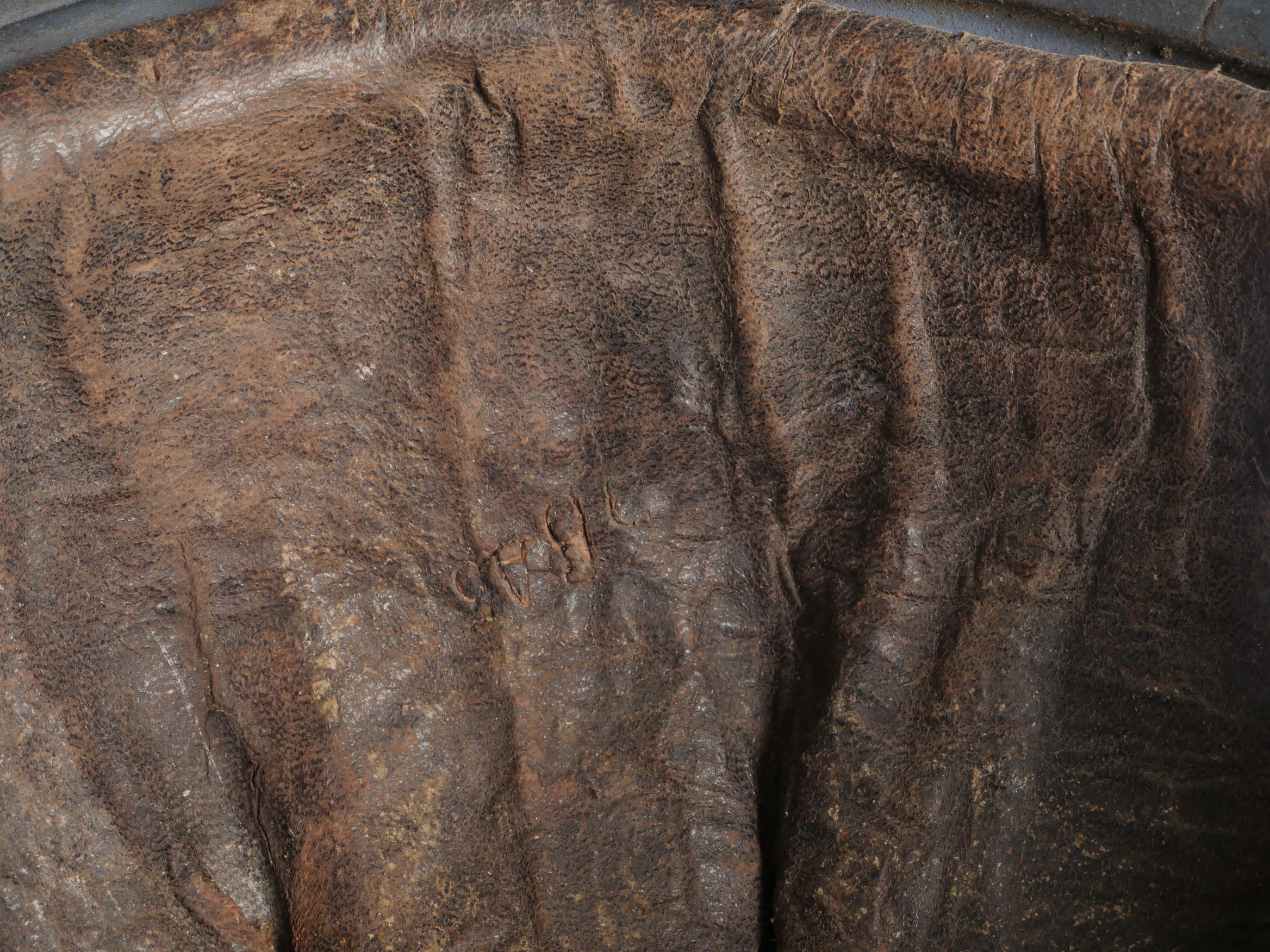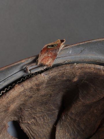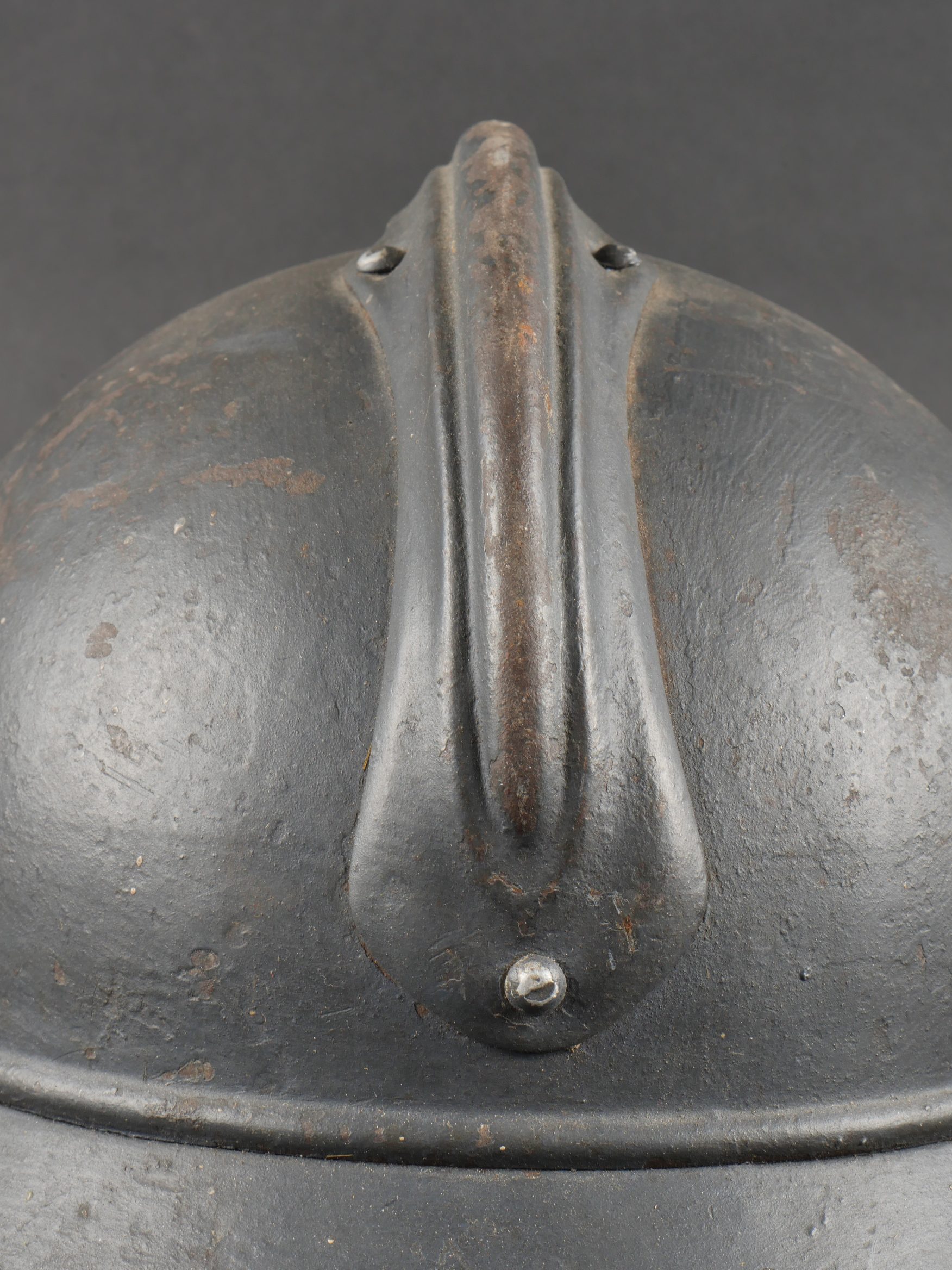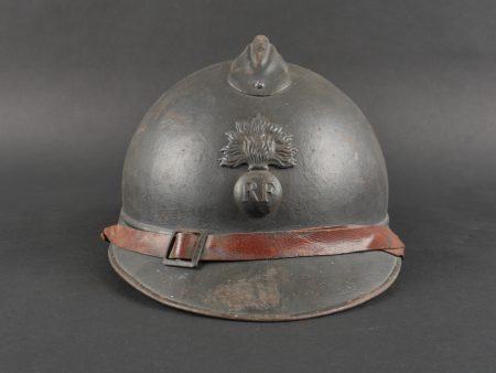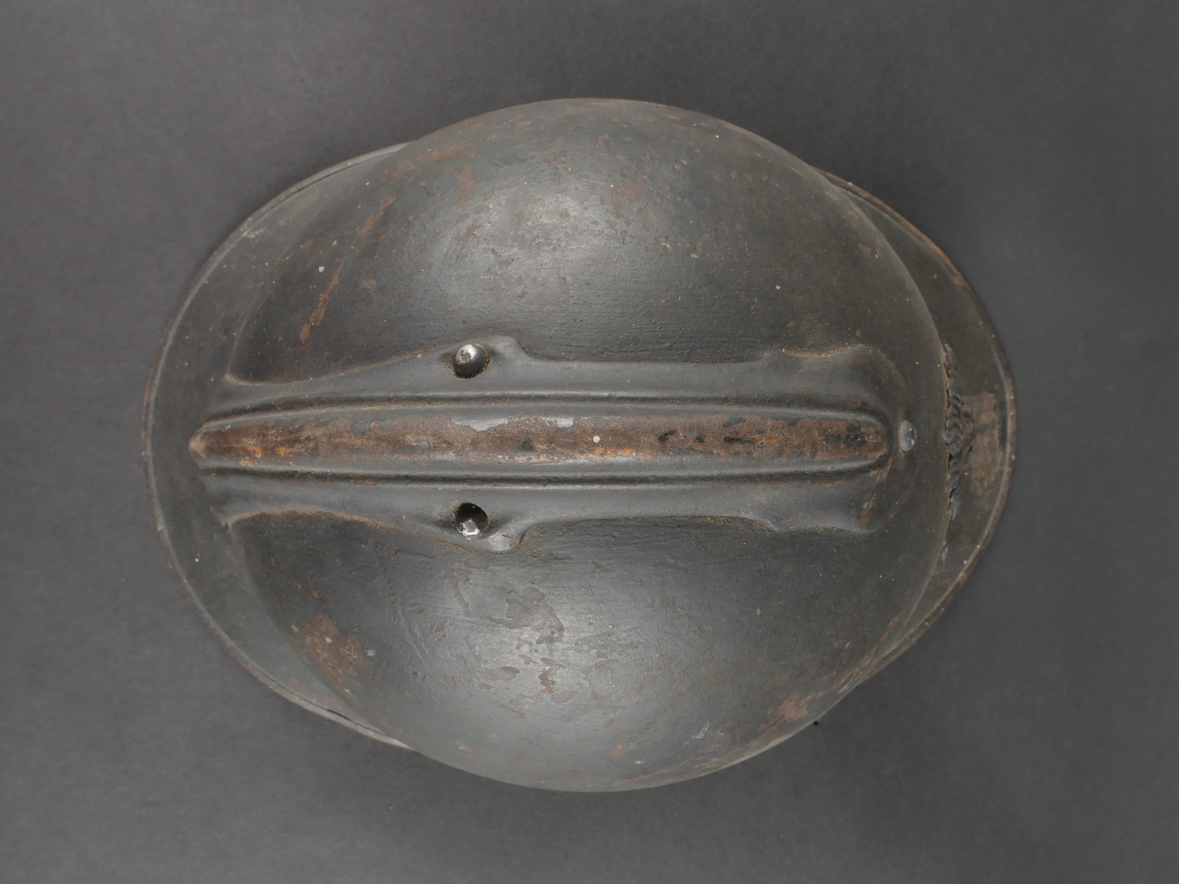 Casque Adrian infanterie. Casque français modèle 1915, avec attribut de l’infanterie. Peinture bleu plutôt sombre . Coiffe du 1er type avec bandeau en drap moutarde. 4 gaufrettes aluminium de réglage. Jugulaire d’origine. Une jolie patine. Adrian Infantry Helmet French Model 1915 helmet with infantry insignia. Darker blue paint. First-type liner with mustard cloth band, four aluminum adjustment washers. Original chinstrap present. Attractive patina.