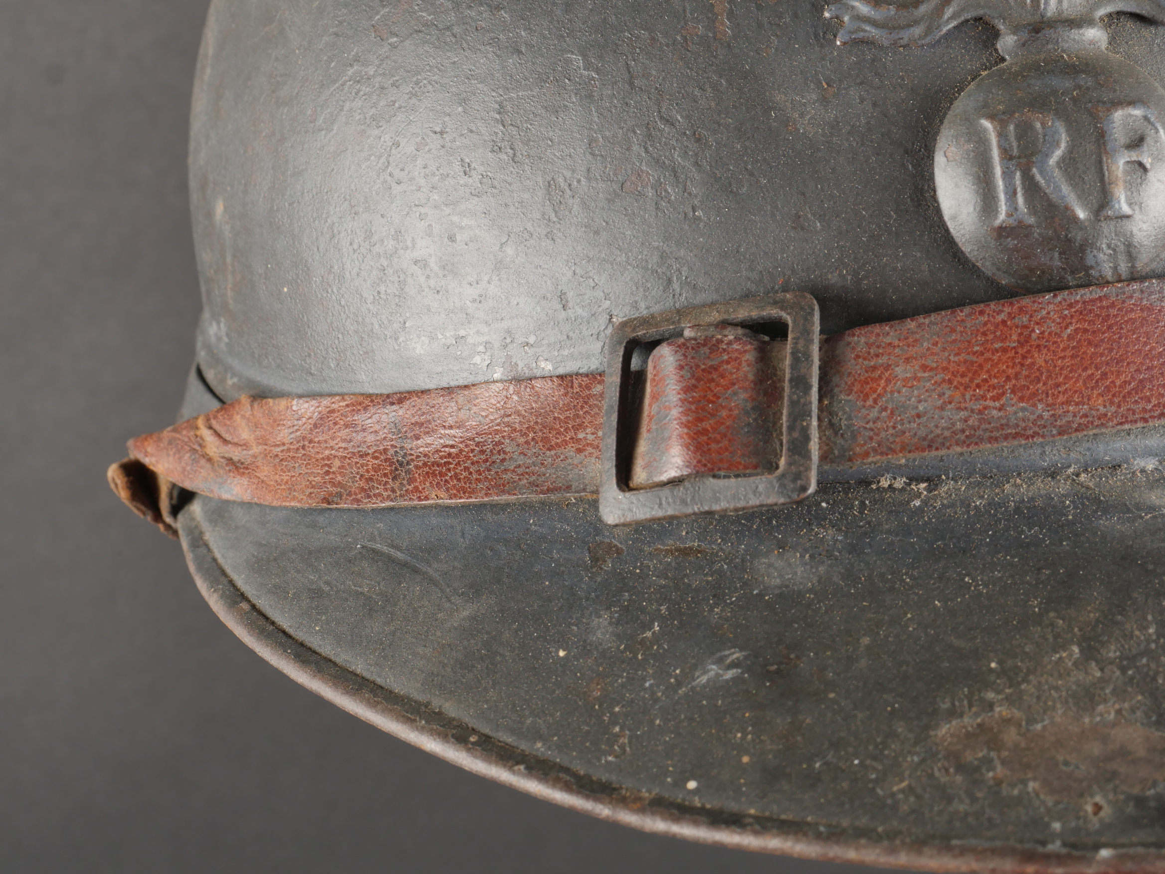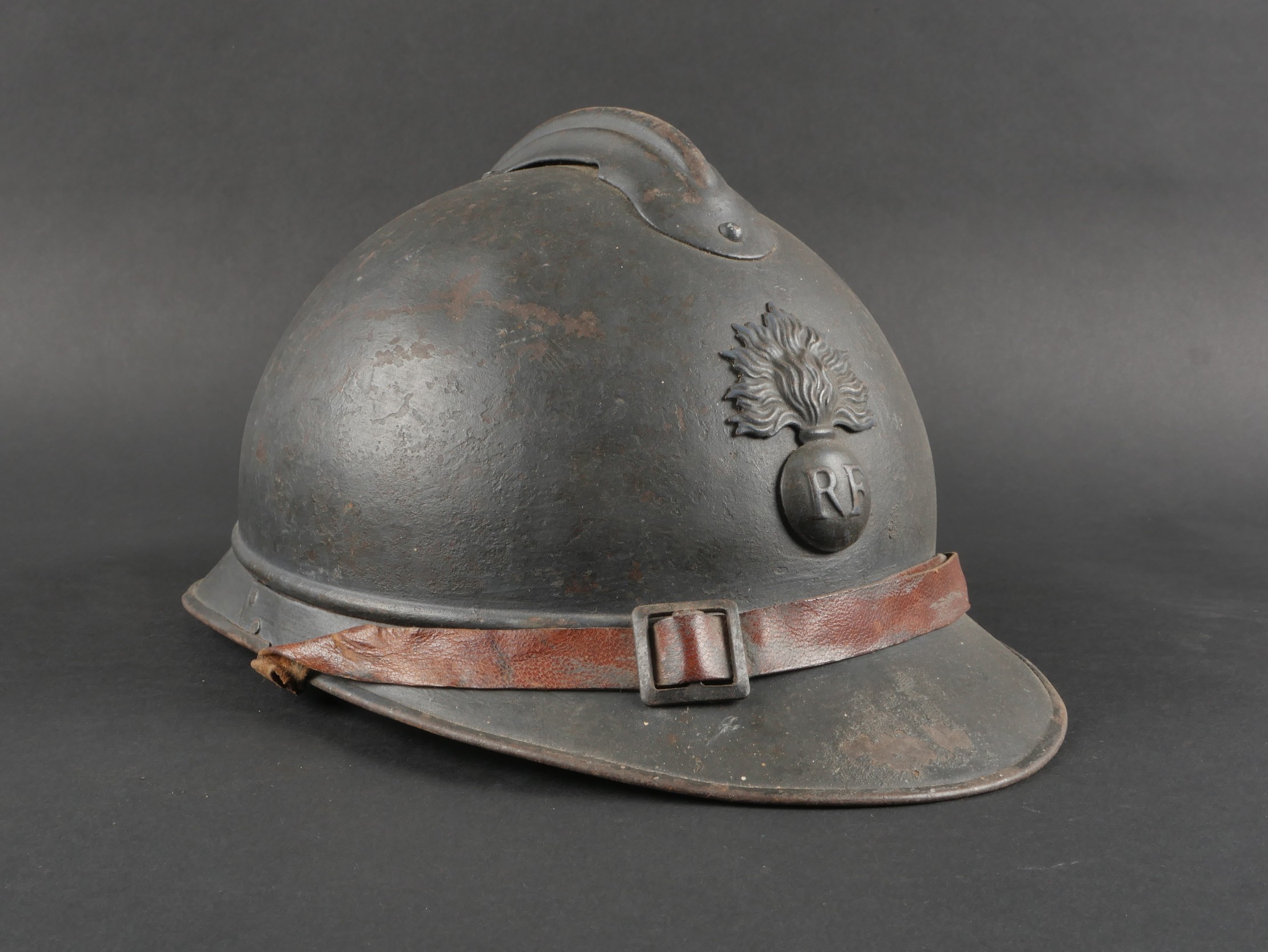 Détails de la vente >Casque Adrian infanterie. Casque français modèle 1915, avec attribut de l’infanterie. Peinture bleu plutôt sombre . Coiffe du 1er type avec bandeau en drap moutarde. 4 gaufrettes... en savoir plus