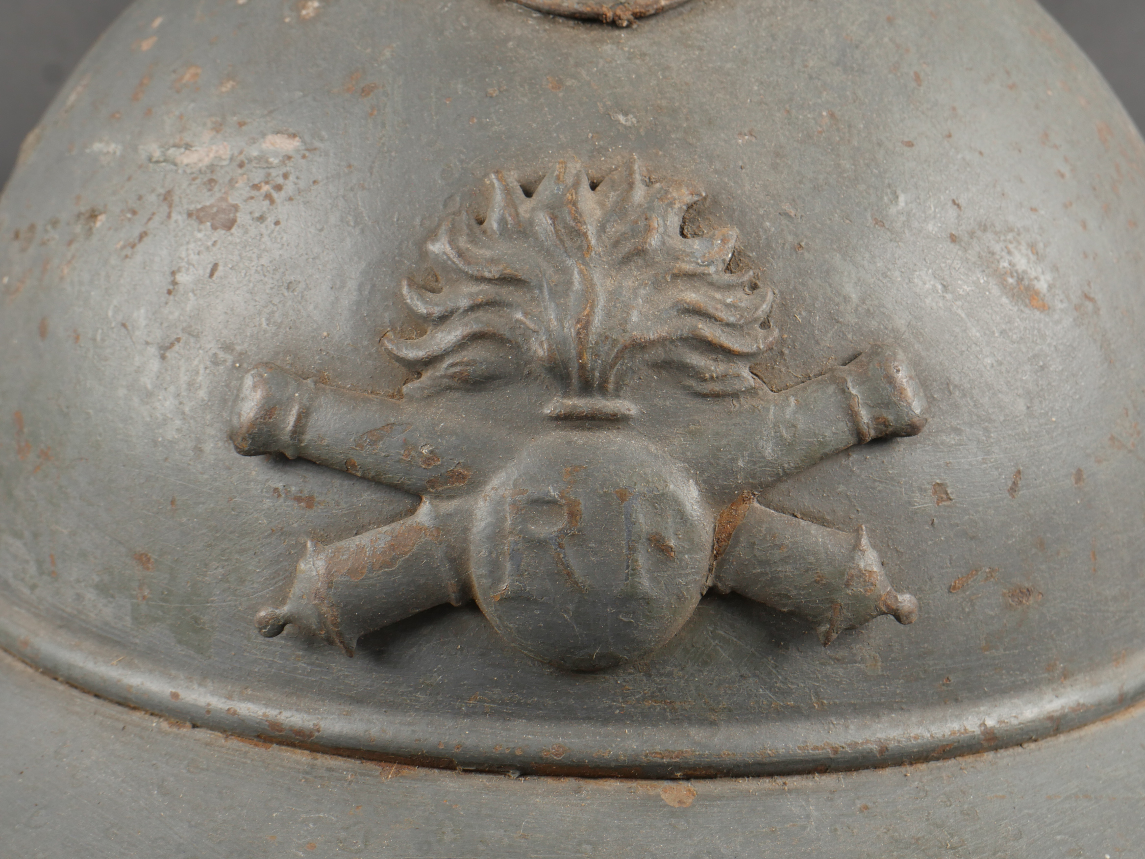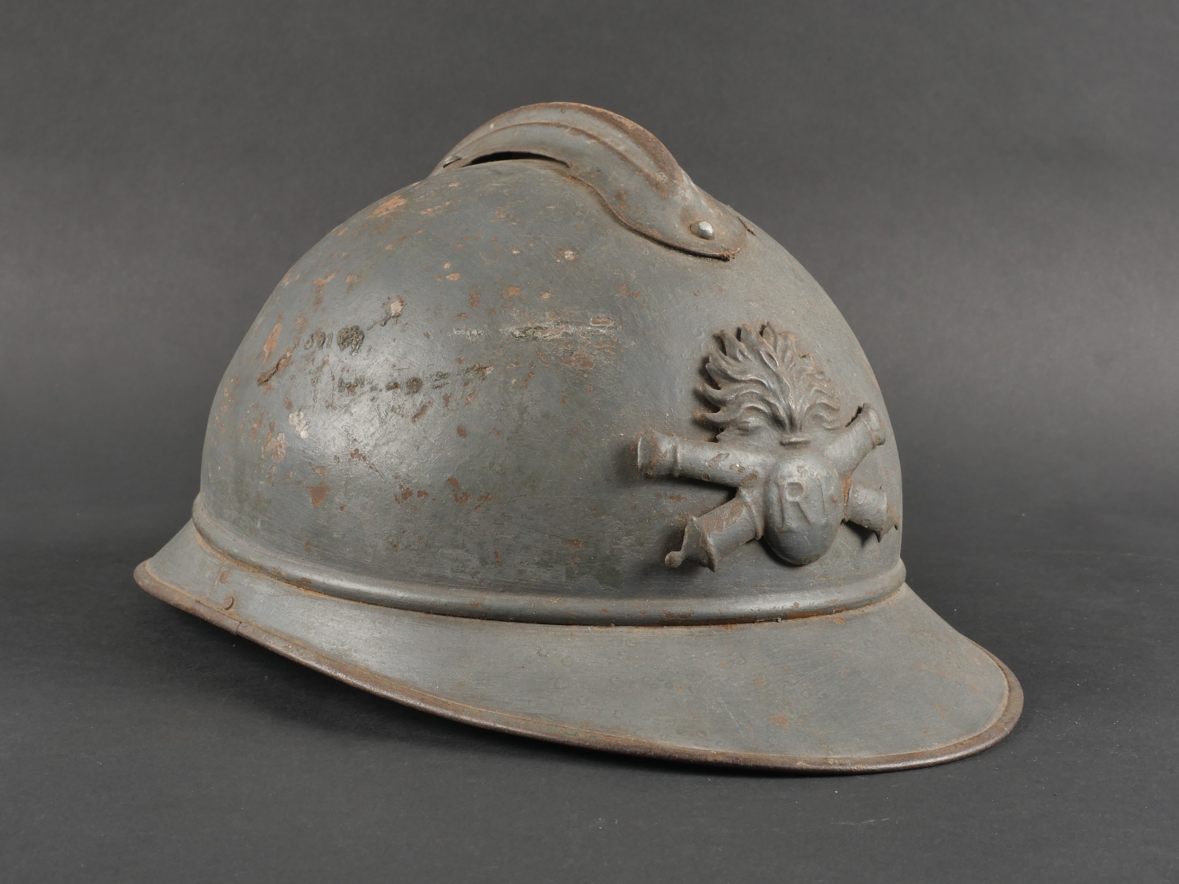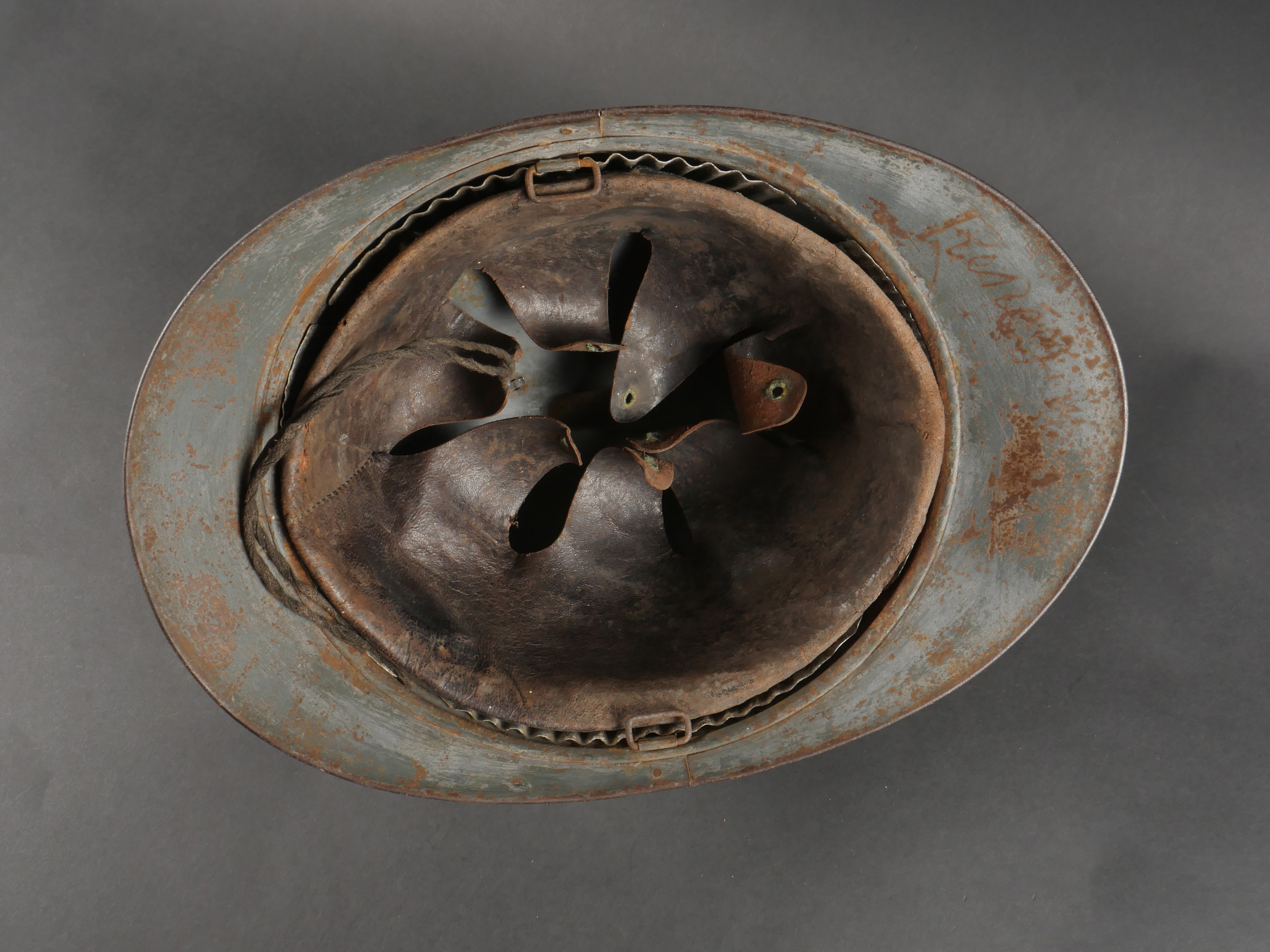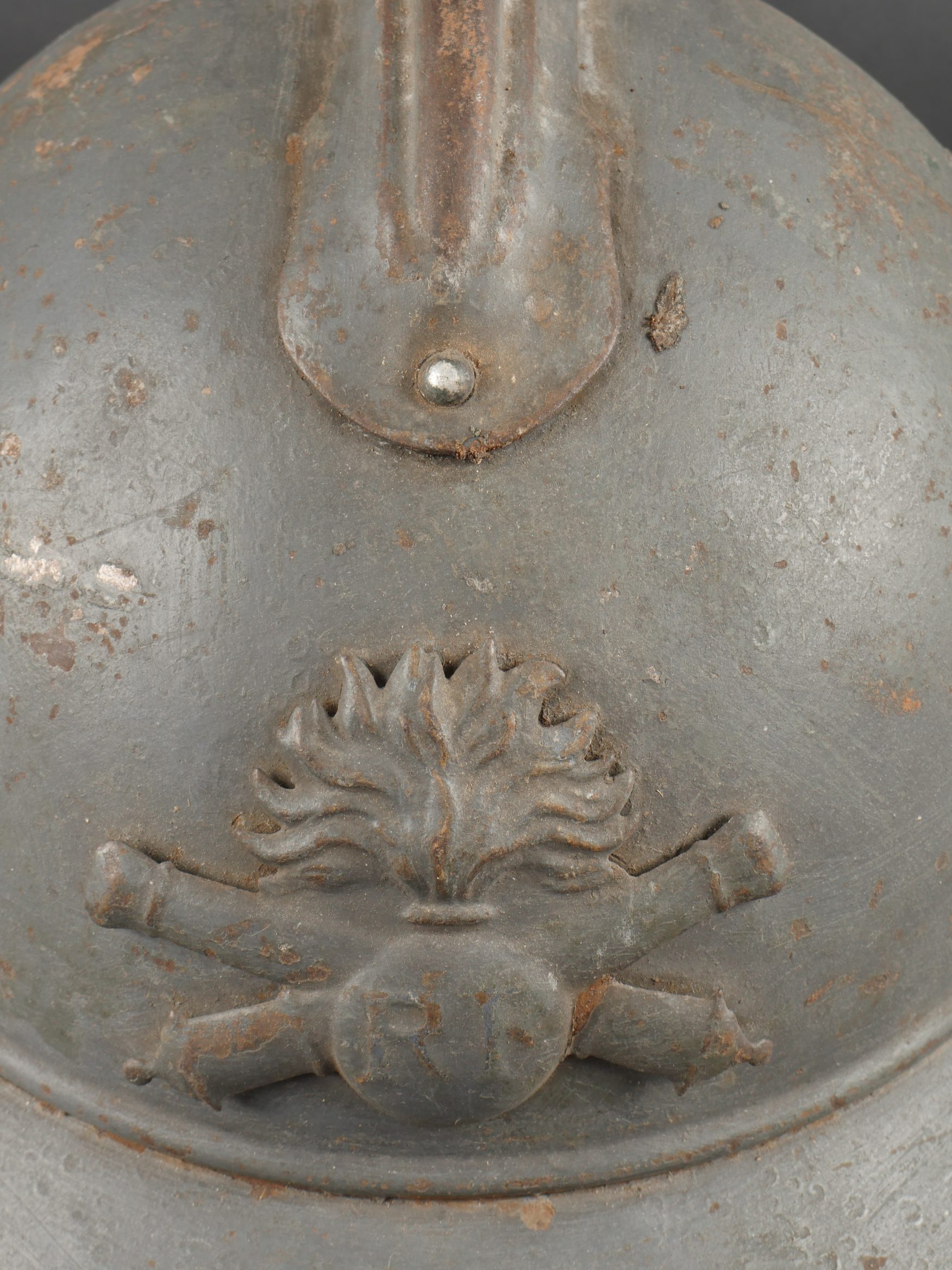 Casque Adrian M1915 de l’artillerie. Casque en peinture bleu horizon, usure et légère oxydation. Attribut de l’artillerie. Coiffe 1er type avec bandeau gris de fer bleuté, 4 gaufrettes aluminium. Nom gravé sous la visière, prénom René, nom à déchiffrer. Jugulaire absente. Patine. Adrian Helmet M1915, Artillery Horizon-blue paint with light wear and oxidation. Artillery insignia. First-type liner with iron-blue-grey cloth band and four aluminum adjustment washers. Name engraved under the visor, first name René, surname undeciphered. Chinstrap missing. Patina.
