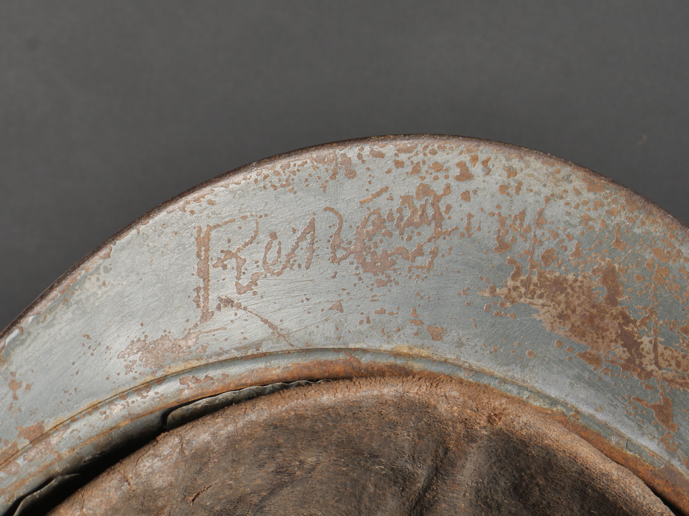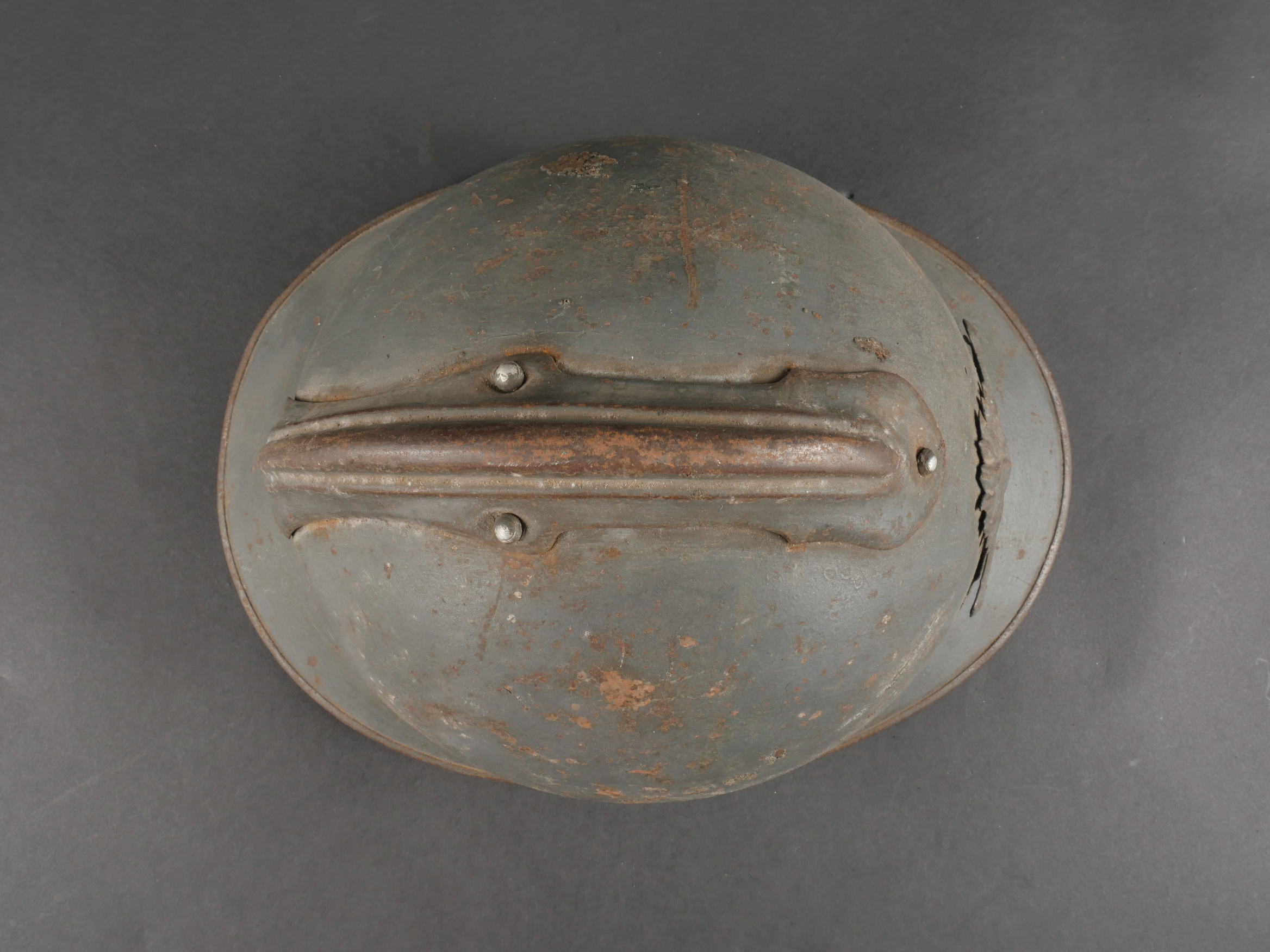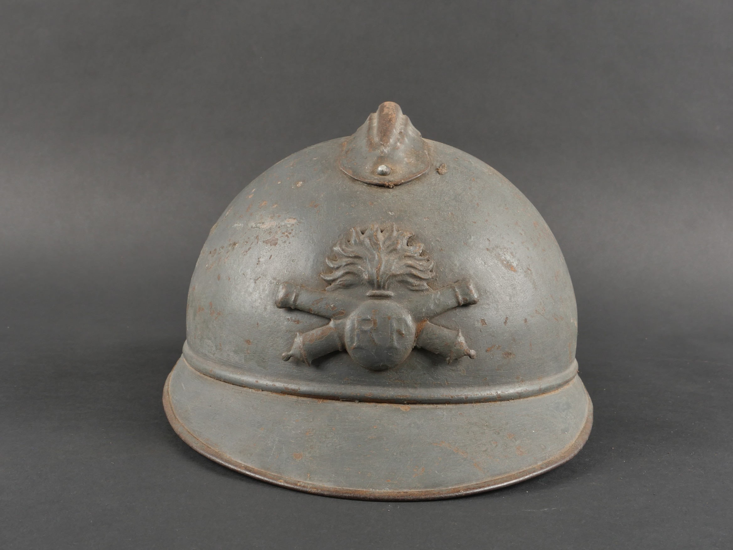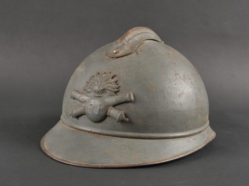 Casque Adrian M1915 de l’artillerie. Casque en peinture bleu horizon, usure et légère oxydation. Attribut de l’artillerie. Coiffe 1er type avec bandeau gris de fer bleuté, 4 gaufrettes aluminium. Nom gravé sous la visière, prénom René, nom à déchiffrer. Jugulaire absente. Patine. Adrian Helmet M1915, Artillery Horizon-blue paint with light wear and oxidation. Artillery insignia. First-type liner with iron-blue-grey cloth band and four aluminum adjustment washers. Name engraved under the visor, first name René, surname undeciphered. Chinstrap missing. Patina.