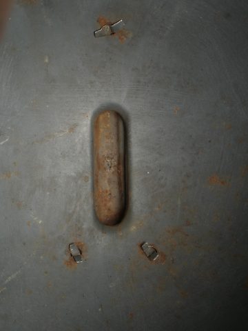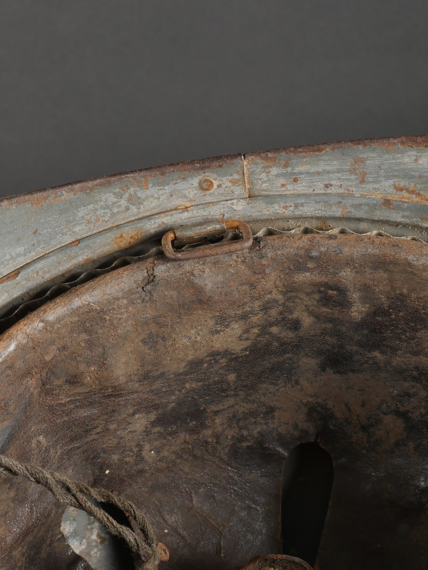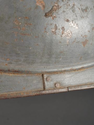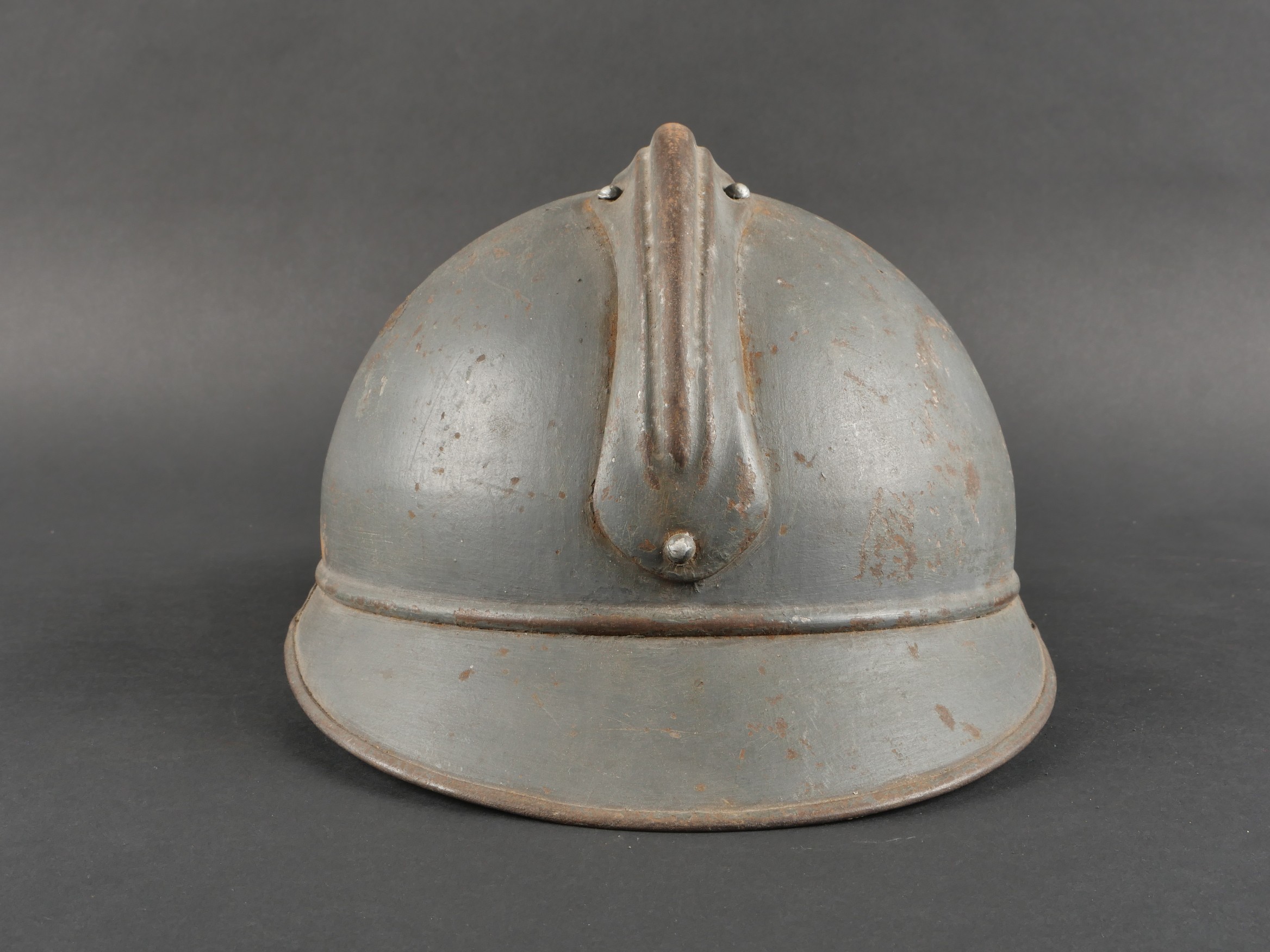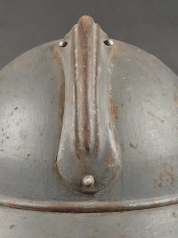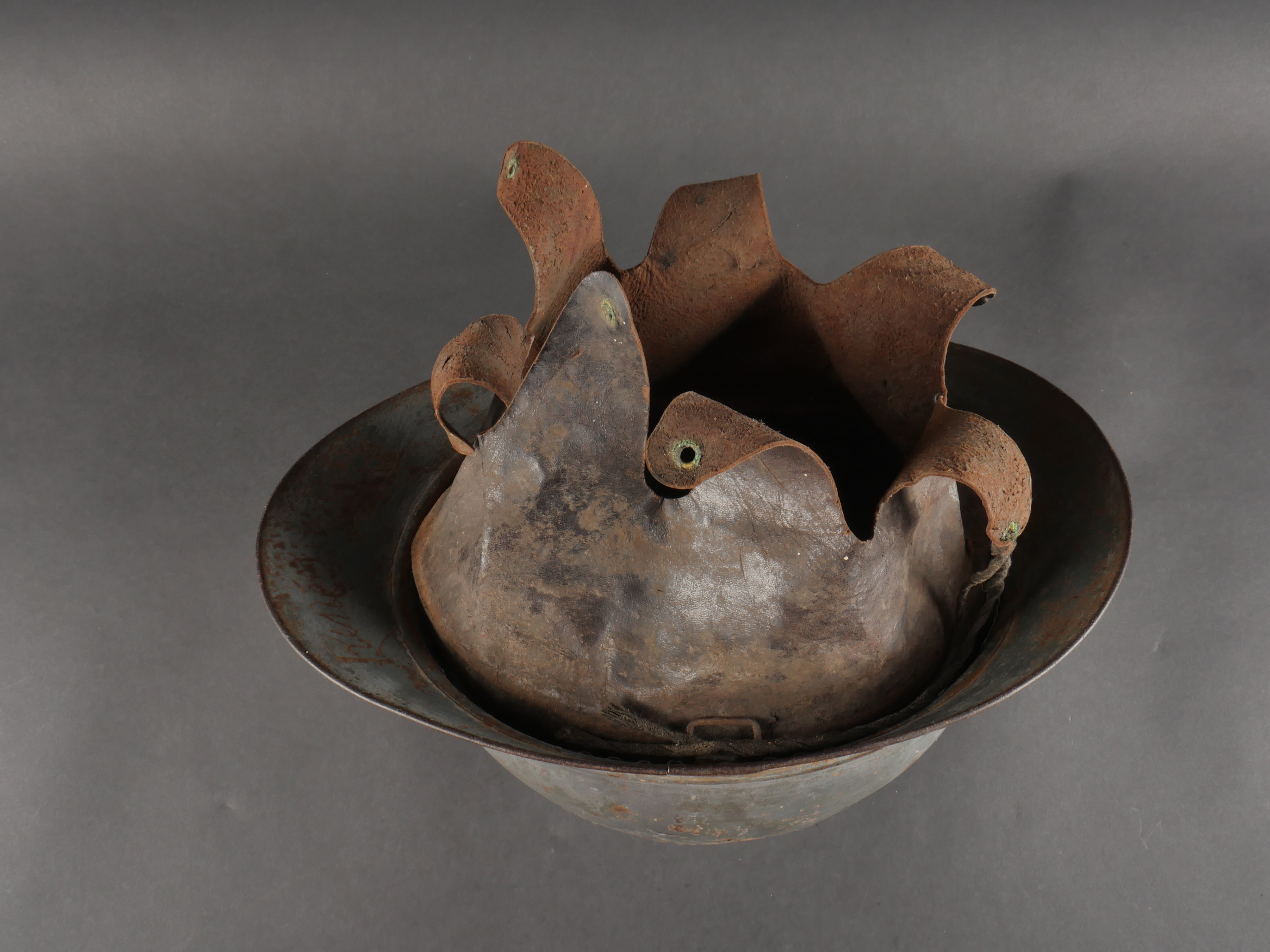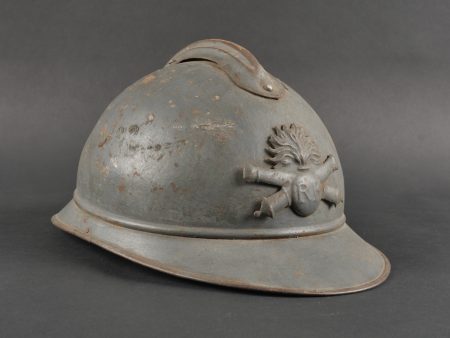 Casque Adrian M1915 de l’artillerie. Casque en peinture bleu horizon, usure et légère oxydation. Attribut de l’artillerie. Coiffe 1er type avec bandeau gris de fer bleuté, 4 gaufrettes aluminium. Nom gravé sous la visière, prénom René, nom à déchiffrer. Jugulaire absente. Patine. Adrian Helmet M1915, Artillery Horizon-blue paint with light wear and oxidation. Artillery insignia. First-type liner with iron-blue-grey cloth band and four aluminum adjustment washers. Name engraved under the visor, first name René, surname undeciphered. Chinstrap missing. Patina.