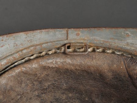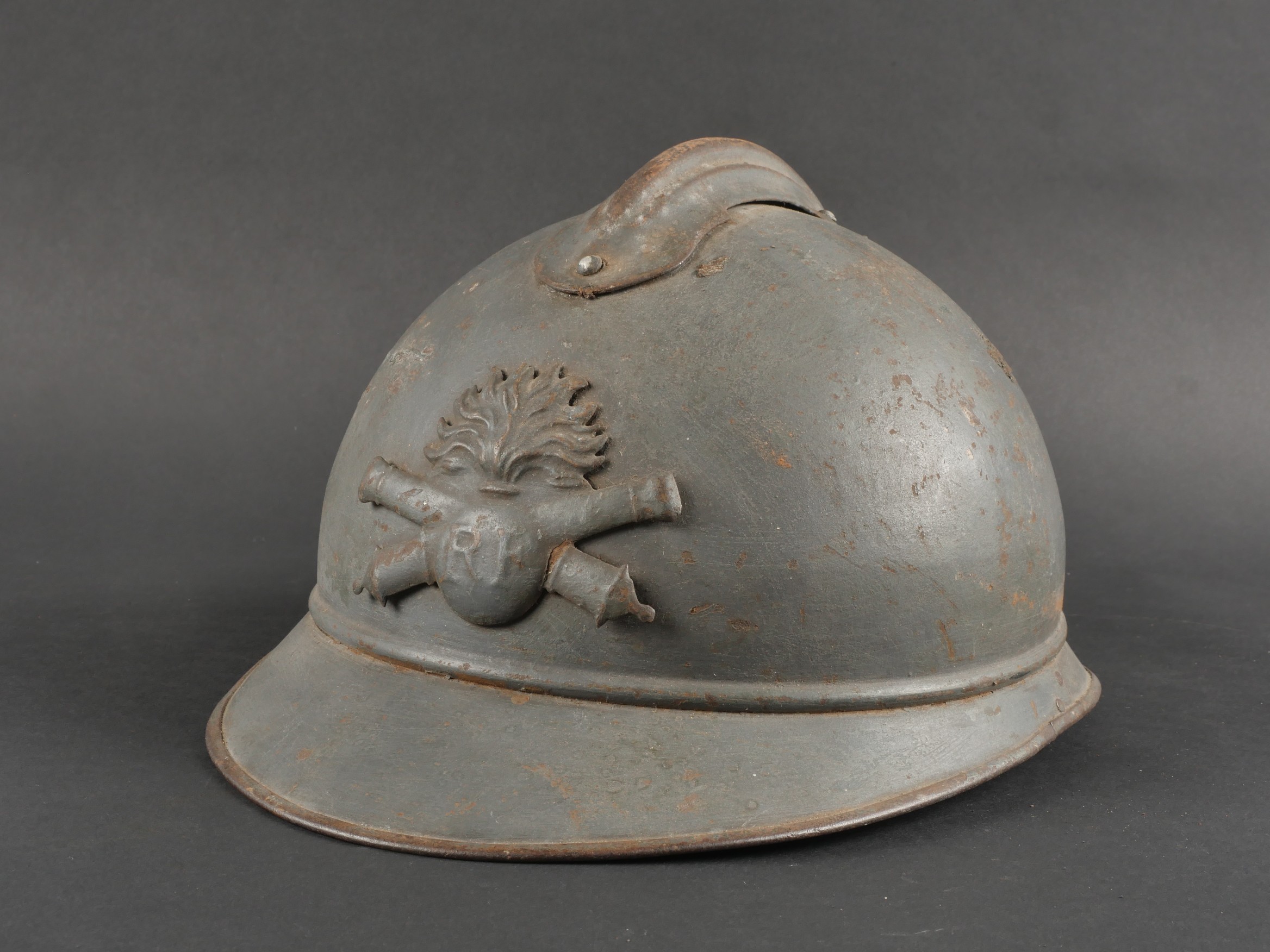 Détails de la vente >Casque Adrian M1915 de l’artillerie. Casque en peinture bleu horizon, usure et légère oxydation. Attribut de l’artillerie. Coiffe 1er type avec bandeau gris de fer bleuté, 4... en savoir plus