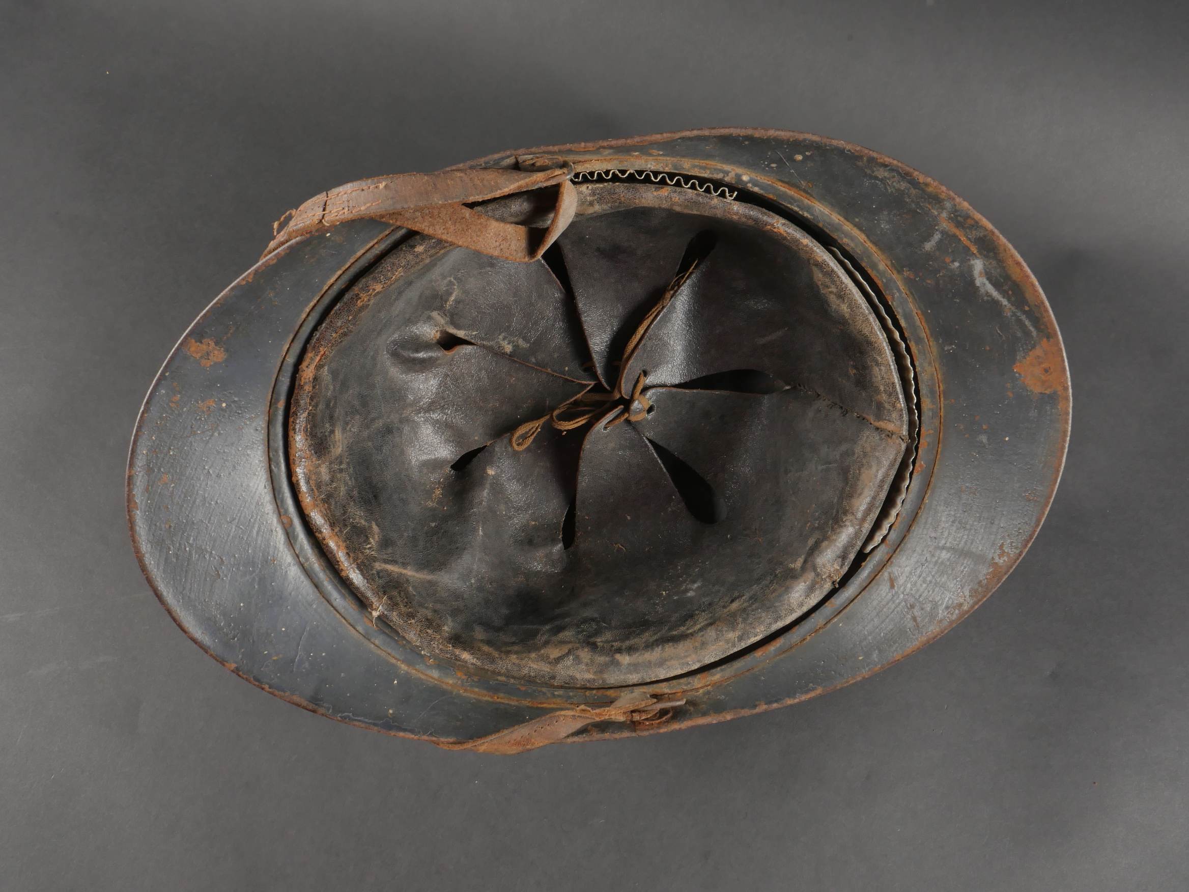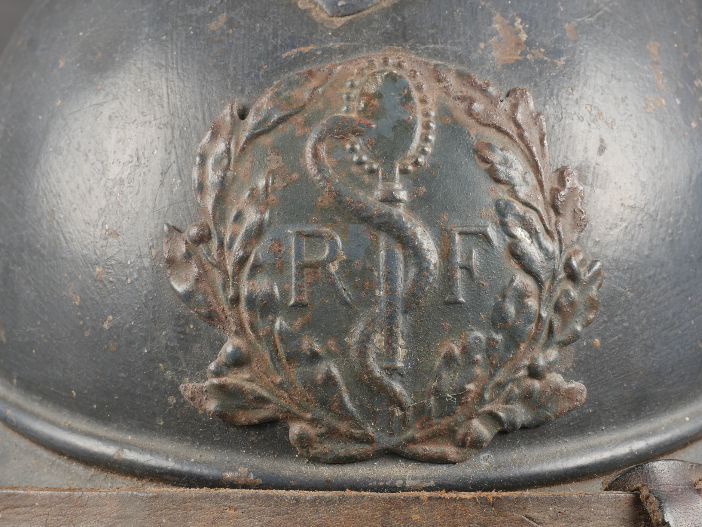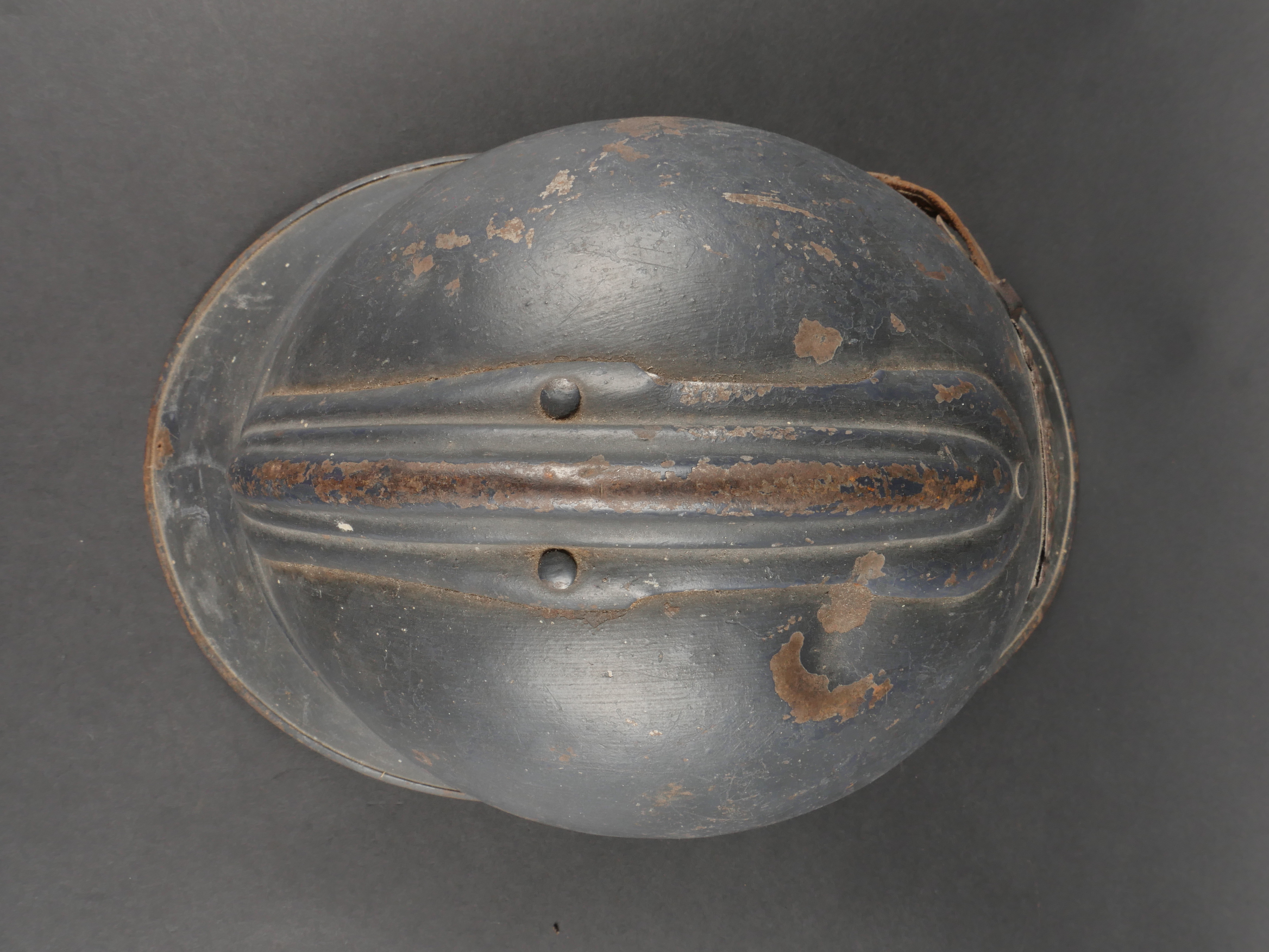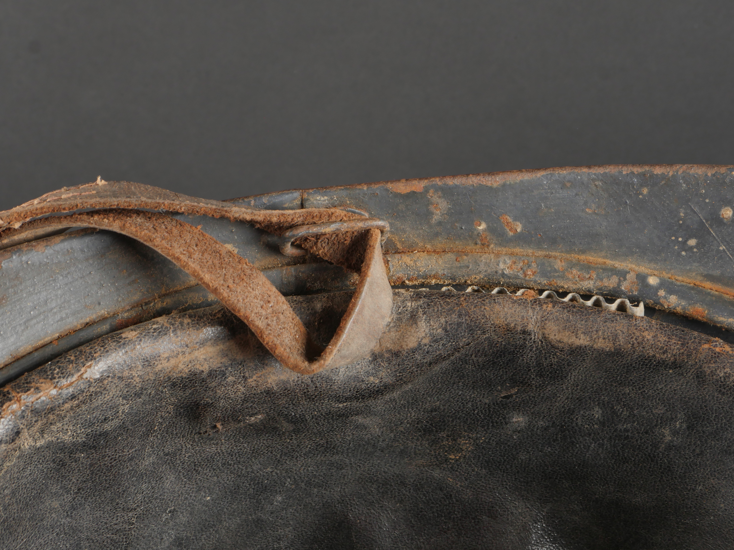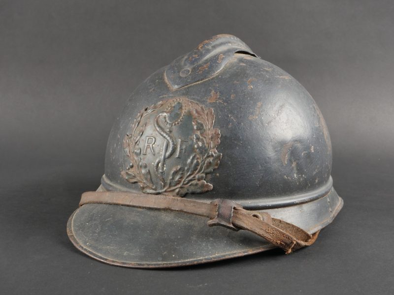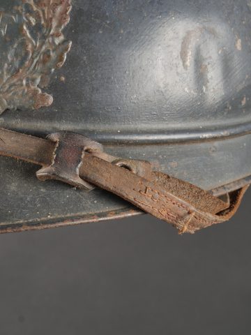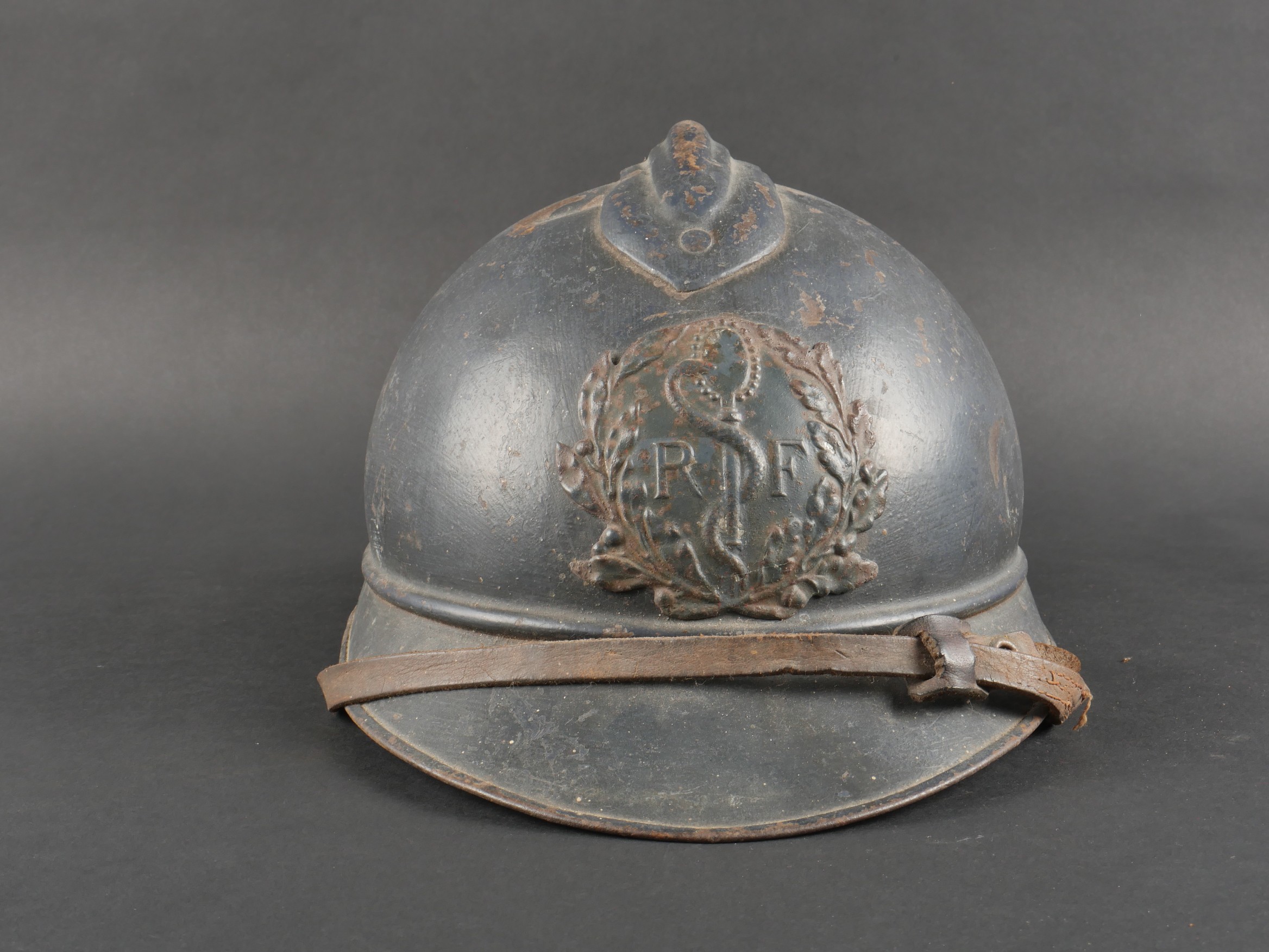 Casque Adrian M1915 du Service de Santé. Casque dans sa livrée d’origine bleu horizon. Quelques coups, légère oxydation. Bel attribut du SSA. Coiffe du 1er type en cuir noir teinté violet côté croute et bandeau matelassé de renfort. 2 gaufrettes aluminium. Jugulaire riveté modifiée terrain par ajout d’une coulisse en cuir rivetée. Belle patine pour un casque avec quelques particularités intéressantes. Adrian Helmet M1915, Medical Service Original horizon-blue finish with light dents and oxidation. Medical Service insignia. First-type liner in black leather, violet-tinted flesh side, reinforced quilted band, two aluminum washers. Field-modified chinstrap with added leather slider riveted in place. Attractive patina, featuring several interesting details.
