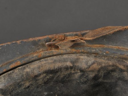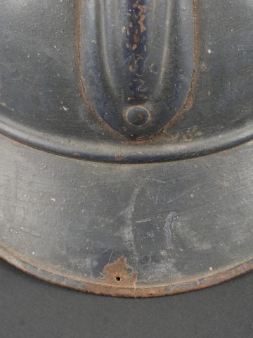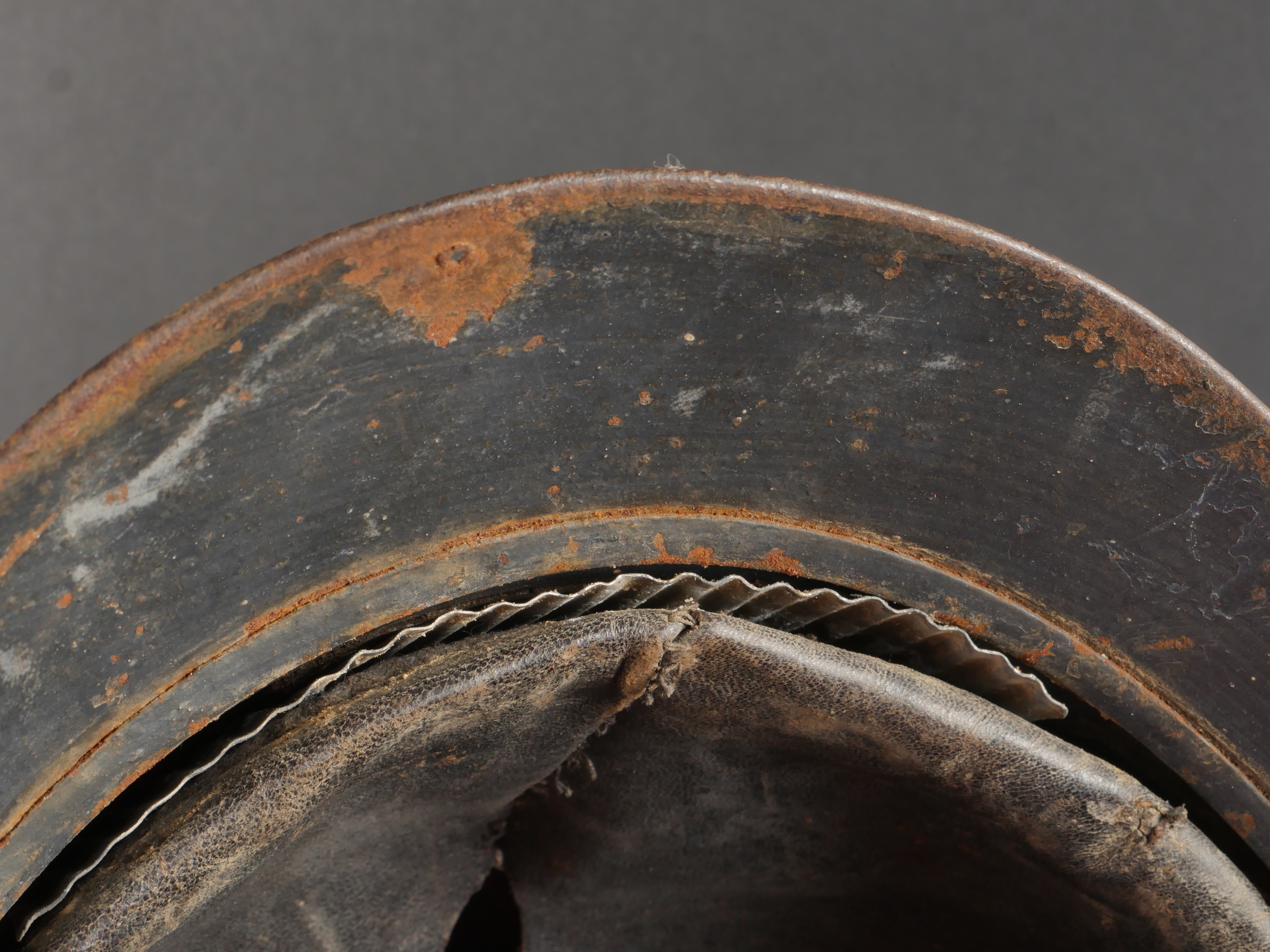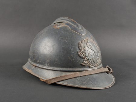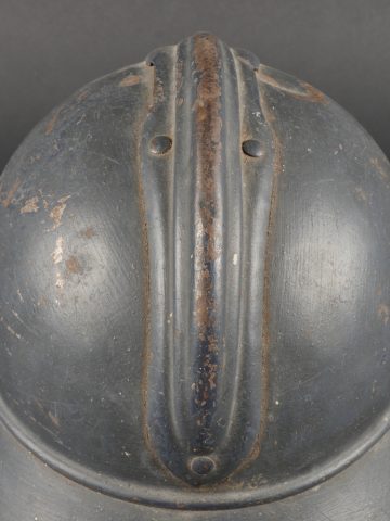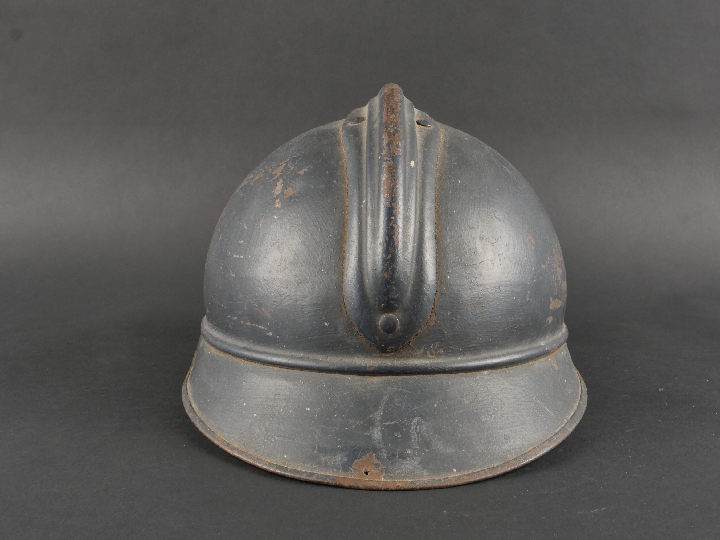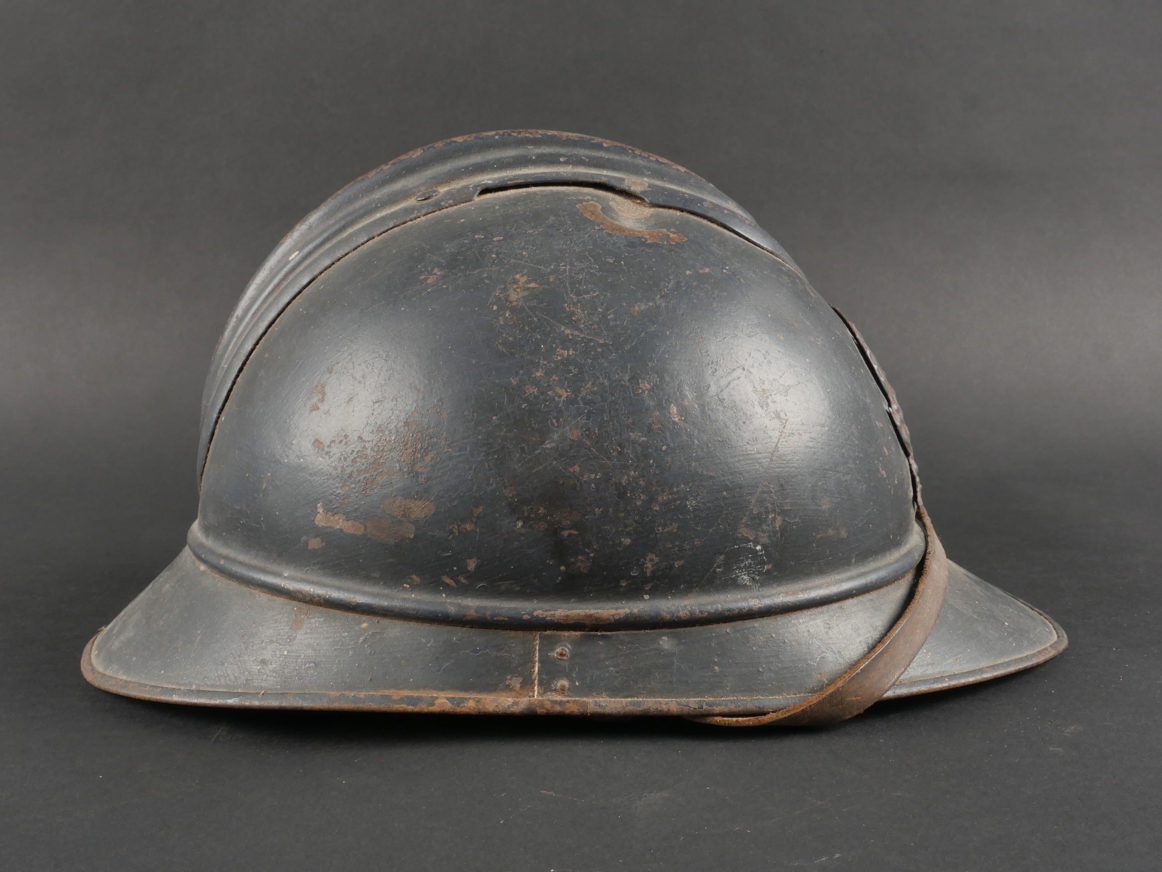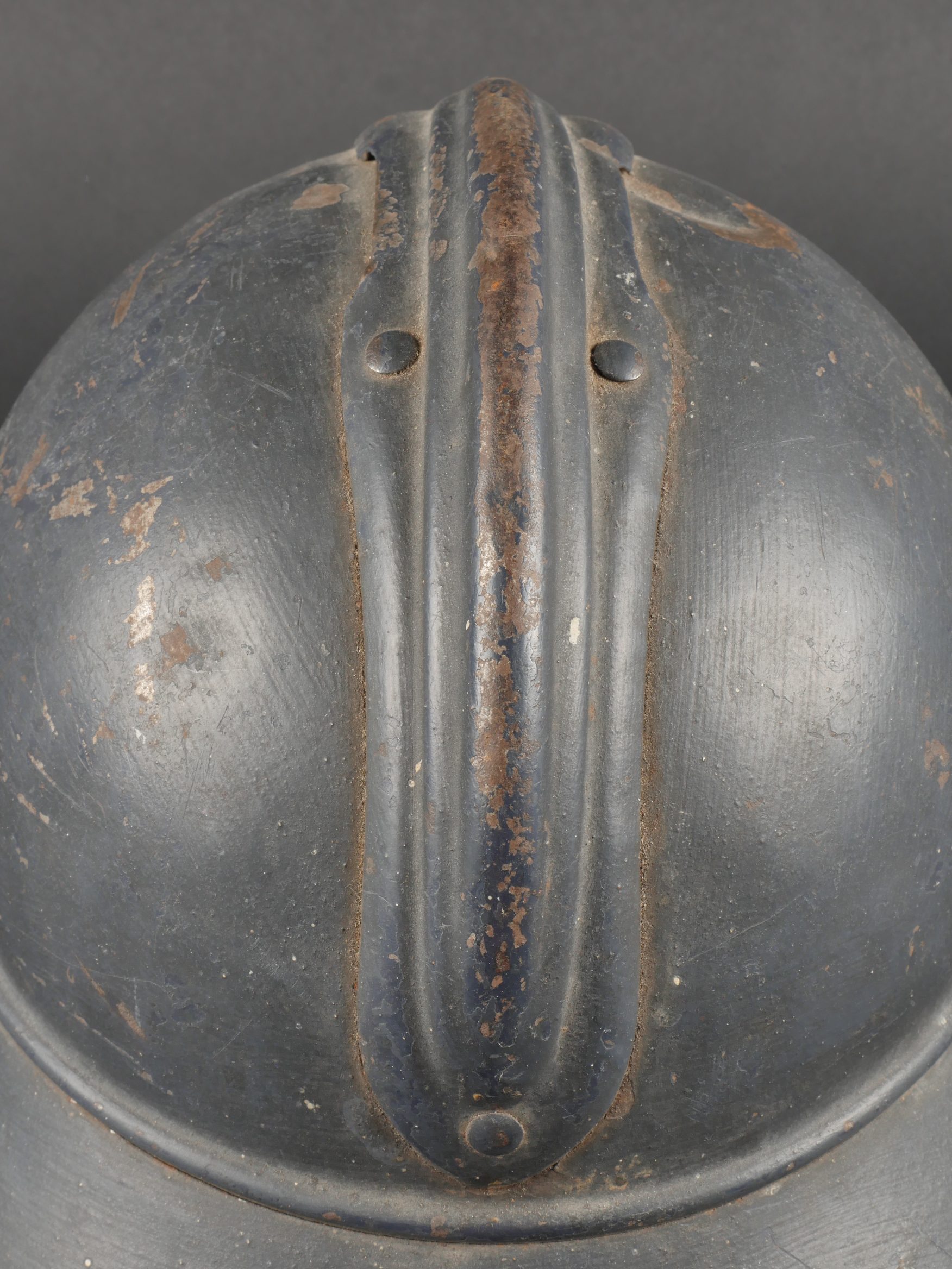 Casque Adrian M1915 du Service de Santé. Casque dans sa livrée d’origine bleu horizon. Quelques coups, légère oxydation. Bel attribut du SSA. Coiffe du 1er type en cuir noir teinté violet côté croute et bandeau matelassé de renfort. 2 gaufrettes aluminium. Jugulaire riveté modifiée terrain par ajout d’une coulisse en cuir rivetée. Belle patine pour un casque avec quelques particularités intéressantes. Adrian Helmet M1915, Medical Service Original horizon-blue finish with light dents and oxidation. Medical Service insignia. First-type liner in black leather, violet-tinted flesh side, reinforced quilted band, two aluminum washers. Field-modified chinstrap with added leather slider riveted in place. Attractive patina, featuring several interesting details.