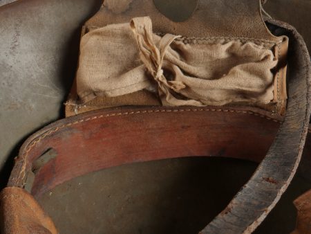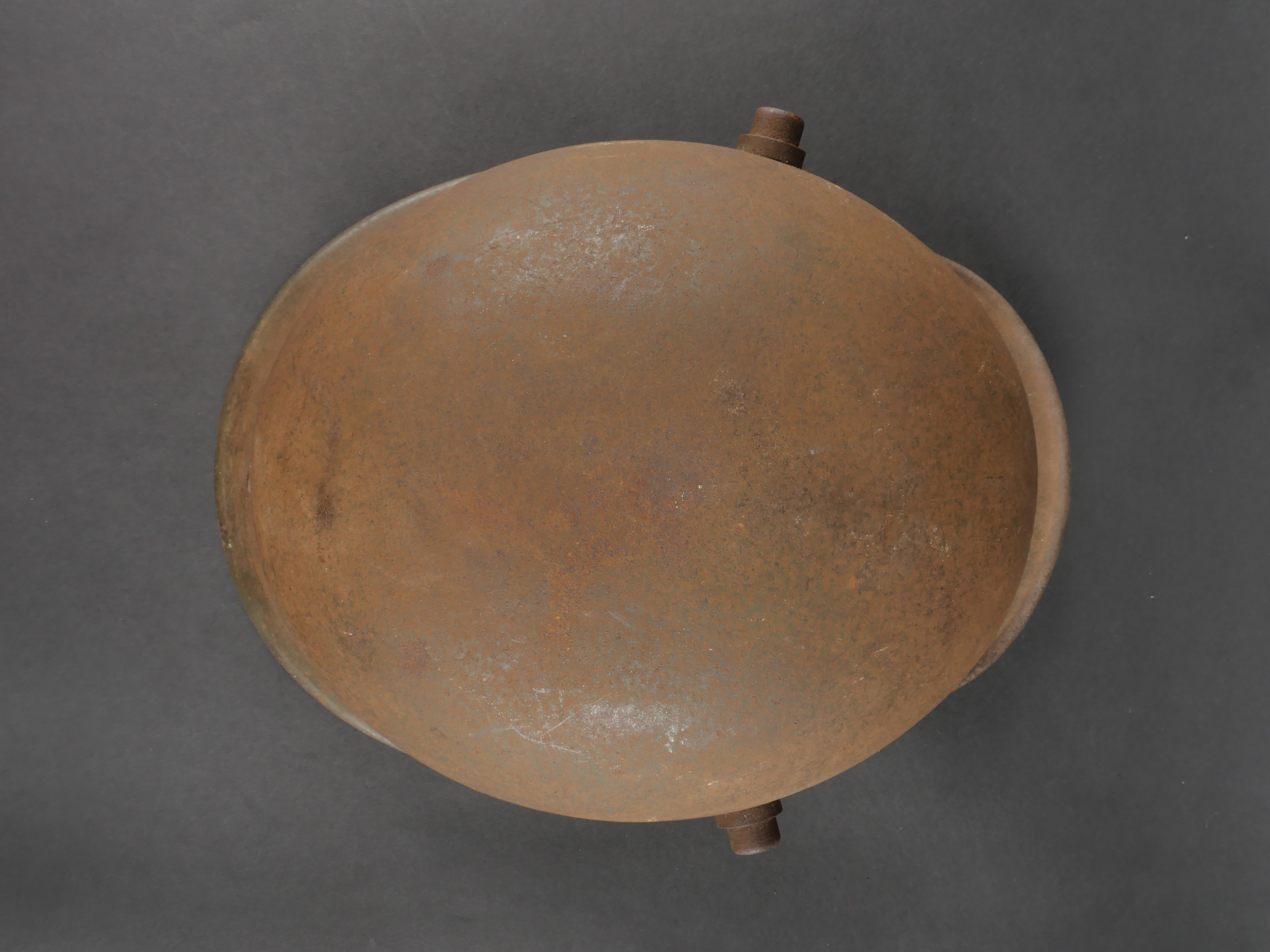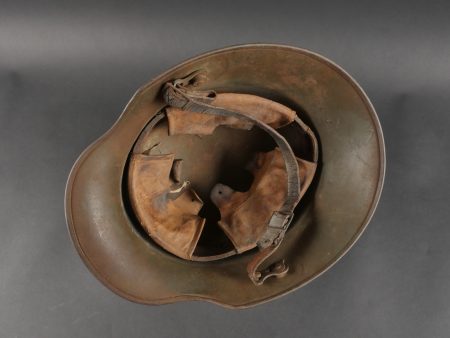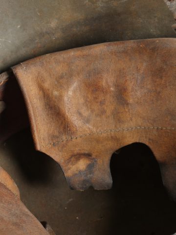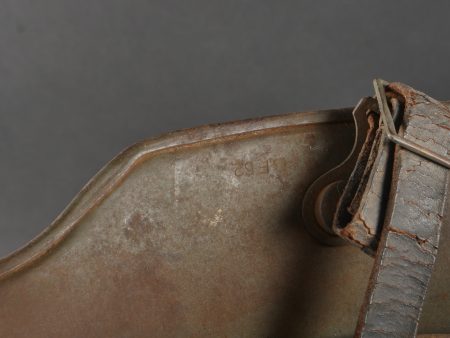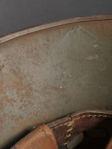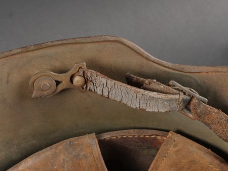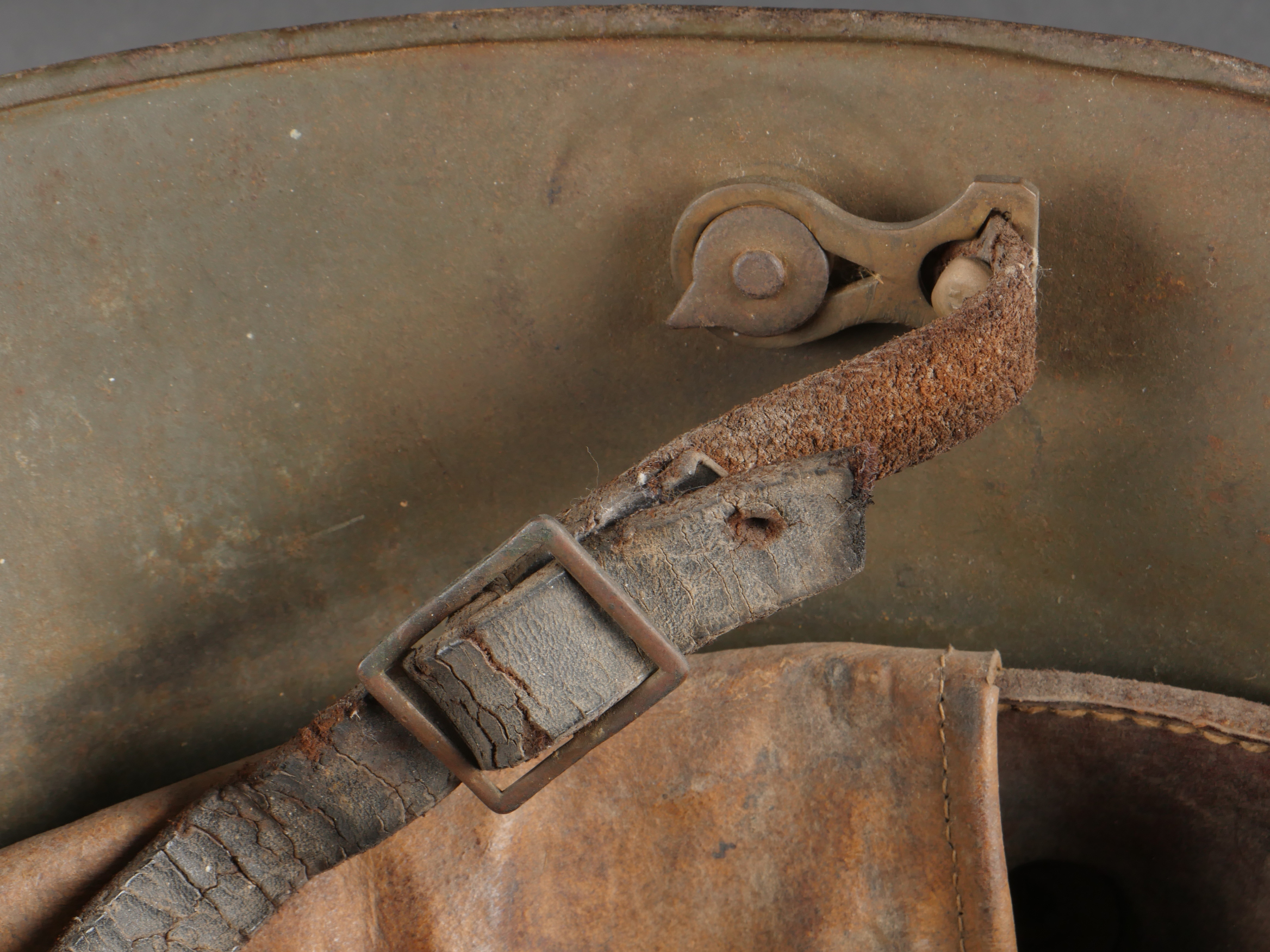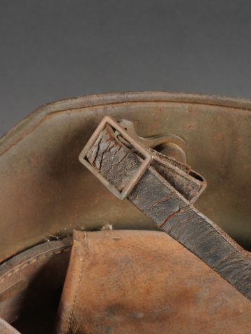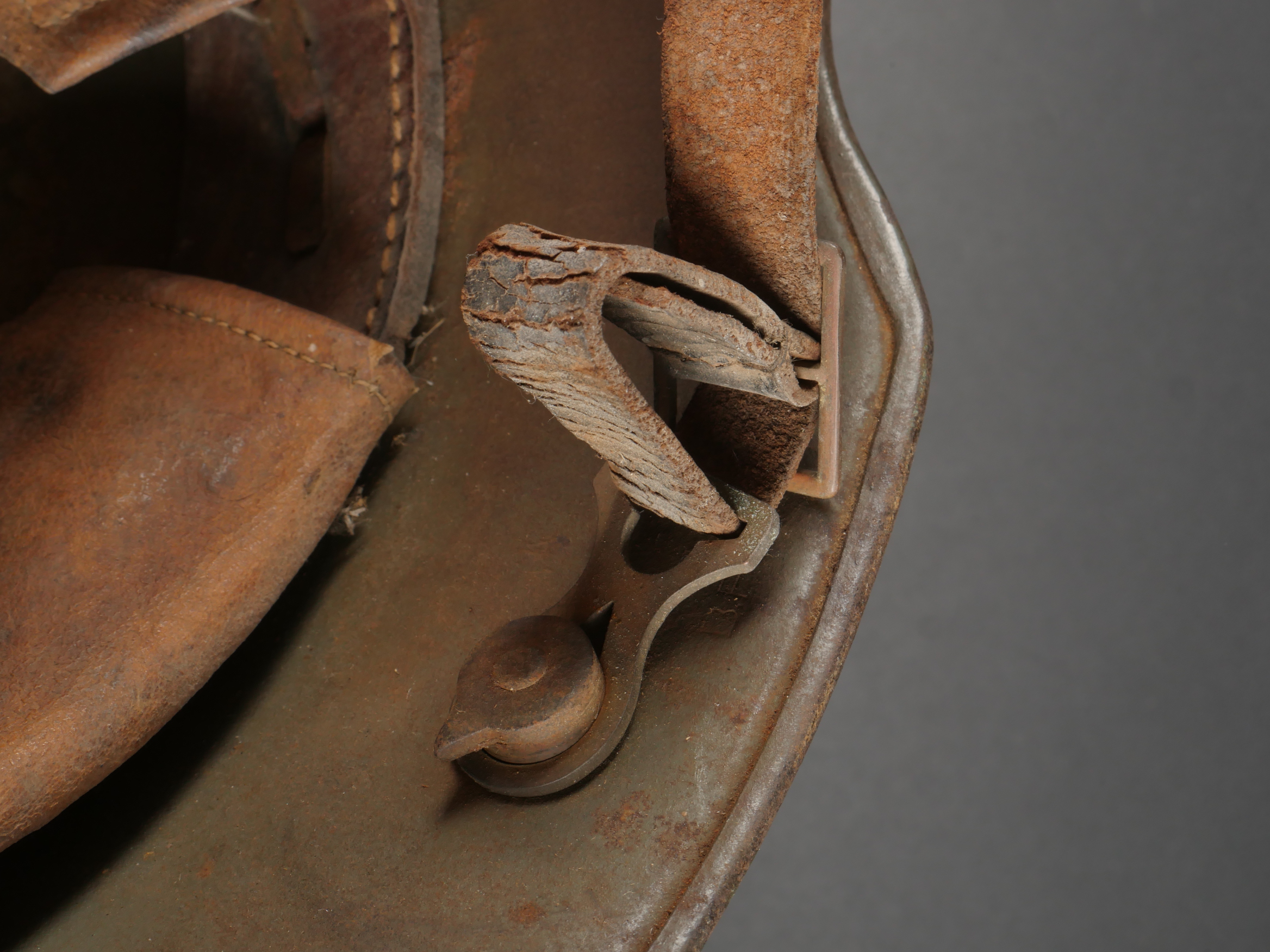 Casque allemand Stahlhelm M1916. Casque allemand M16 en acier peint feldgrau, peinture fine, rouille superficielle. Fabricant B.F. pour F.C. Bellinger à Fulda. Taille 62. Bandeau de coiffe en cuir, rivets fixés d’origine. 3 panneaux de cuir fauve, coussinets absents, une des extrémités de dents de loup manquante. Jugulaire modèle 1915 à garnitures fer, oxydation, cuir sec et cassé. Usure d’usage, patine. German Helmet Stahlhelm M1916 M16 steel helmet painted field-grey, thin paint layer with superficial rust. Manufacturer B.F. for F.C. Bellinger, Fulda. Size 62. Original leather liner band, three light-brown leather pads missing cushions, one liner tab with torn “wolf tooth” end. Model 1915 chinstrap with iron fittings, oxidized, leather dry and cracked. Signs of wear and patina.