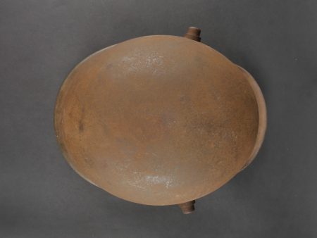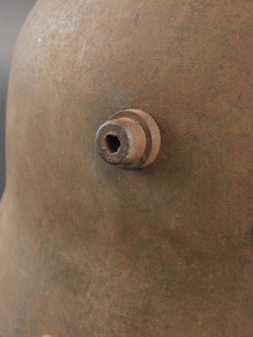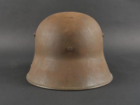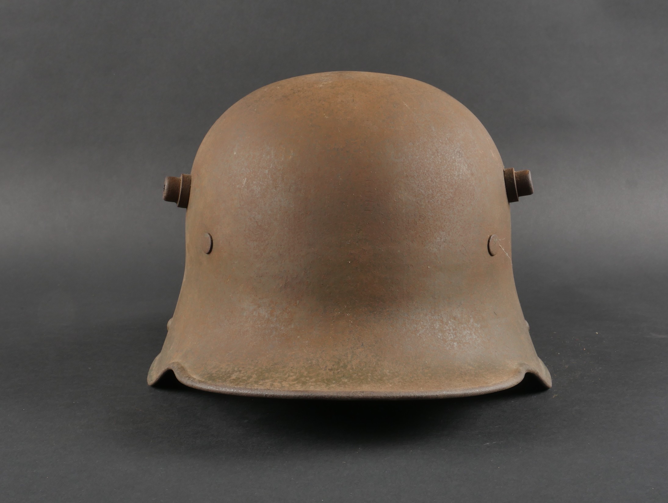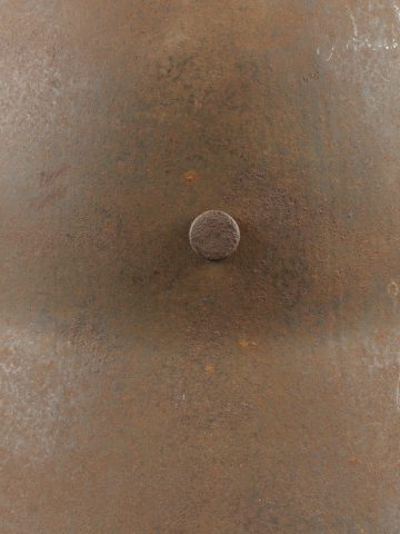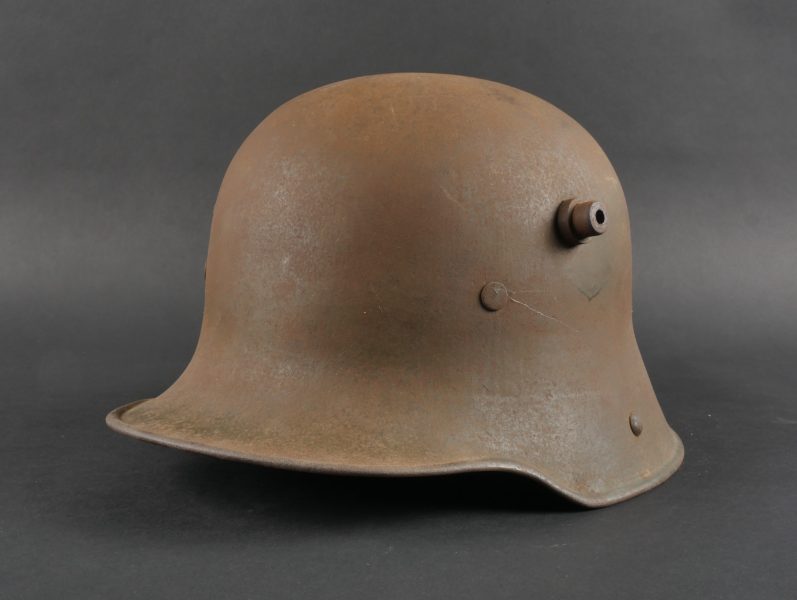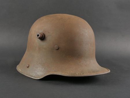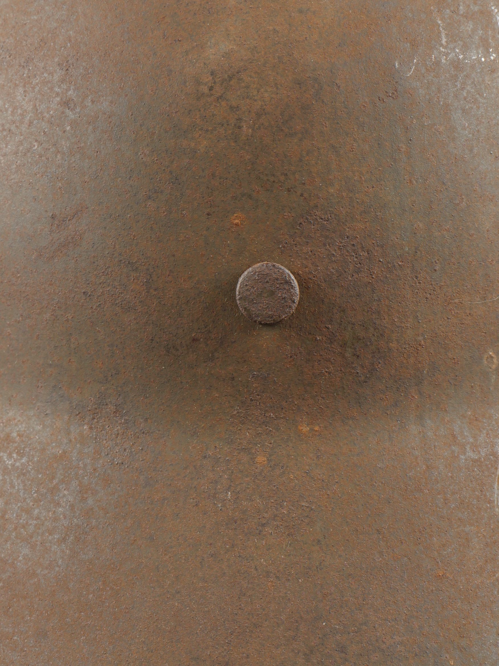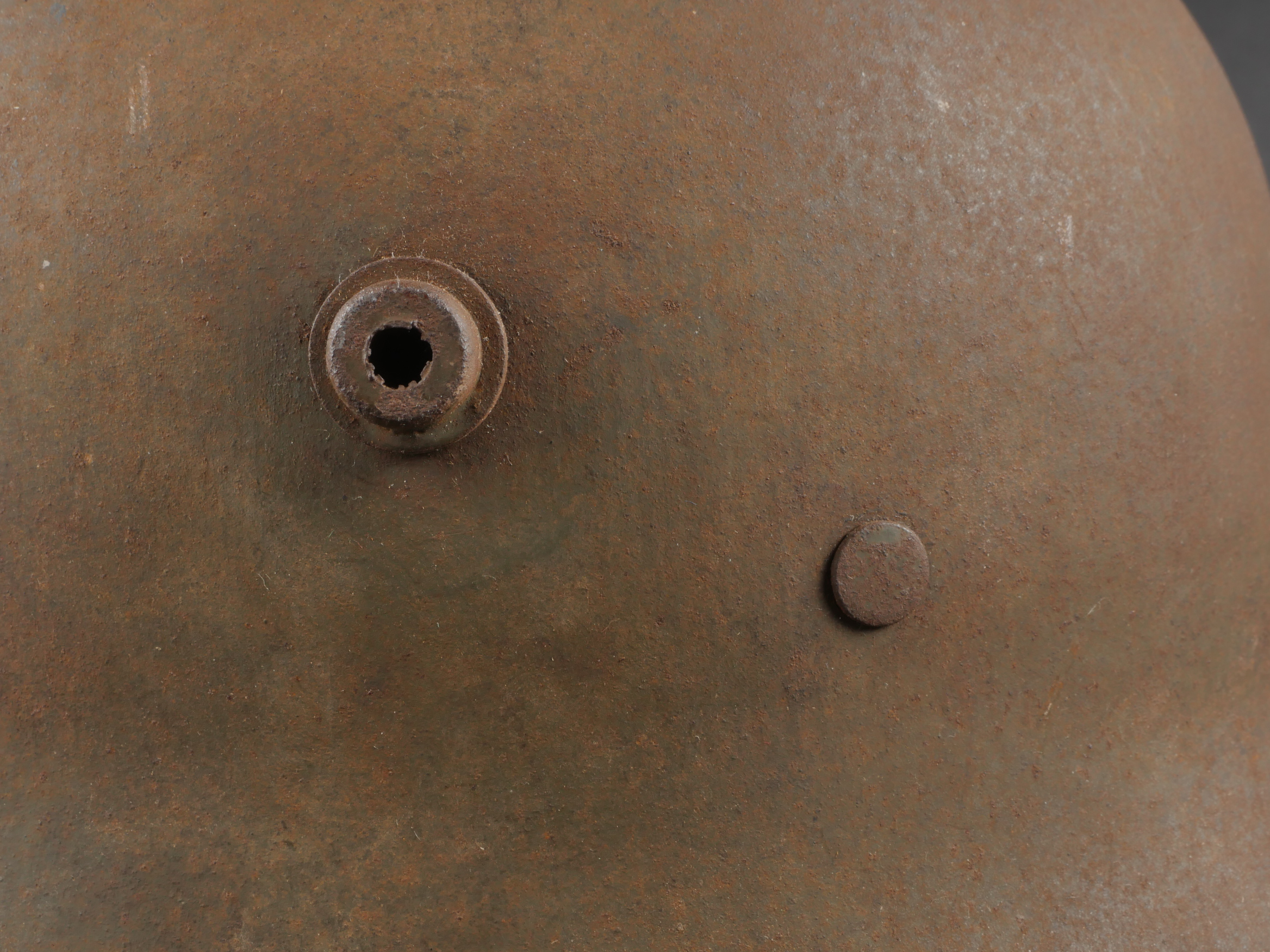 Casque allemand Stahlhelm M1916. Casque allemand M16 en acier peint feldgrau, peinture fine, rouille superficielle. Fabricant B.F. pour F.C. Bellinger à Fulda. Taille 62. Bandeau de coiffe en cuir, rivets fixés d’origine. 3 panneaux de cuir fauve, coussinets absents, une des extrémités de dents de loup manquante. Jugulaire modèle 1915 à garnitures fer, oxydation, cuir sec et cassé. Usure d’usage, patine. German Helmet Stahlhelm M1916 M16 steel helmet painted field-grey, thin paint layer with superficial rust. Manufacturer B.F. for F.C. Bellinger, Fulda. Size 62. Original leather liner band, three light-brown leather pads missing cushions, one liner tab with torn “wolf tooth” end. Model 1915 chinstrap with iron fittings, oxidized, leather dry and cracked. Signs of wear and patina.