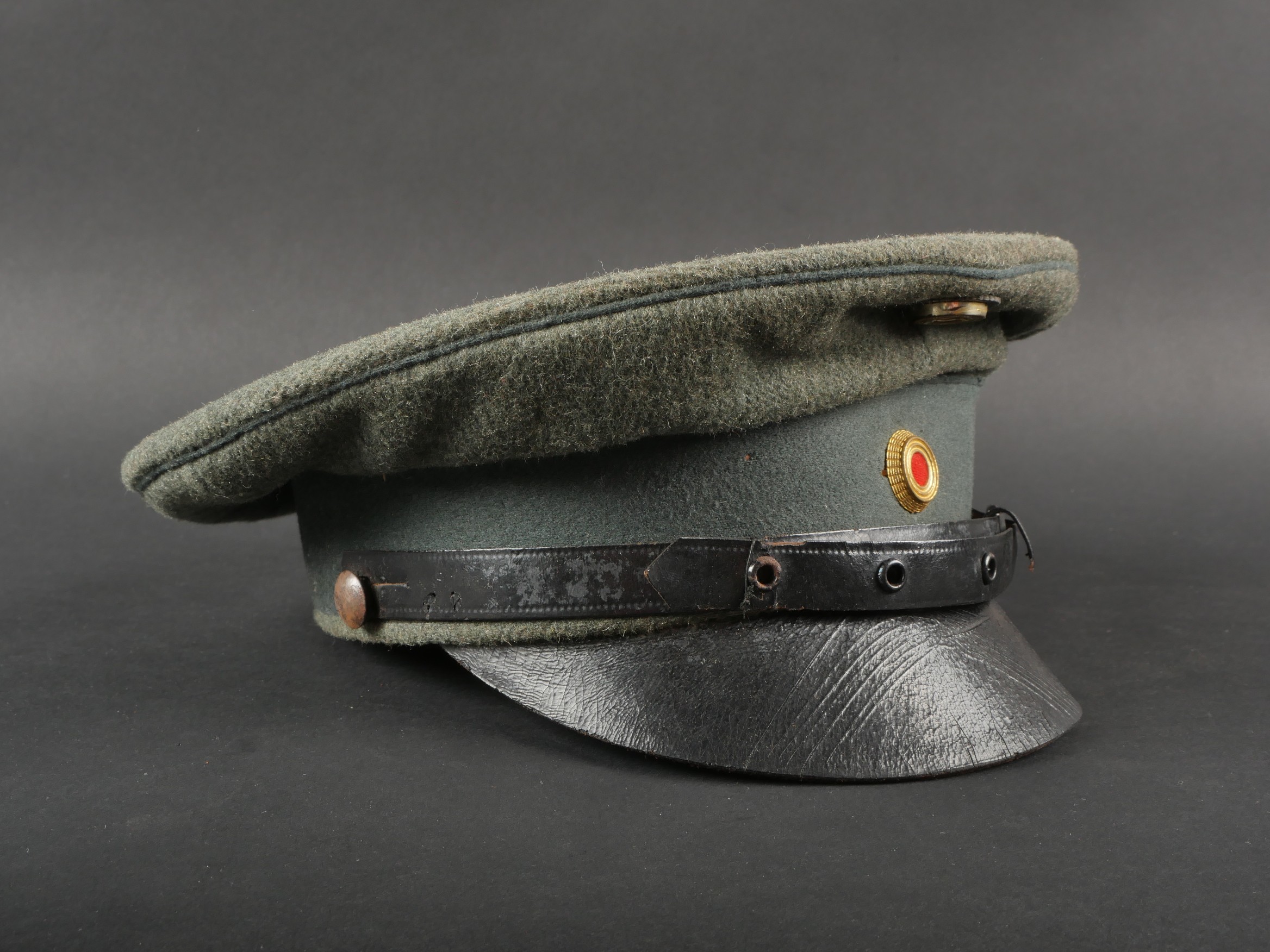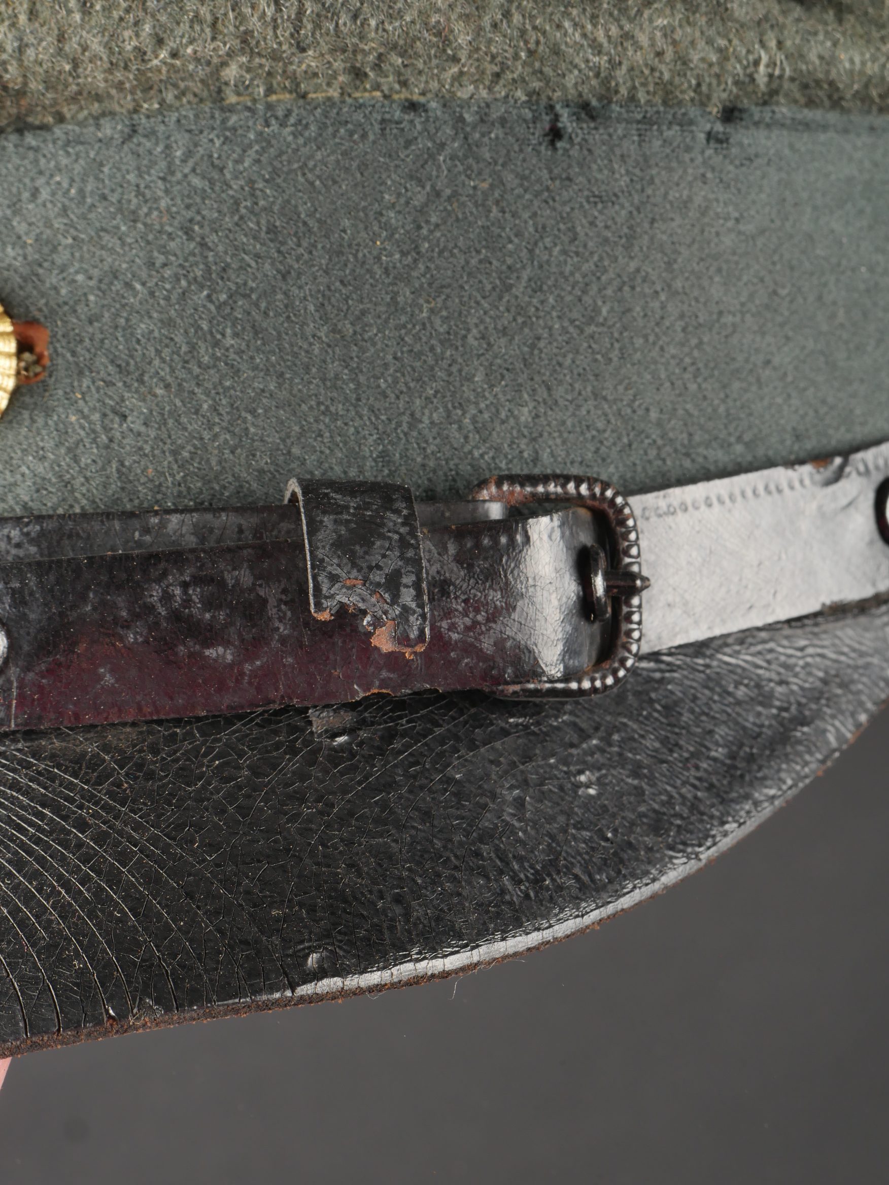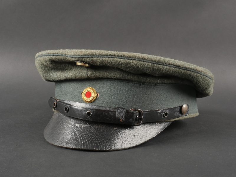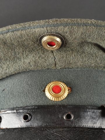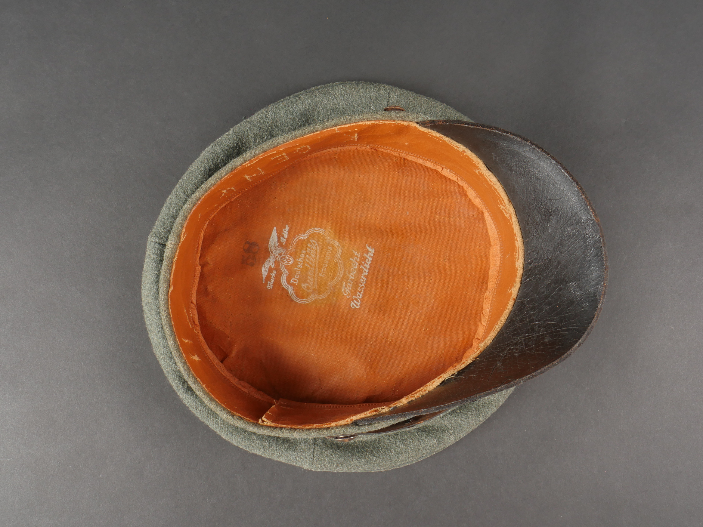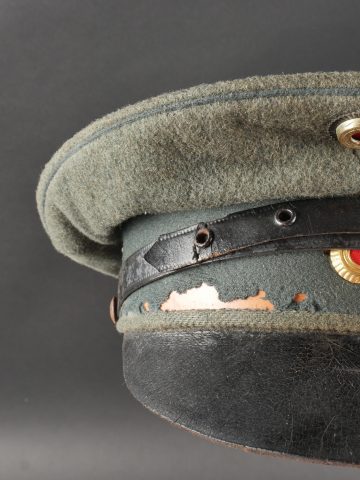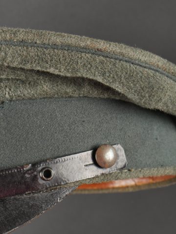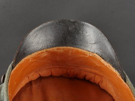 Modèle toutes armes en drap feldgrau avec passepoil et bandeau vert. Quelques trous de mites épars, plus important sur le bandeau mais peu visible car sous la jugulaire. Jugulaire vernie noire à boucle à ardillons et trous renforcés d’oeillets, fixée par 2 petits boutons plats en métal blanc. Le passant coulissant est cassé. Cocardes type officier aux couleurs de l’Allemagne et du Royaume de Bade. Bandeau de sudation en basane fauve, doublure en soir marron orangé avec logo du fabricant Adler. Usure d’usage, patine. Universal Field-Grey Visor Cap with Green Band Field-grey cloth cap with green band and piping. Scattered moth holes, more pronounced on the band but largely concealed beneath the chinstrap. Black varnished leather chinstrap with pronged buckle and eyelets, fastened by two small white-metal buttons. Slider broken. Officer-type cockades in the colors of Germany and the Grand Duchy of Baden. Brown leather sweatband, orange-brown silk lining with Adler maker logo. Signs of wear and patina.
