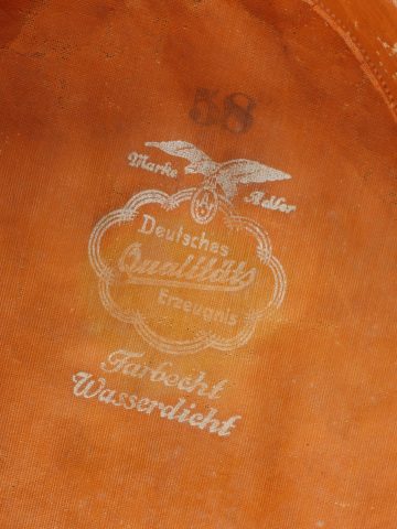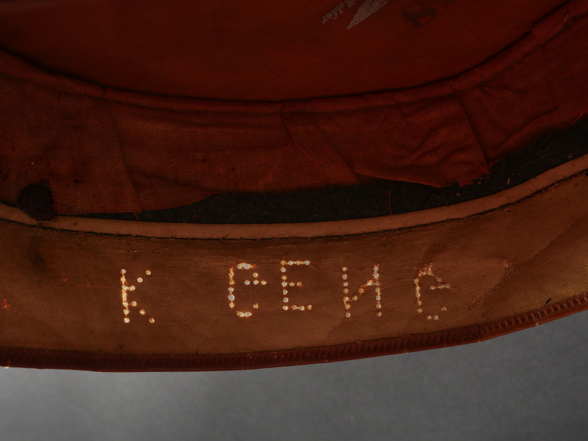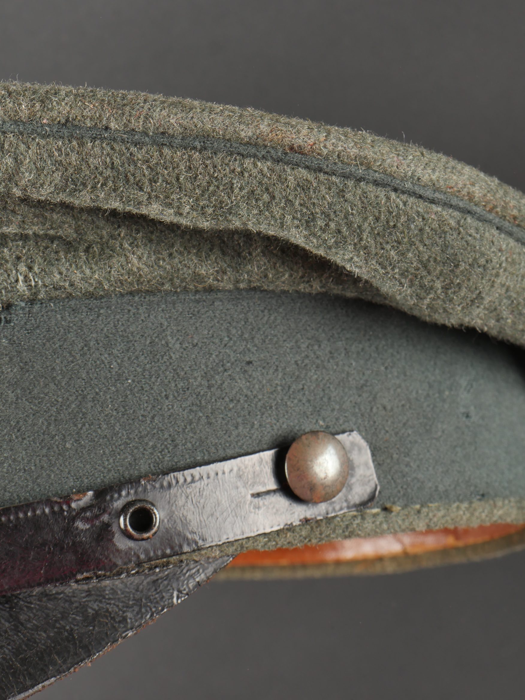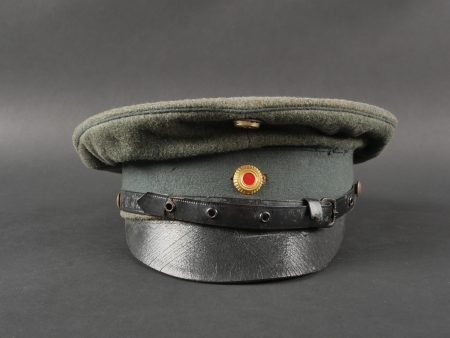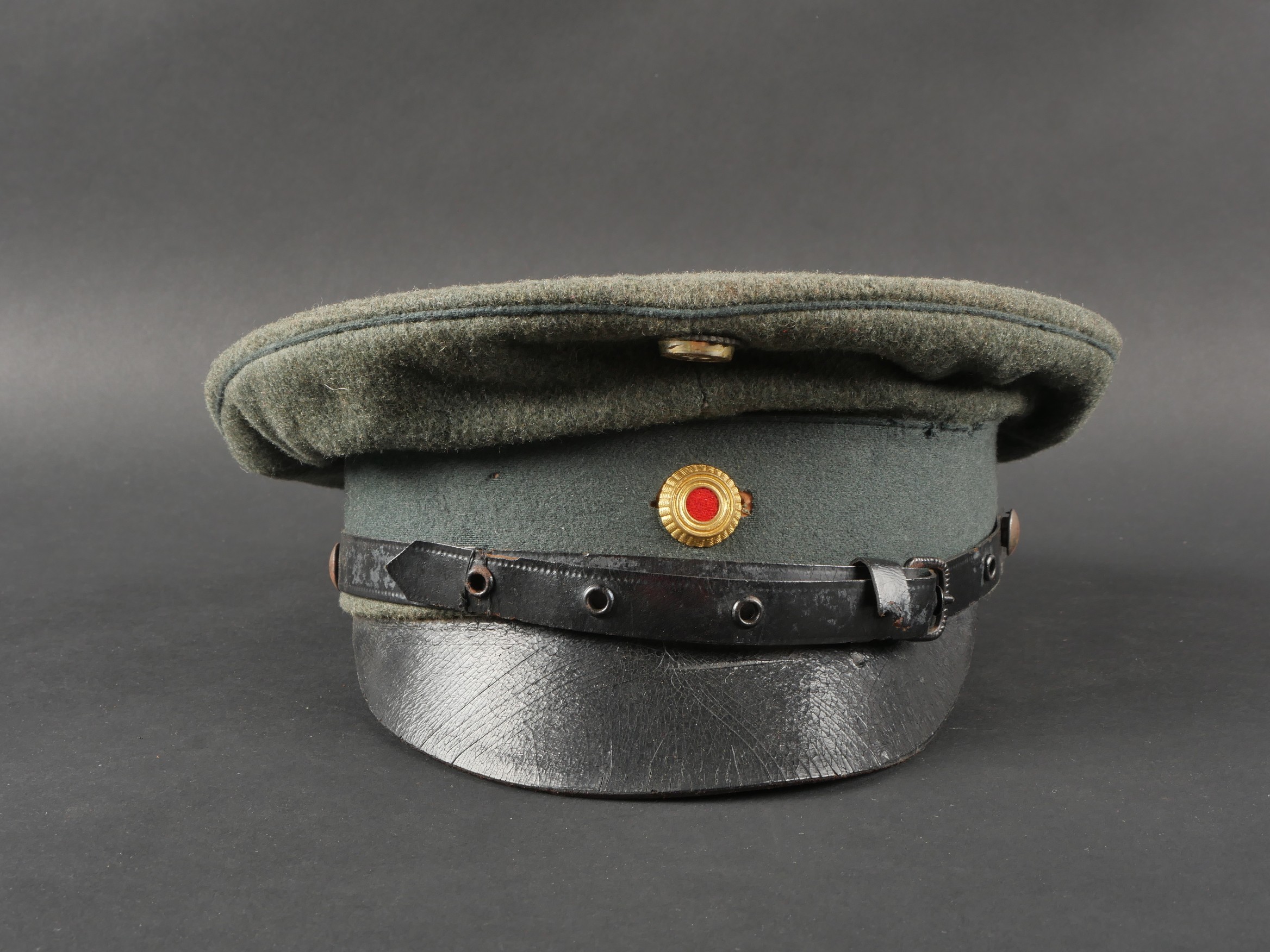 Modèle toutes armes en drap feldgrau avec passepoil et bandeau vert. Quelques trous de mites épars, plus important sur le bandeau mais peu visible car sous la jugulaire. Jugulaire vernie noire à boucle à ardillons et trous renforcés d’oeillets, fixée par 2 petits boutons plats en métal blanc. Le passant coulissant est cassé. Cocardes type officier aux couleurs de l’Allemagne et du Royaume de Bade. Bandeau de sudation en basane fauve, doublure en soir marron orangé avec logo du fabricant Adler. Usure d’usage, patine. Universal Field-Grey Visor Cap with Green Band Field-grey cloth cap with green band and piping. Scattered moth holes, more pronounced on the band but largely concealed beneath the chinstrap. Black varnished leather chinstrap with pronged buckle and eyelets, fastened by two small white-metal buttons. Slider broken. Officer-type cockades in the colors of Germany and the Grand Duchy of Baden. Brown leather sweatband, orange-brown silk lining with Adler maker logo. Signs of wear and patina.