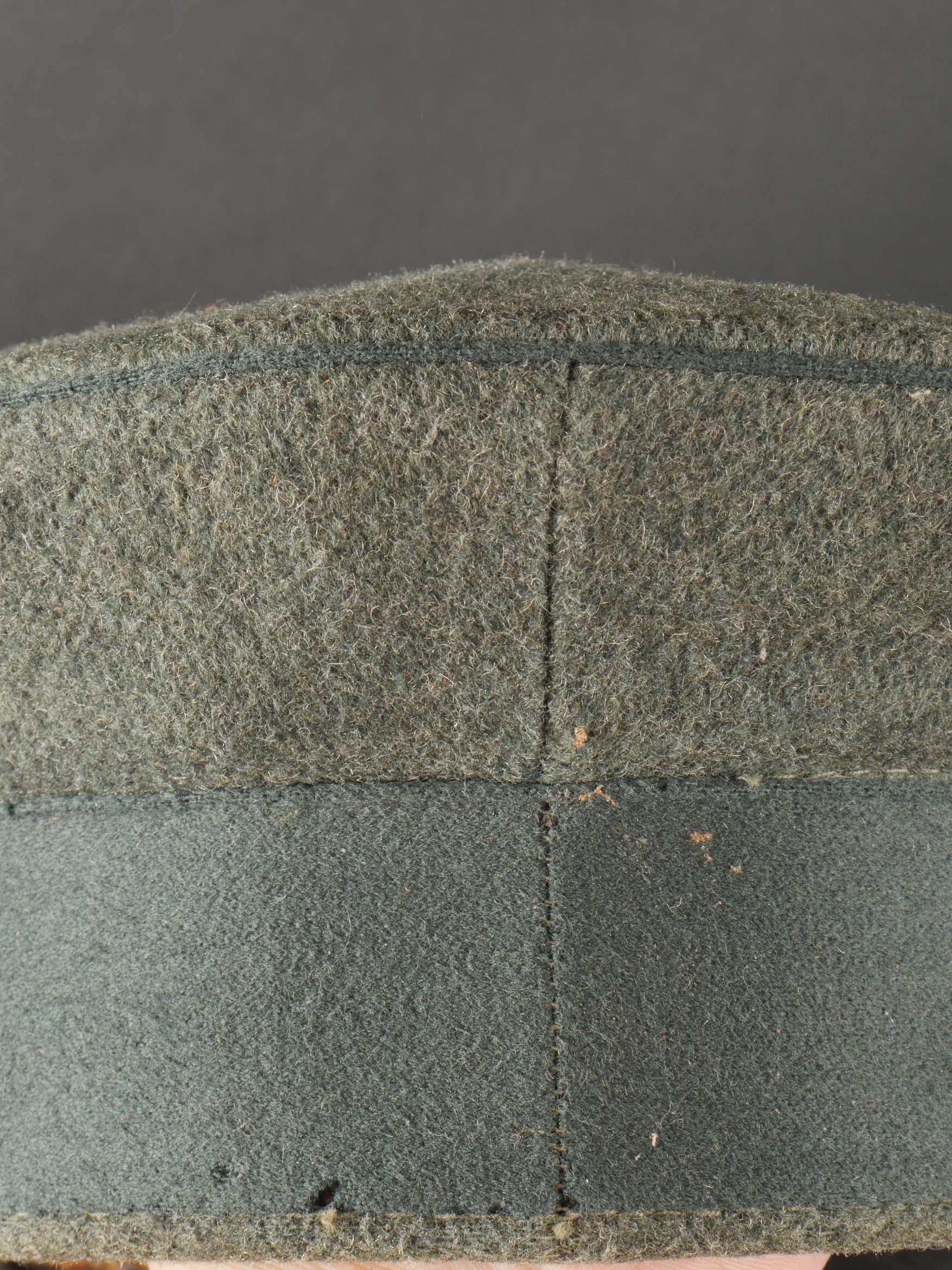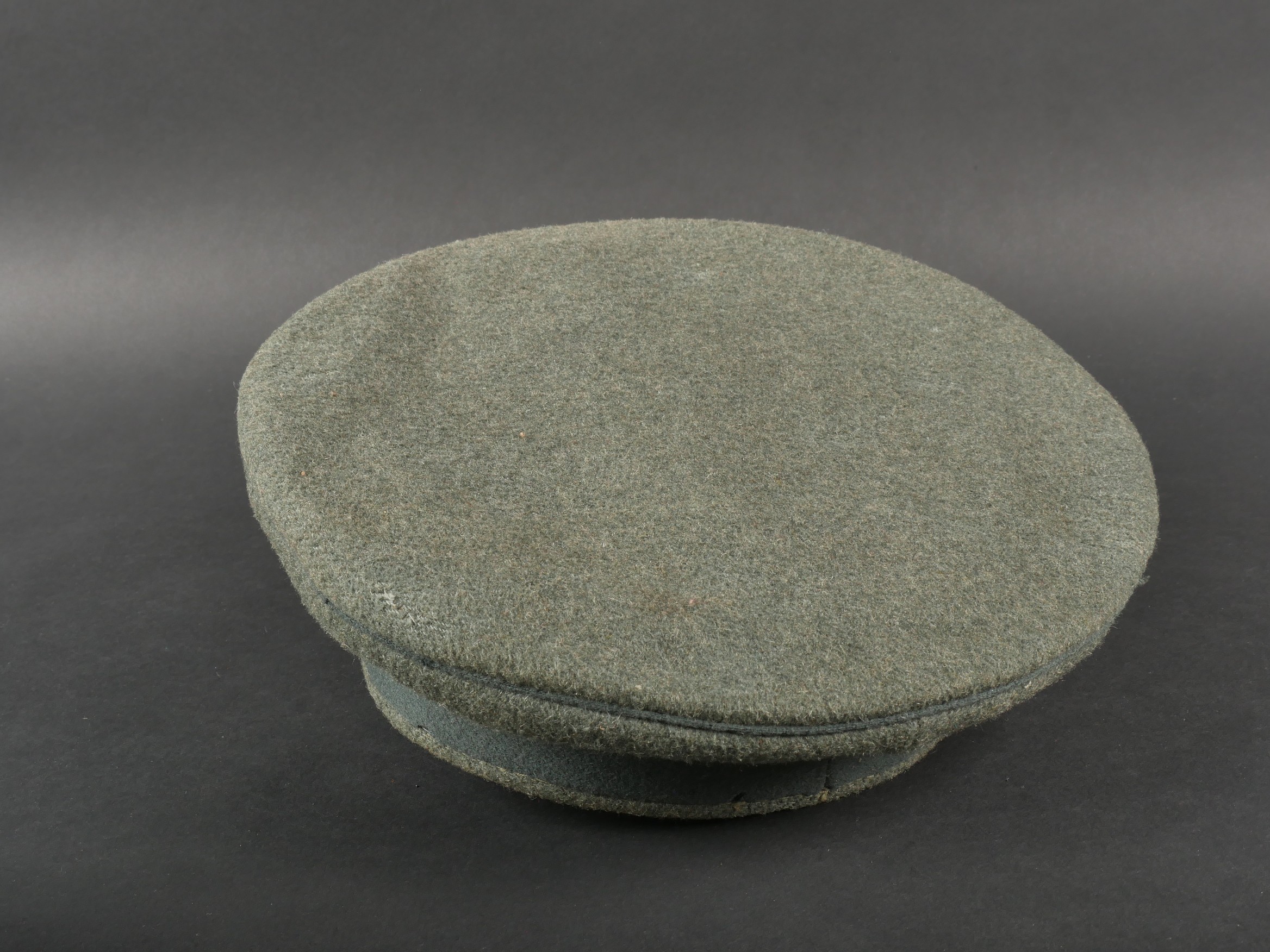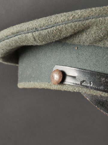 Modèle toutes armes en drap feldgrau avec passepoil et bandeau vert. Quelques trous de mites épars, plus important sur le bandeau mais peu visible car sous la jugulaire. Jugulaire vernie noire... en savoir plus