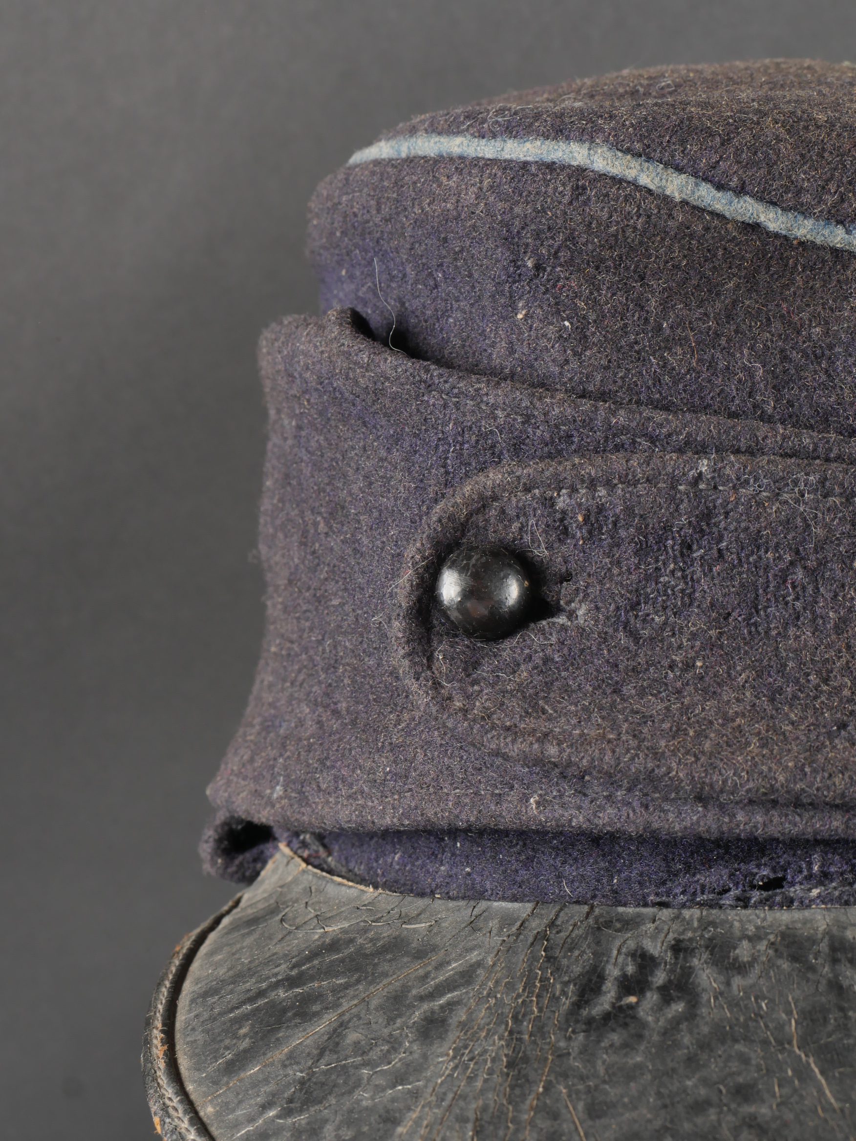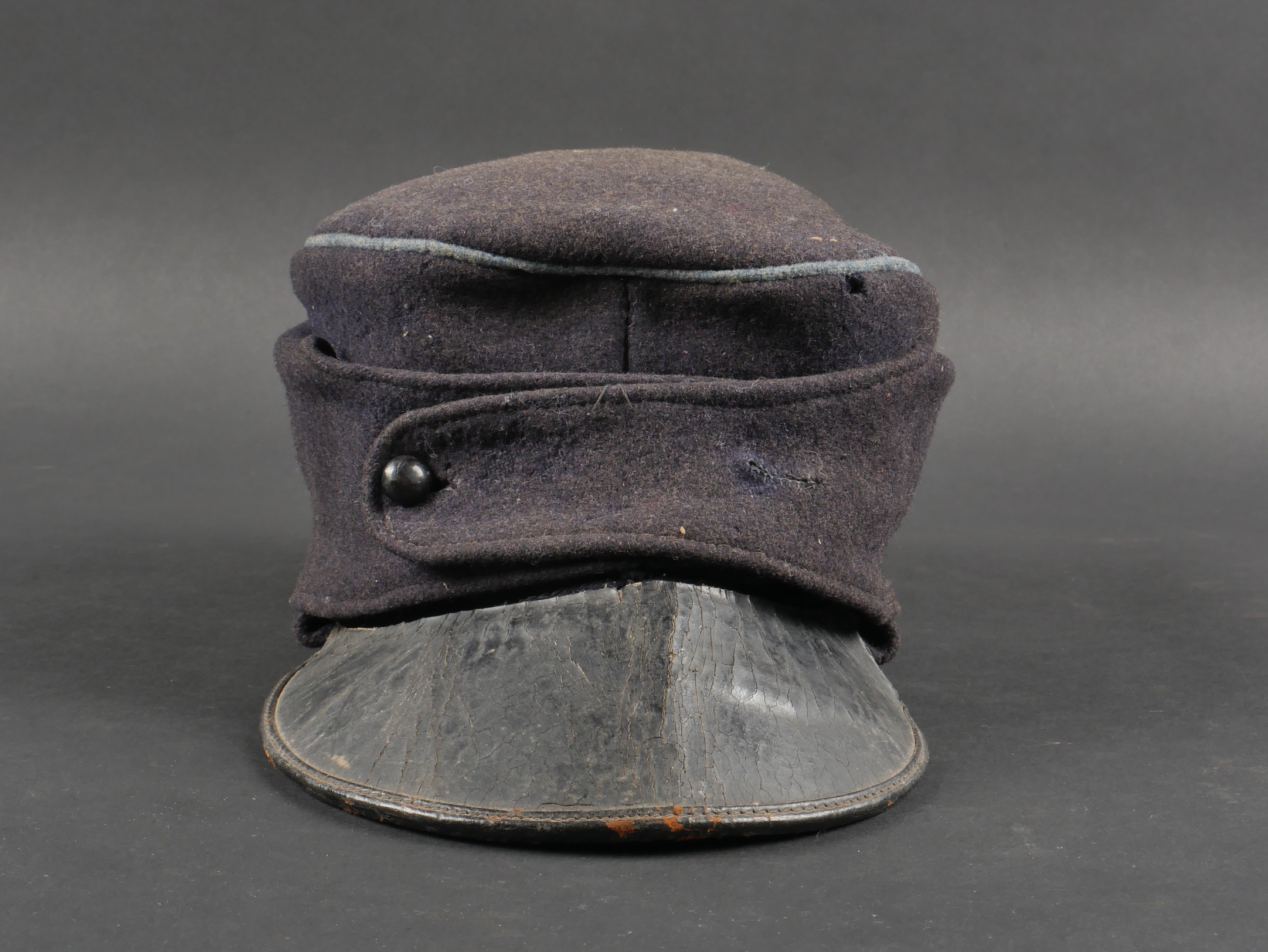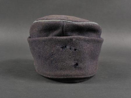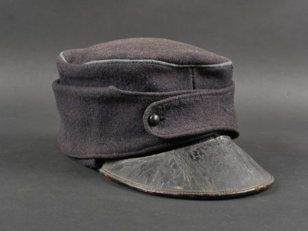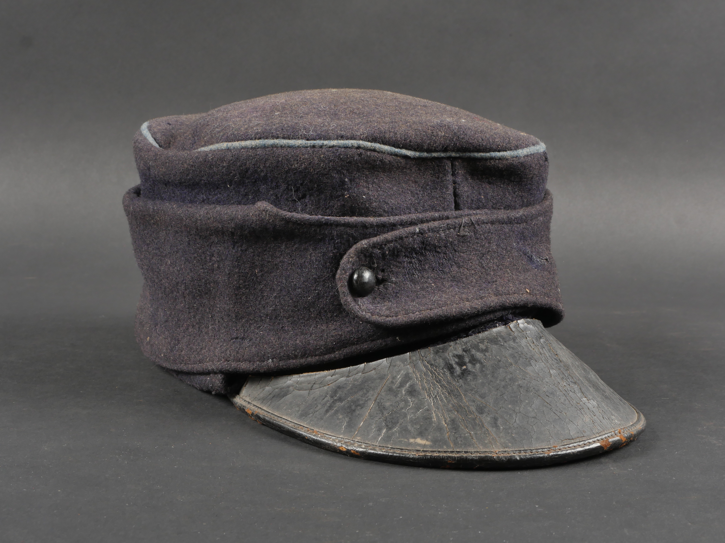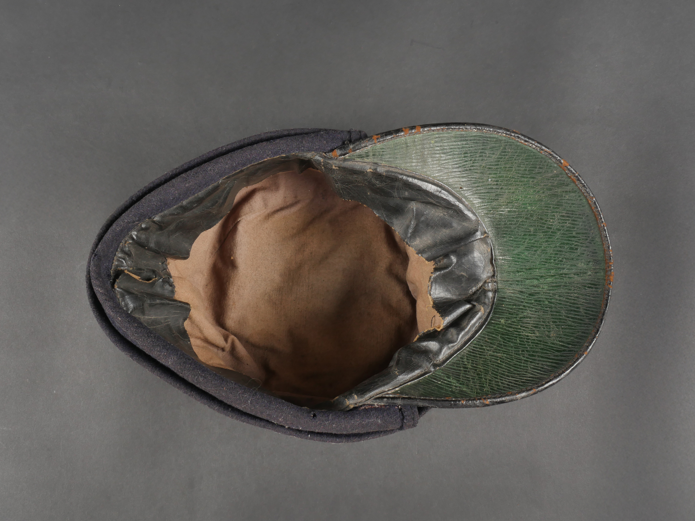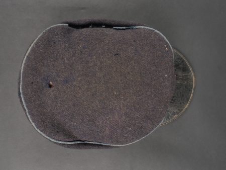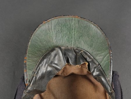 Casquette belge dite képi Yser. Rare casquette Yser introduite fin 1914, typique des combats de l’hiver 1914-1915, en drap foncé avec rabat protège nuque. Quelques trous de mites sur l’arrière, le dessus. Passepoil bleu, couleur de l’infanterie. Un bouton manquant sur le devant. Visière ronde, dessus vernis noir, dessous garni d’une basane verte. Bandeau de sudation en toile cirée noire, et doublure en tissu gris. Usure d’usage, patine. Très difficile à trouver. Belgian “Yser” CapRare Yser-type cap introduced at the end of 1914, typical of the winter fighting of 1914–1915. Dark cloth with neck flap. A few small moth holes to the rear and upper section. Blue piping, the color of the infantry. One front button missing. Black varnished top visor, green underside. Black oilcloth sweatband and grey fabric lining. Worn condition, fine patina. Very hard to find.