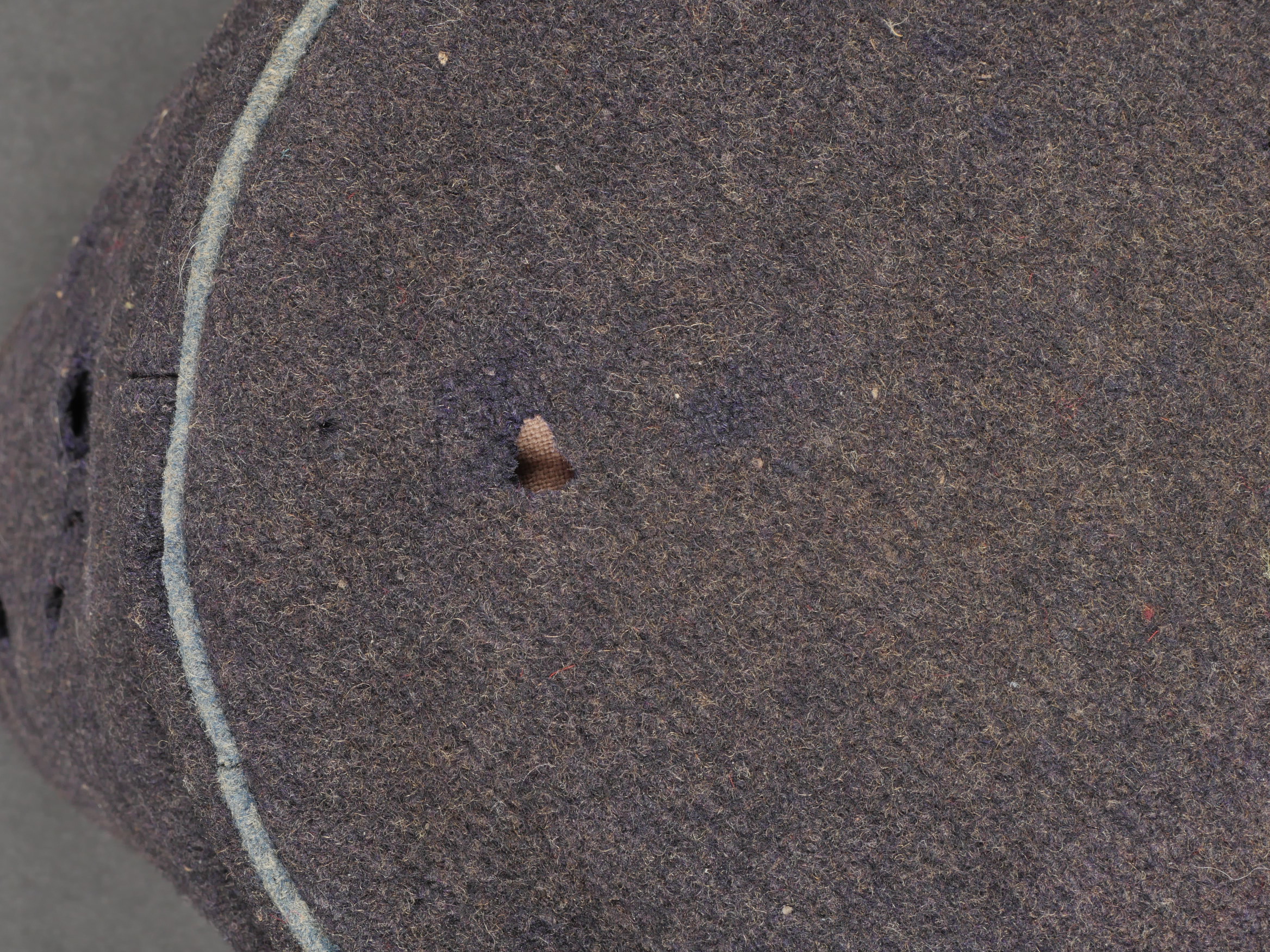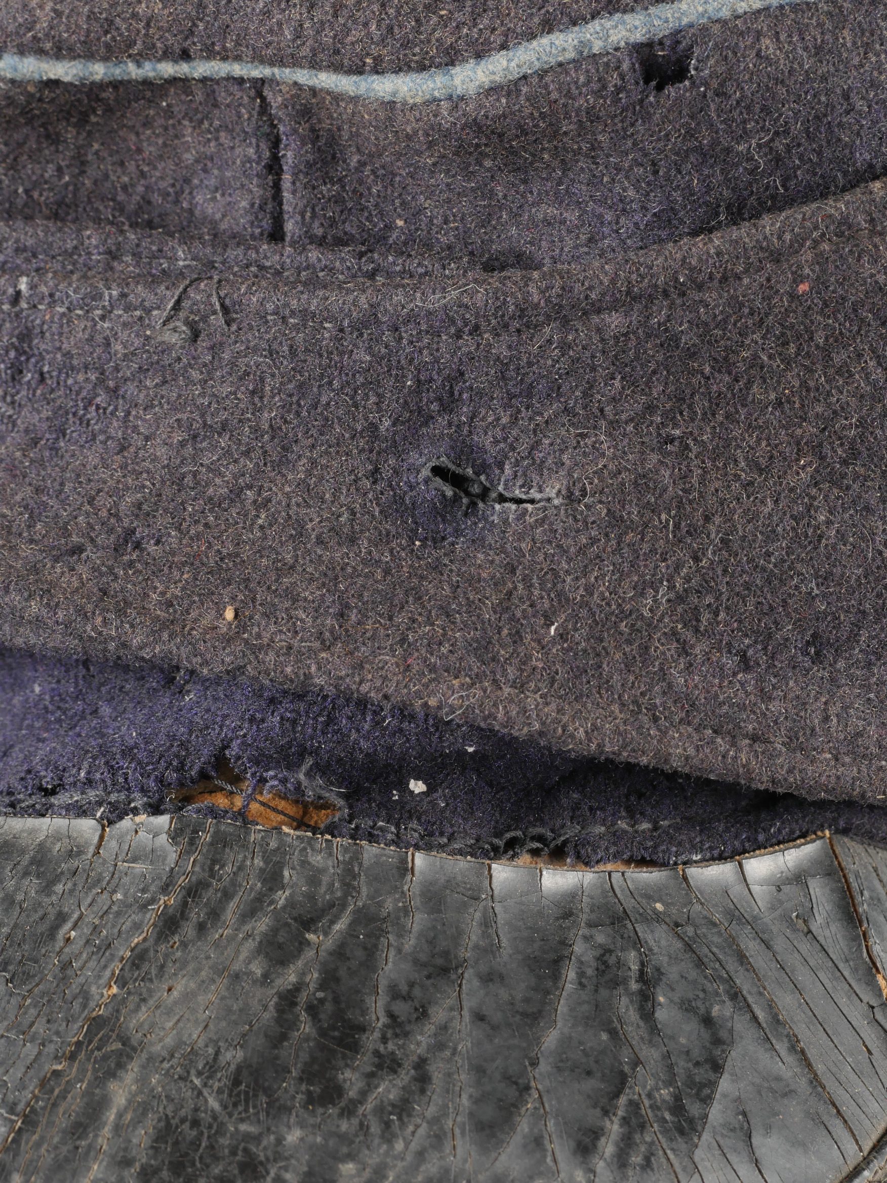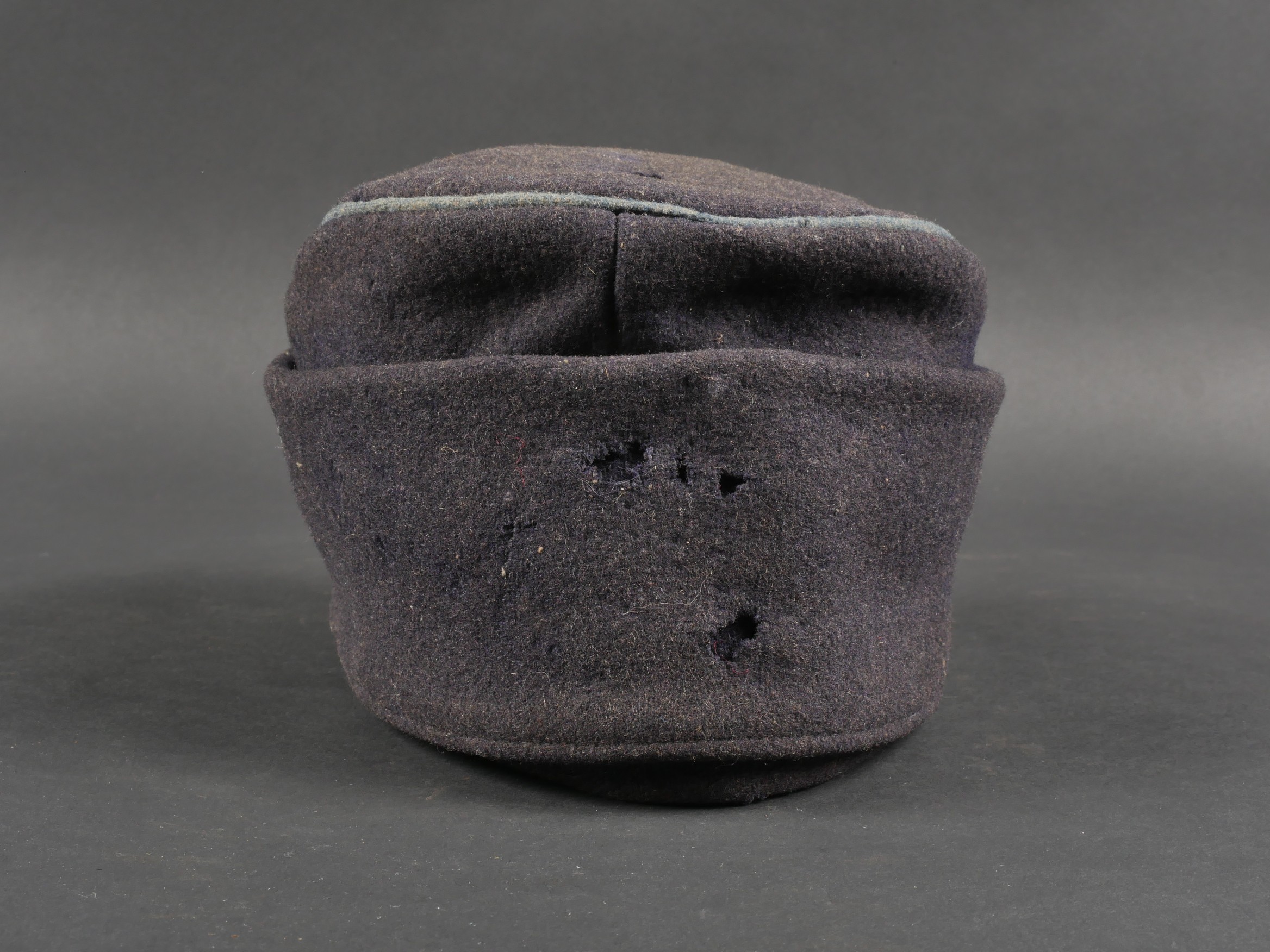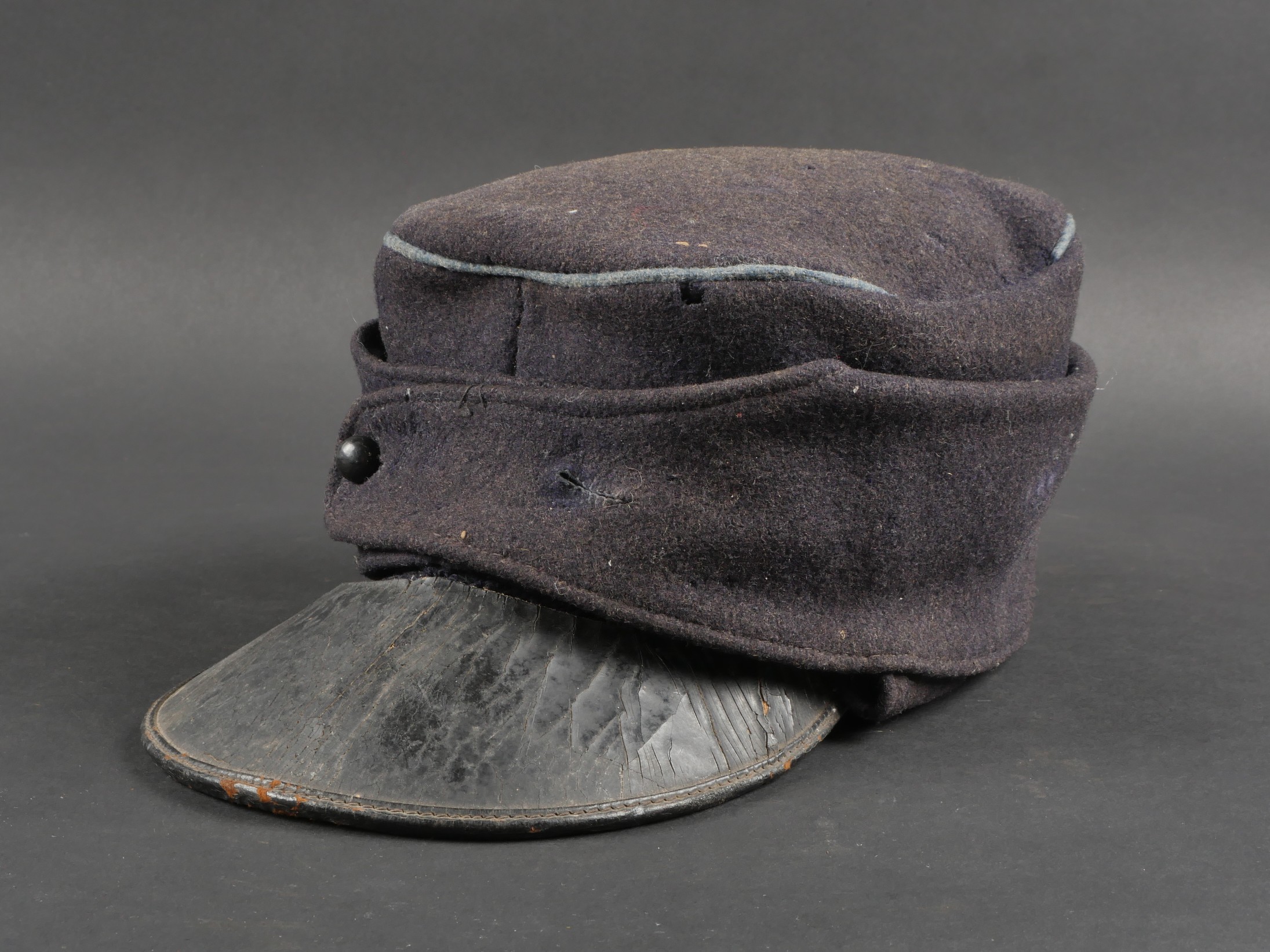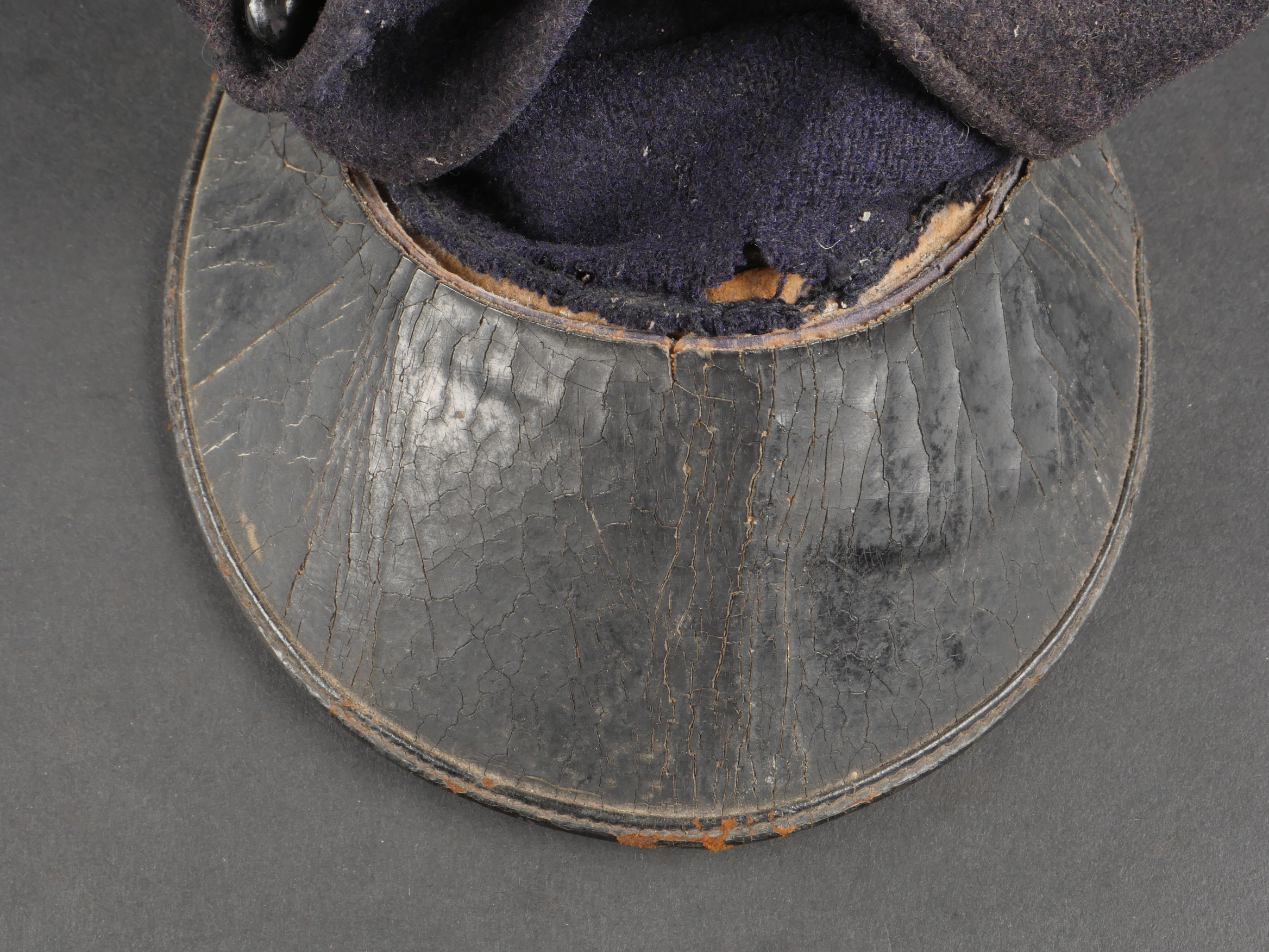 Casquette belge dite képi Yser. Rare casquette Yser introduite fin 1914, typique des combats de l’hiver 1914-1915, en drap foncé avec rabat protège nuque. Quelques trous de mites sur l’arrière, le dessus. Passepoil bleu, couleur de l’infanterie. Un bouton manquant sur le devant. Visière ronde, dessus vernis noir, dessous garni d’une basane verte. Bandeau de sudation en toile cirée noire, et doublure en tissu gris. Usure d’usage, patine. Très difficile à trouver. Belgian “Yser” CapRare Yser-type cap introduced at the end of 1914, typical of the winter fighting of 1914–1915. Dark cloth with neck flap. A few small moth holes to the rear and upper section. Blue piping, the color of the infantry. One front button missing. Black varnished top visor, green underside. Black oilcloth sweatband and grey fabric lining. Worn condition, fine patina. Very hard to find.