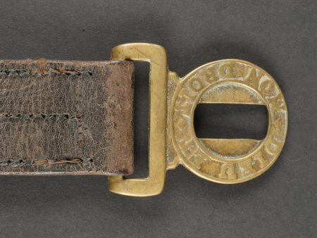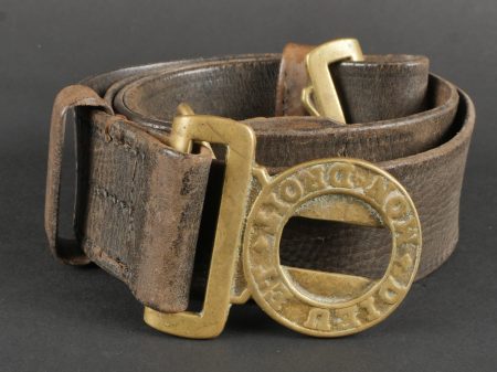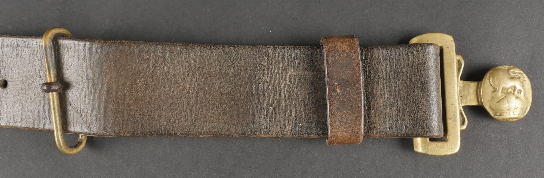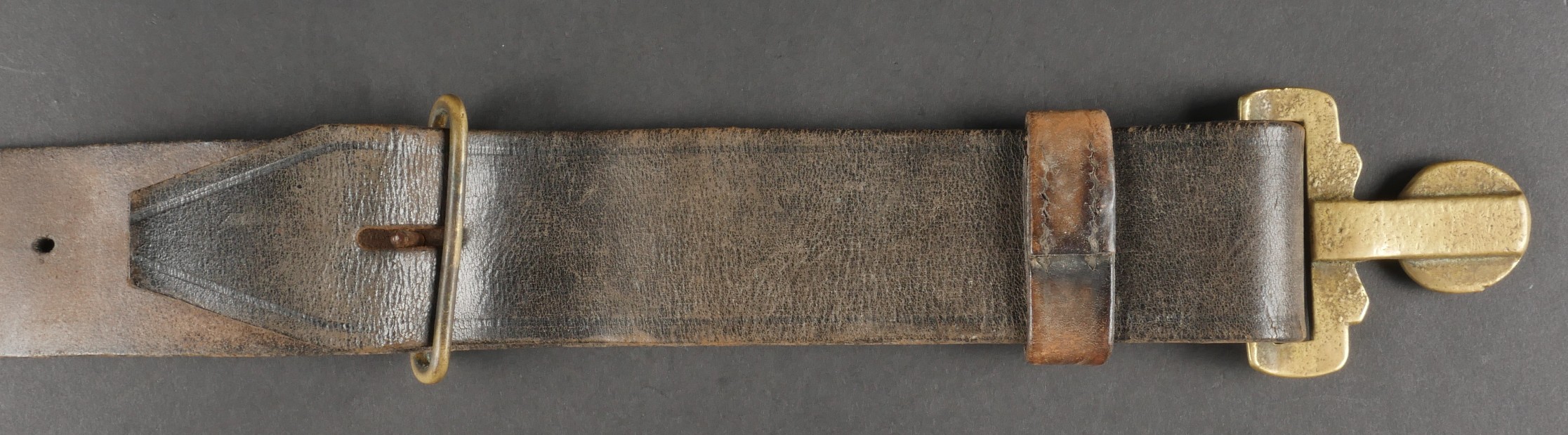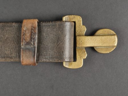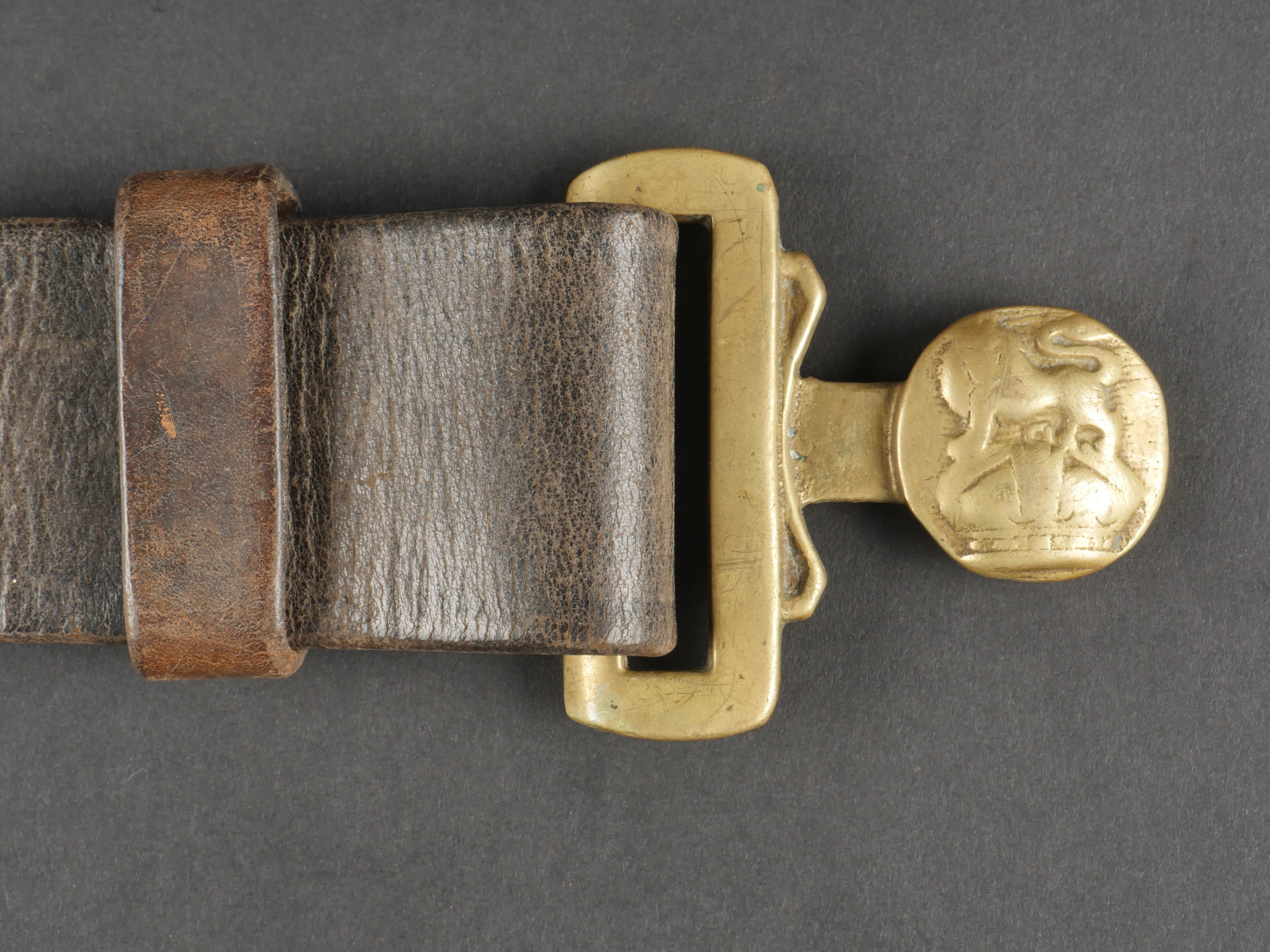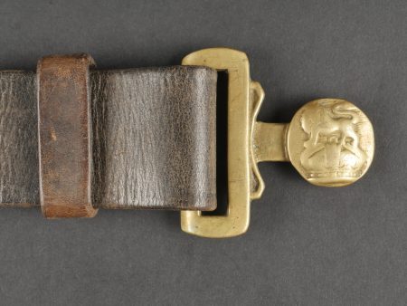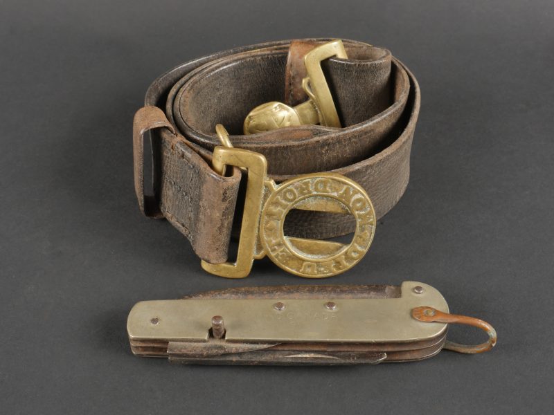Ceinturon anglais en cuir et canif canadien 1915. Ceinturon en cuir marron avec boucle au lion et à la couronne avec légende DIEU ET MON DROIT. Sur le modèle 1888 Slade Wallace, période Edwardienne 1902-1910, a continué à équiper les troupes de Milice et Territoriaux en début de guerre. Avec ses boucles laiton et son passant cuir. Usure, patine. Accompagné d’un canif canadien bien marqué et daté 1915, la lame de couteau est émoussée et raccourcie. British Leather Belt and Canadian Pocket Knife 1915Brown leather belt with lion-and-crown buckle bearing the motto “DIEU ET MON DROIT.” Pattern 1888 Slade-Wallace type, Edwardian period 1902–1910, used by Militia and Territorial troops early in the war. Brass fittings and leather keeper intact. Accompanied by a Canadian folding knife well marked and dated 1915, shortened and blunted blade.