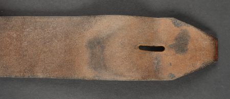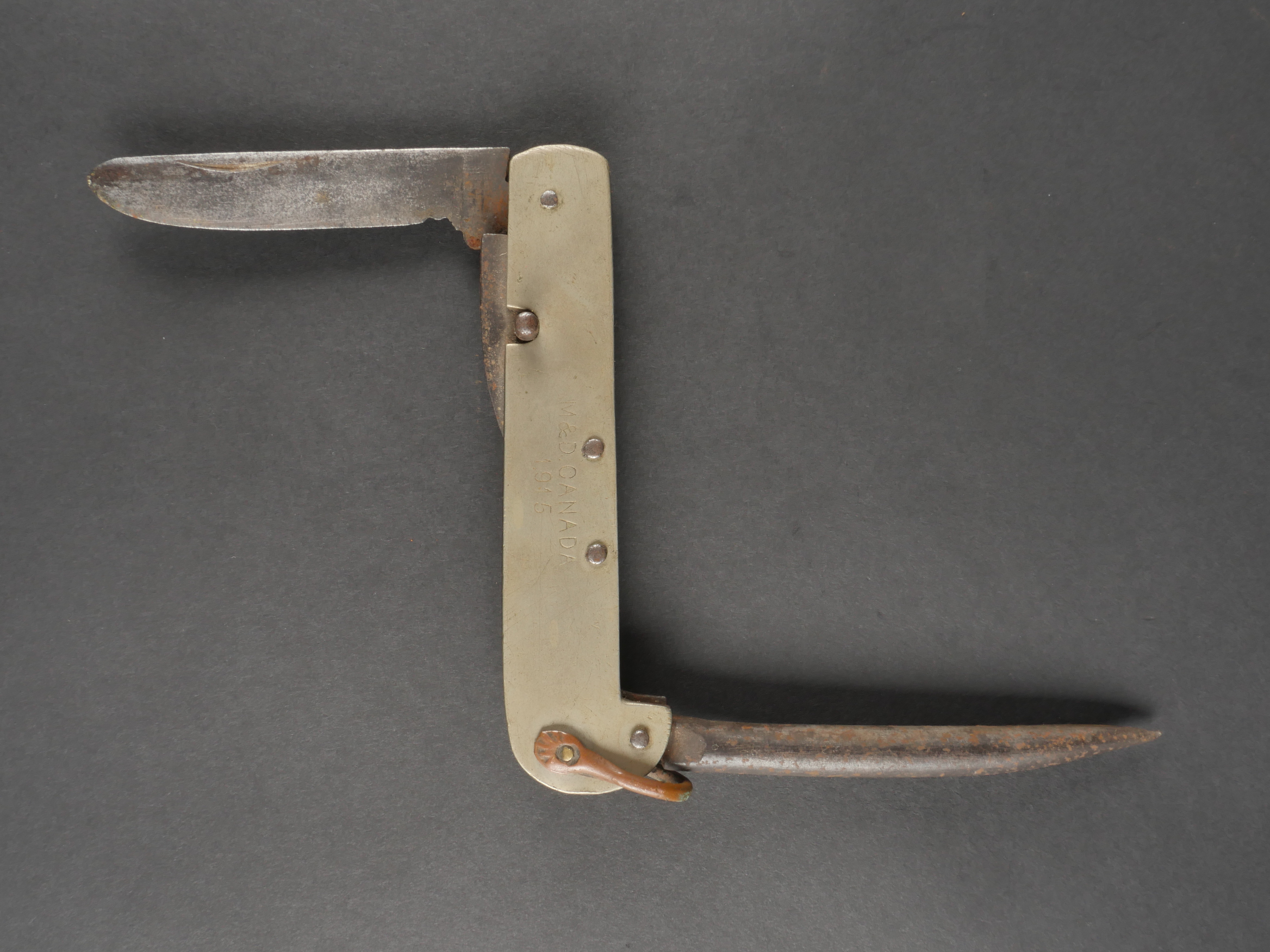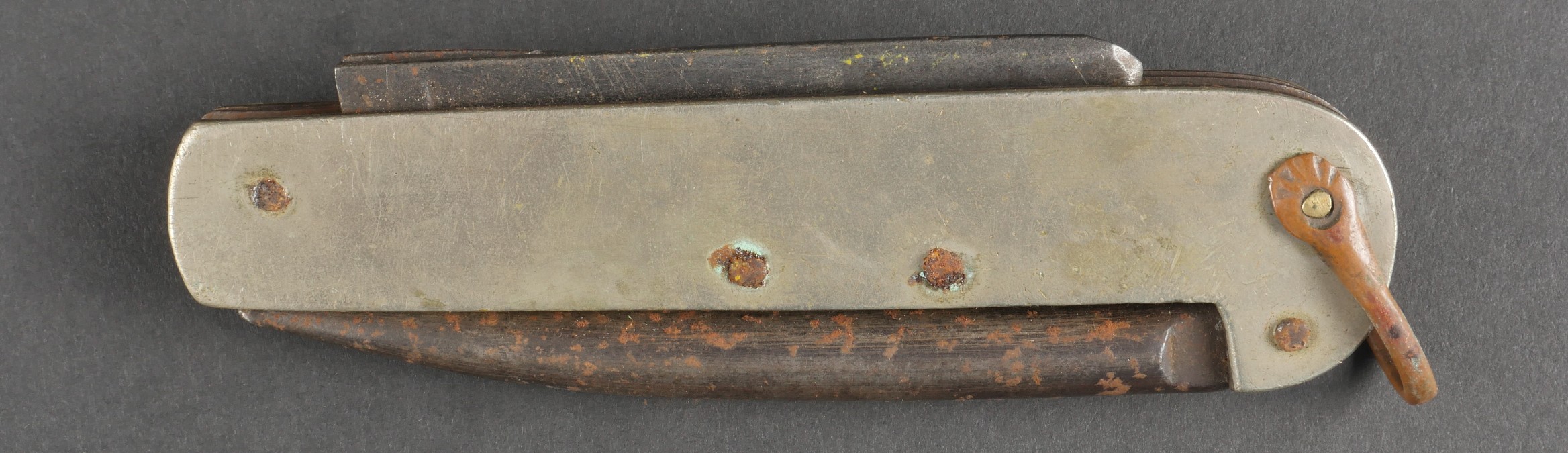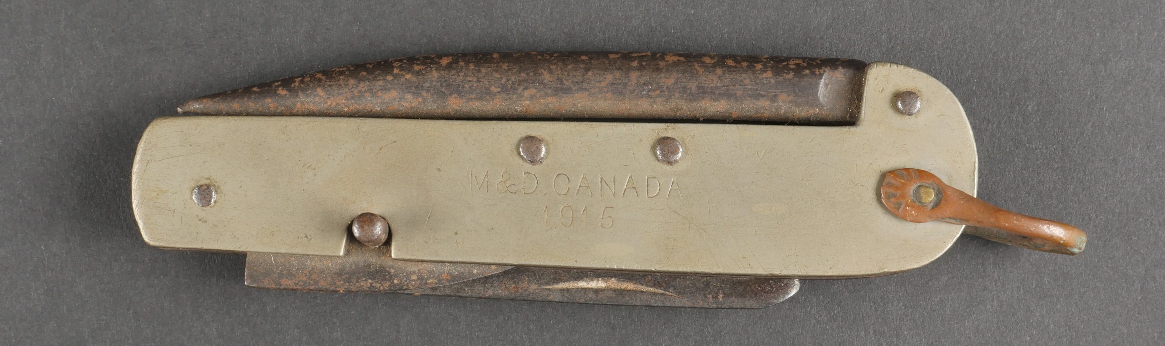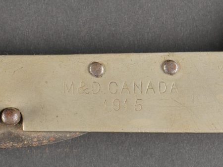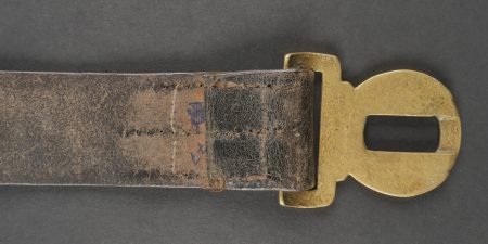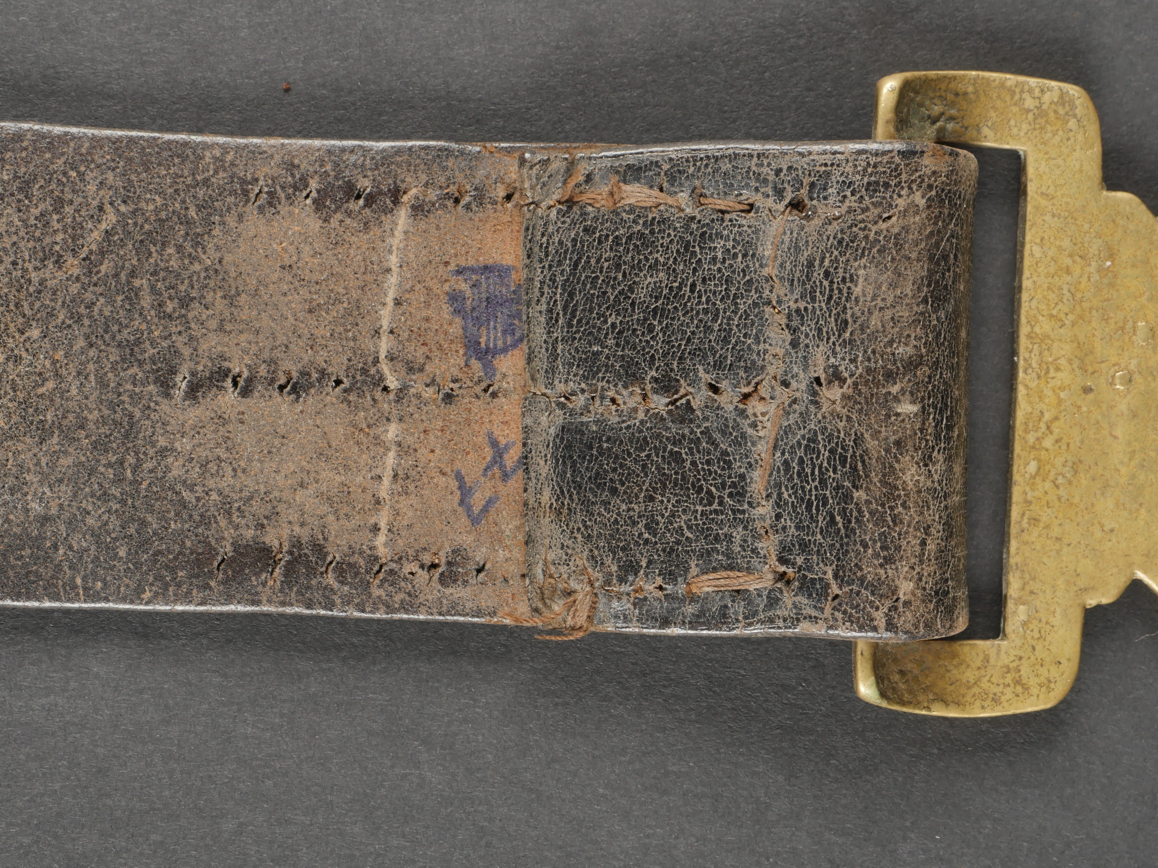 Ceinturon anglais en cuir et canif canadien 1915. Ceinturon en cuir marron avec boucle au lion et à la couronne avec légende DIEU ET MON DROIT. Sur le modèle 1888 Slade Wallace, période Edwardienne 1902-1910, a continué à équiper les troupes de Milice et Territoriaux en début de guerre. Avec ses boucles laiton et son passant cuir. Usure, patine. Accompagné d’un canif canadien bien marqué et daté 1915, la lame de couteau est émoussée et raccourcie. British Leather Belt and Canadian Pocket Knife 1915Brown leather belt with lion-and-crown buckle bearing the motto “DIEU ET MON DROIT.” Pattern 1888 Slade-Wallace type, Edwardian period 1902–1910, used by Militia and Territorial troops early in the war. Brass fittings and leather keeper intact. Accompanied by a Canadian folding knife well marked and dated 1915, shortened and blunted blade.