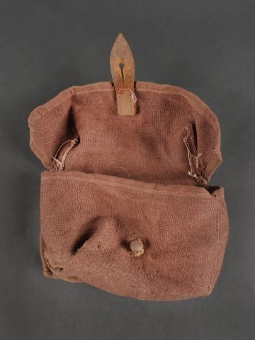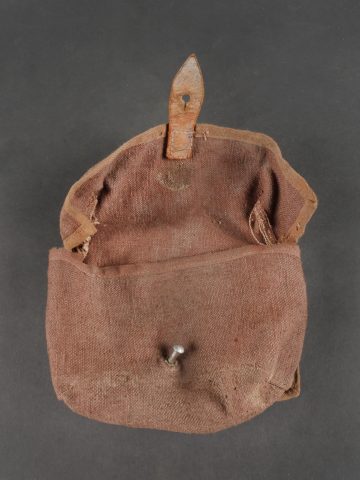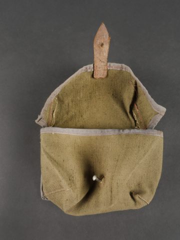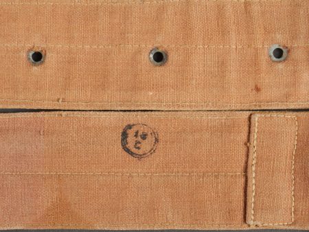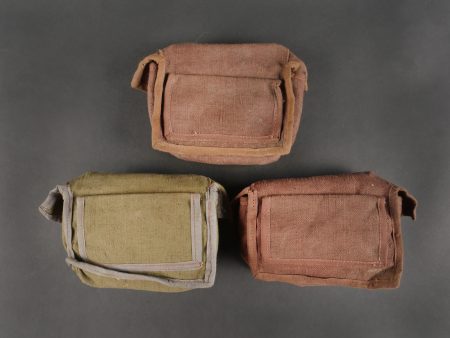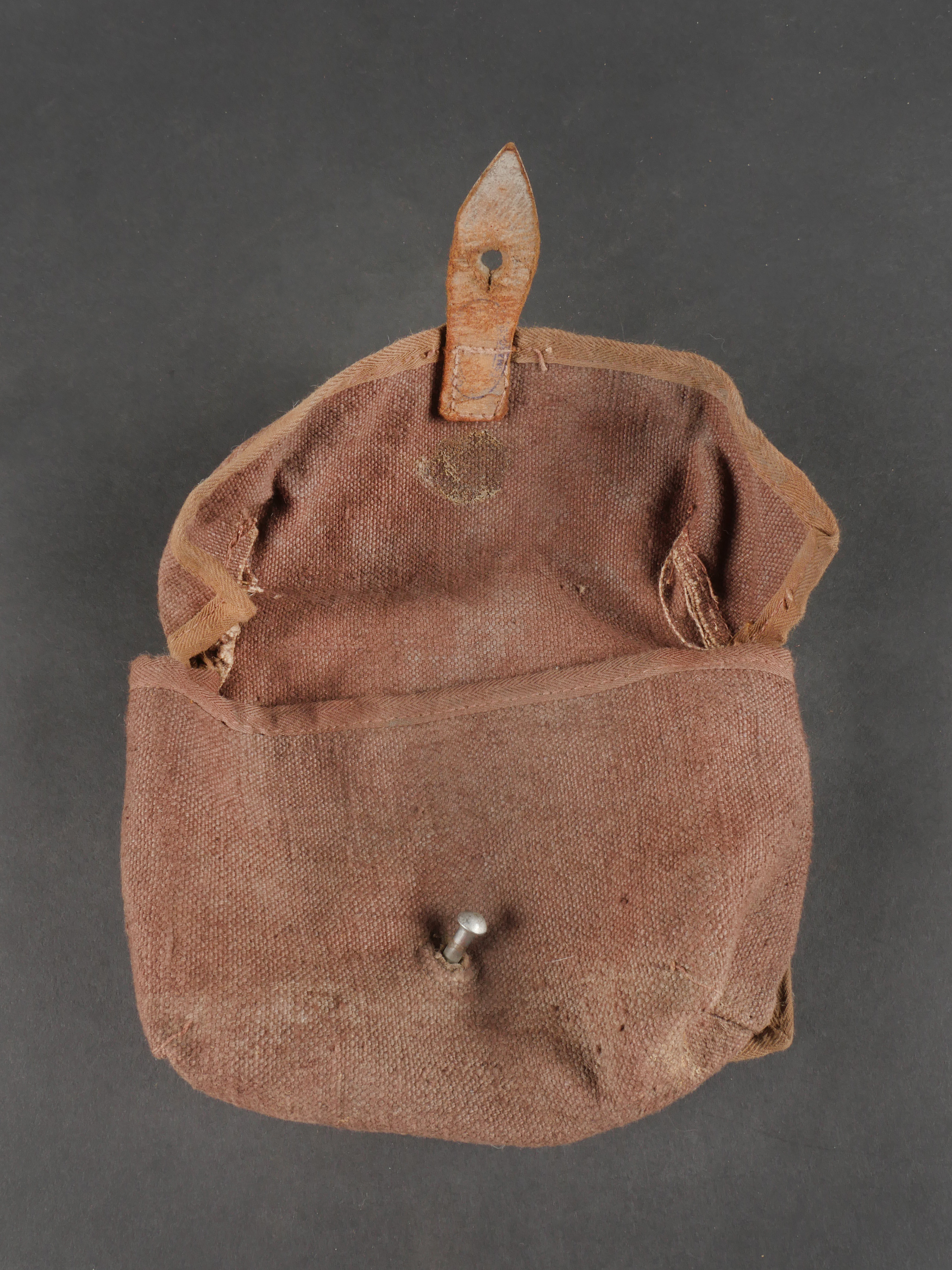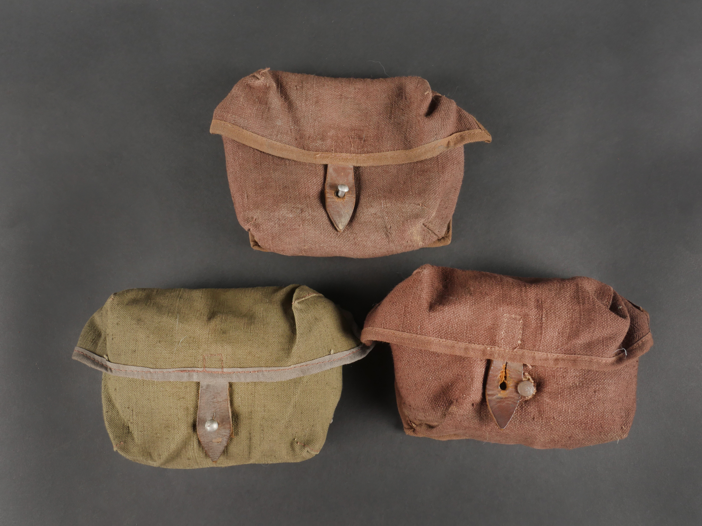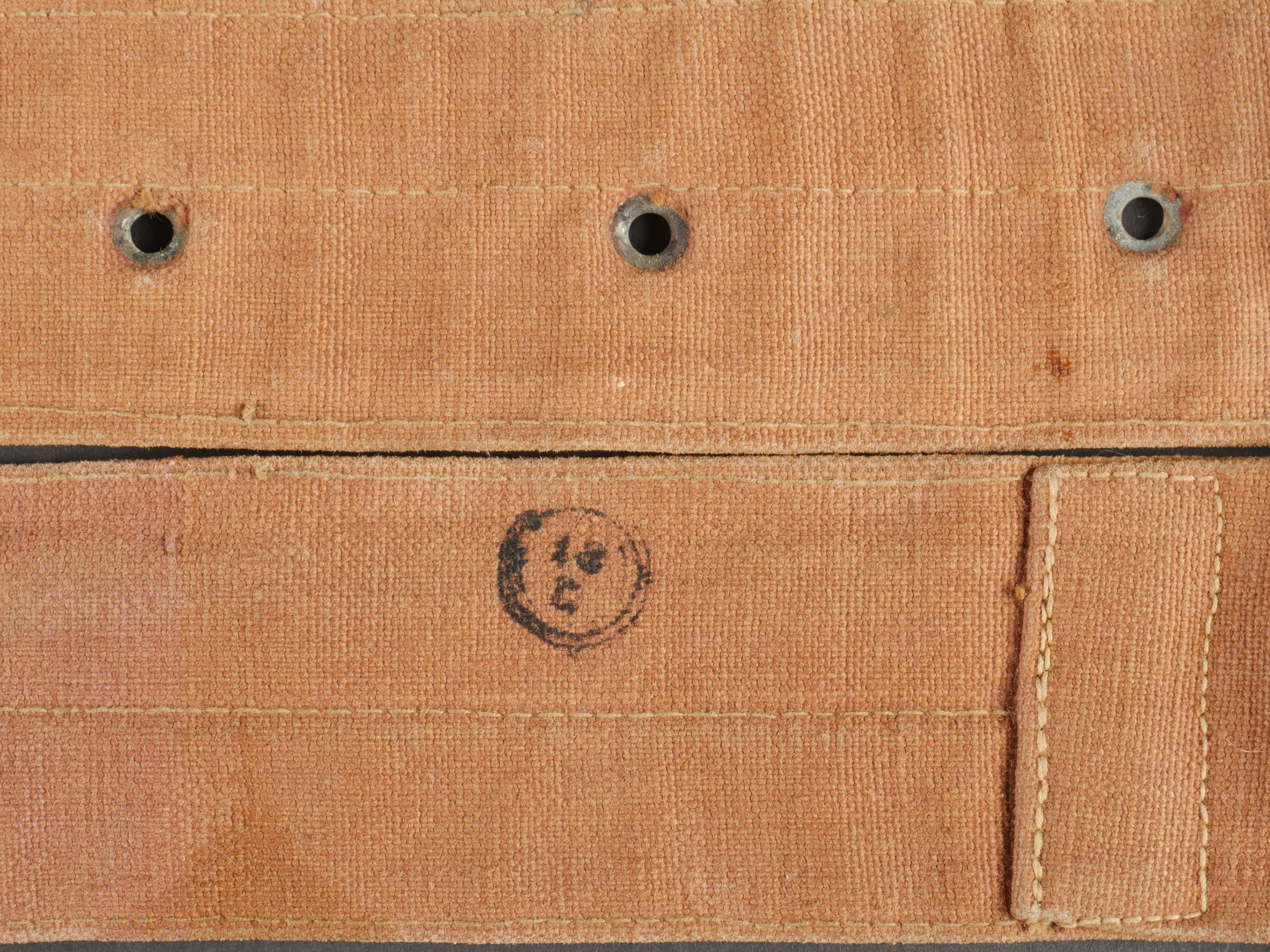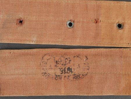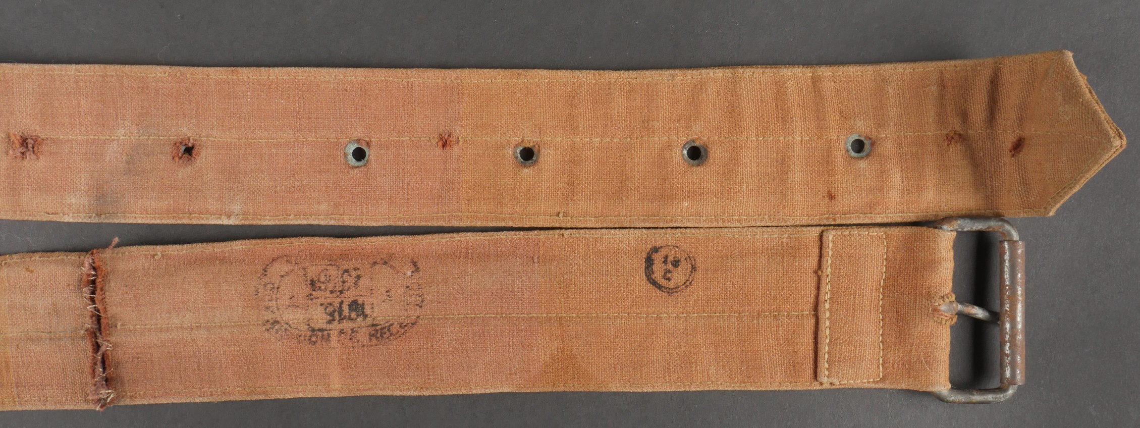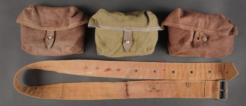 Ceinturon et cartouchières français ersatz en toile. Ceinturon en toile cachou, largeur 4,6 cm, boucle en fer à un ardillon. Coupé puis recousu à 24,5 cm de la boucle, invisible si monté avec une cartouchière sur un mannequin. Trous de réglage initiaux renforcés d’œillets, puis plusieurs trous additionnels. Cachet ovale de réception daté 1916 et cachet de contrôle. Deux cartouchières en toile marron avec patte de fermeture en cuir, les tétons de fermeture, tous deux d’origine sont différents. Au dos une pièce de toile formant passant de ceinturon. Une troisième cartouchière en toile verte, de même construction. Ces cartouchières sont dépourvues d’anneau de suspension donc initialement destinées à l’instruction mais utilisation possible au front. Bon état. French Ersatz Canvas Belt and Cartridge Pouches Khaki canvas belt, 4.6 cm wide, with single-prong iron buckle. Cut and re-stitched 24.5 cm from the buckle, invisible when displayed with a pouch. Original adjustment holes reinforced with eyelets, plus several added later. Oval acceptance and inspection stamps dated 1916. Two brown canvas pouches with leather closure tabs, both with original but non-matching studs. Rear belt loops made of canvas. A third pouch in green canvas of identical construction. These pouches lack suspension rings, intended initially for training but usable in the field. Good condition.