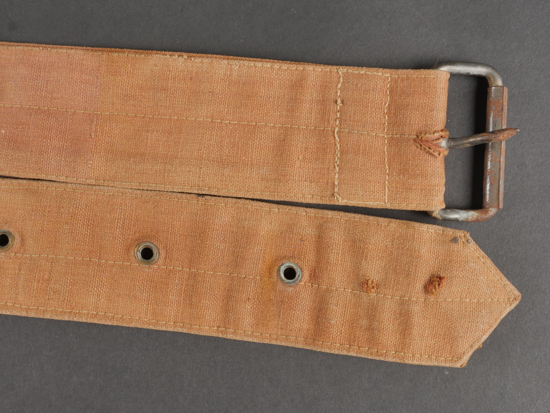 Ceinturon et cartouchières français ersatz en toile. Ceinturon en toile cachou, largeur 4,6 cm, boucle en fer à un ardillon. Coupé puis recousu à 24,5 cm de la boucle, invisible si monté... en savoir plus