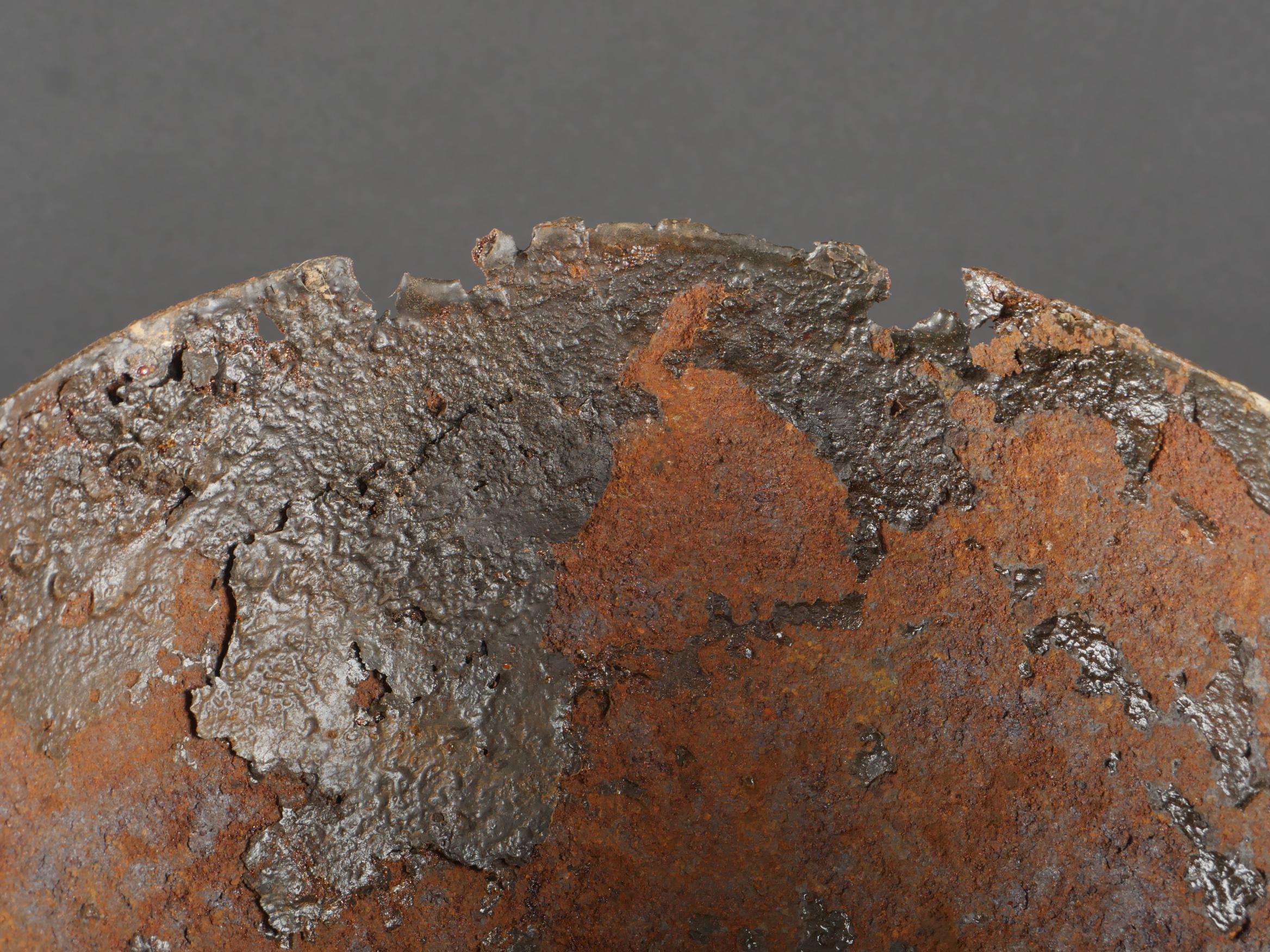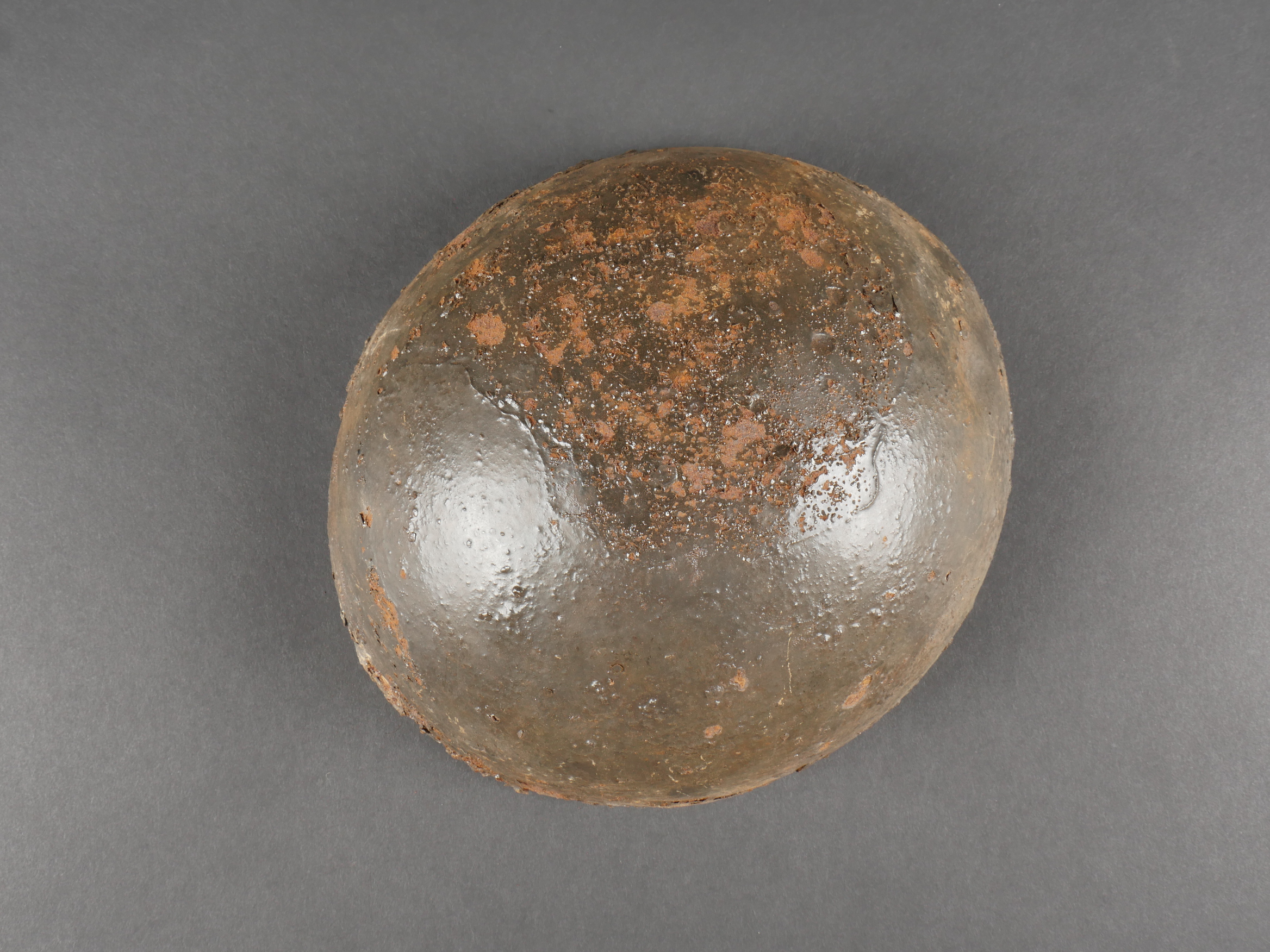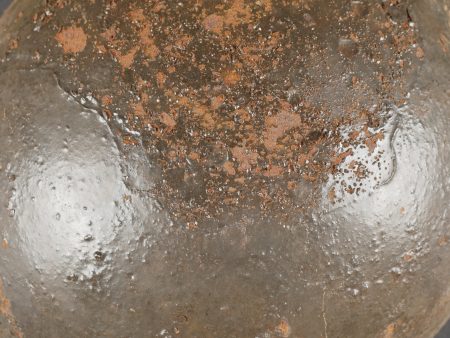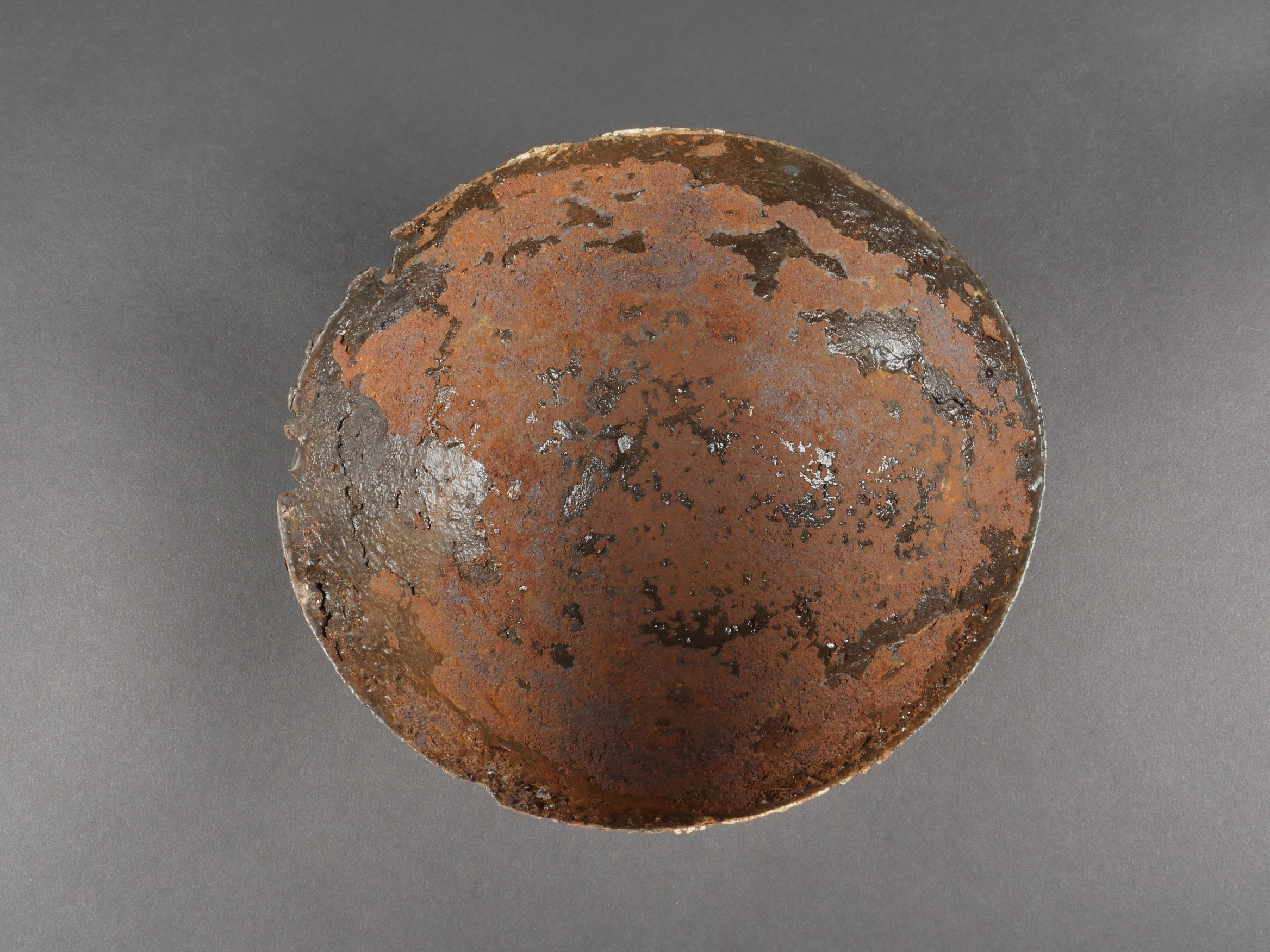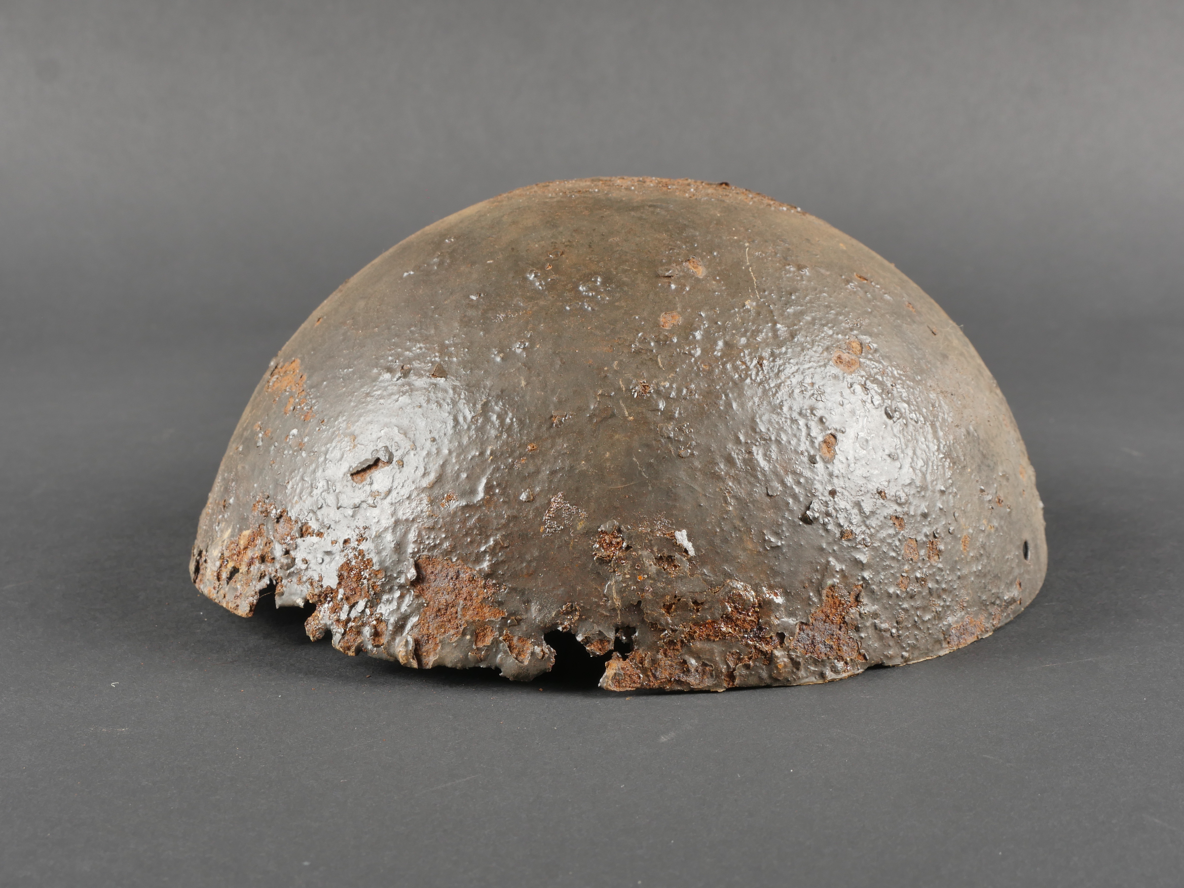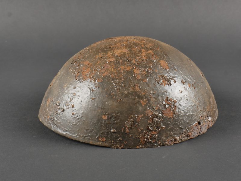 Cervelière protège-tête française Adrian. Calotte en tôle, conçue par Louis Adrian et fabriquée à 200 000 exemplaires par les Ets Japy. Rapidement abandonné au profit du casque Adrian. Difficile à trouver en bon état. Diamètre 17 cm, avec ses trous destinés à la coudre au képi. Oxydation, quelques trous et manques, pièce de terrain retrouvée en Artois en relativement bon état compte tenu de la fragilité de l’effet. French Adrian Protective Skullcap Steel skullcap designed by Louis Adrian and manufactured by the Japy company in 200,000 examples. Quickly abandoned in favor of the Adrian helmet. Hard to find in good condition. Diameter 17 cm, with holes for stitching to the kepi. Oxidation, some holes and losses, ground-dug example found in Artois, relatively well preserved considering its fragility.