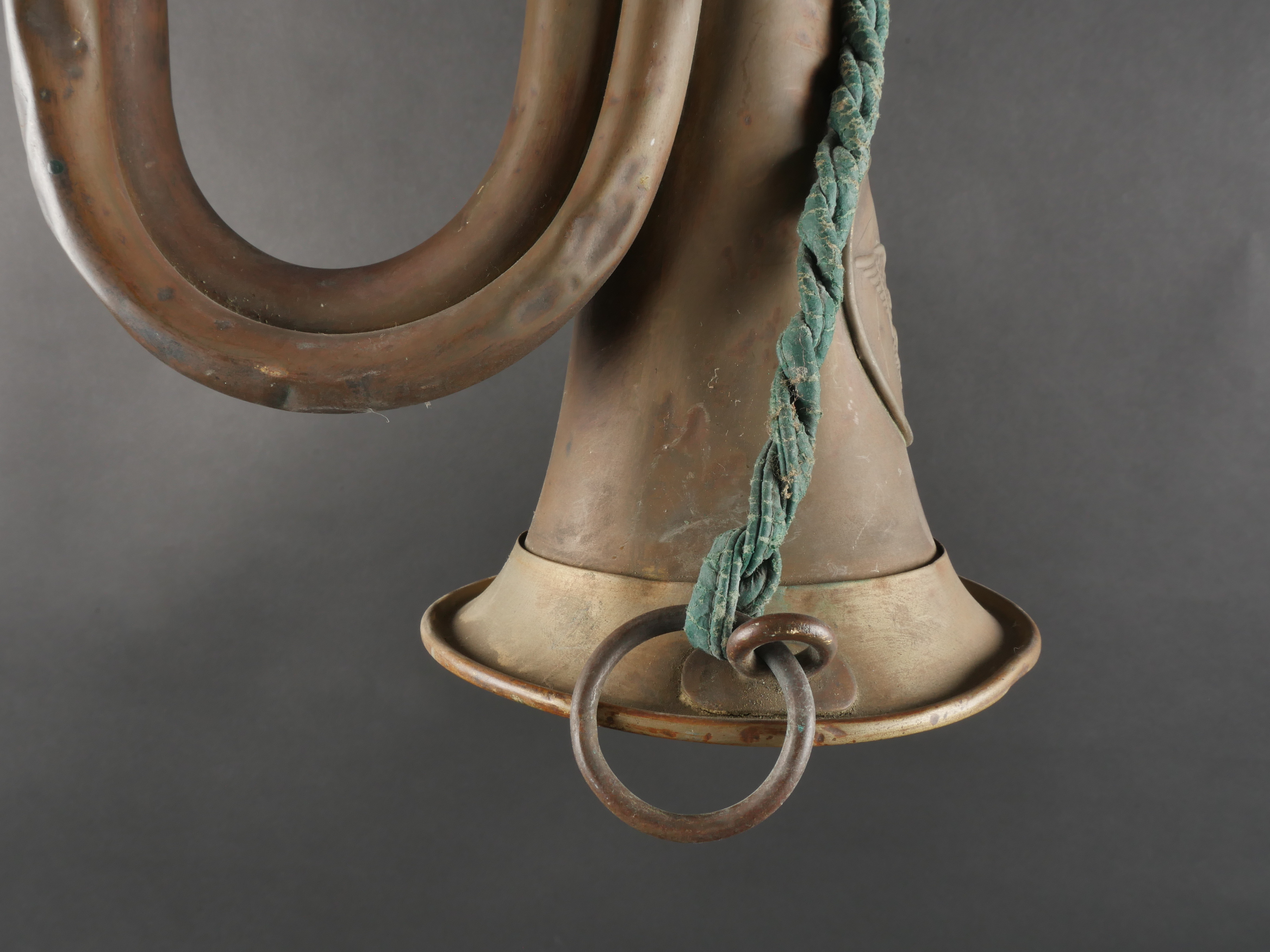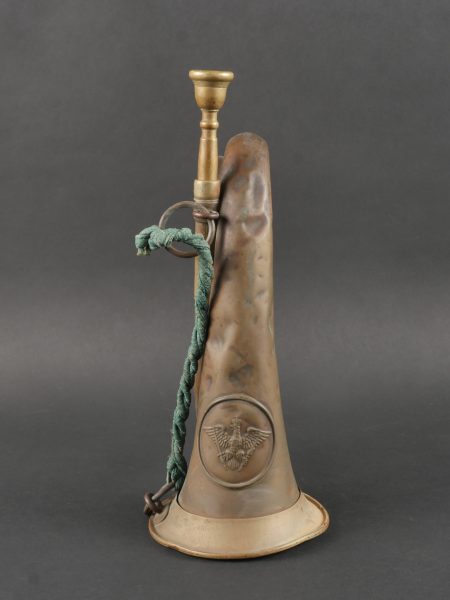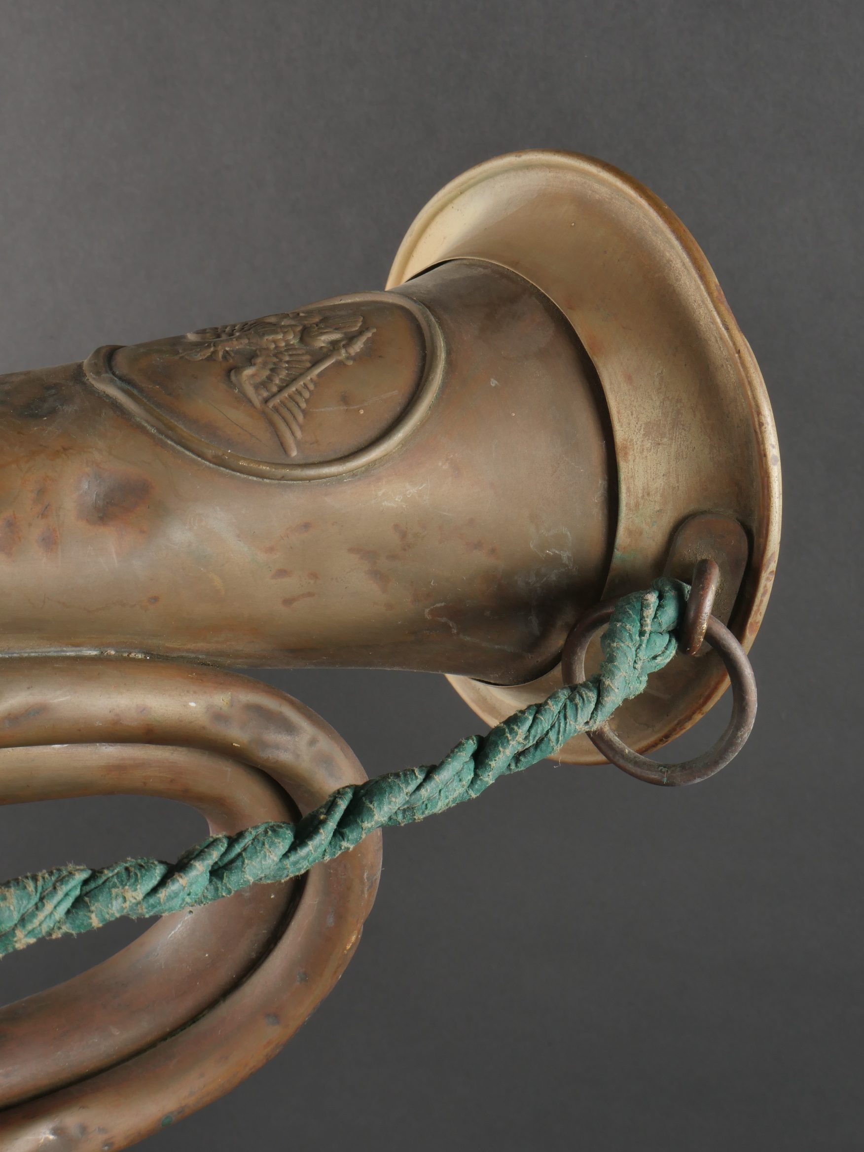 Brass Signalhorn, sometimes referred to as a Bugle, featuring a stamped Prussian eagle medallion. Maillechort mouth reinforcement. Complete with rings and mouthpiece. Patina and a few dents from use.