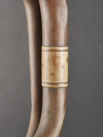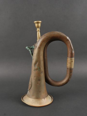 Clairon prussien Signalhorn. En laiton, parfois appelé Bugle, ce Signalhorn en laiton, avec macaron avec l’aigle prussien estampé. Renfort de cornet en maillechort. Avec ses anneaux et son embouchoir. Patine, quelques coups. Prussian Bugle (Signalhorn)