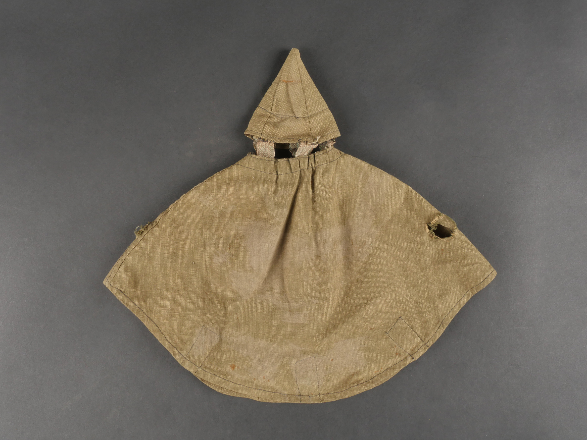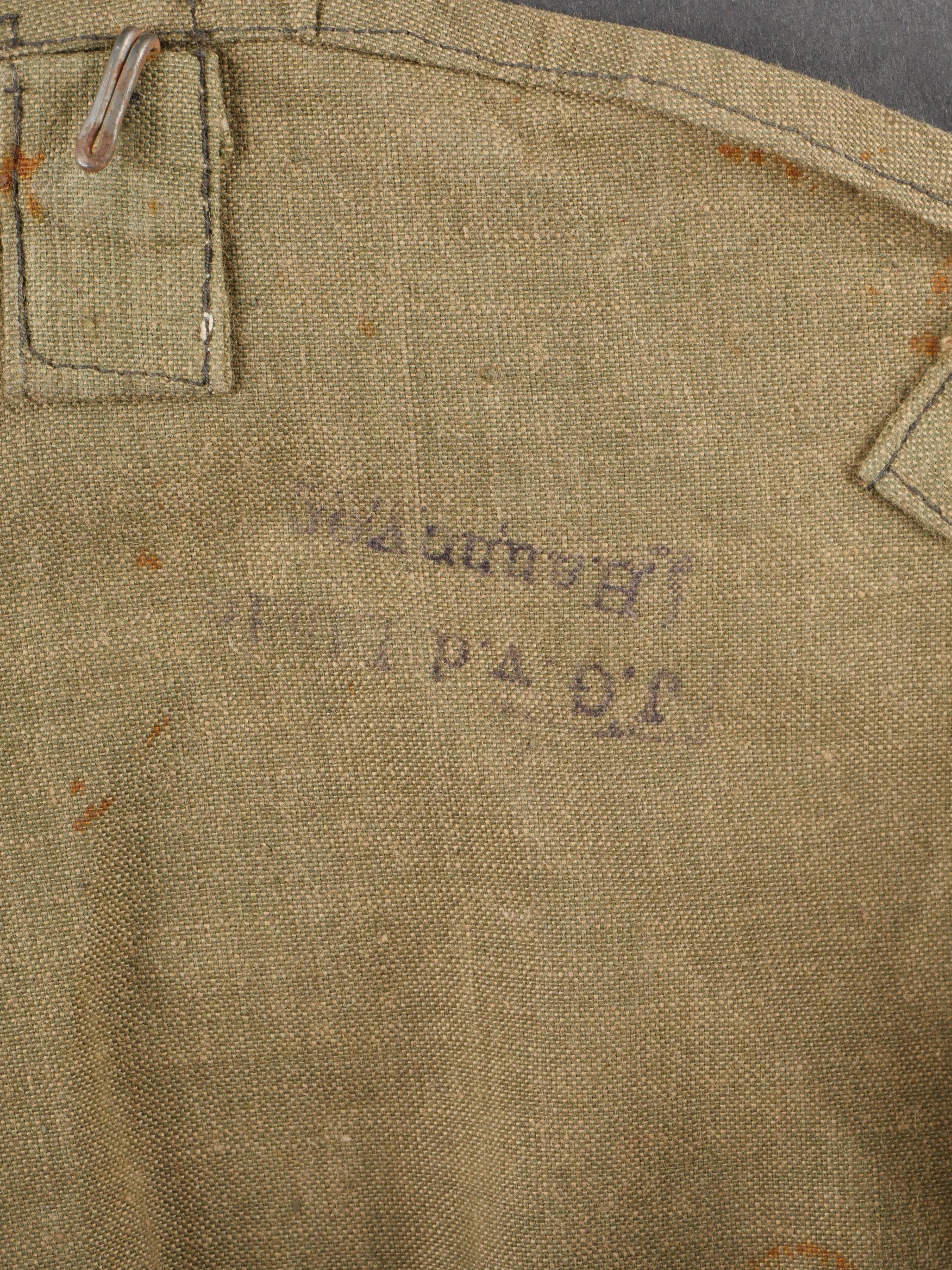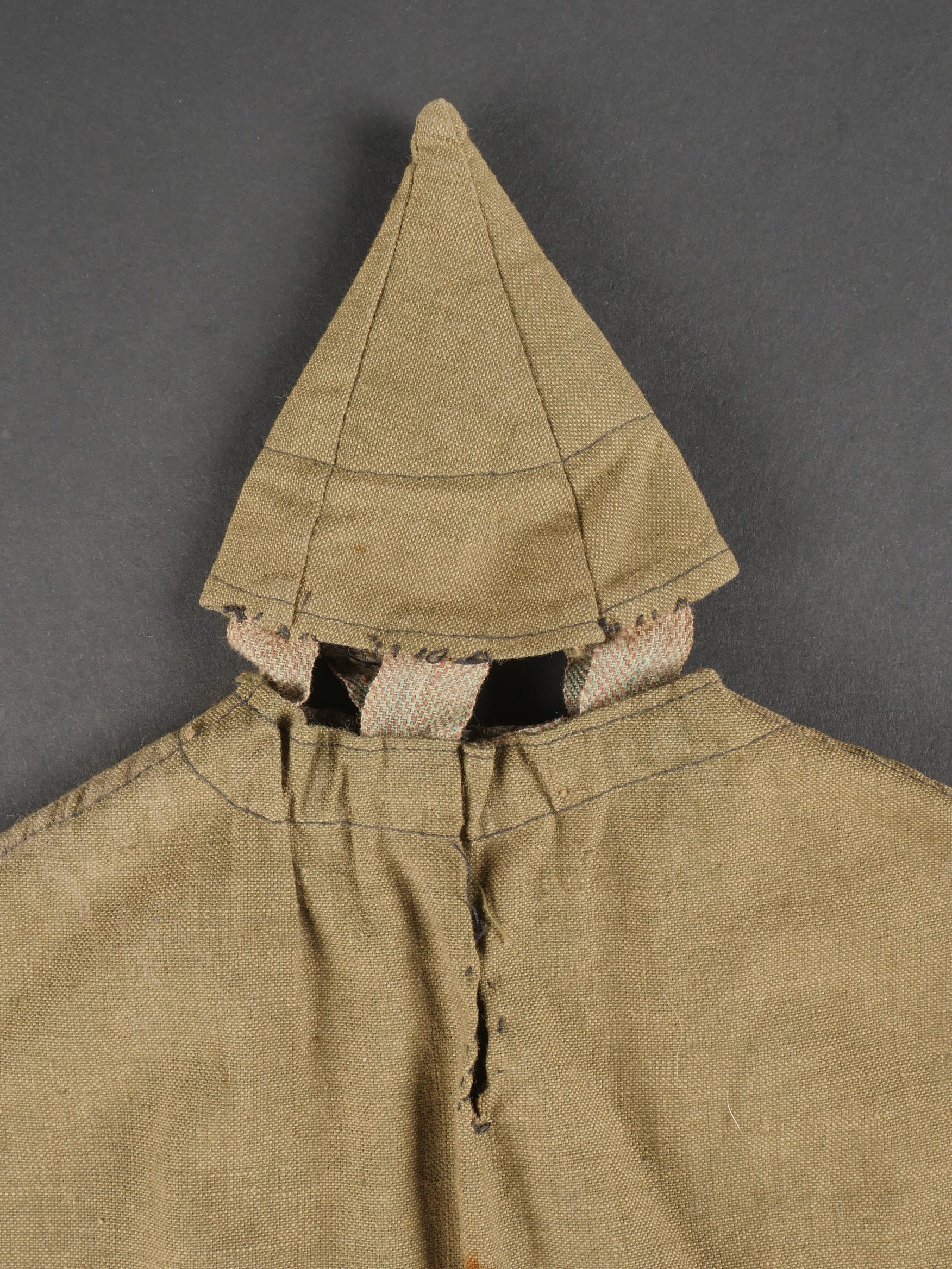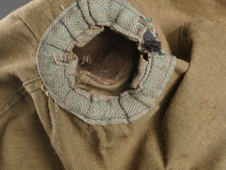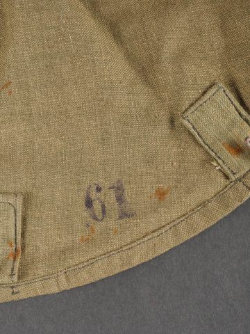 Couvre casque à pointe troupe. Pickelhaube Uberzug en toile feldgrau, à couvre pointe fixe, maintenu par 5 rubans de tissu chiné feldgrau. Intérieur du couvre pointe renforcé d’un cone de cuir fauve. Couvre casque équipé de 3 crochets frontaux et 2 sur l’arrière. Tampon à l’encre de l’atelier de fabrication à Hanovre et tampon de taille 61. Ouverture boutonnière à l’emplacement de l’aérateur. Deux trous percés artisanalement pour passage de la jugulaire. Quelques taches mineures sinon très bel état. Enlisted Man’s Pickelhaube Cover Field-grey canvas Pickelhaube Überzug with fixed spike cover, secured by five woven straps. Interior reinforced at the spike by a tan leather cone. Fitted with three front hooks and two rear. Ink stamp from the Hanover workshop and size marking “61.” Buttonhole opening for the vent stud. Two small hand-punched holes for chinstrap passage. Minor stains, otherwise very fine condition.