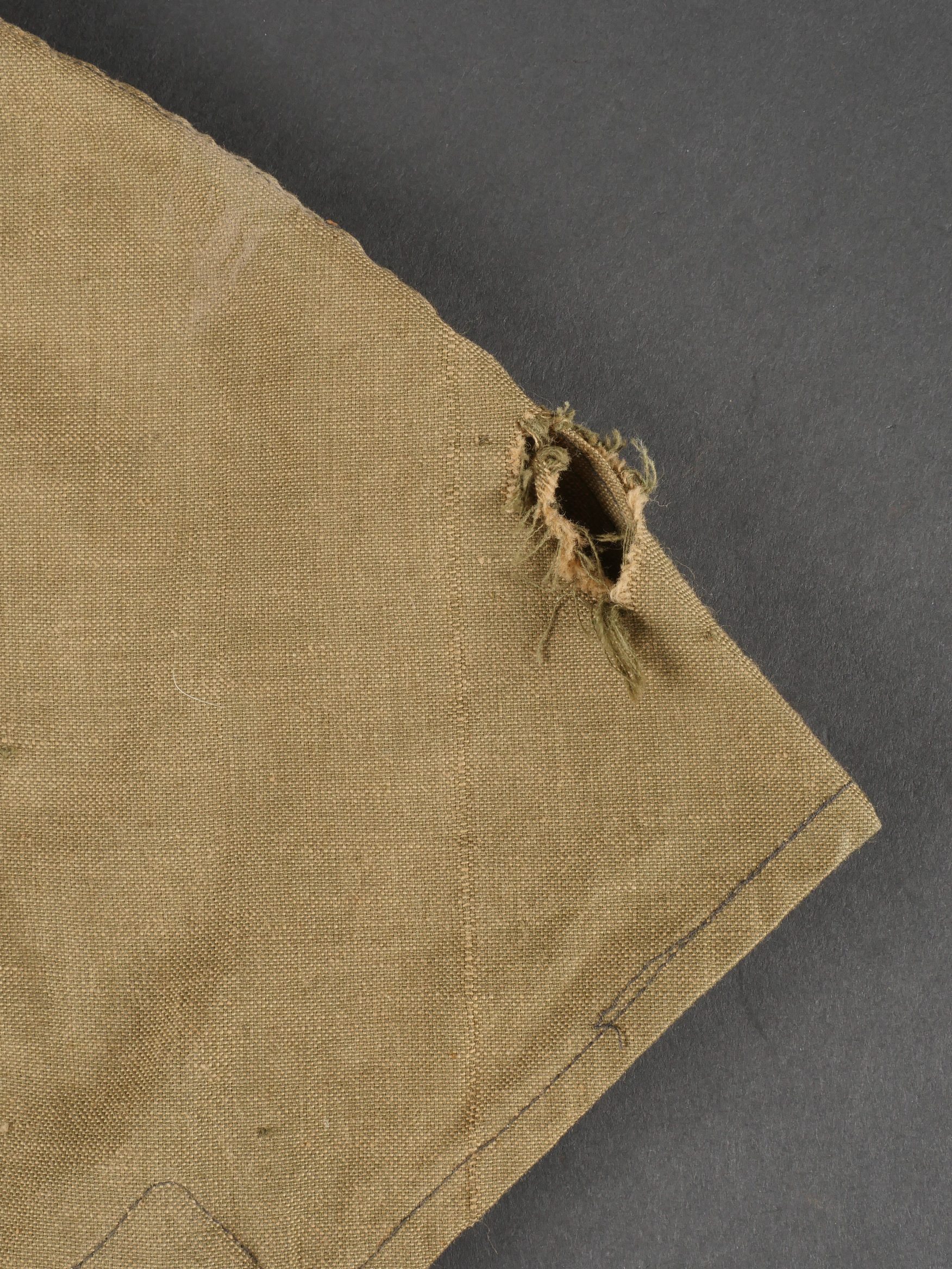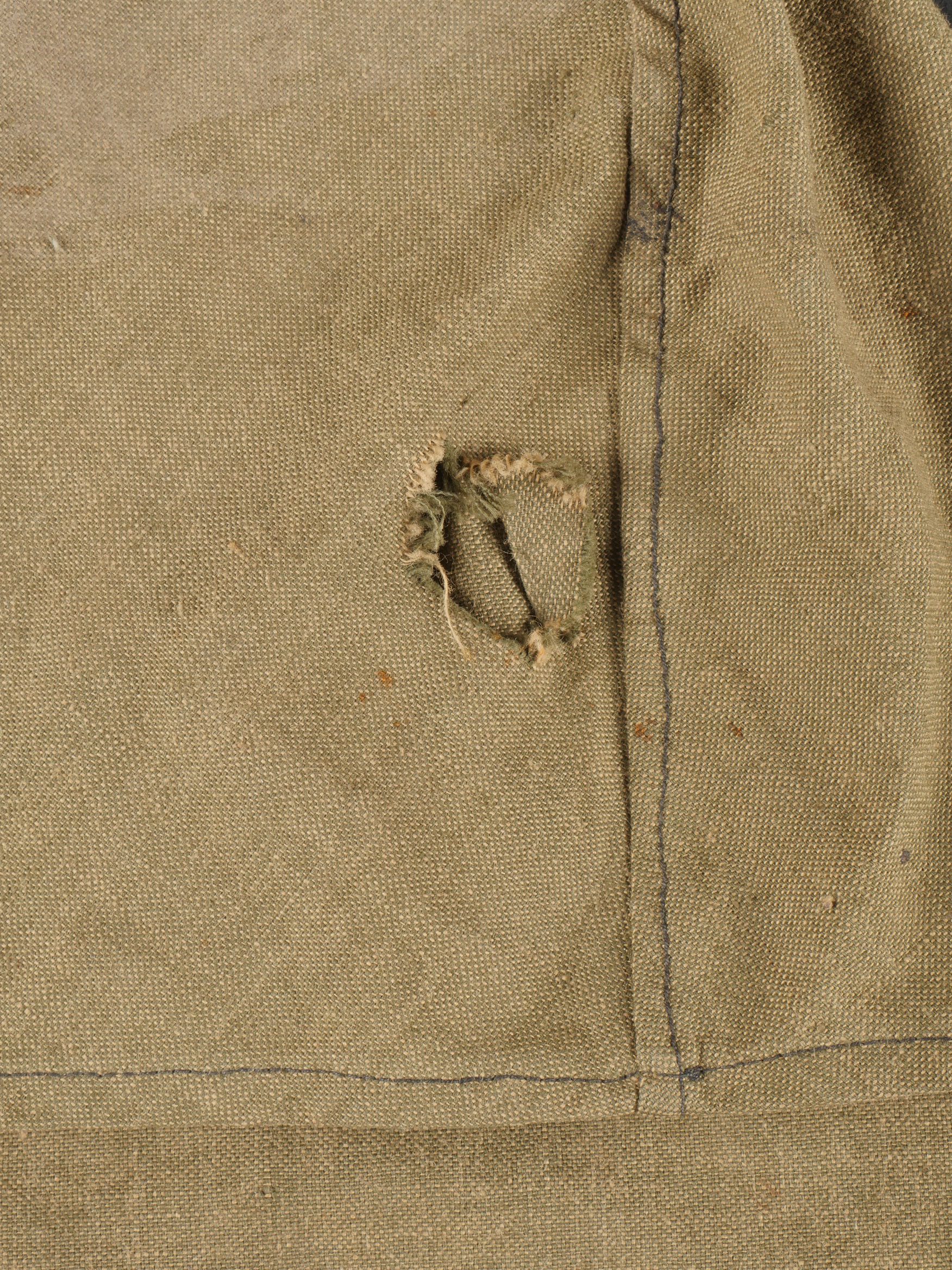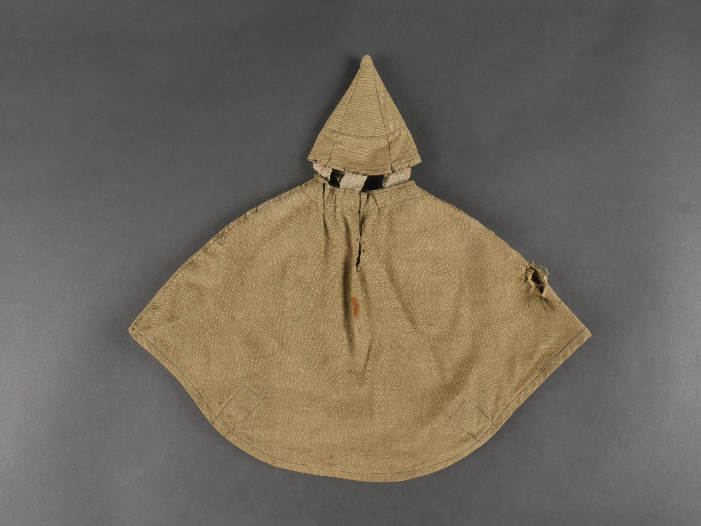 Couvre casque à pointe troupe. Pickelhaube Uberzug en toile feldgrau, à couvre pointe fixe, maintenu par 5 rubans de tissu chiné feldgrau. Intérieur du couvre pointe renforcé d’un cone de cuir fauve. Couvre casque équipé de 3 crochets frontaux et 2 sur l’arrière. Tampon à l’encre de l’atelier de fabrication à Hanovre et tampon de taille 61. Ouverture boutonnière à l’emplacement de l’aérateur. Deux trous percés artisanalement pour passage de la jugulaire. Quelques taches mineures sinon très bel état. Enlisted Man’s Pickelhaube Cover Field-grey canvas Pickelhaube Überzug with fixed spike cover, secured by five woven straps. Interior reinforced at the spike by a tan leather cone. Fitted with three front hooks and two rear. Ink stamp from the Hanover workshop and size marking “61.” Buttonhole opening for the vent stud. Two small hand-punched holes for chinstrap passage. Minor stains, otherwise very fine condition.