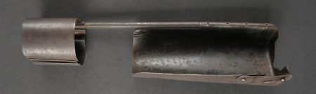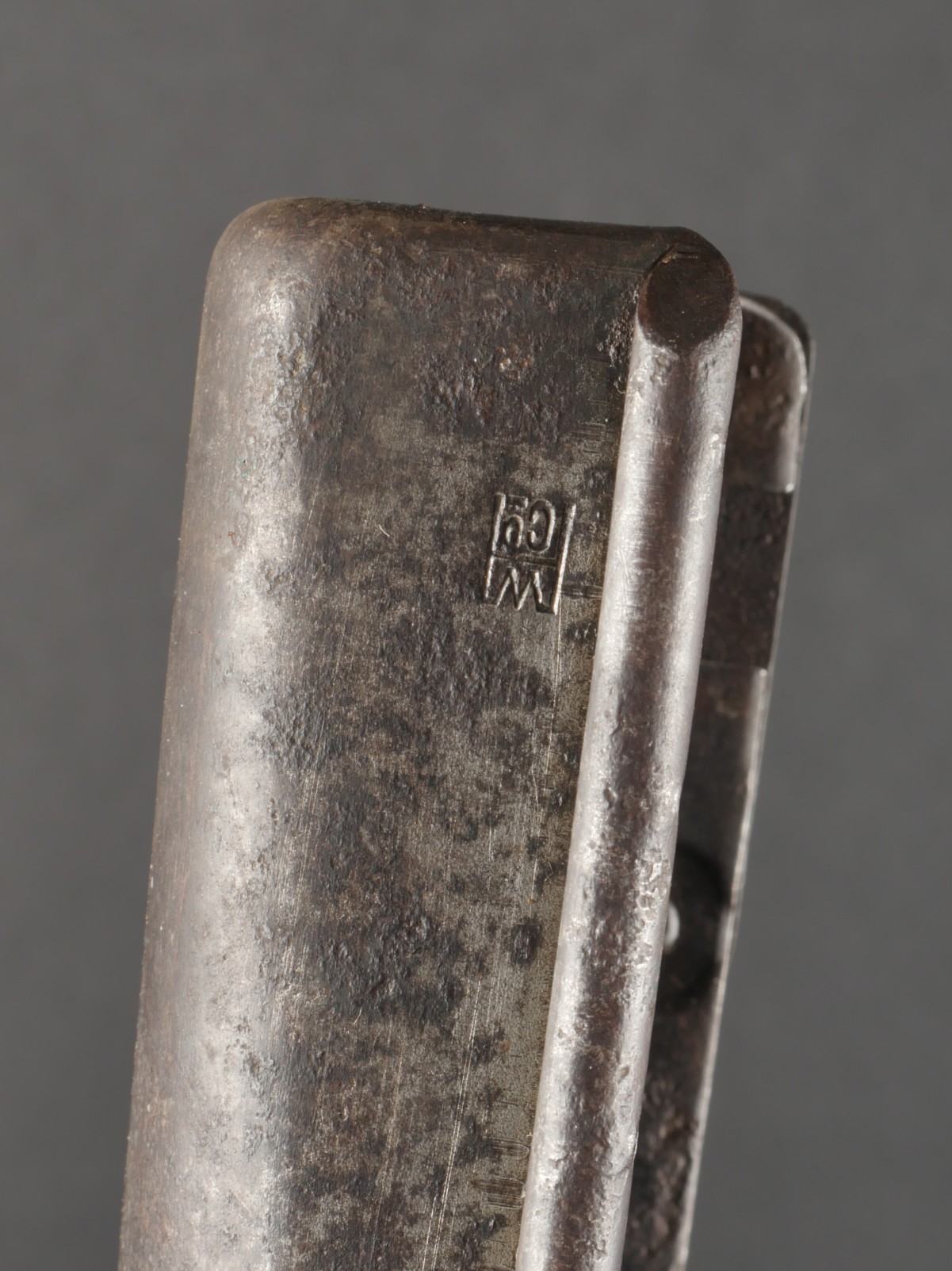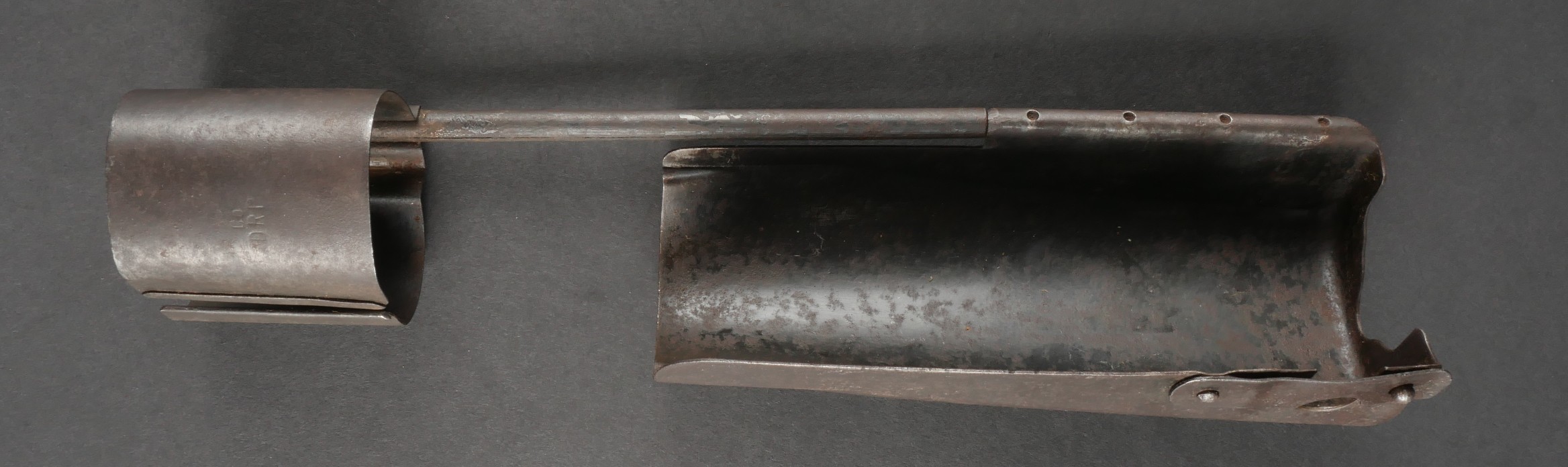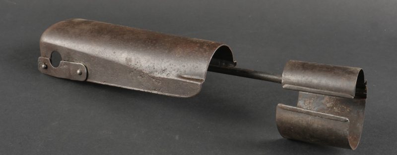 Couvre culasse de Gewehr 98. Dispositif de protection de la culasse du fusil allemand Gewehr M1898. Appelé Staubschutzdeckel, en tôle, marqué W Co DRP sur la partie avant, et W Co sur la partie arrière. Fonctionnel. Usure d’usage et patine. Bolt Cover for Gewehr 98 Protective cover for the bolt of the German Gewehr M1898 rifle, known as Staubschutzdeckel. Made of sheet metal, marked “W Co DRP” on the front and “W Co” on the rear. Functional. Signs of use and patina.