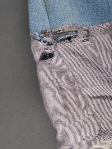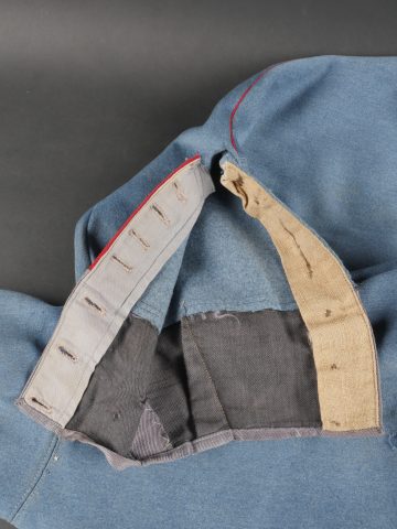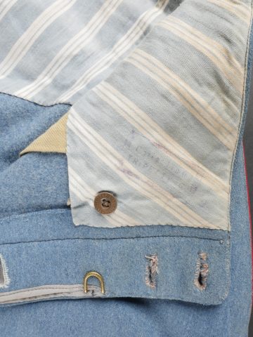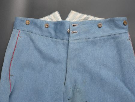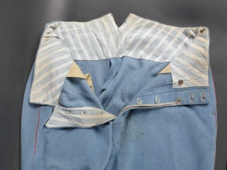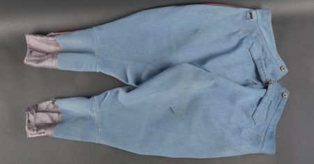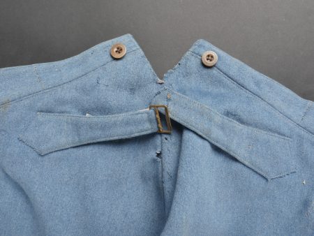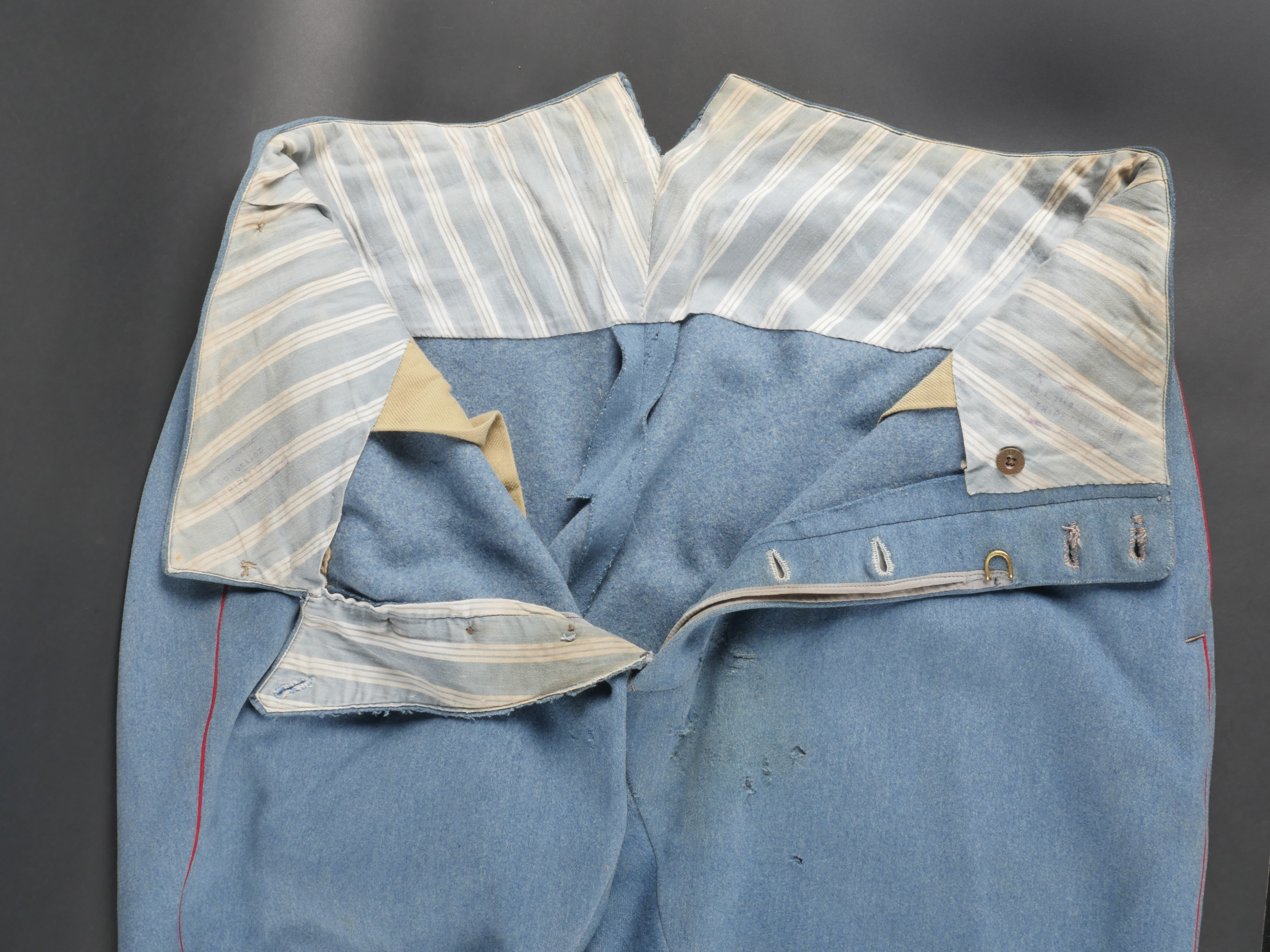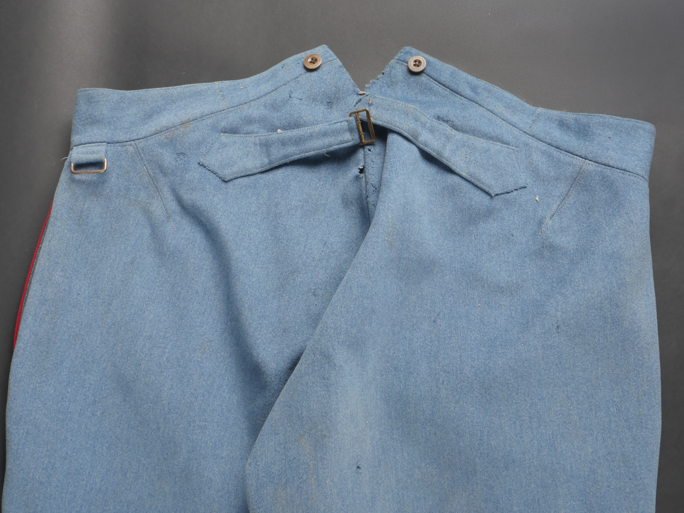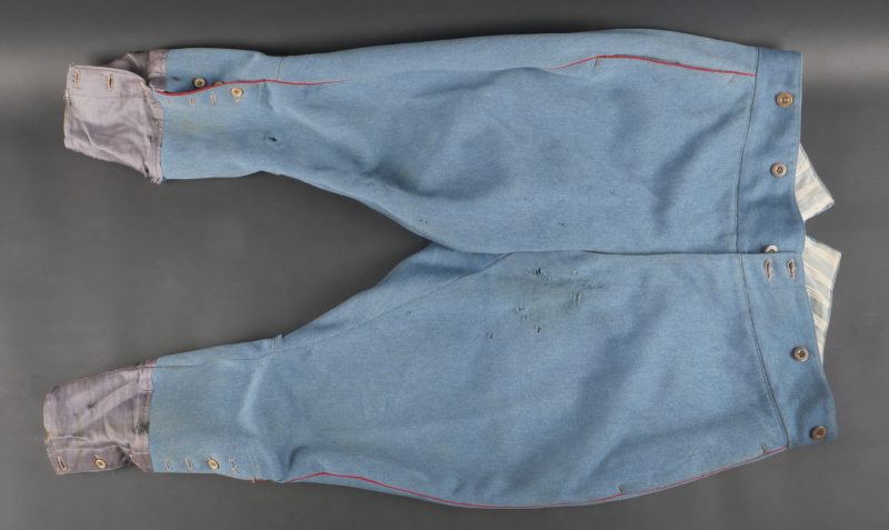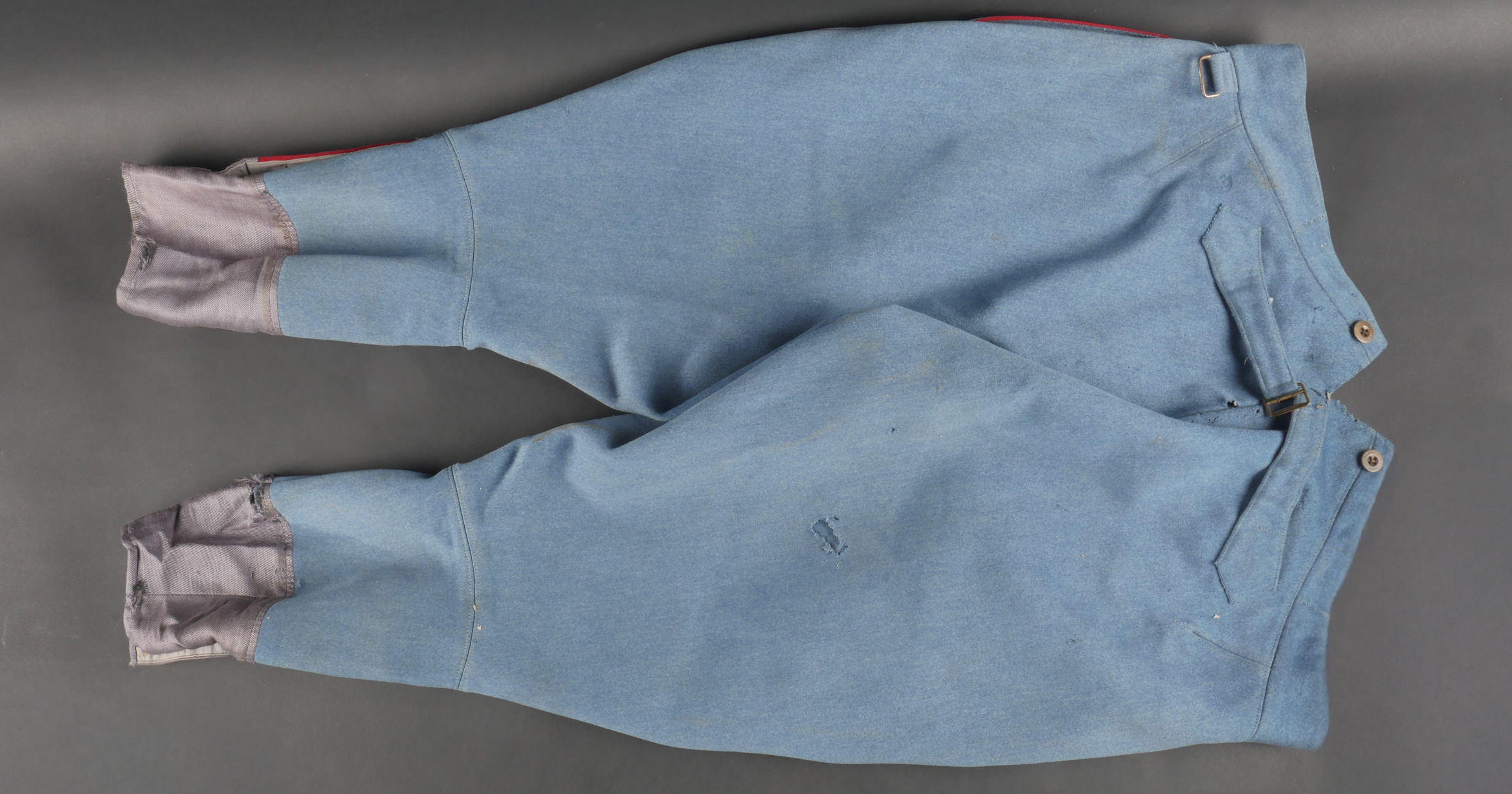 Culotte d’officier d’artillerie français bleu horizon. En drap bleu horizon de qualité, passepoil écarlate le long des jambes. Manchettes de bas de jambes en satinette. Martingale au dos. Doublure en tissu rayé, 2 tampons à l’encre Collection Tripette G.. Trous de mites et accrocs, notamment à l’entre-jambes, quelques réparations. Usure aux bas de jambes. French Officer’s Horizon-Blue Artillery Breeches High-quality horizon-blue wool with scarlet piping along the seams, satinette cuffs, back belt. Striped fabric lining with two ink stamps “Collection Tripette G.” Moth holes and wear, especially at crotch, some repairs. Wear at lower legs.