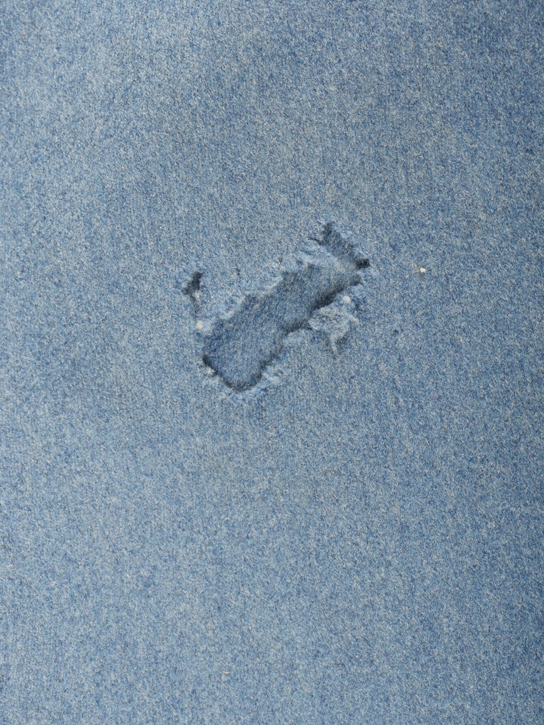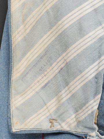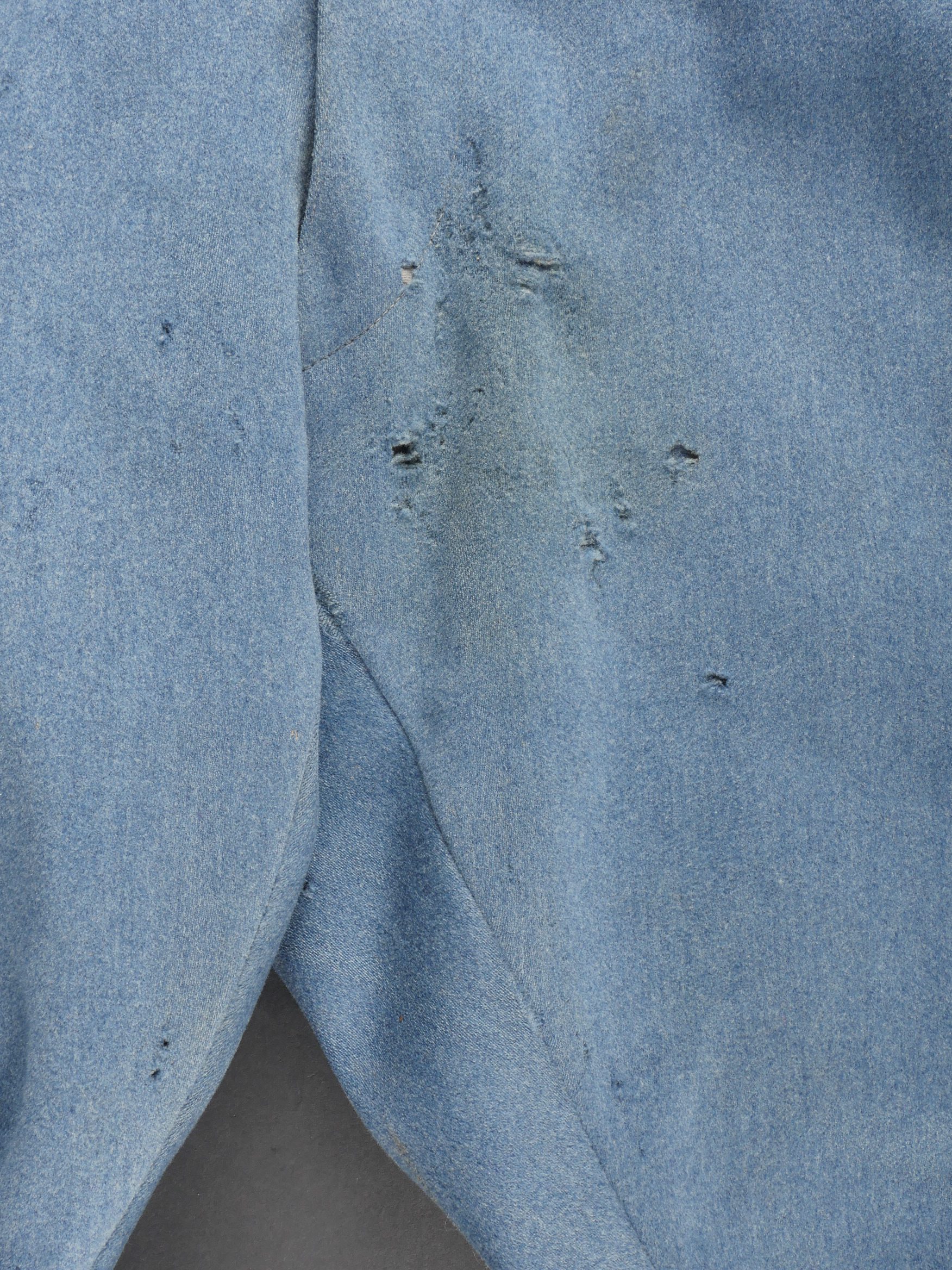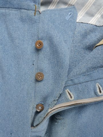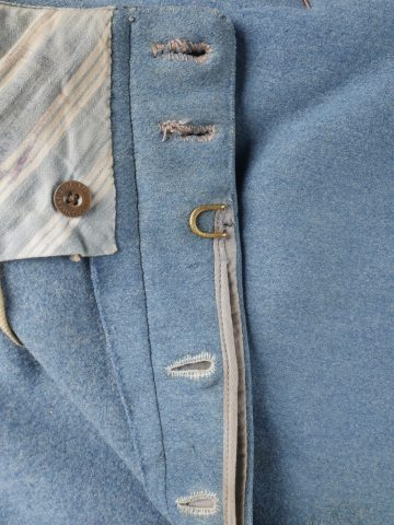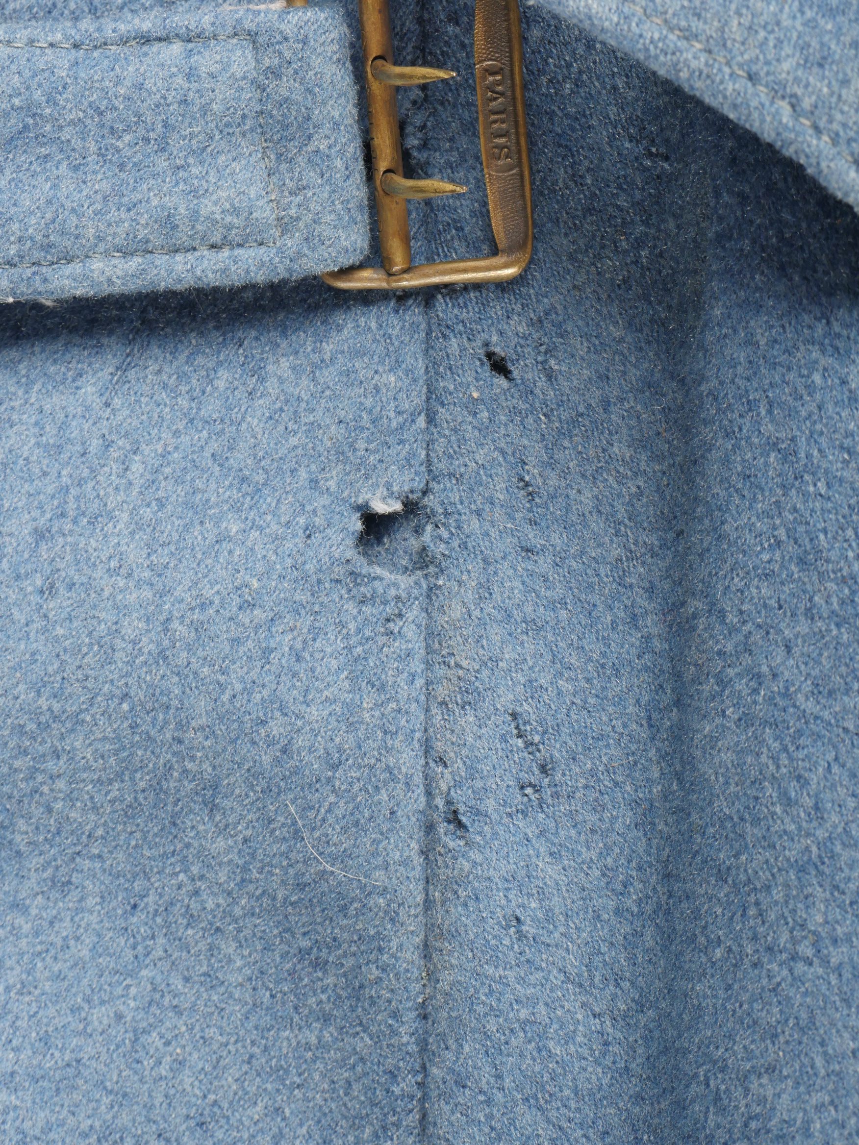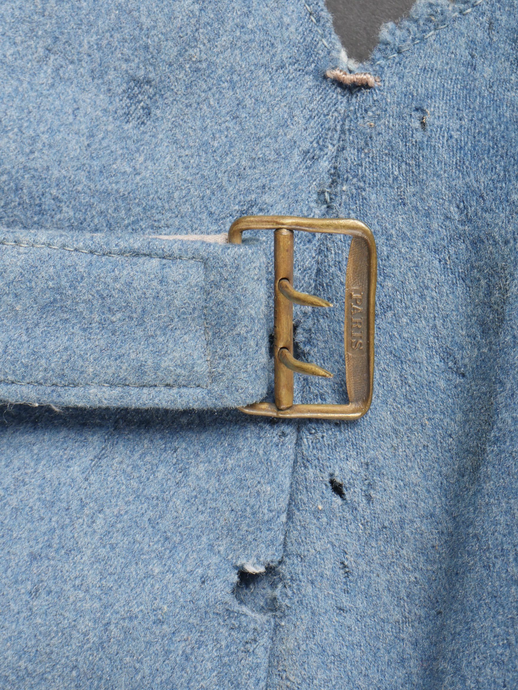 Culotte d’officier d’artillerie français bleu horizon. En drap bleu horizon de qualité, passepoil écarlate le long des jambes. Manchettes de bas de jambes en satinette. Martingale au dos. Doublure en tissu rayé, 2 tampons à l’encre Collection Tripette G.. Trous de mites et accrocs, notamment à l’entre-jambes, quelques réparations. Usure aux bas de jambes. French Officer’s Horizon-Blue Artillery Breeches High-quality horizon-blue wool with scarlet piping along the seams, satinette cuffs, back belt. Striped fabric lining with two ink stamps “Collection Tripette G.” Moth holes and wear, especially at crotch, some repairs. Wear at lower legs.