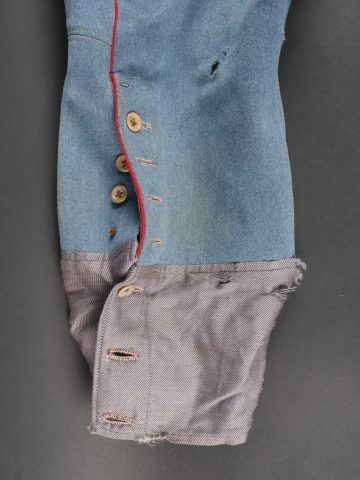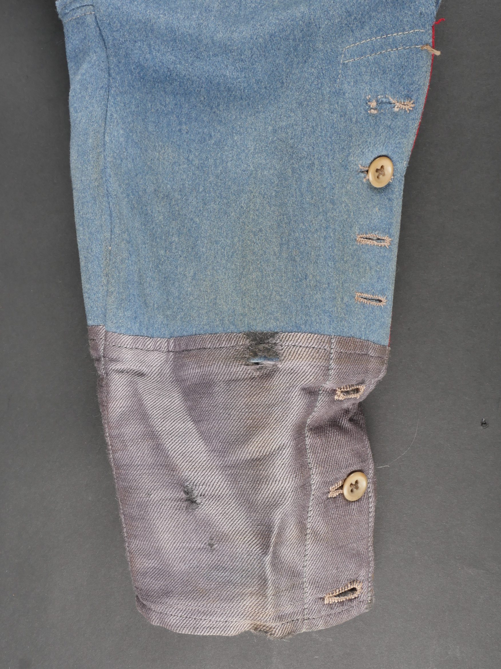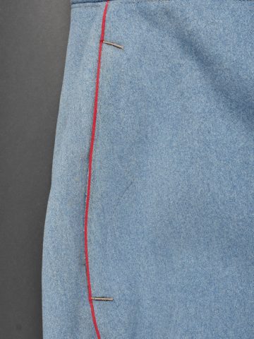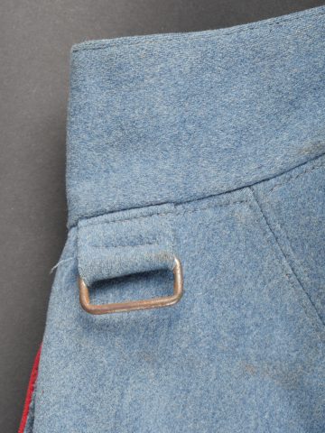 Culotte d’officier d’artillerie français bleu horizon. En drap bleu horizon de qualité, passepoil écarlate le long des jambes. Manchettes de bas de jambes en satinette. Martingale... en savoir plus