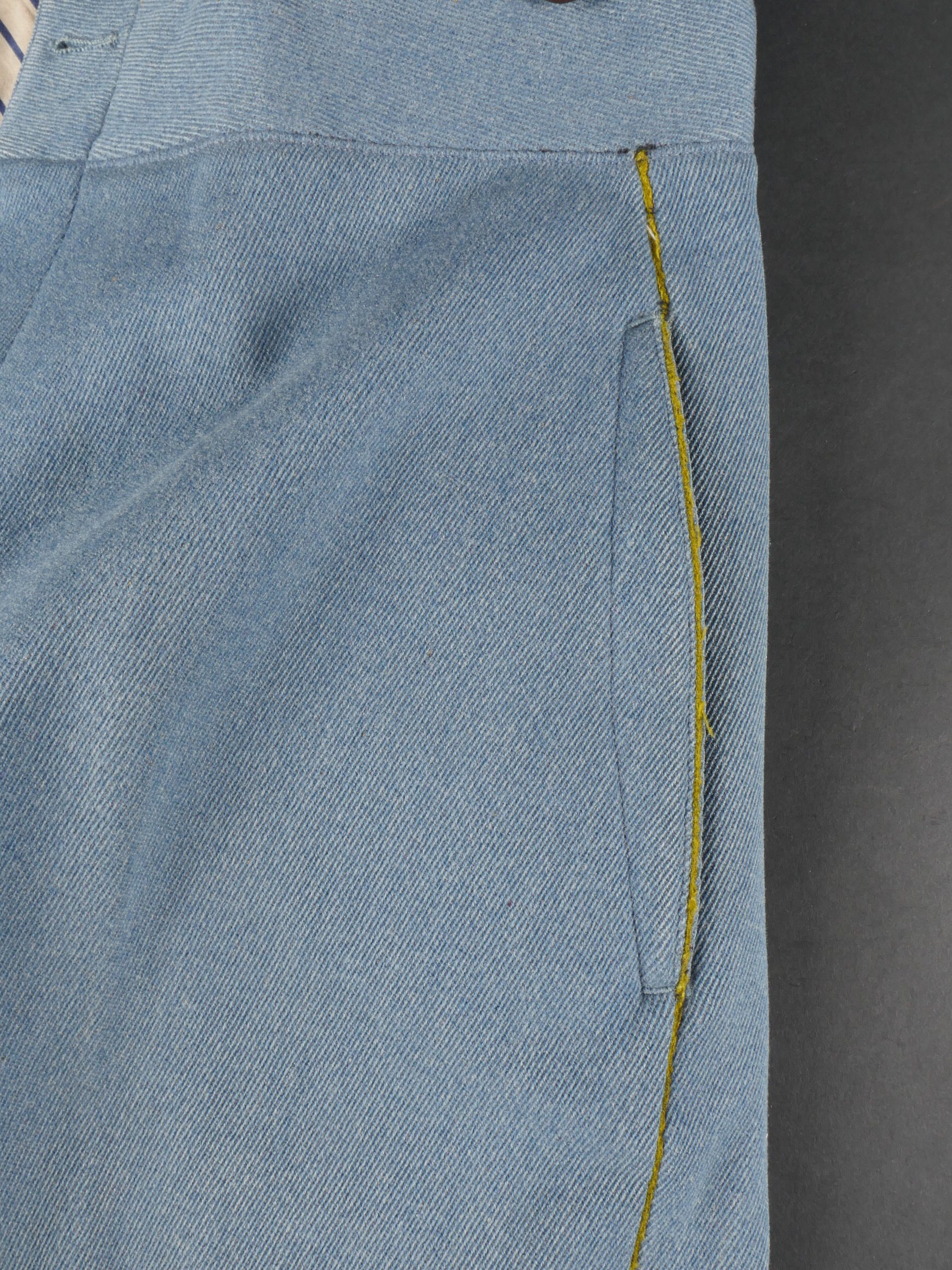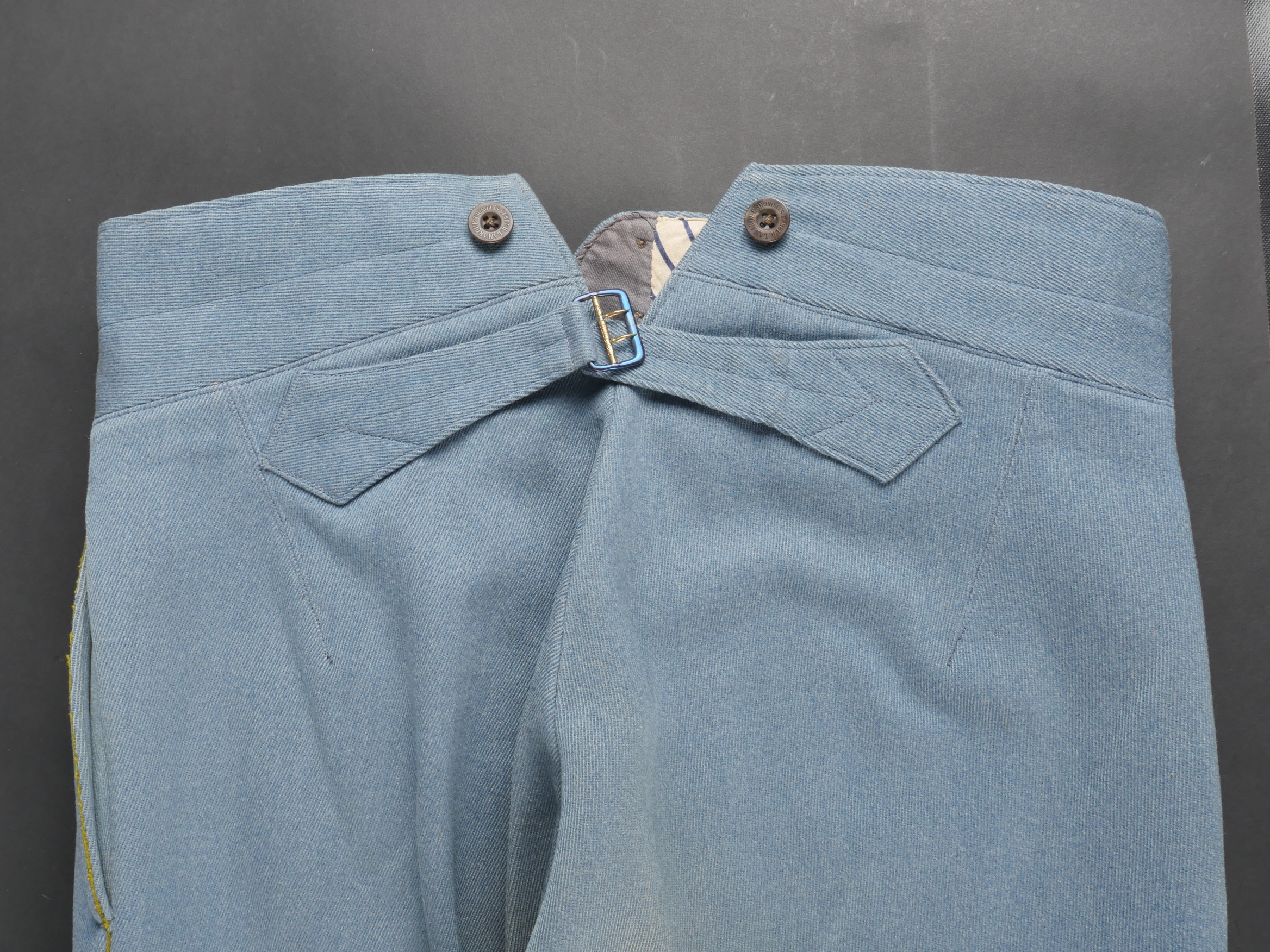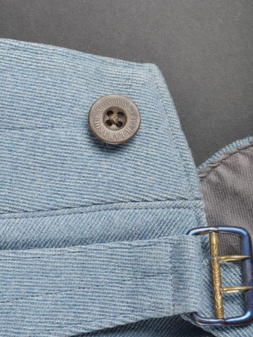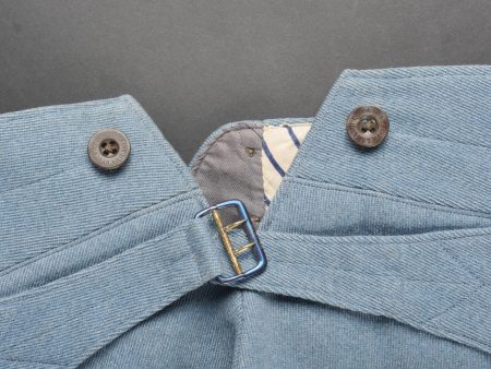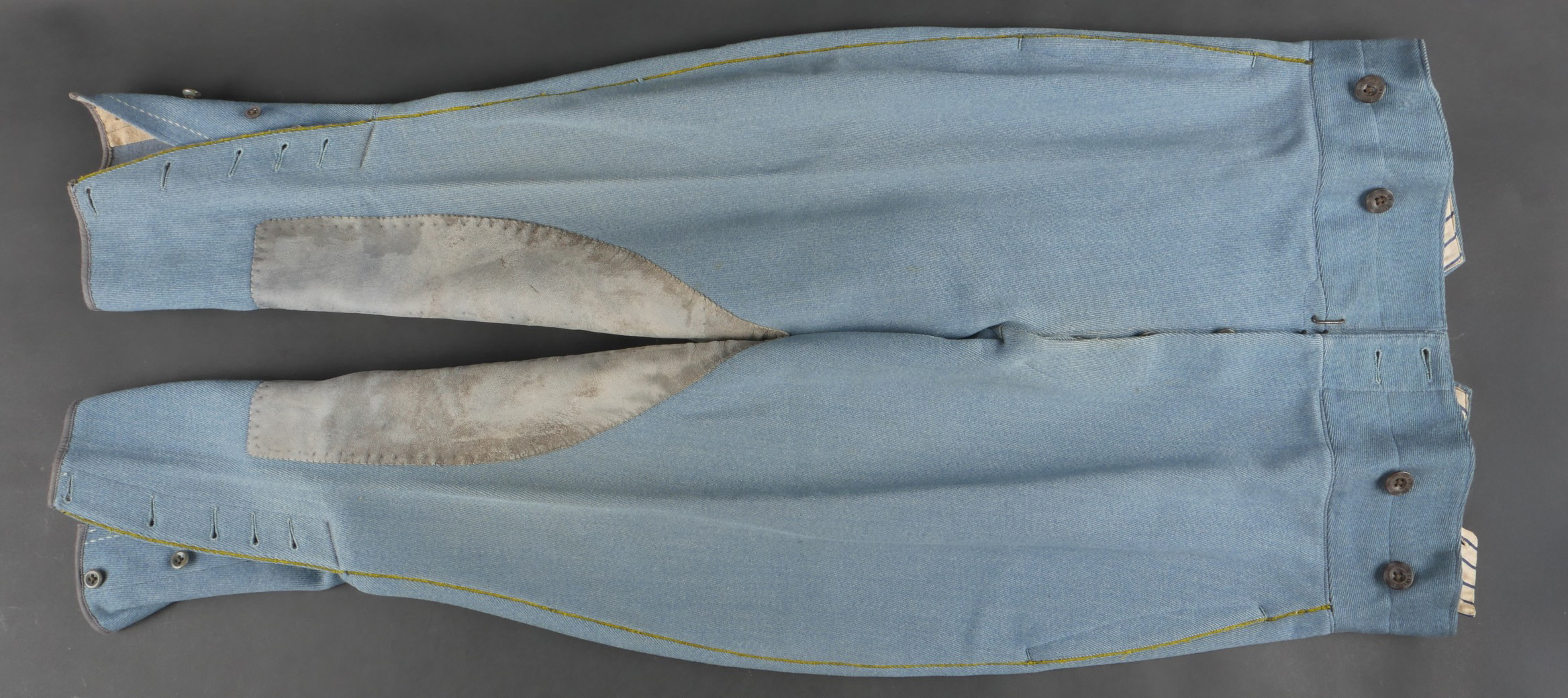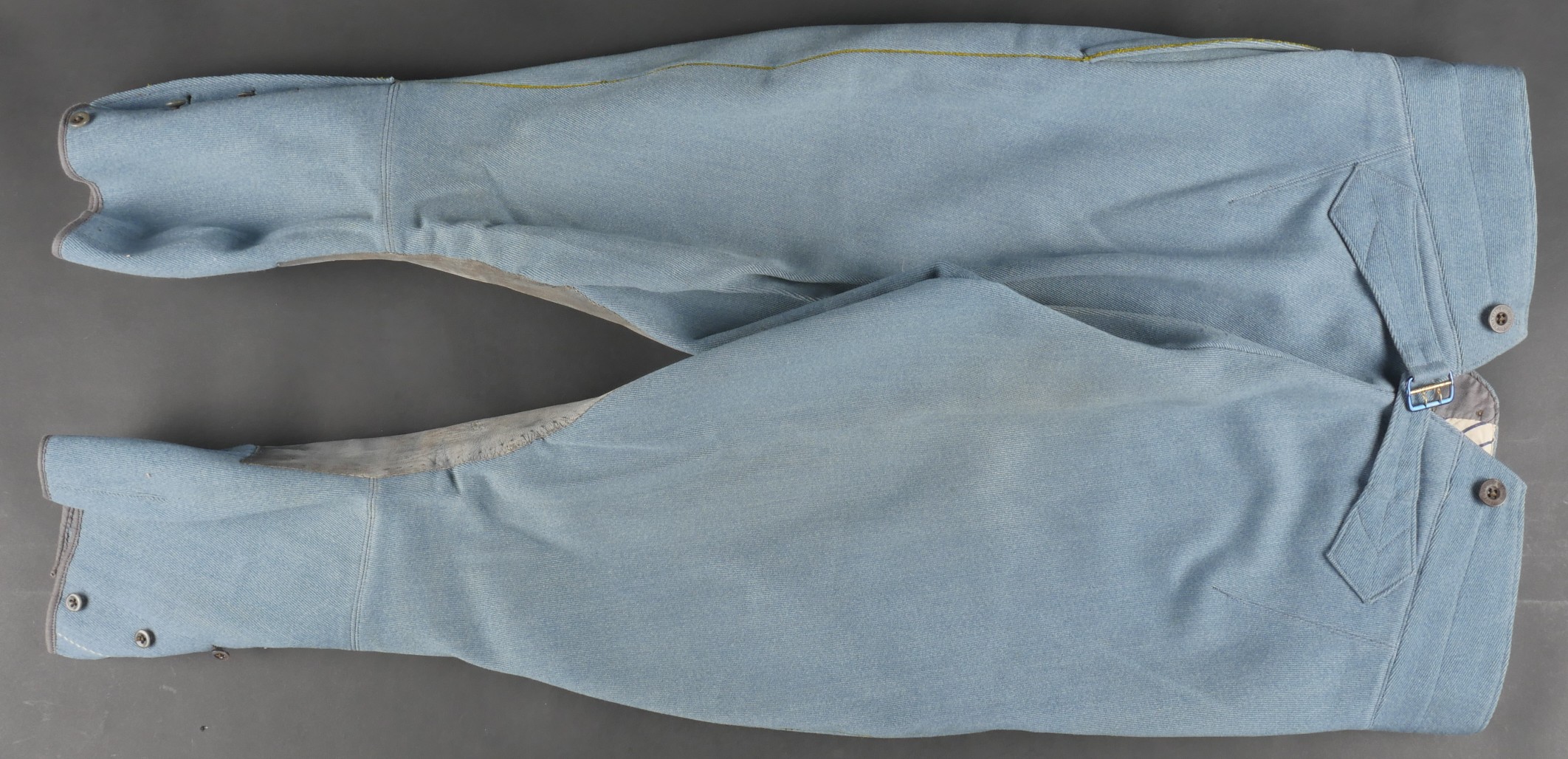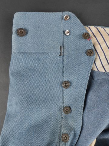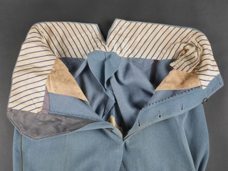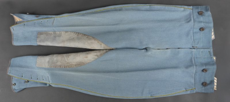 Culotte d’officier d’infanterie français bleu horizon. En tissu bleu horizon à passepoil jonquille le long des jambes. Renforts en basane de cuir, bas de jambes fermant par 5 boutons, tous présents. Doublure en tissu rayé. Martingale au dos. Bon état. French Officer’s Horizon-Blue Breeches Horizon-blue cloth with jonquil piping along the outer seams, leather knee reinforcements, five buttons at lower legs, all present. Striped cloth lining. Back belt present. Good condition.