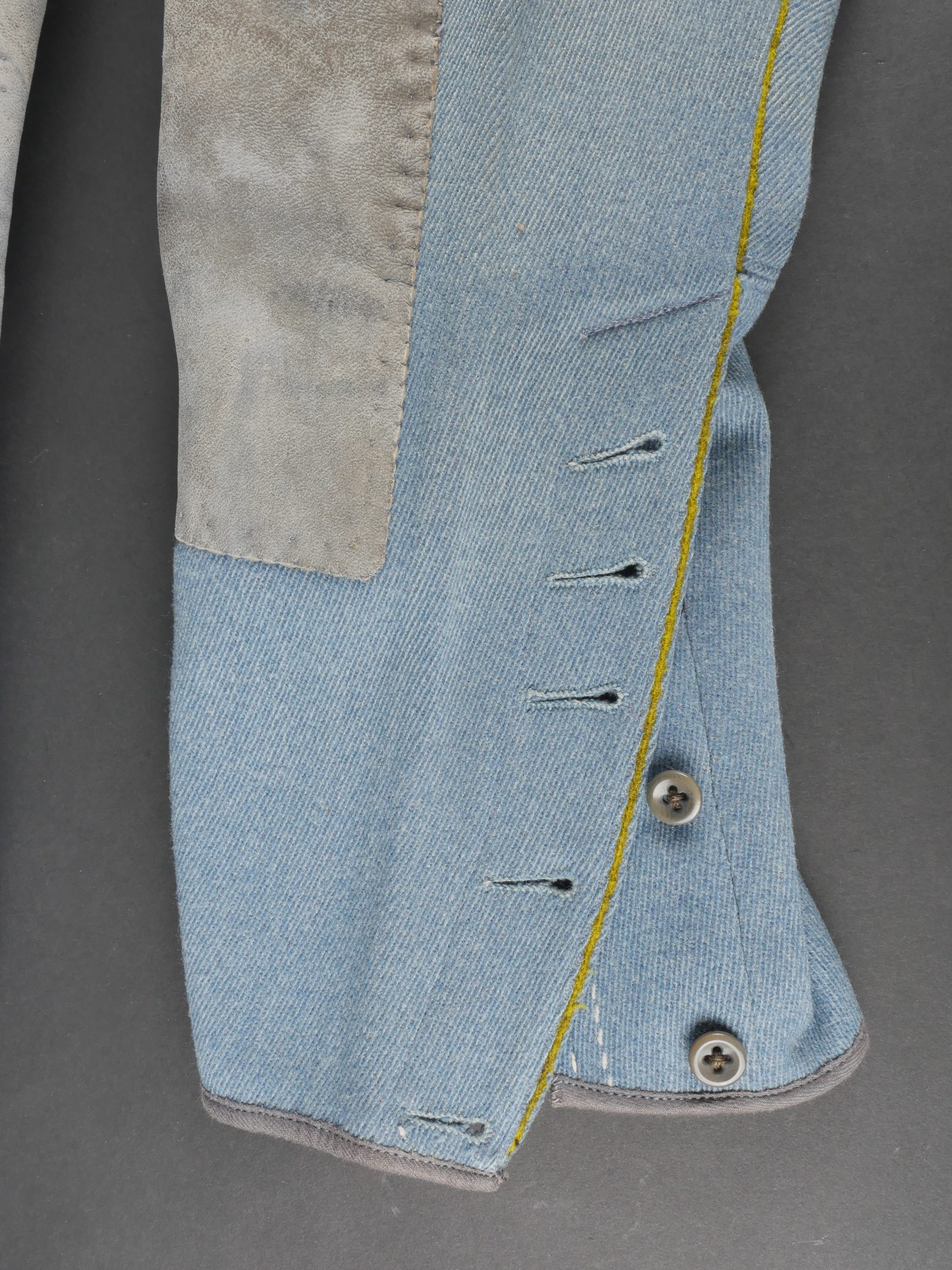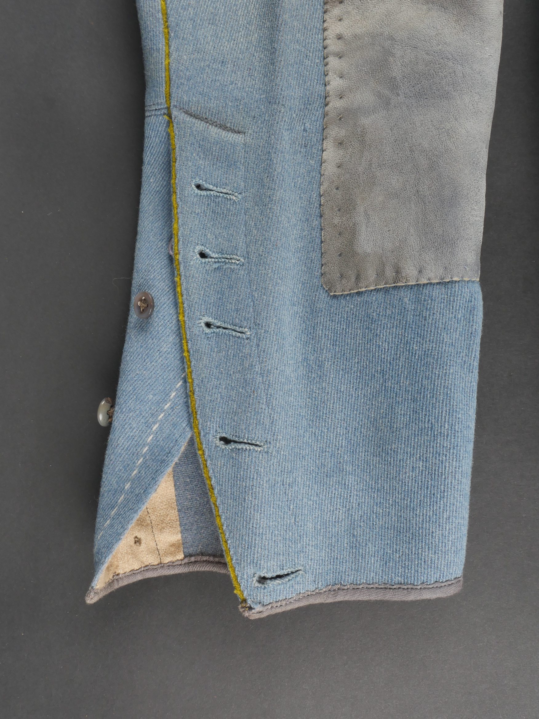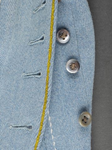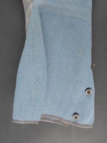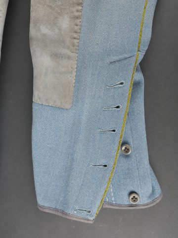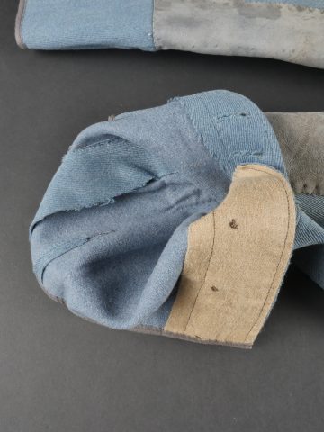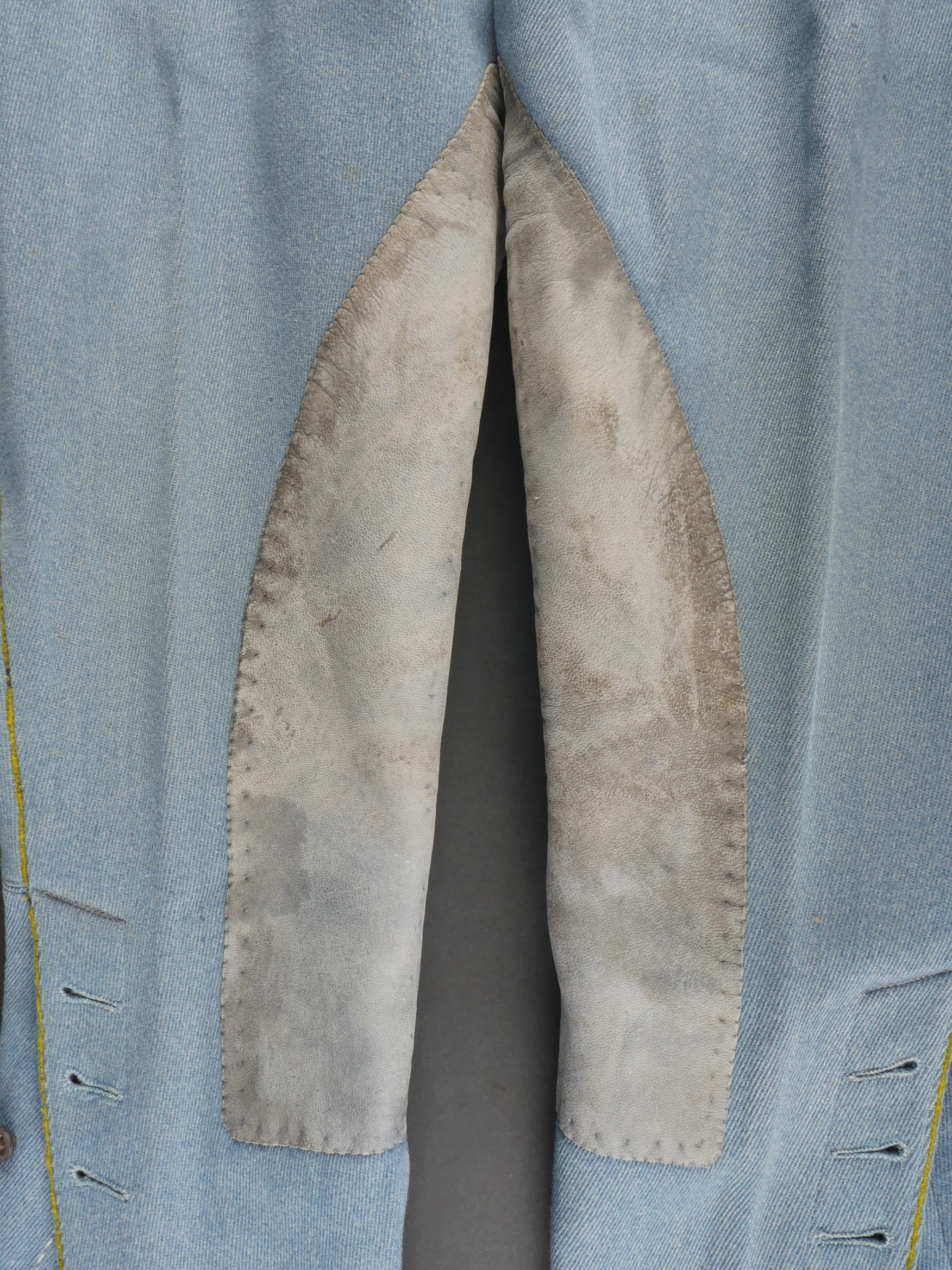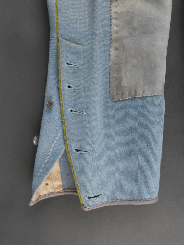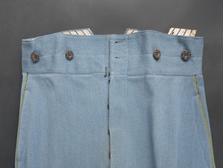 Culotte d’officier d’infanterie français bleu horizon. En tissu bleu horizon à passepoil jonquille le long des jambes. Renforts en basane de cuir, bas de jambes fermant par 5 boutons, tous présents. Doublure en tissu rayé. Martingale au dos. Bon état. French Officer’s Horizon-Blue Breeches Horizon-blue cloth with jonquil piping along the outer seams, leather knee reinforcements, five buttons at lower legs, all present. Striped cloth lining. Back belt present. Good condition.