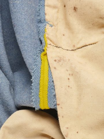 Détails de la vente >Culotte d’officier d’infanterie français bleu horizon. En tissu bleu horizon à passepoil jonquille le long des jambes. Renforts en basane de cuir, bas de jambes fermant par 5... en savoir plus