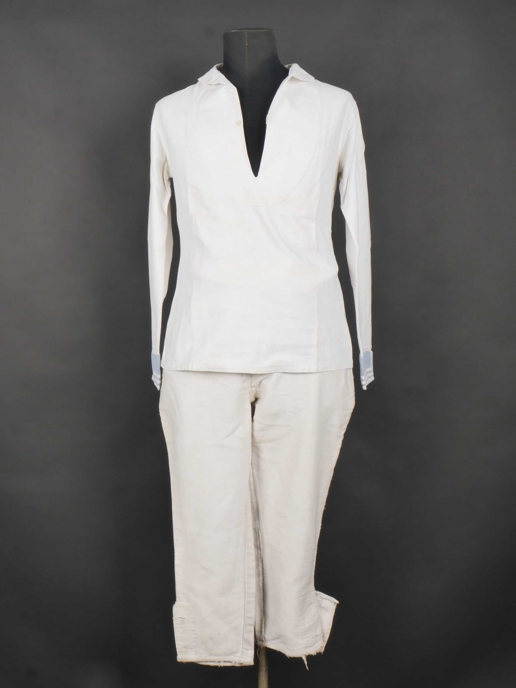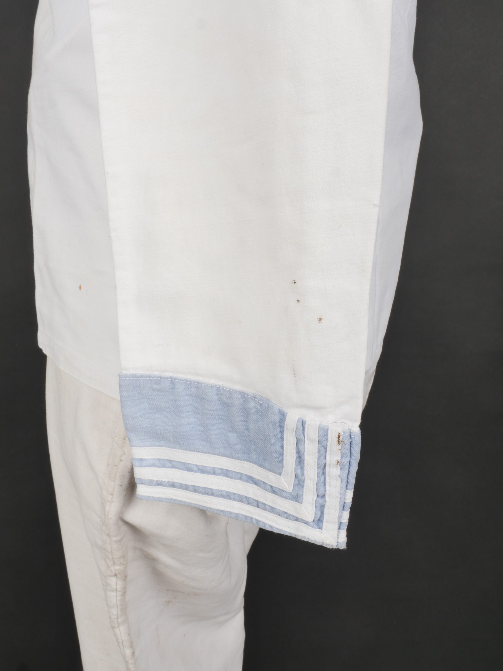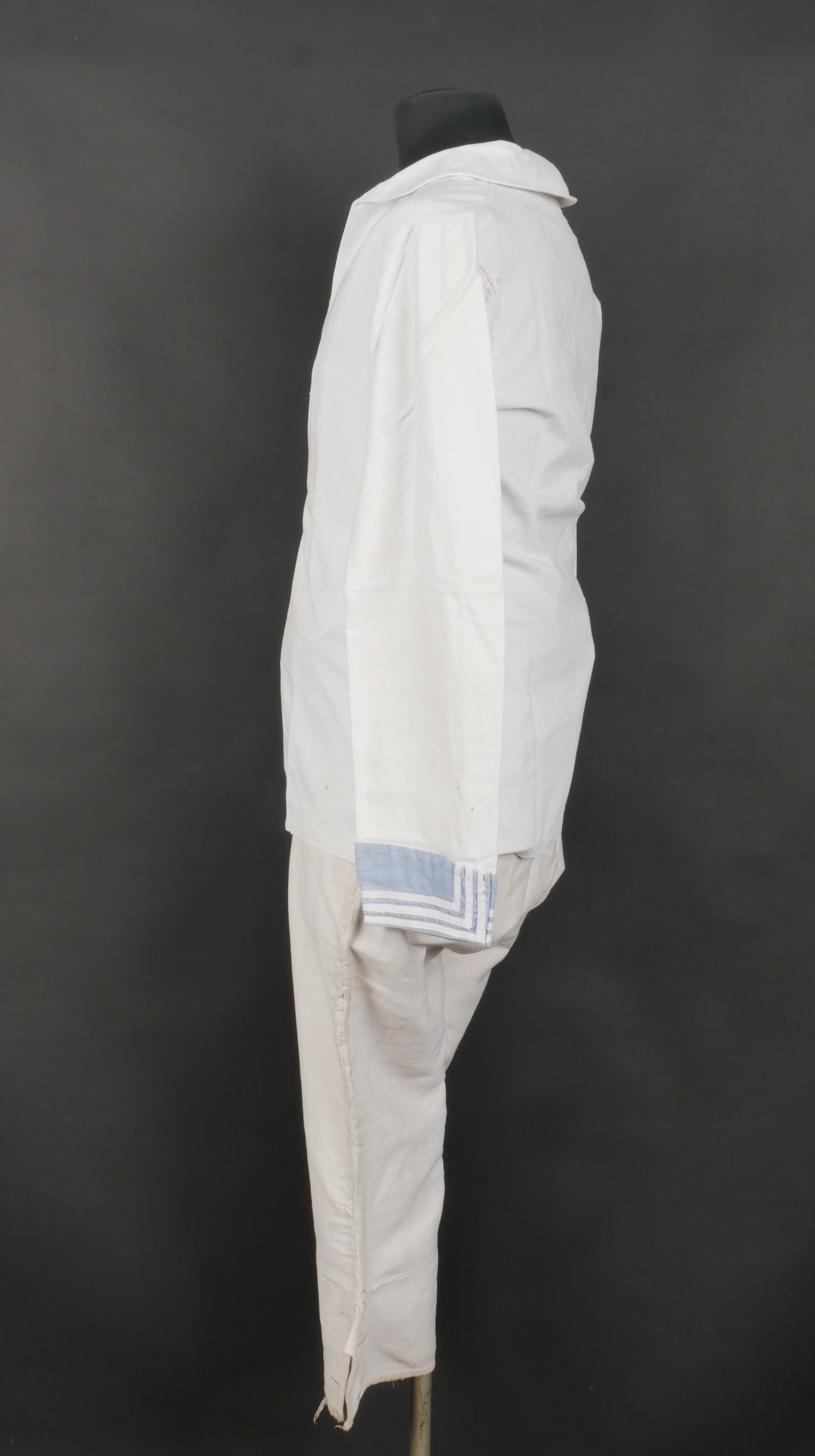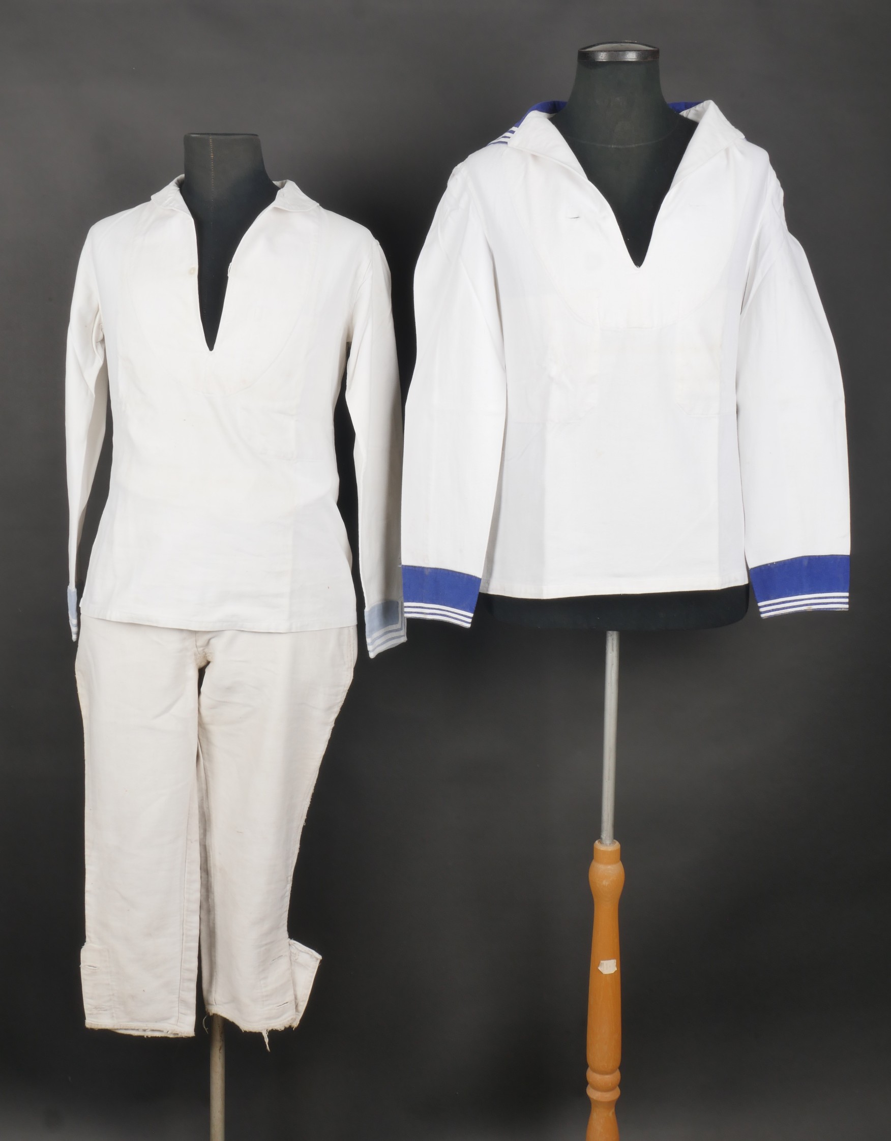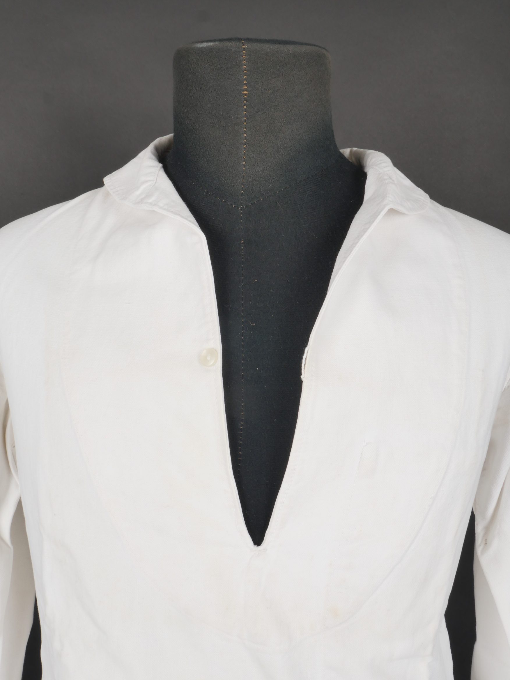 Ensemble de vêtements de marin français. Deux chemises dont une à col carré bleu fixe, une culotte en coton écru. Divers marquages à déchiffrer. Set of French Navy Clothing Two shirts, one with fixed square blue collar, and one pair of ecru cotton trousers. Various stamps to be deciphered.