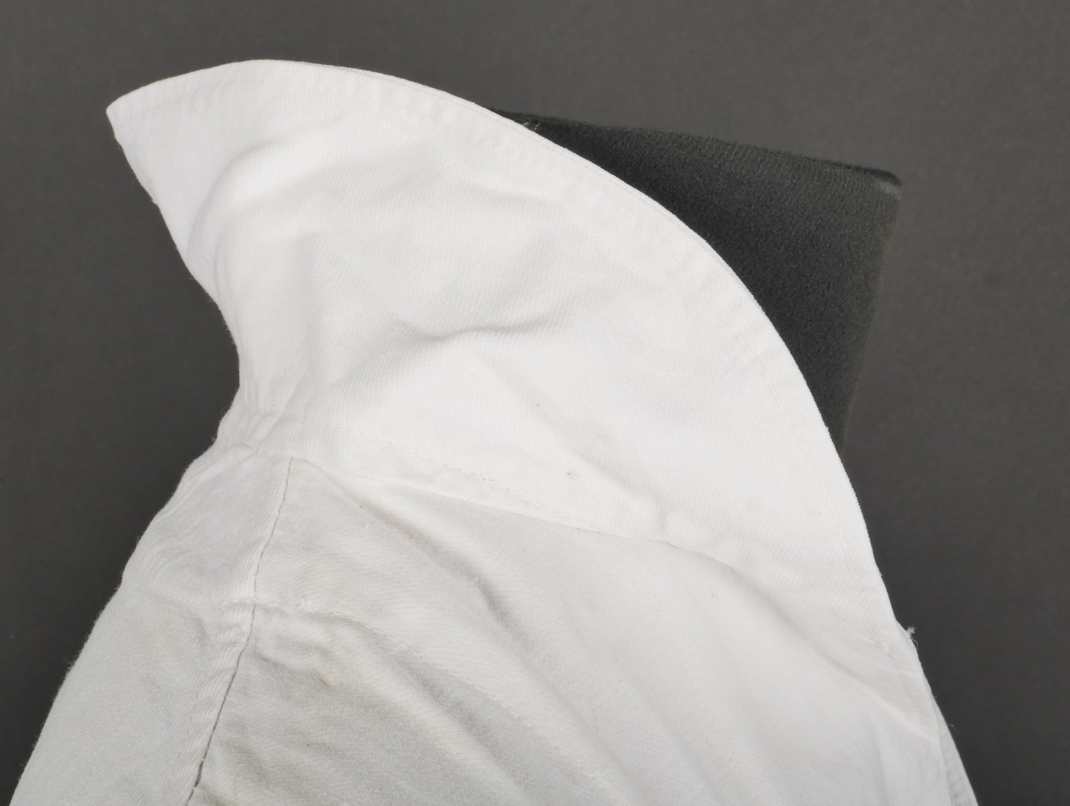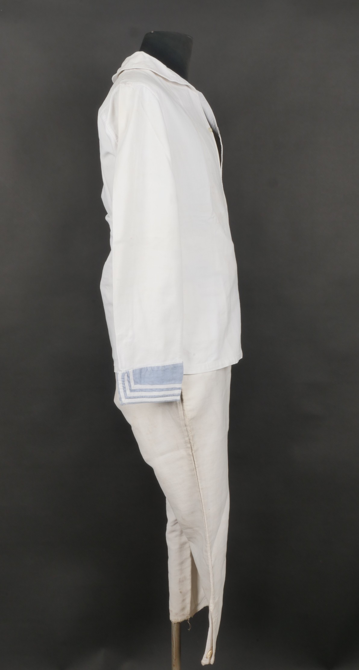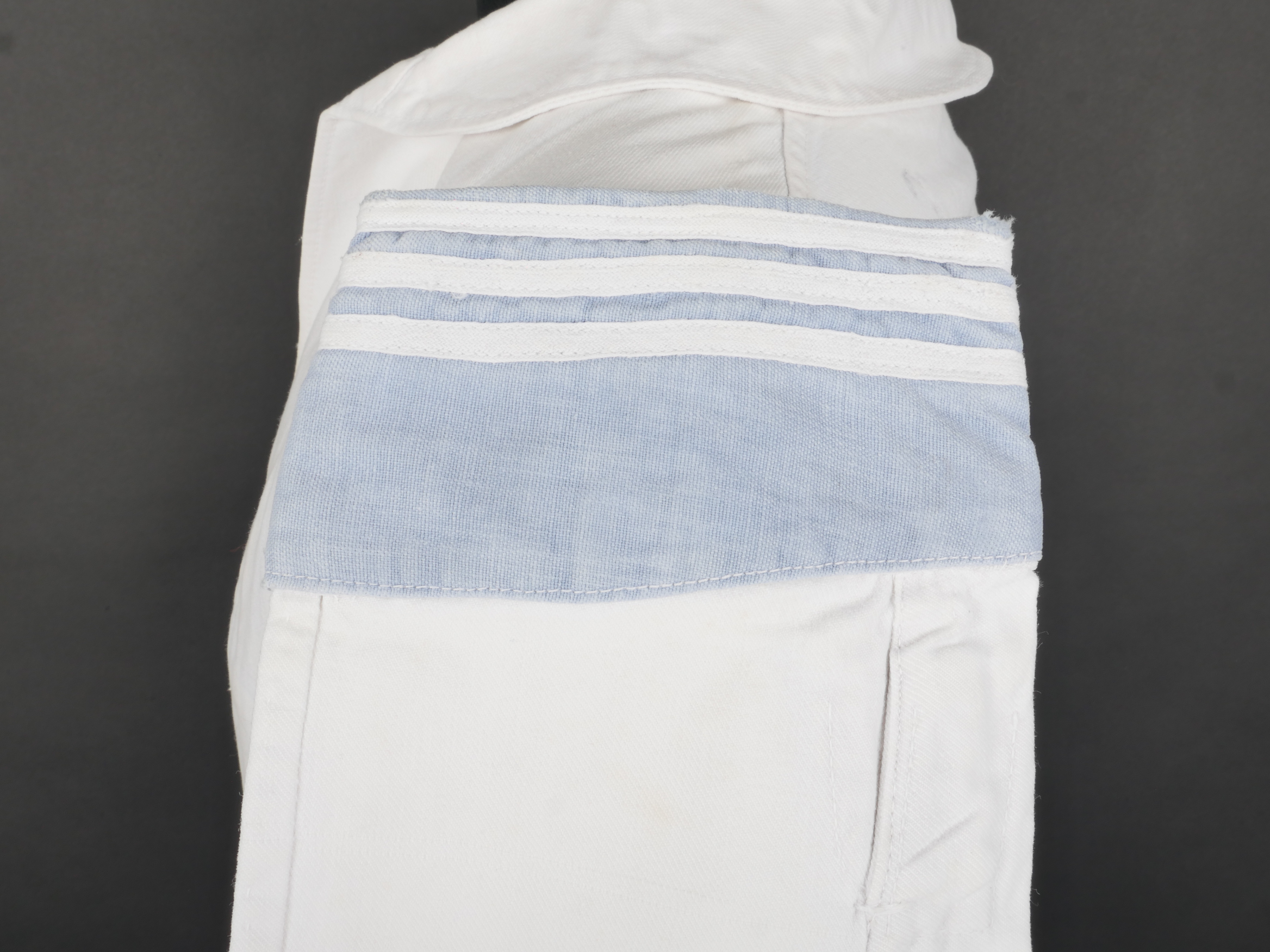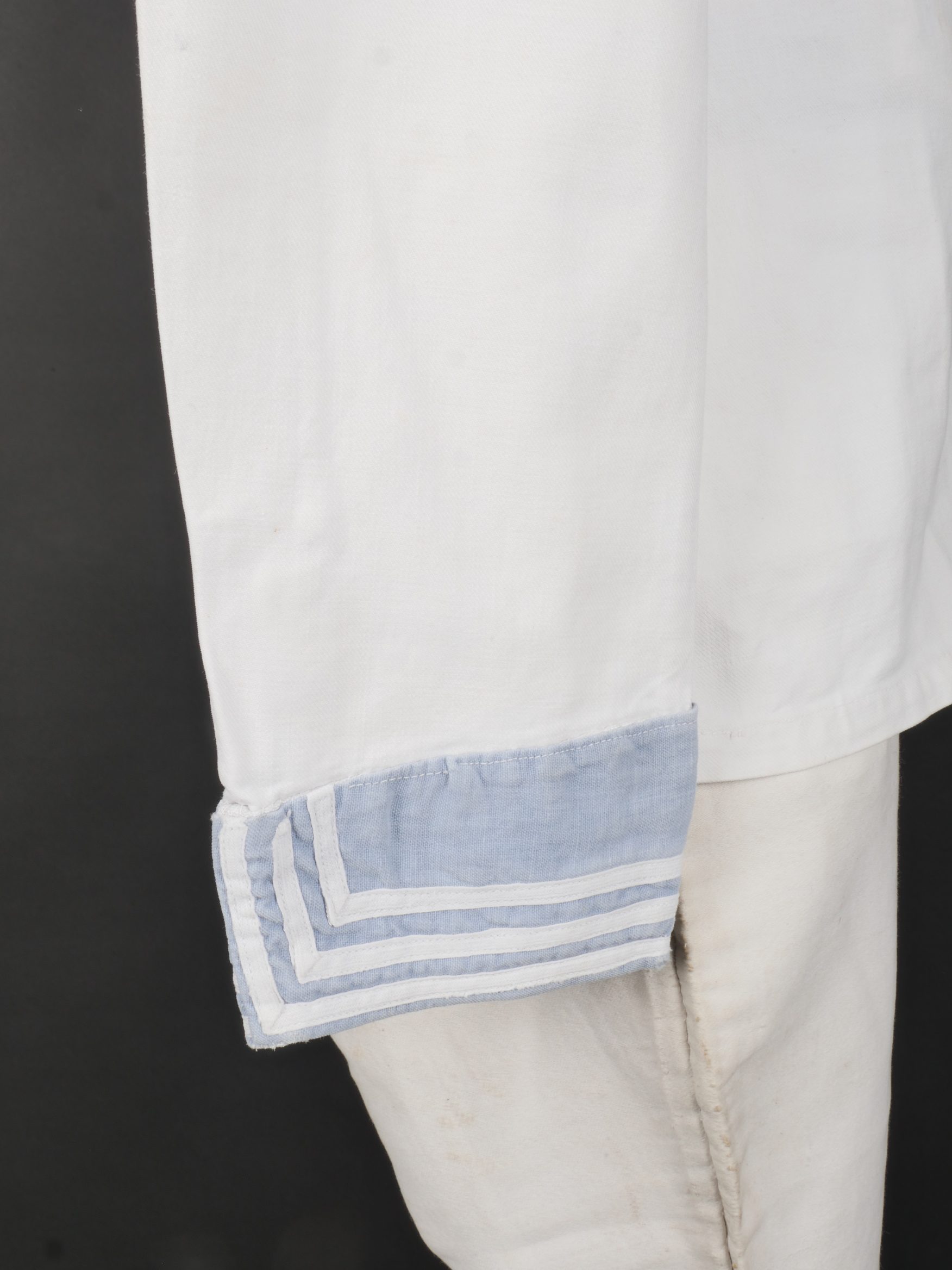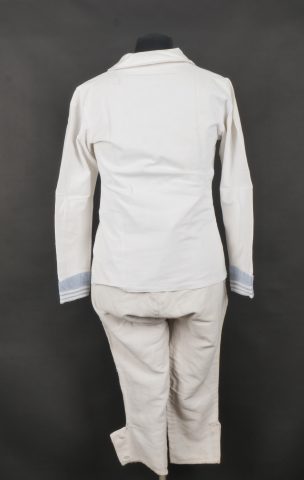 Ensemble de vêtements de marin français. Deux chemises dont une à col carré bleu fixe, une culotte en coton écru. Divers marquages à déchiffrer. Set of French Navy Clothing Two shirts, one with fixed square blue collar, and one pair of ecru cotton trousers. Various stamps to be deciphered.